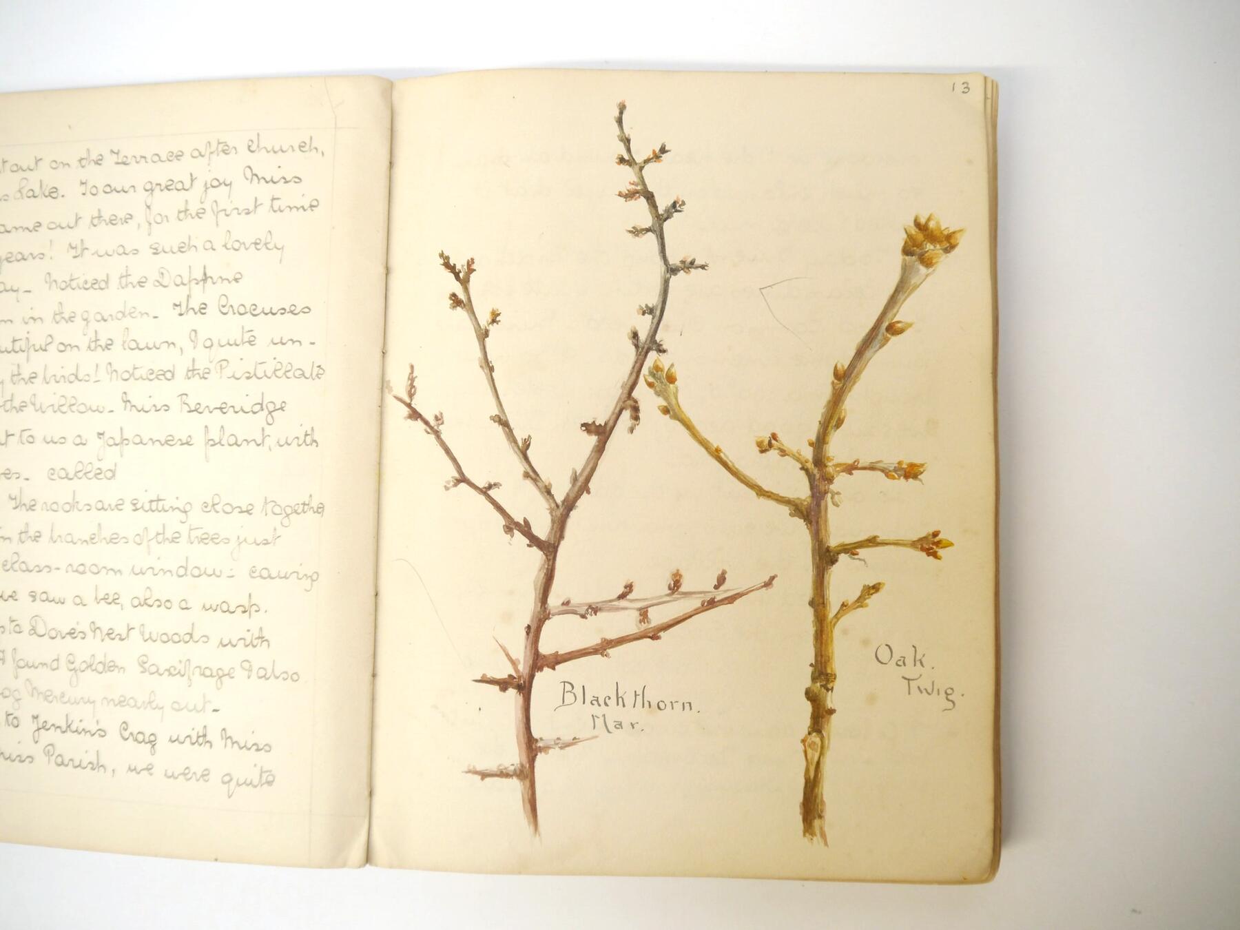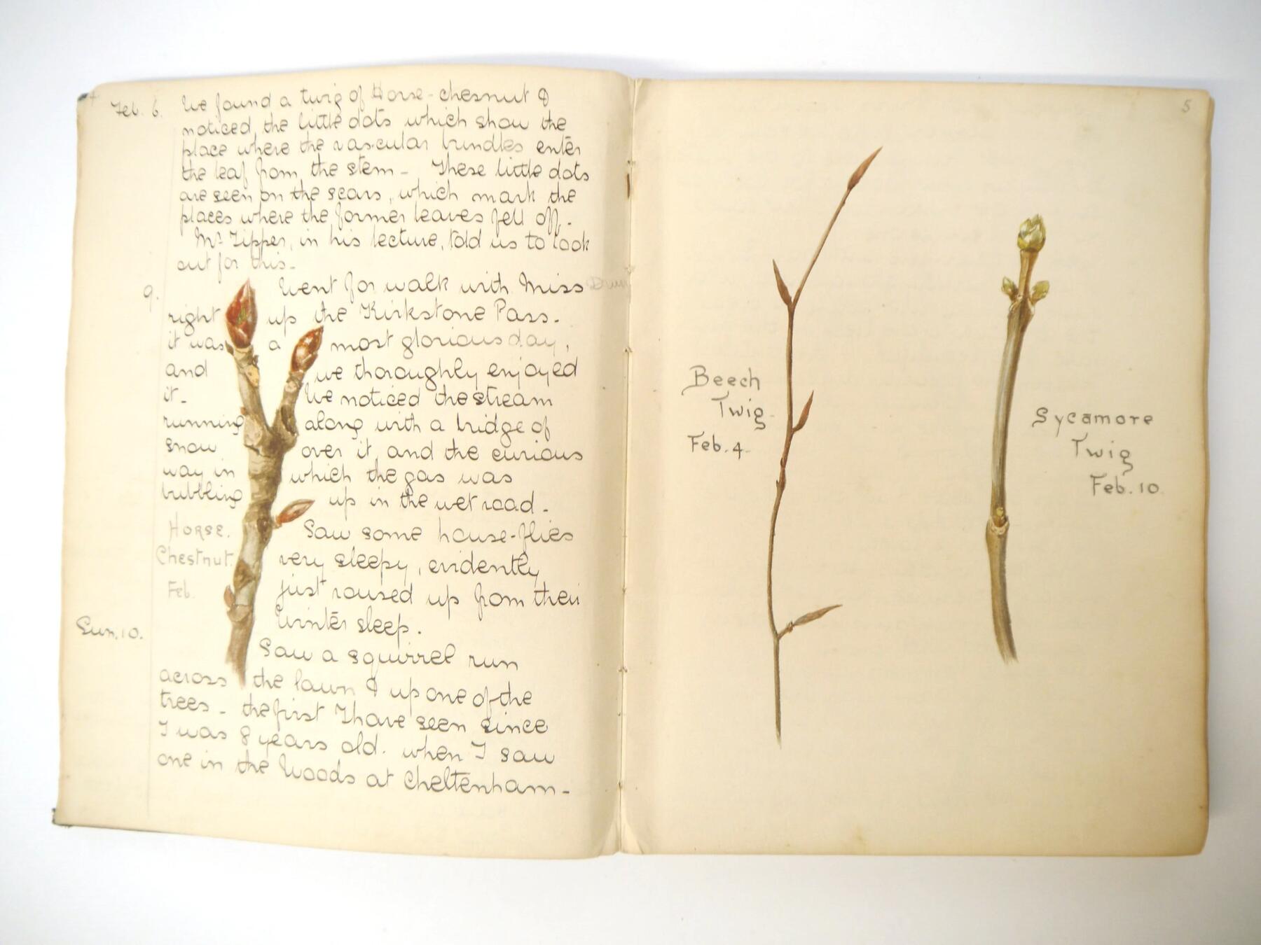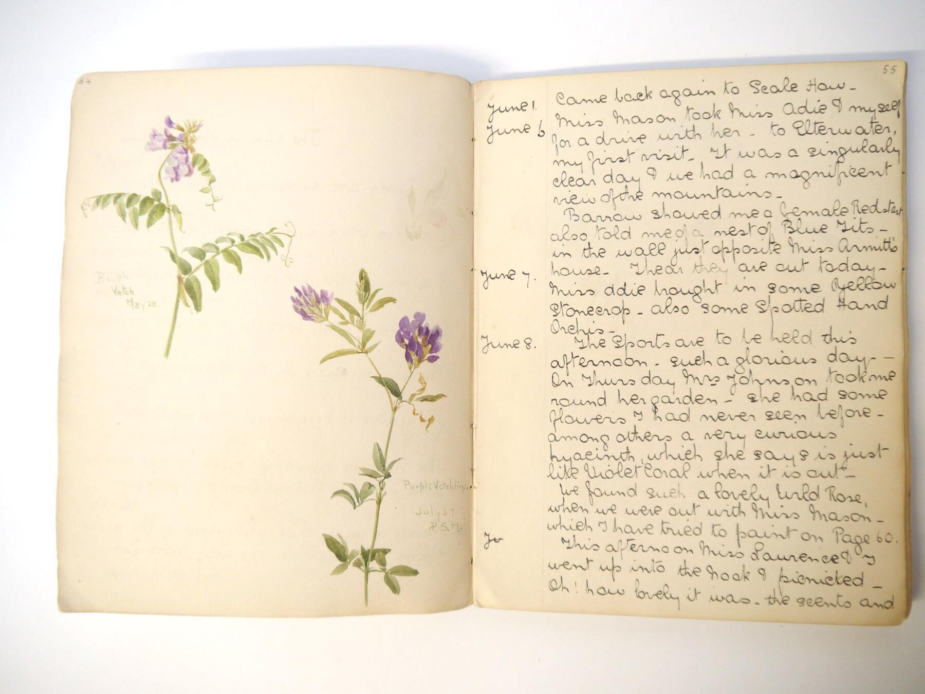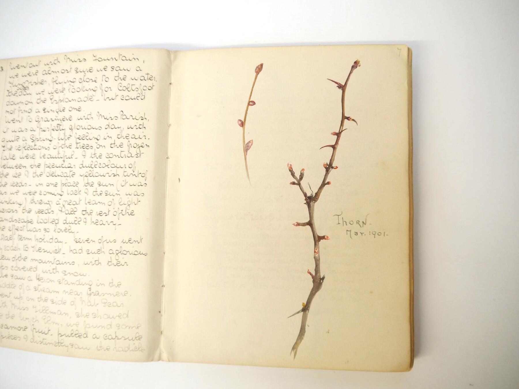A manuscript students album of natural history observations and well executed watercolour sketches of flora and fauna dated 1901 and bearing the name Lillian Lees, 150+ pages of m/s entries in diary form and relating to excursions in the Lake District and Isle of Man, good number of well executed botanical watercolours throughout including Norway Maple, Groundsel, Pistillate Willow, Sorrel, Larch Rose, Pink Campion, Buttercup, Scorpion Grass etc, plus a few other watercolour sketches of butterflies, frogs, snakes etc, manuscript tables with monthly numbers of species of flora and fauna observed etc, original cloth, printed label to top board with manuscript details ''Lillian Lees-Student-House of Education Ambleside Nature Diary''
