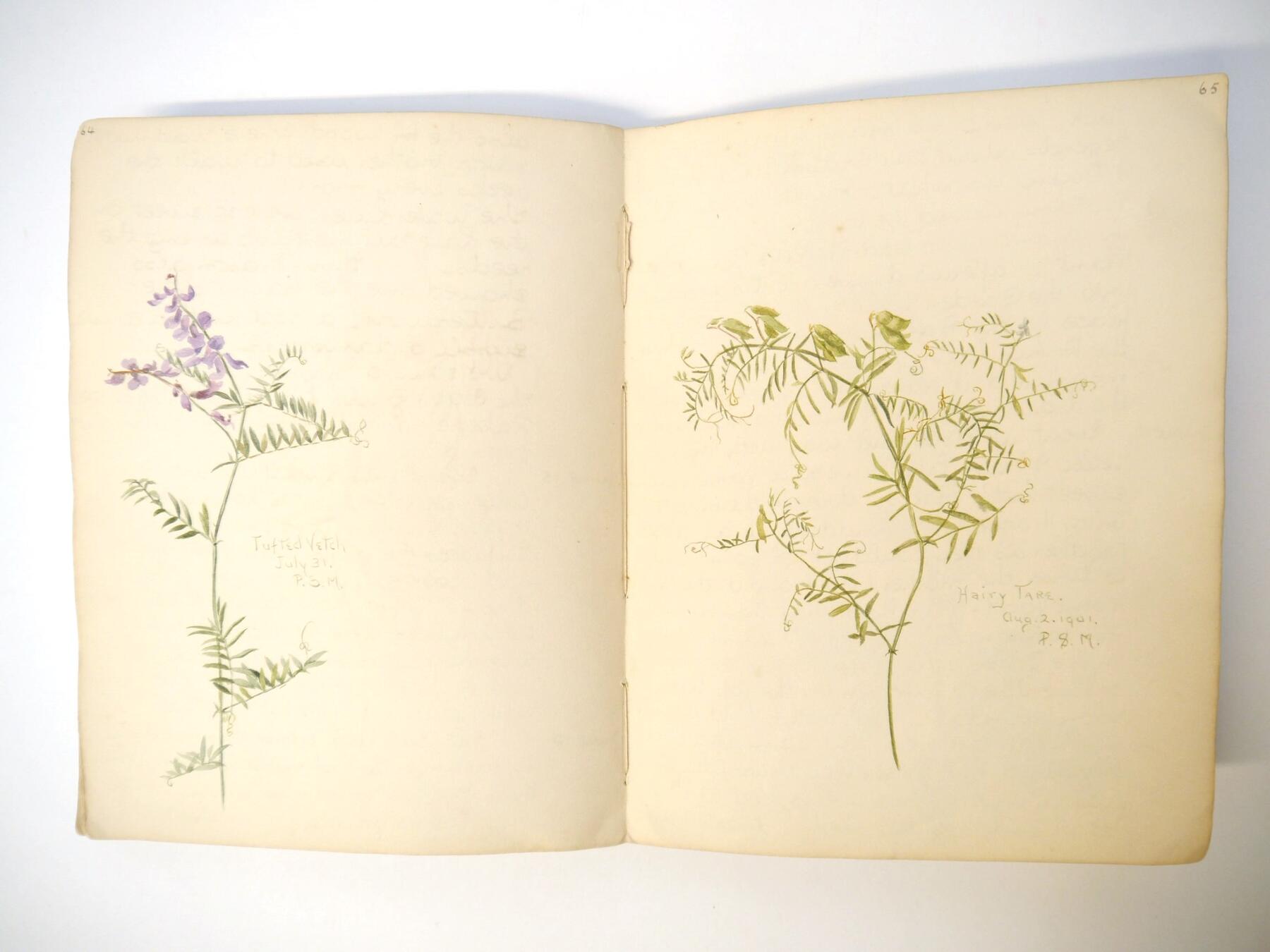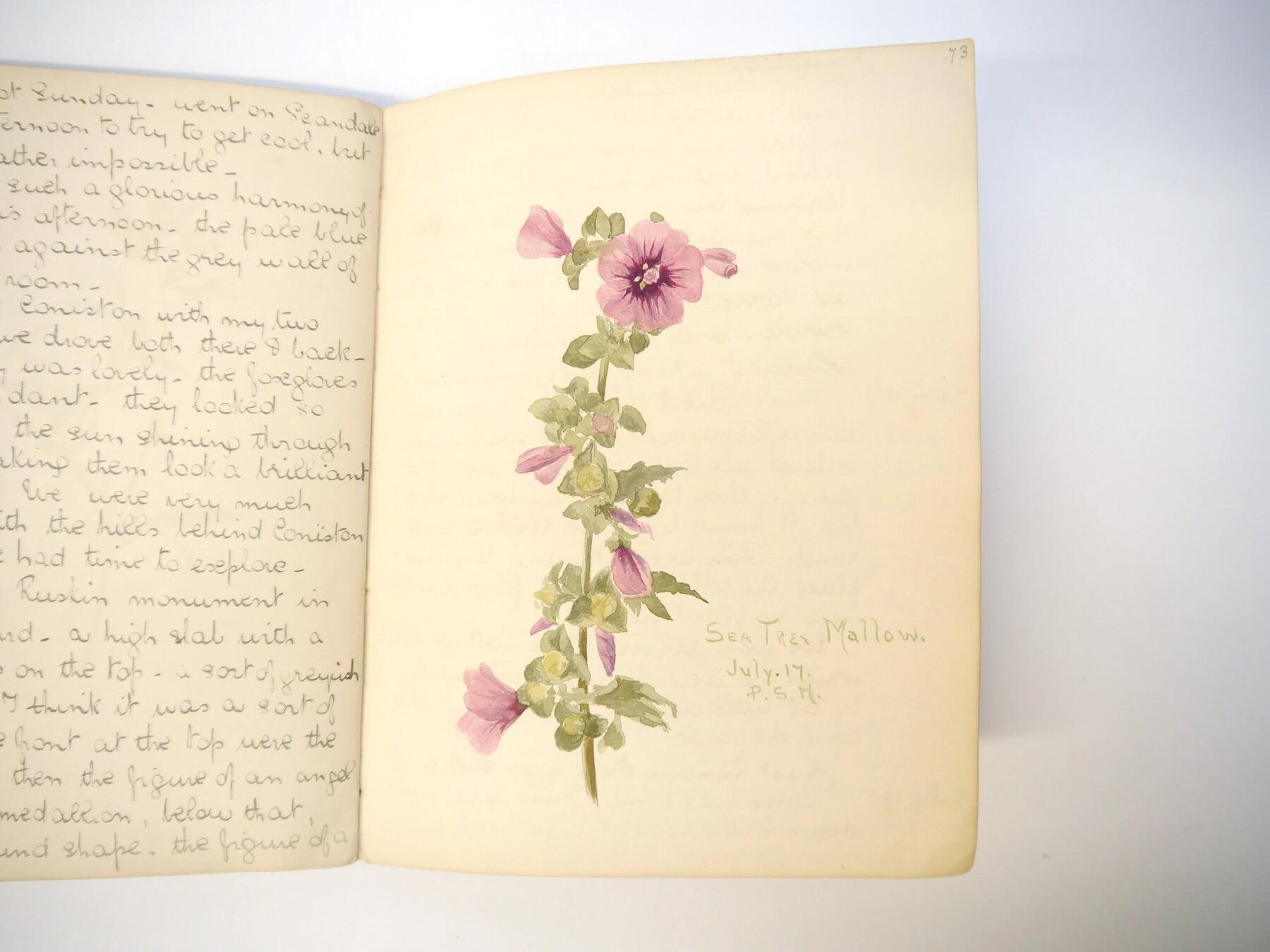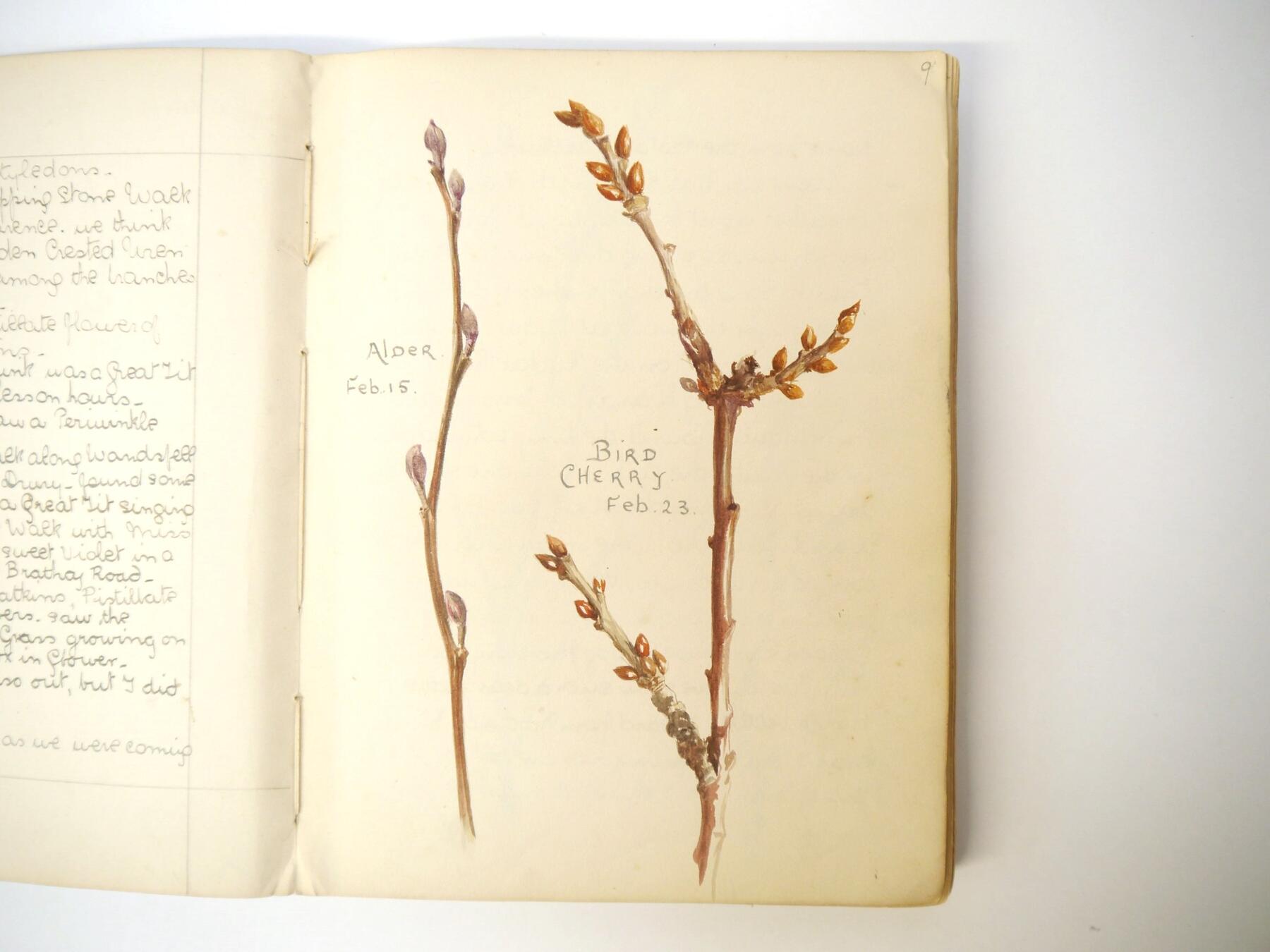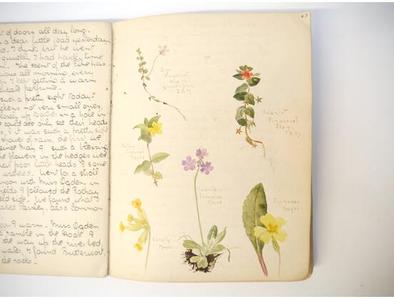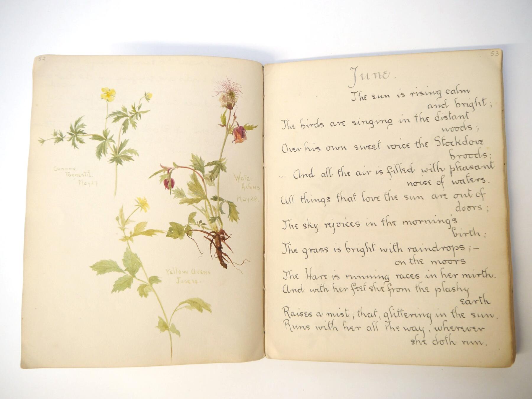 A manuscript students album of natural history observations and well executed watercolour sketches of flora and fauna dated 1901 and bearing the name Lillian Lees, 150+ pages of m/s entries in diary form and relating to excursions in the Lake District and Isle of Man, good number of well executed botanical watercolours throughout including Norway Maple, Groundsel, Pistillate Willow, Sorrel, Larch Rose, Pink Campion, Buttercup, Scorpion Grass etc, plus a few other watercolour sketches of butterflies, frogs, snakes etc, manuscript tables with monthly numbers of species of flora and fauna observed etc, original cloth, printed label to top board with manuscript details ''Lillian Lees-Student-House of Education Ambleside Nature Diary''