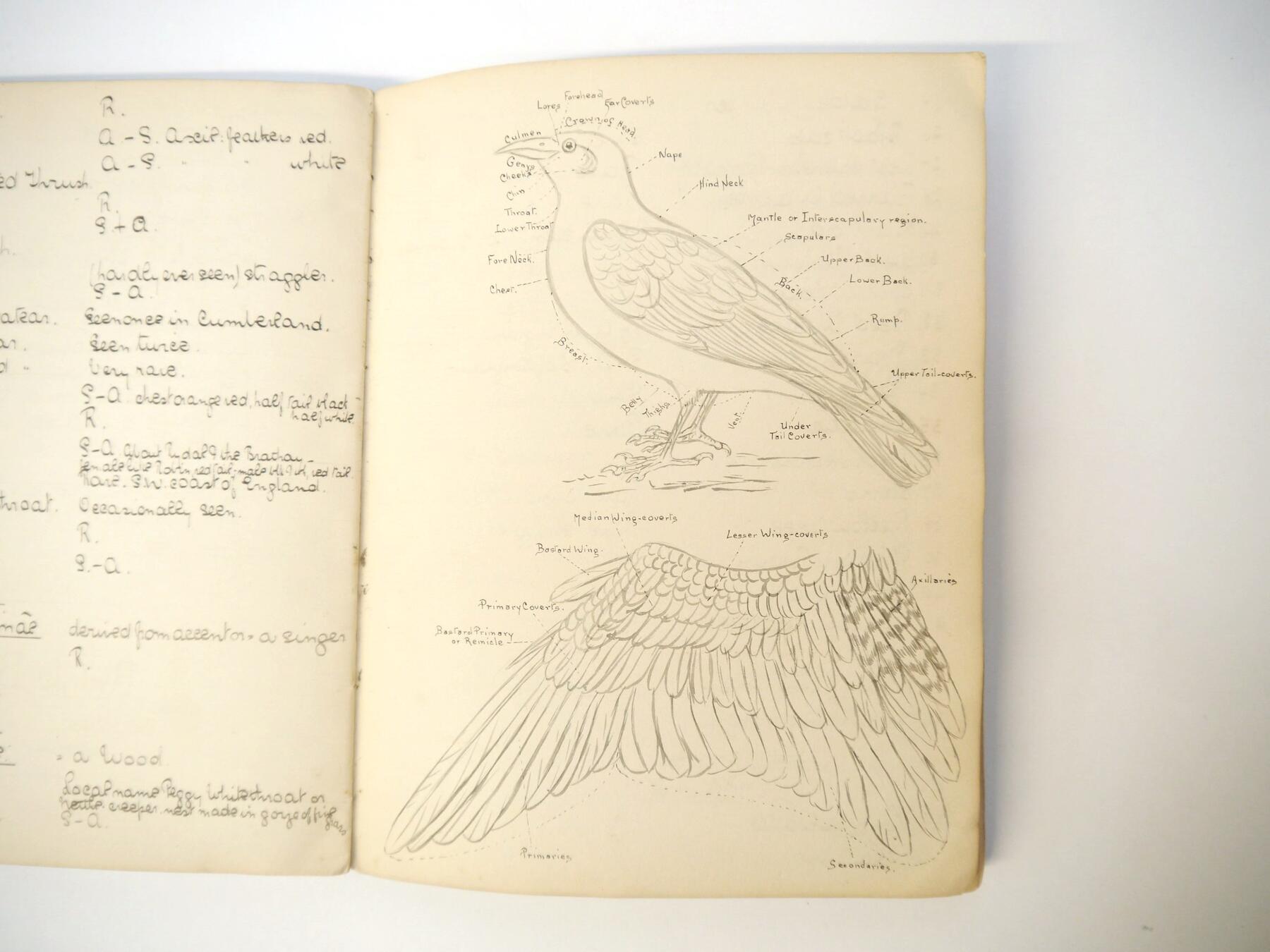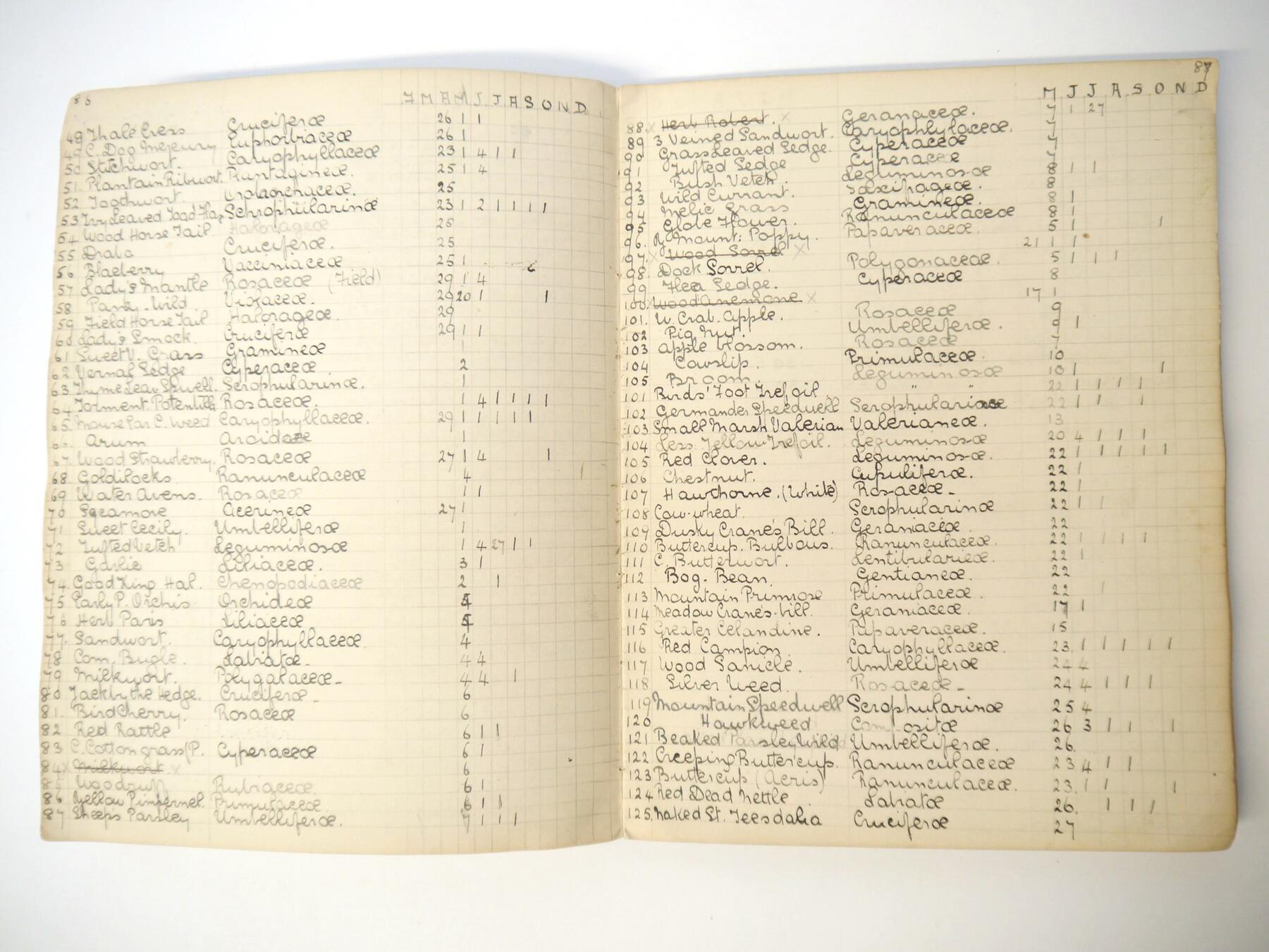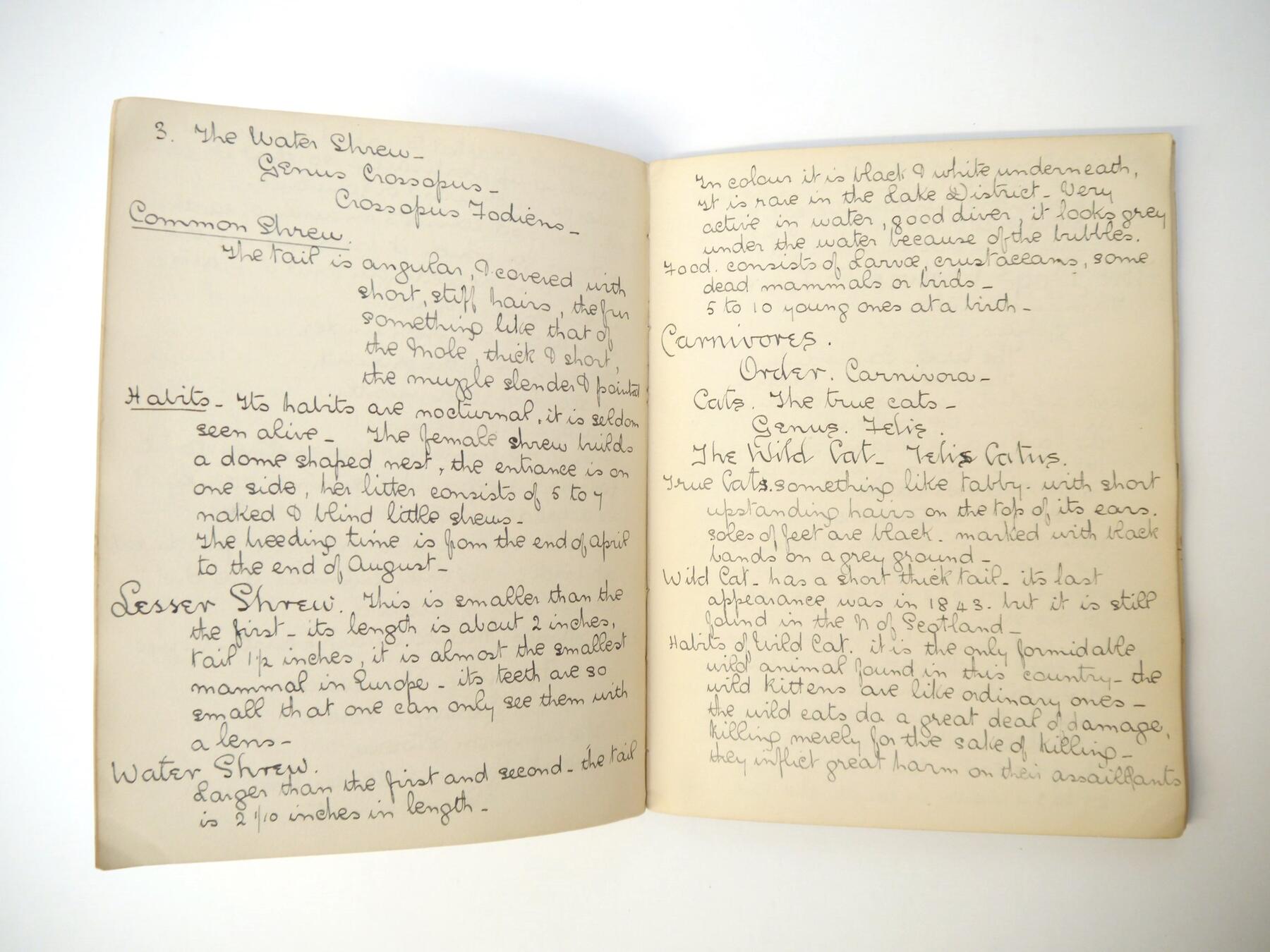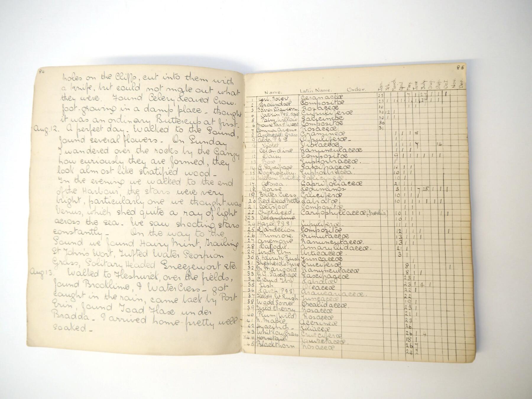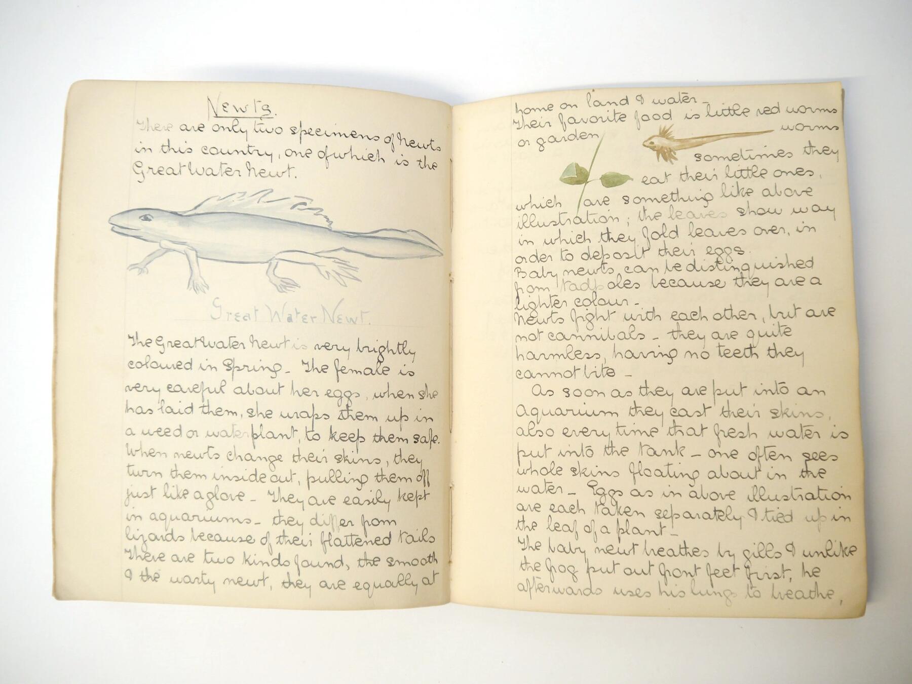 A manuscript students album of natural history observations and well executed watercolour sketches of flora and fauna dated 1901 and bearing the name Lillian Lees, 150+ pages of m/s entries in diary form and relating to excursions in the Lake District and Isle of Man, good number of well executed botanical watercolours throughout including Norway Maple, Groundsel, Pistillate Willow, Sorrel, Larch Rose, Pink Campion, Buttercup, Scorpion Grass etc, plus a few other watercolour sketches of butterflies, frogs, snakes etc, manuscript tables with monthly numbers of species of flora and fauna observed etc, original cloth, printed label to top board with manuscript details ''Lillian Lees-Student-House of Education Ambleside Nature Diary''