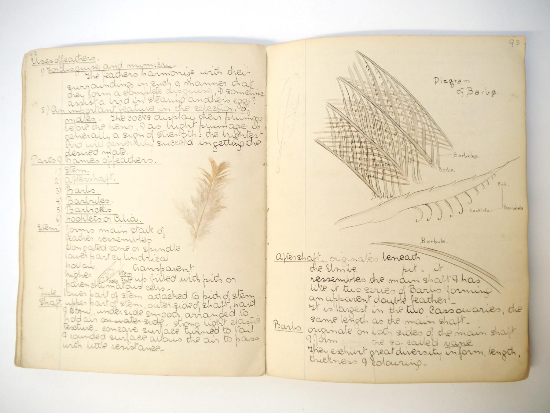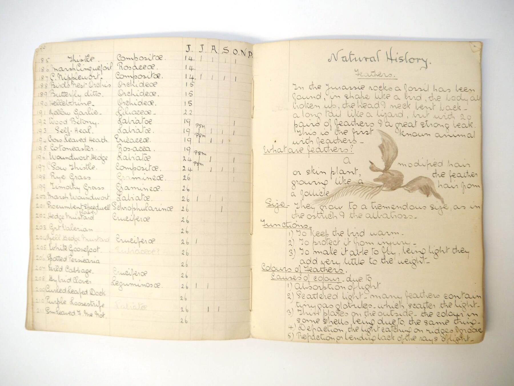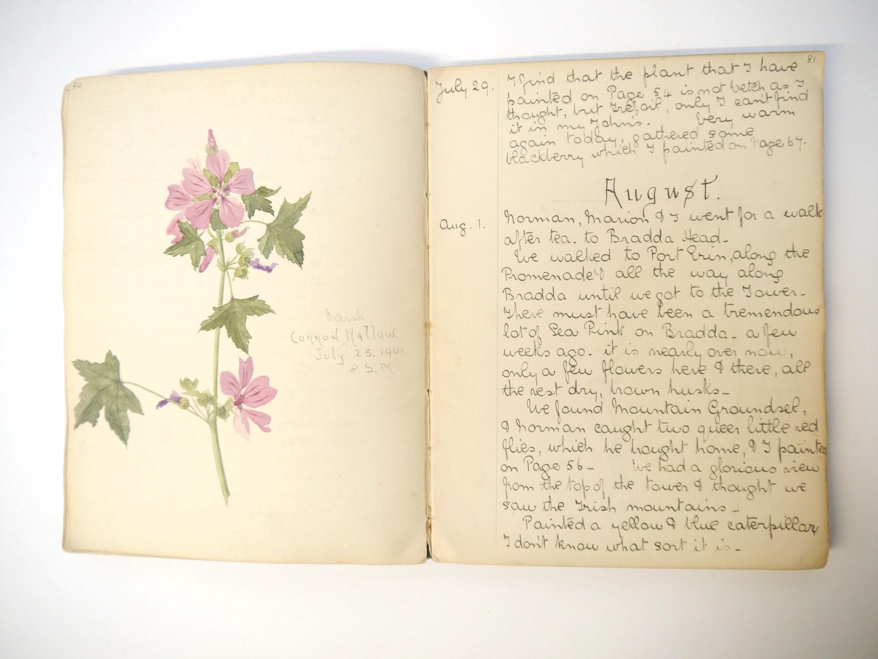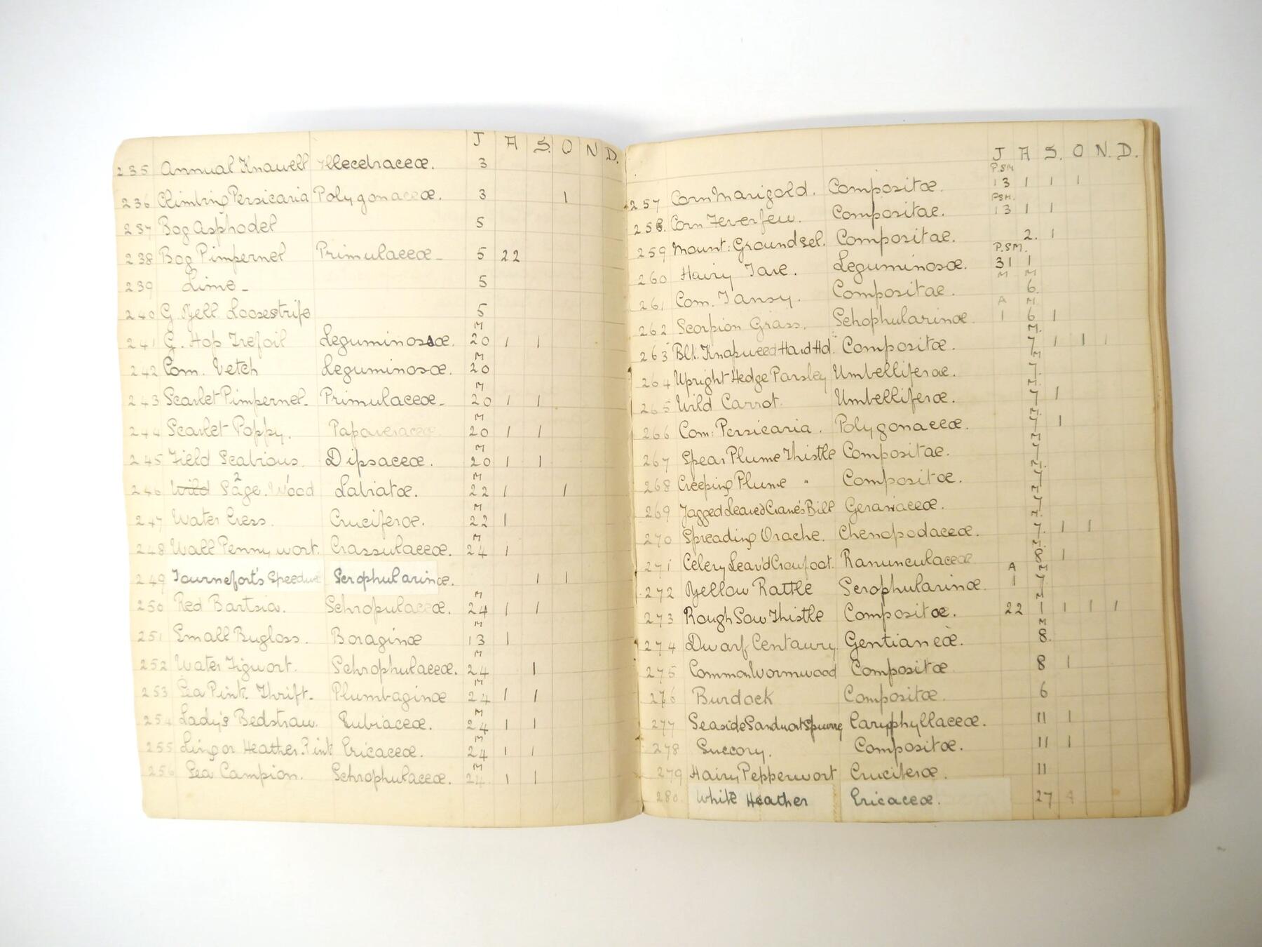 A manuscript students album of natural history observations and well executed watercolour sketches of flora and fauna dated 1901 and bearing the name Lillian Lees, 150+ pages of m/s entries in diary form and relating to excursions in the Lake District and Isle of Man, good number of well executed botanical watercolours throughout including Norway Maple, Groundsel, Pistillate Willow, Sorrel, Larch Rose, Pink Campion, Buttercup, Scorpion Grass etc, plus a few other watercolour sketches of butterflies, frogs, snakes etc, manuscript tables with monthly numbers of species of flora and fauna observed etc, original cloth, printed label to top board with manuscript details ''Lillian Lees-Student-House of Education Ambleside Nature Diary''