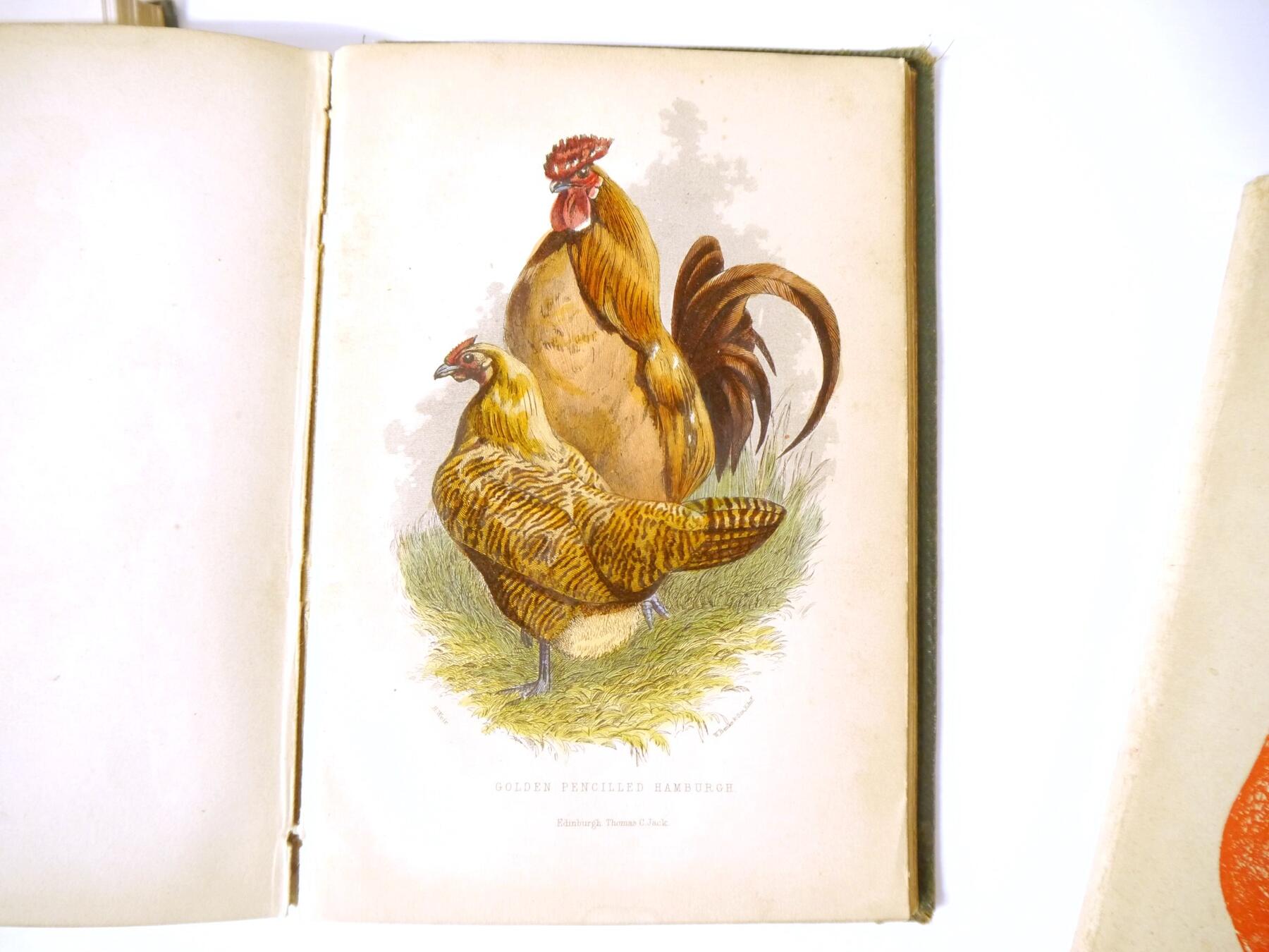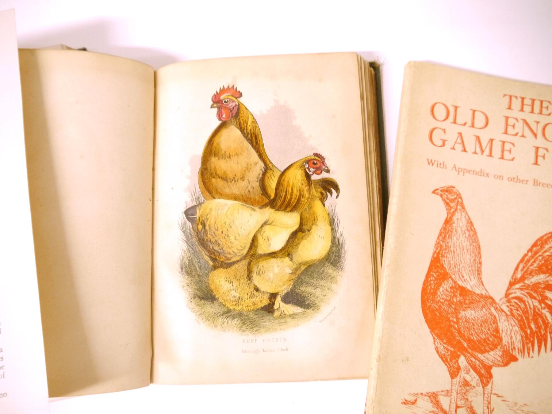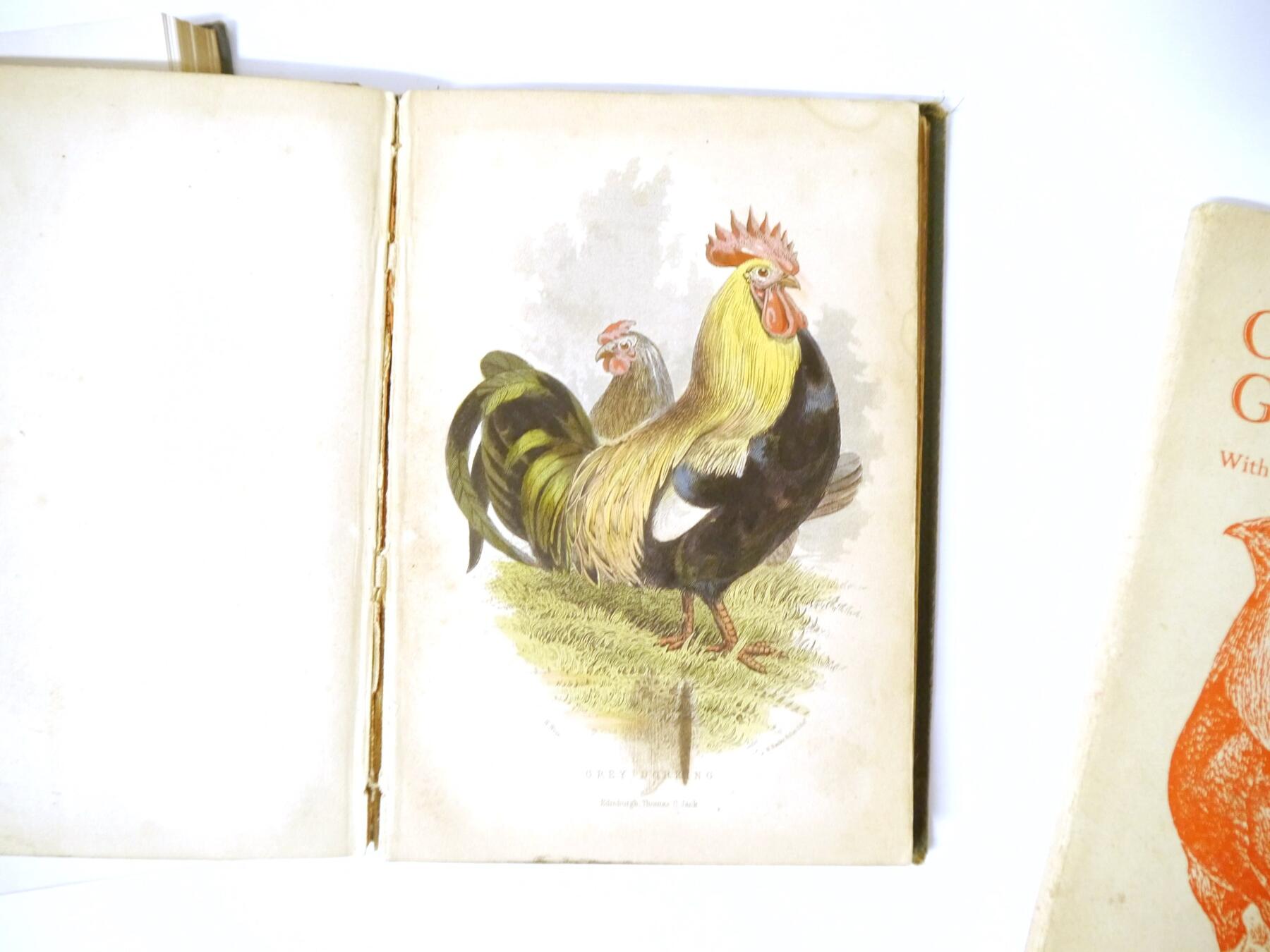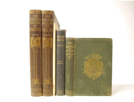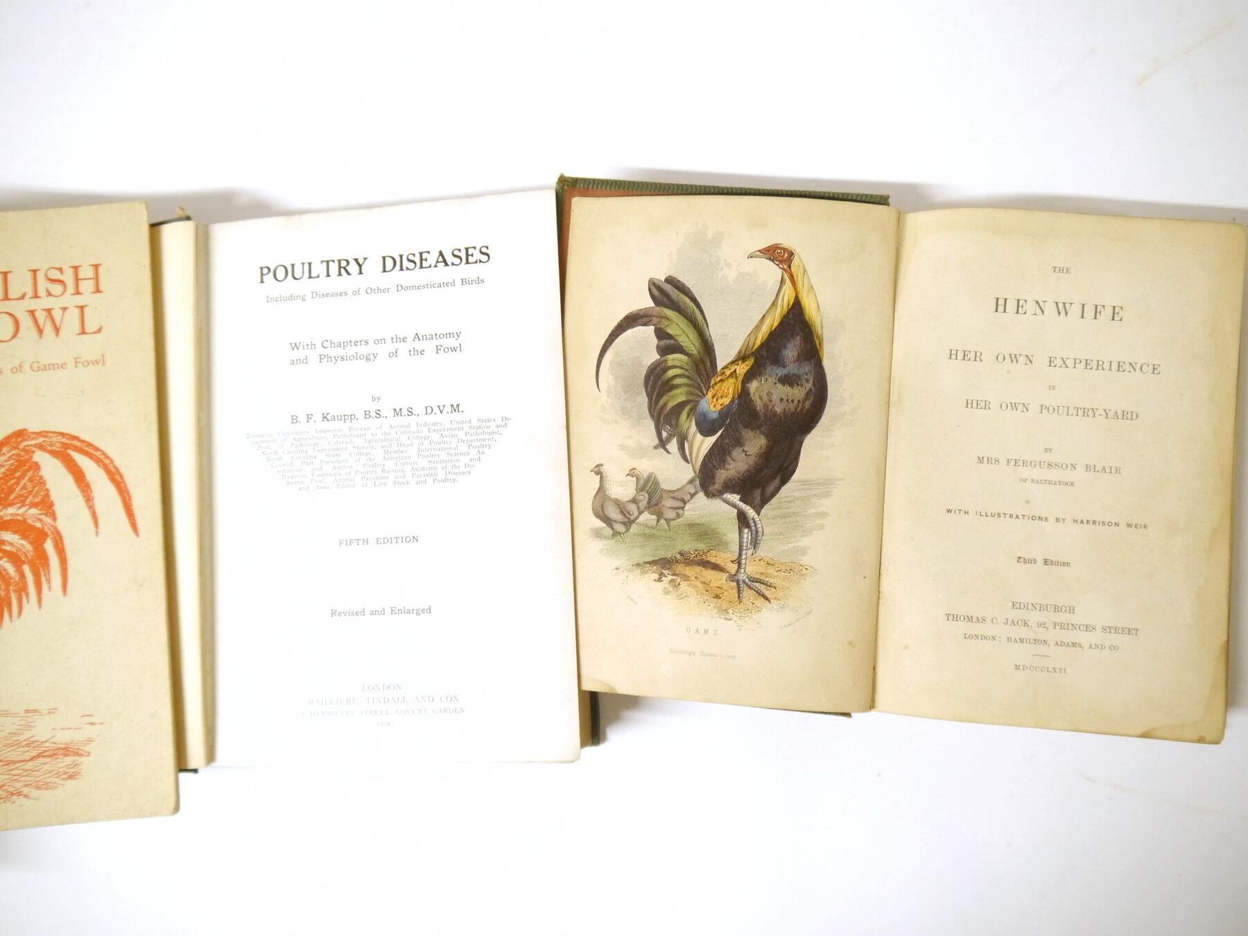 Mrs Fergusson Blair: 'The Henwife. Her Own Experience in Her Own Poultry-yard', Edinburgh, Thomas C. Jack, 1862, 3rd edition, 10 hand coloured engraved plates after Harrison Weir as called for, xxiii,218,[4]pp, original cloth gilt (worn & soiled), inner joints weak, top edge gilt; J. Stephen Hicks: 'The Encyclopaedia of Poultry', London, Waverley, [nd], circa 1920's, 2 volumes, 8 coloured plates + numerous ills in text as called for, original cloth gilt; plus Kaupp 'Poultry Diseases', 1929, 5th edition revised and enlarged, original cloth, and Atkinson 'The Old English Game Fowl', [1960], 5th edition, original wraps (5)