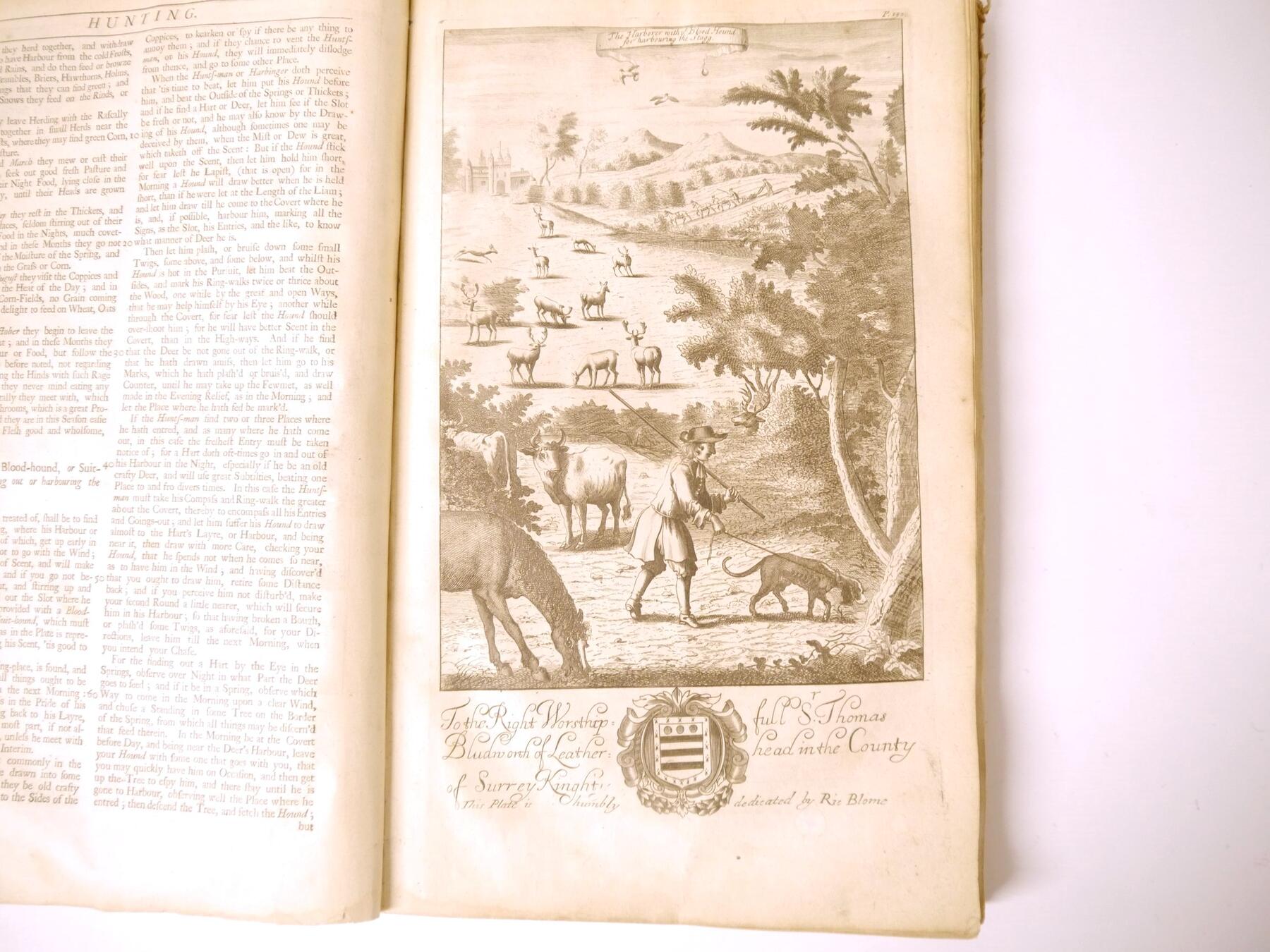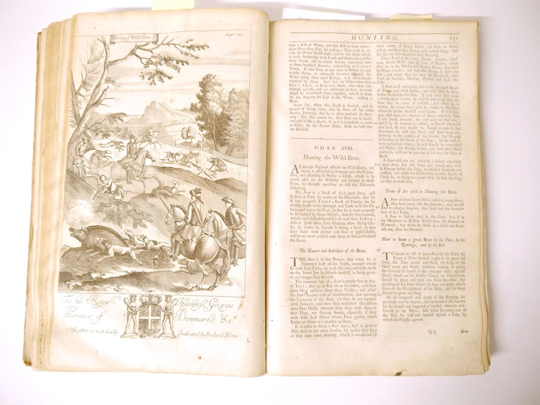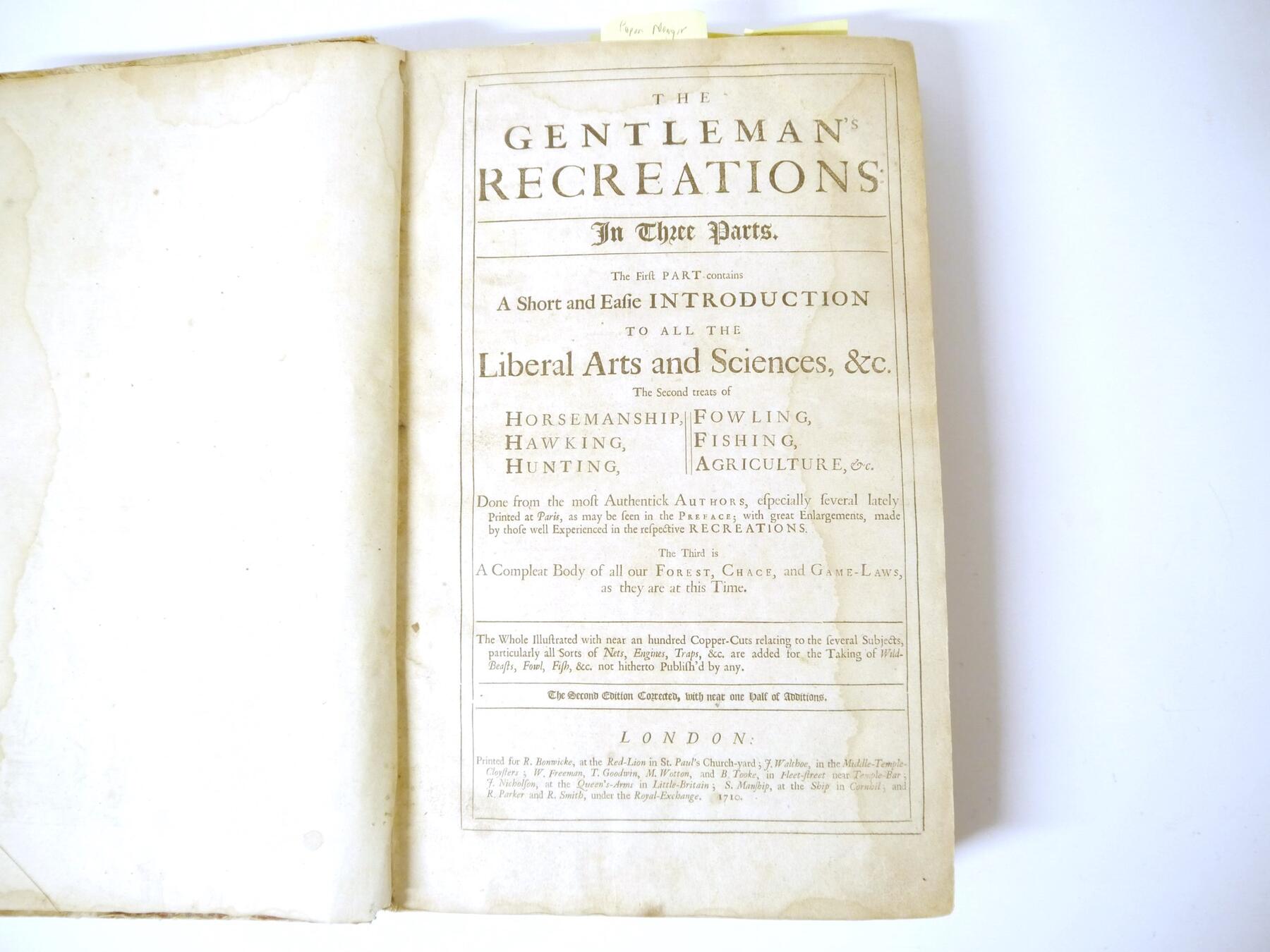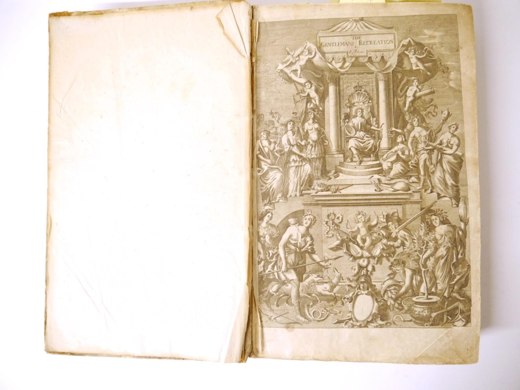 Nicholas Cox: 'The Gentleman's Recreation: In Three Parts. The First Part contains...Liberal Arts and Sciences, &c. The Second treats of Horsemanship, Hawking, Hunting, Fowling, Fishing, Agriculture, &c...The Third is...Forest, Chace, and Game-Laws...', London, R. Bonwicke, 1710, 2nd edition corrected, a/f, sold as seen with all faults and not subject to return, added engraved title page by Richard Blome + 78 full page engraved illustrations (of which 2 folding), definitely lacking a plate, and a few leaves with closed tears, marginal losses, worm damage, plates depicting horse racing, falconry, partridge, pheasant and brook hawking, stag and fox hunting, coursing, various stalking, shooting, fowling, fishing etc, folio, contemporary quarter calf very worn, inner joints split, top board detached (but present)
