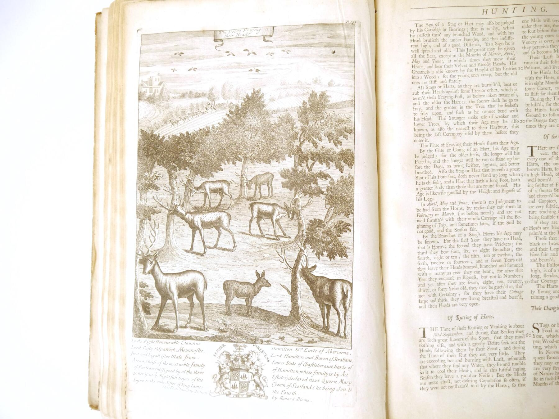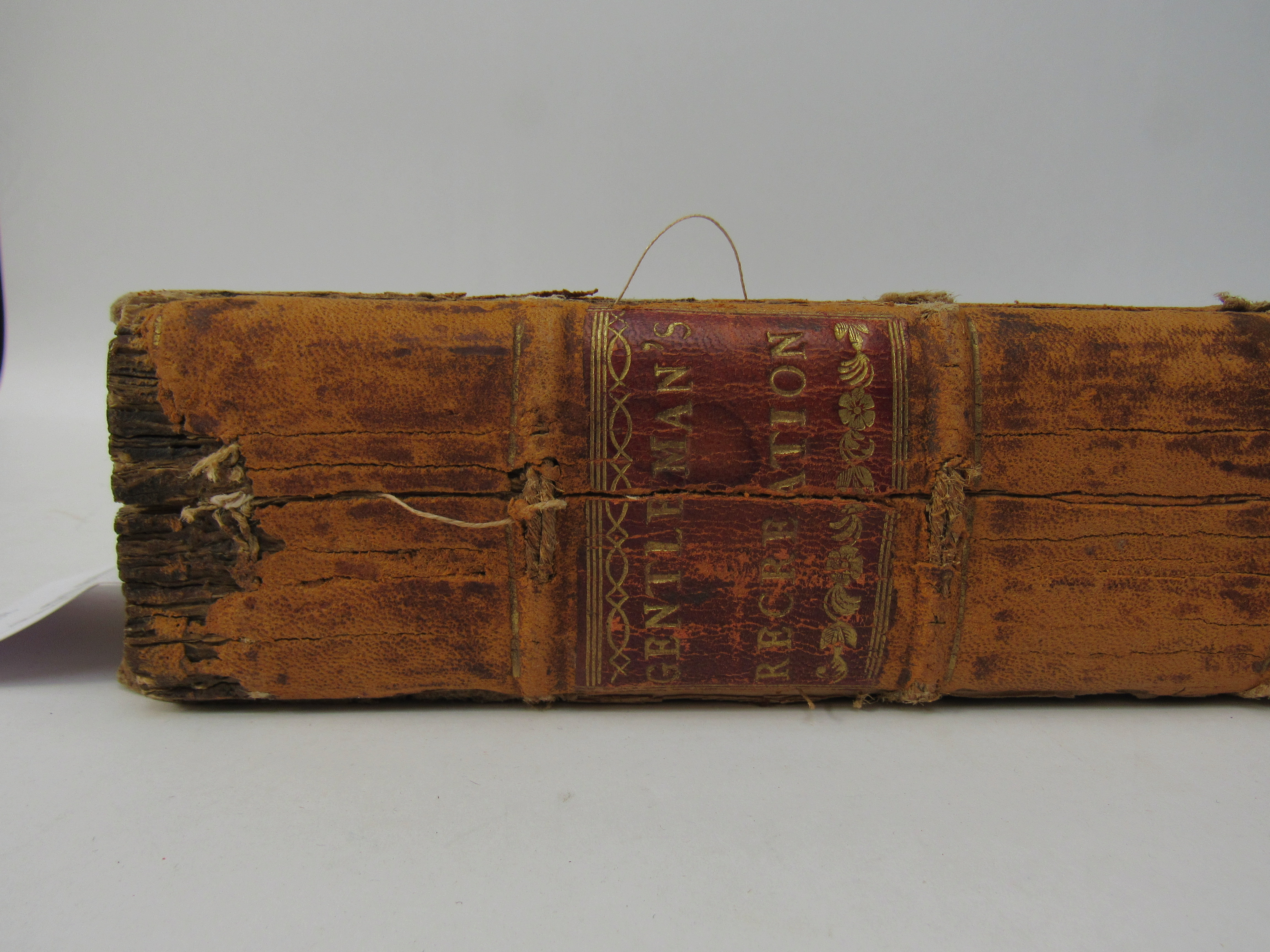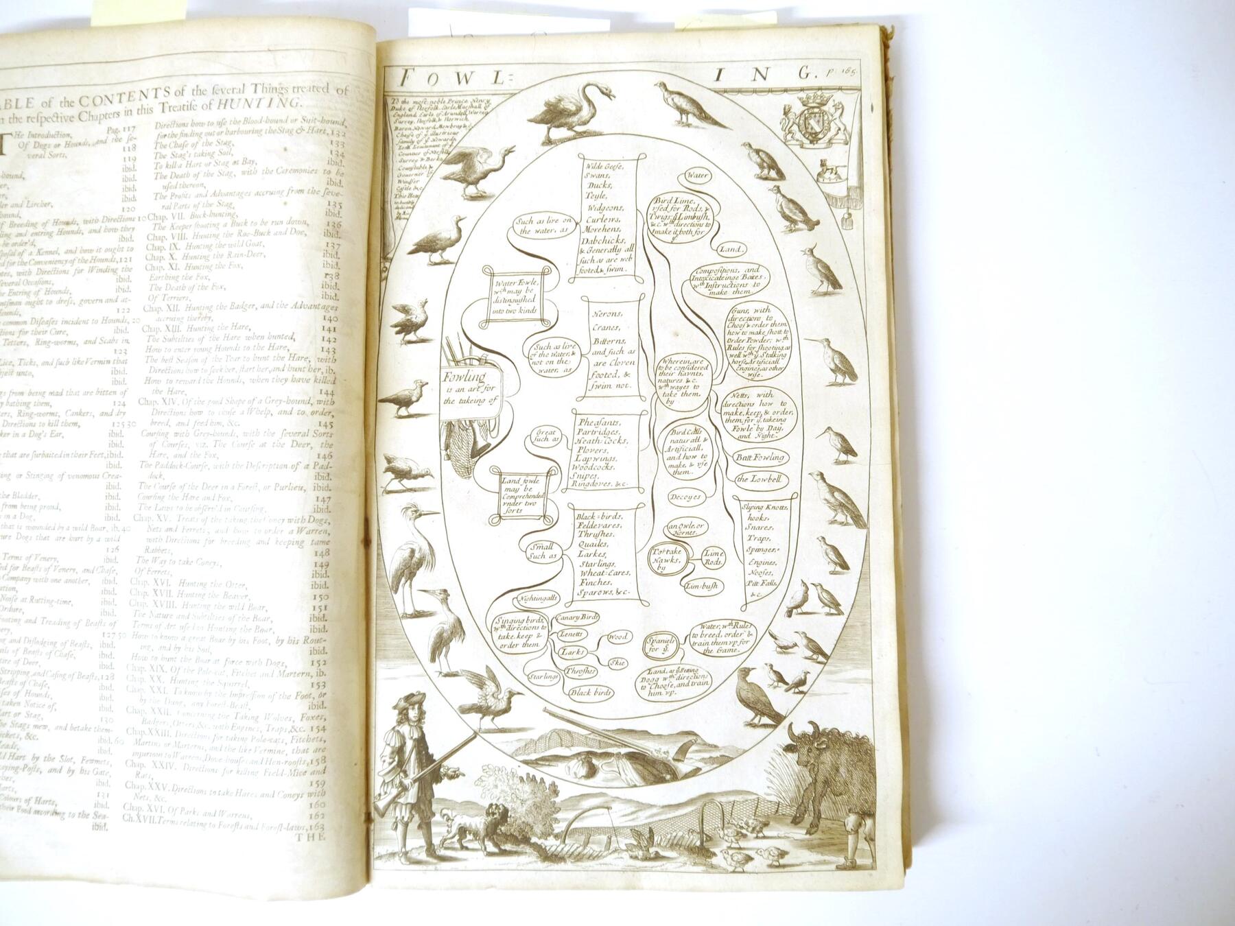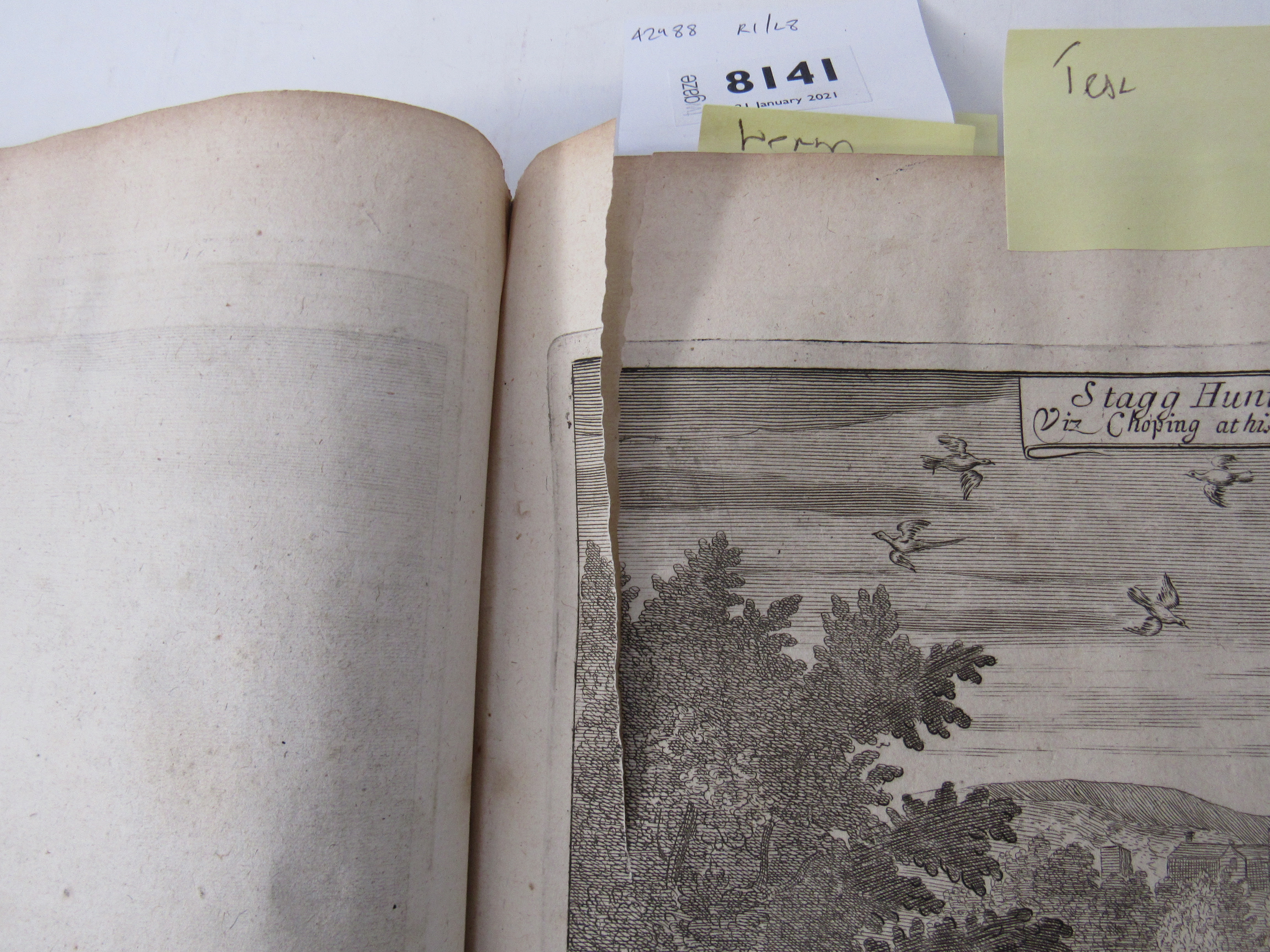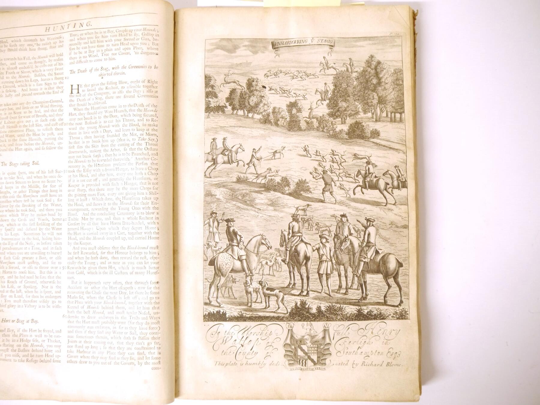 Nicholas Cox: 'The Gentleman's Recreation: In Three Parts. The First Part contains...Liberal Arts and Sciences, &c. The Second treats of Horsemanship, Hawking, Hunting, Fowling, Fishing, Agriculture, &c...The Third is...Forest, Chace, and Game-Laws...', London, R. Bonwicke, 1710, 2nd edition corrected, a/f, sold as seen with all faults and not subject to return, added engraved title page by Richard Blome + 78 full page engraved illustrations (of which 2 folding), definitely lacking a plate, and a few leaves with closed tears, marginal losses, worm damage, plates depicting horse racing, falconry, partridge, pheasant and brook hawking, stag and fox hunting, coursing, various stalking, shooting, fowling, fishing etc, folio, contemporary quarter calf very worn, inner joints split, top board detached (but present)