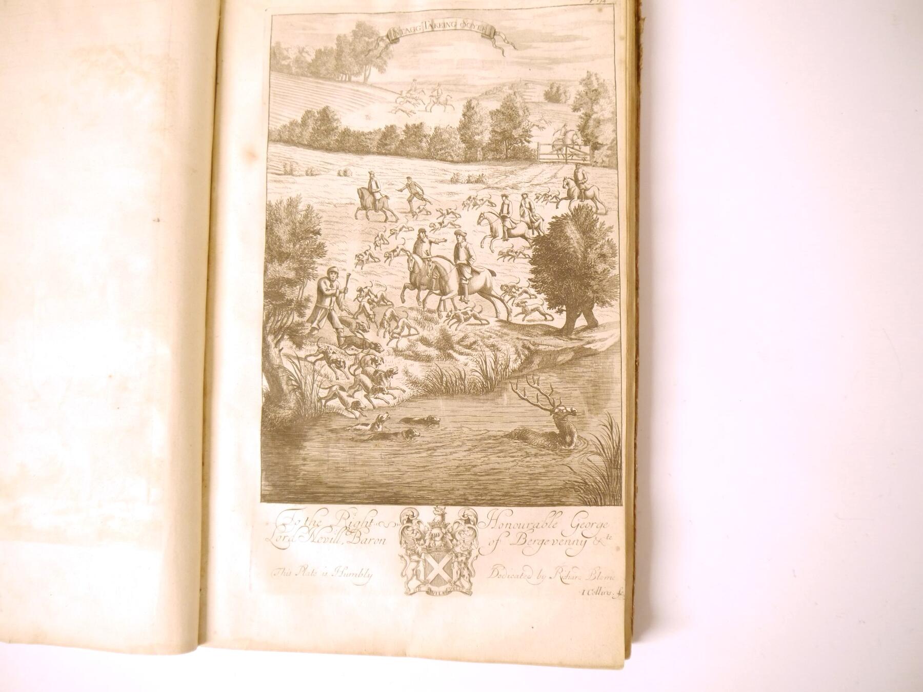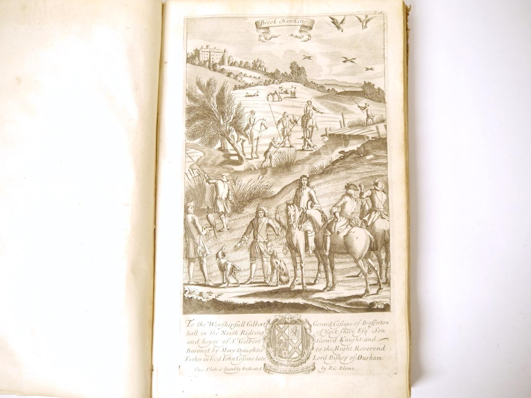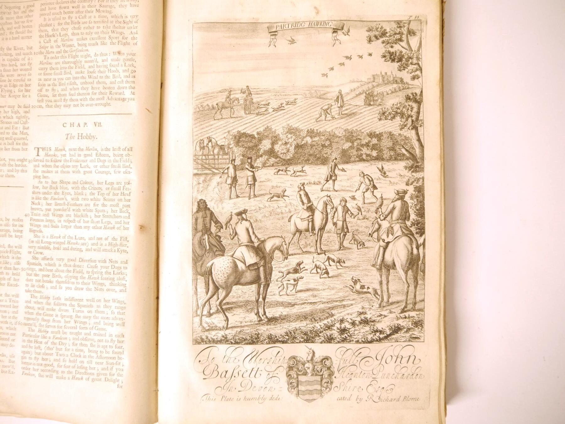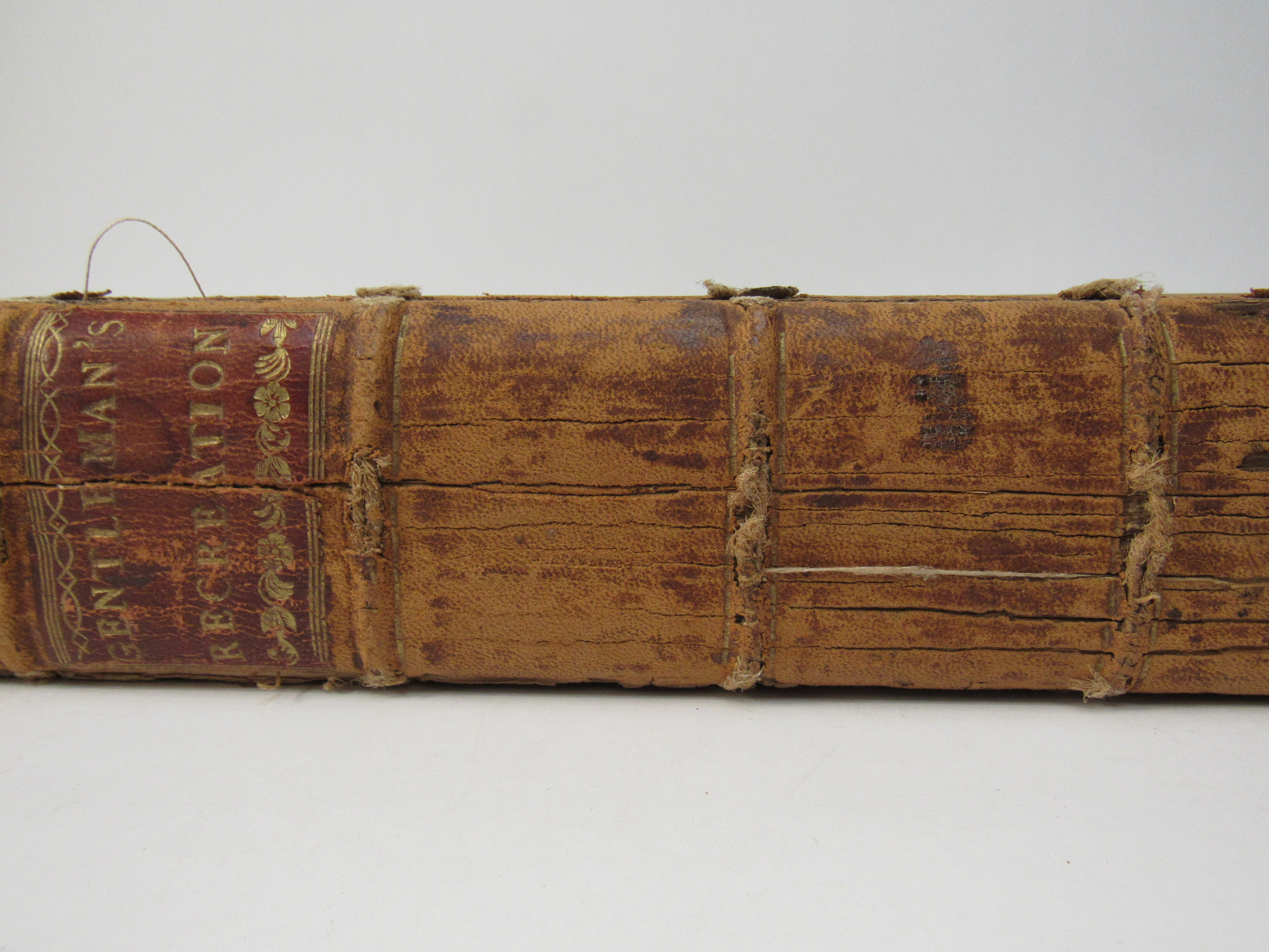 Nicholas Cox: 'The Gentleman's Recreation: In Three Parts. The First Part contains...Liberal Arts and Sciences, &c. The Second treats of Horsemanship, Hawking, Hunting, Fowling, Fishing, Agriculture, &c...The Third is...Forest, Chace, and Game-Laws...', London, R. Bonwicke, 1710, 2nd edition corrected, a/f, sold as seen with all faults and not subject to return, added engraved title page by Richard Blome + 78 full page engraved illustrations (of which 2 folding), definitely lacking a plate, and a few leaves with closed tears, marginal losses, worm damage, plates depicting horse racing, falconry, partridge, pheasant and brook hawking, stag and fox hunting, coursing, various stalking, shooting, fowling, fishing etc, folio, contemporary quarter calf very worn, inner joints split, top board detached (but present)