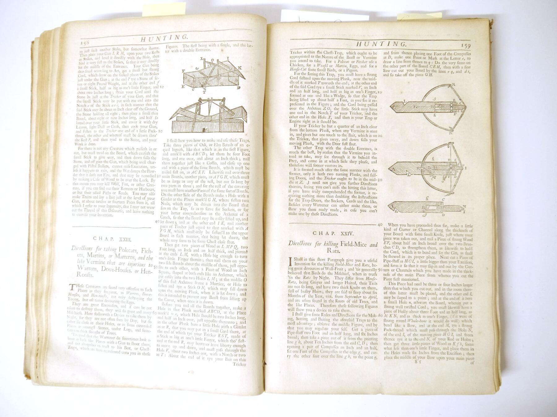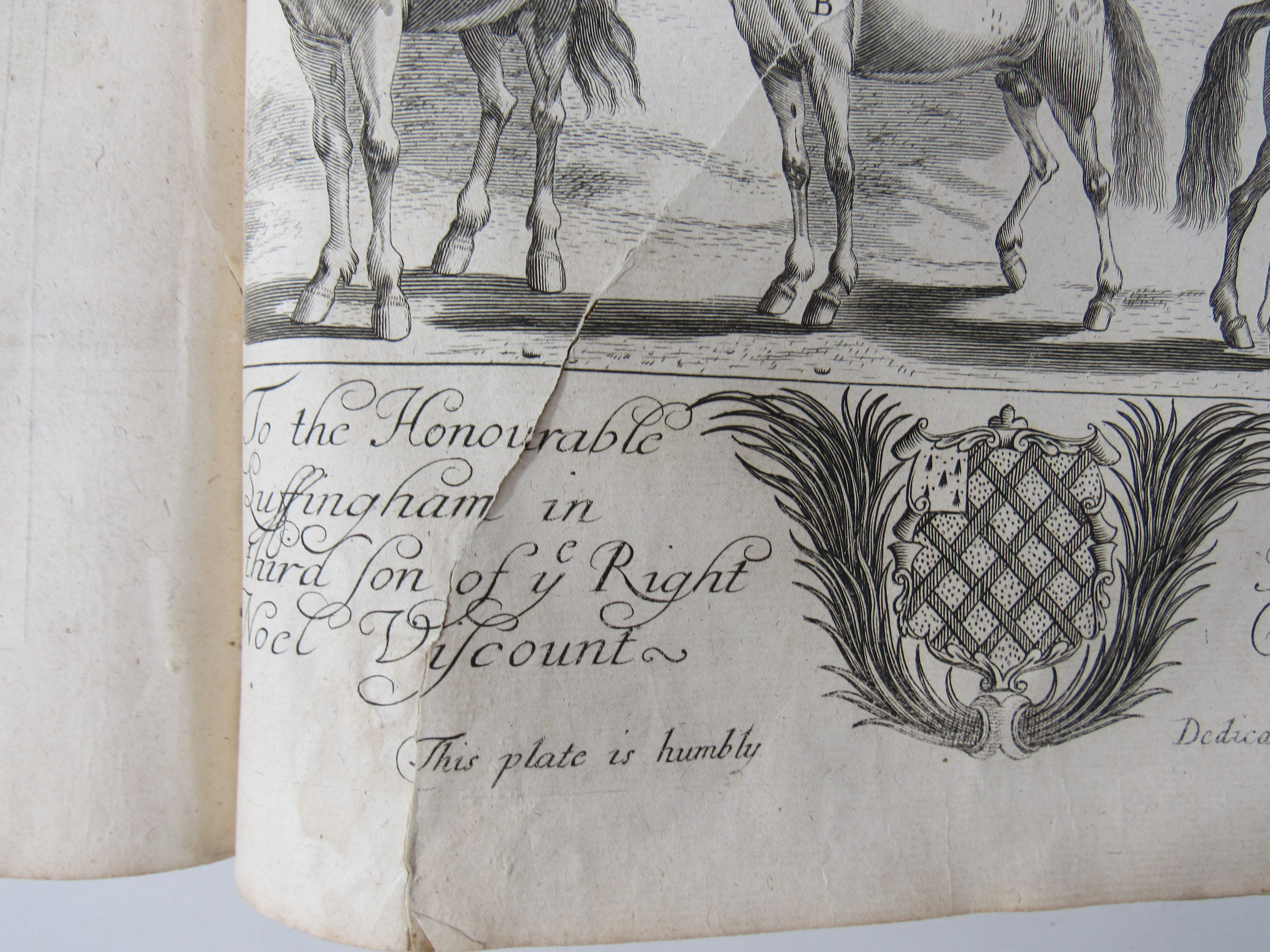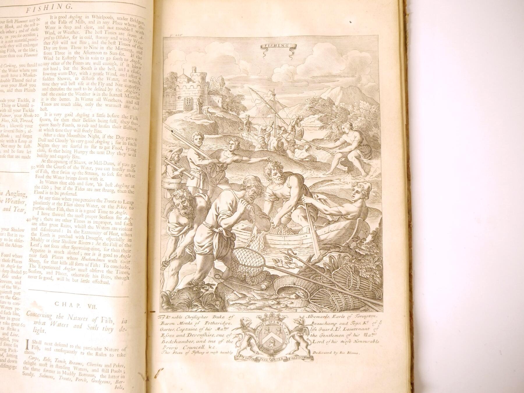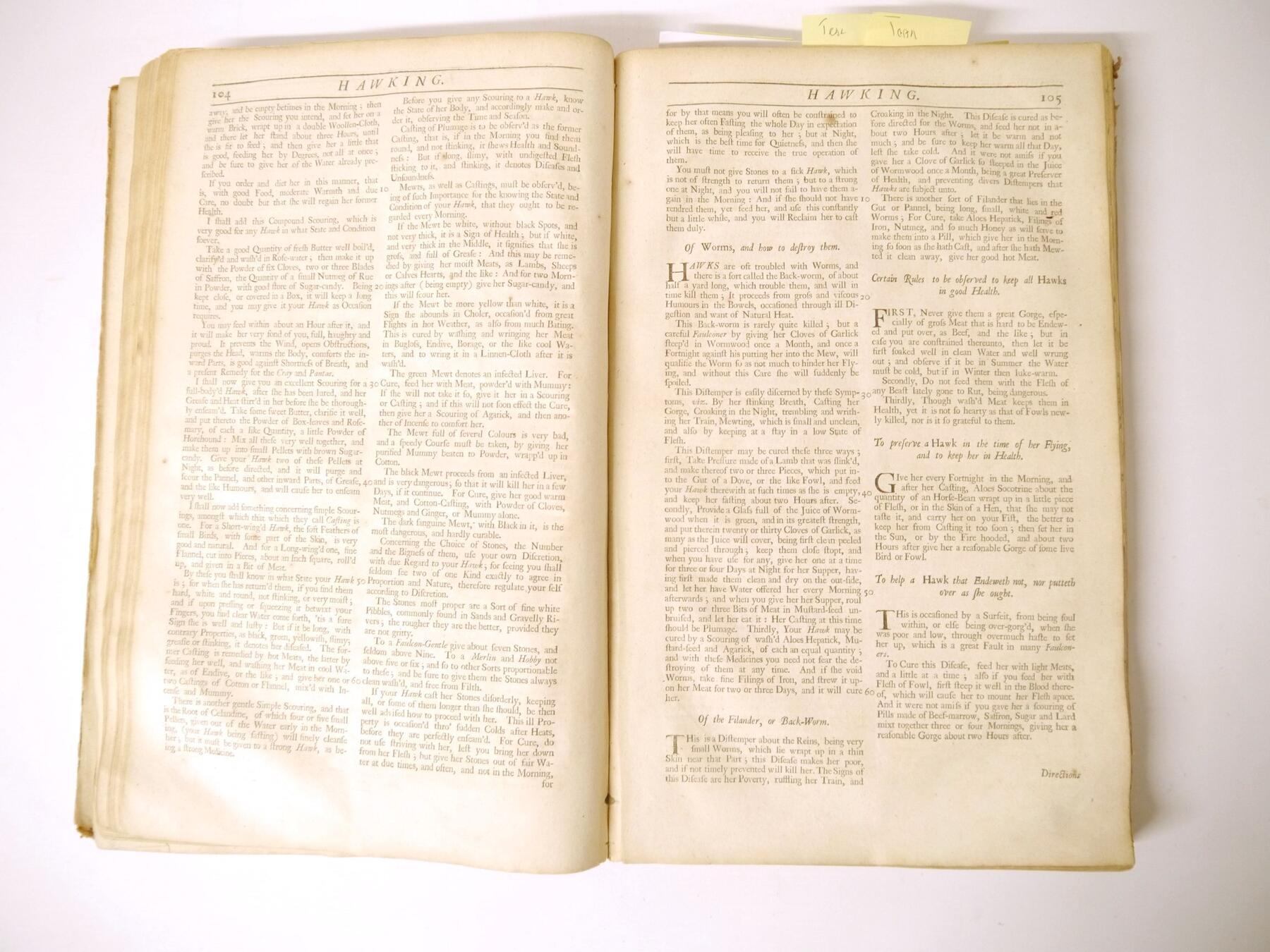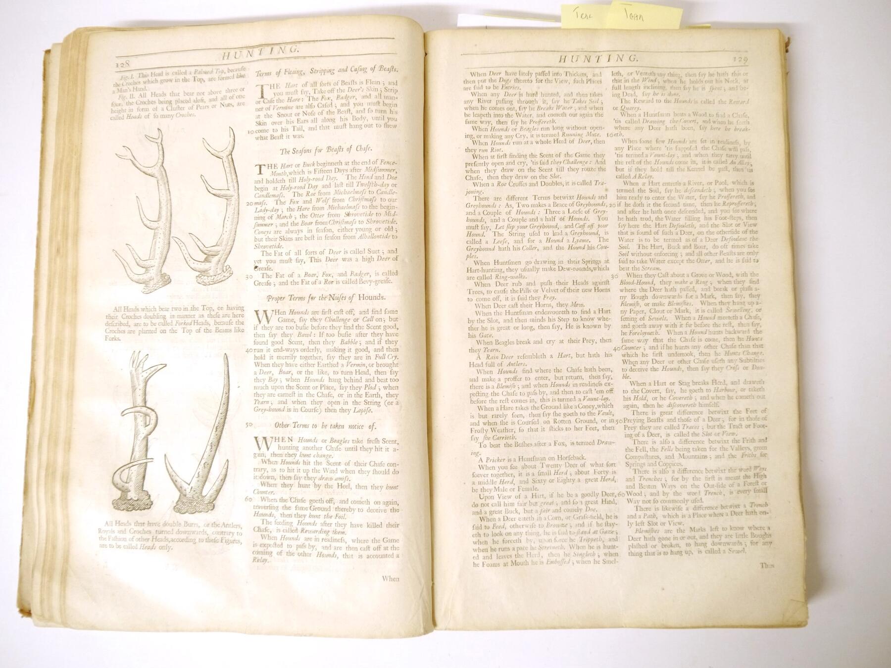 Nicholas Cox: 'The Gentleman's Recreation: In Three Parts. The First Part contains...Liberal Arts and Sciences, &c. The Second treats of Horsemanship, Hawking, Hunting, Fowling, Fishing, Agriculture, &c...The Third is...Forest, Chace, and Game-Laws...', London, R. Bonwicke, 1710, 2nd edition corrected, a/f, sold as seen with all faults and not subject to return, added engraved title page by Richard Blome + 78 full page engraved illustrations (of which 2 folding), definitely lacking a plate, and a few leaves with closed tears, marginal losses, worm damage, plates depicting horse racing, falconry, partridge, pheasant and brook hawking, stag and fox hunting, coursing, various stalking, shooting, fowling, fishing etc, folio, contemporary quarter calf very worn, inner joints split, top board detached (but present)