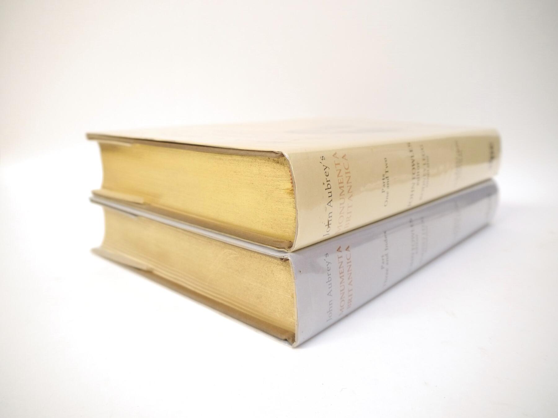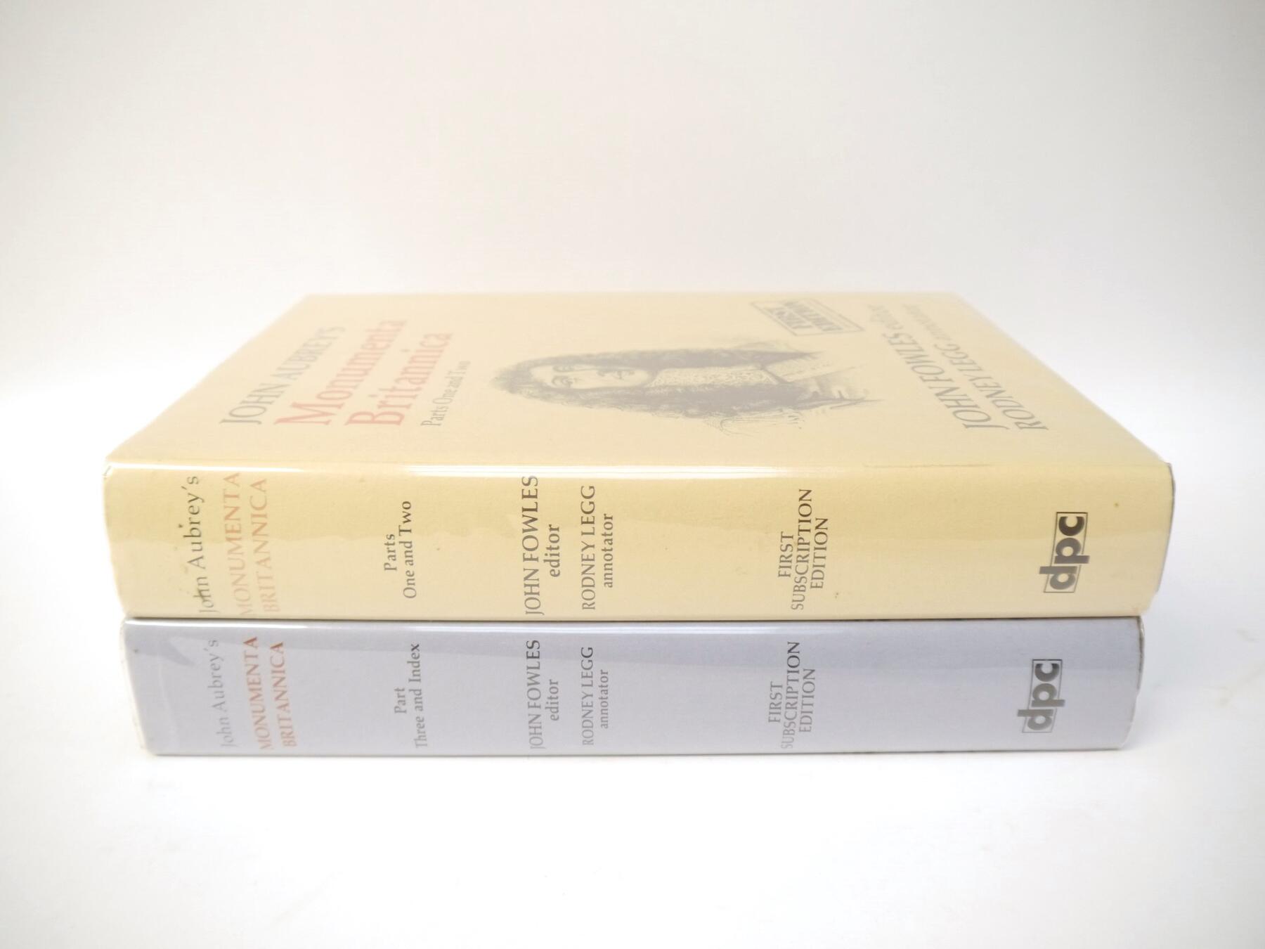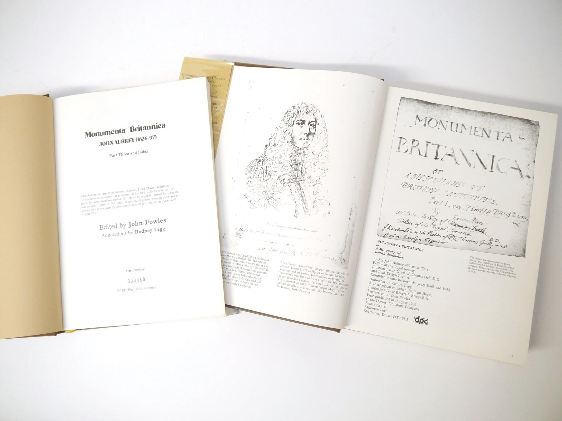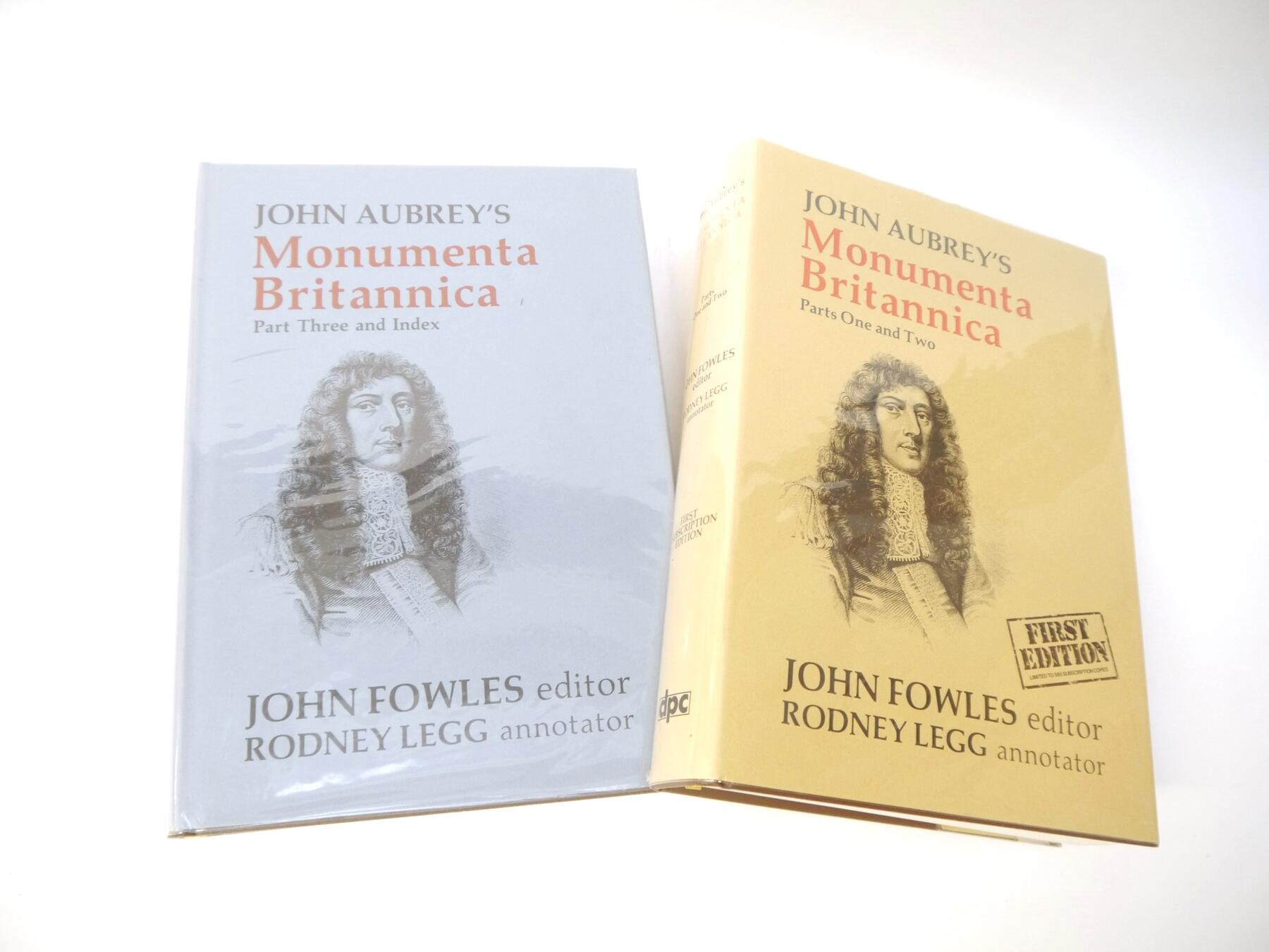 John Aubrey: 'Monumenta Britannica, or A Miscellany of British Antiquities' edited John Fowles, annotated Rodney Legg, 1980-82, 1st edition, parts 1-3 and index in two volumes, limited edition of 595 subscription copies, first publication of the manuscript compiled by Aubrey mainly between the years 1665-1693, original cloth gilt, dust wrappers (2)