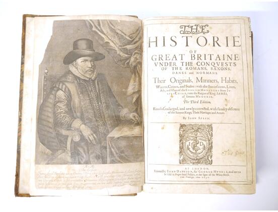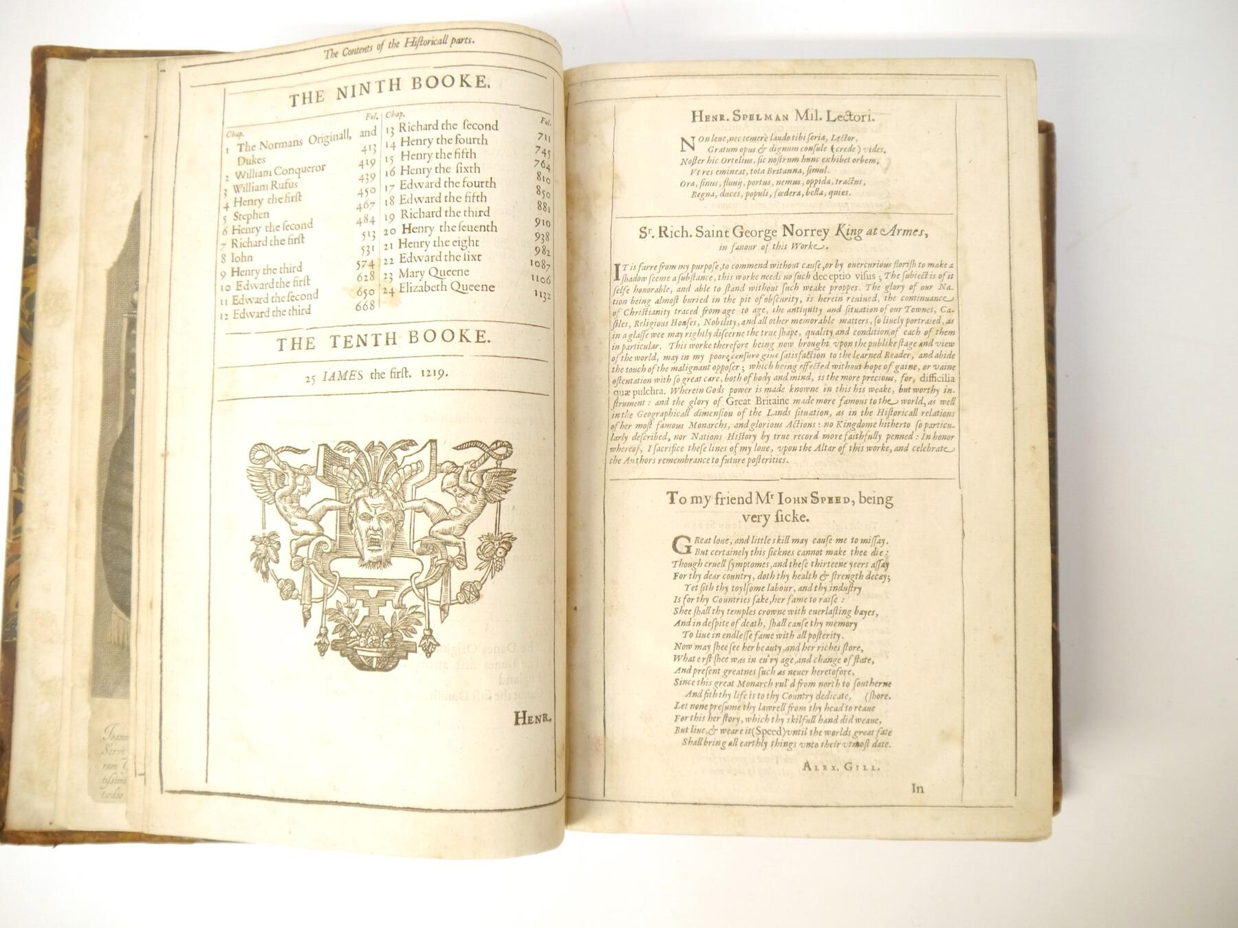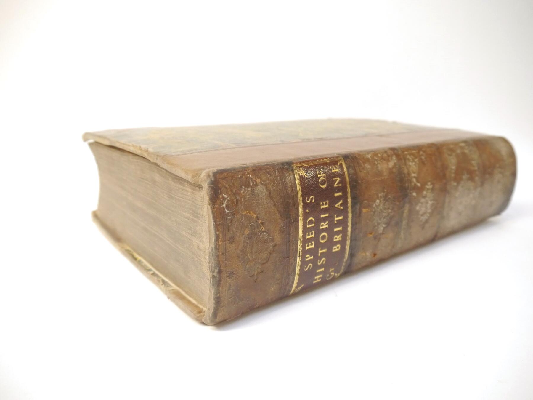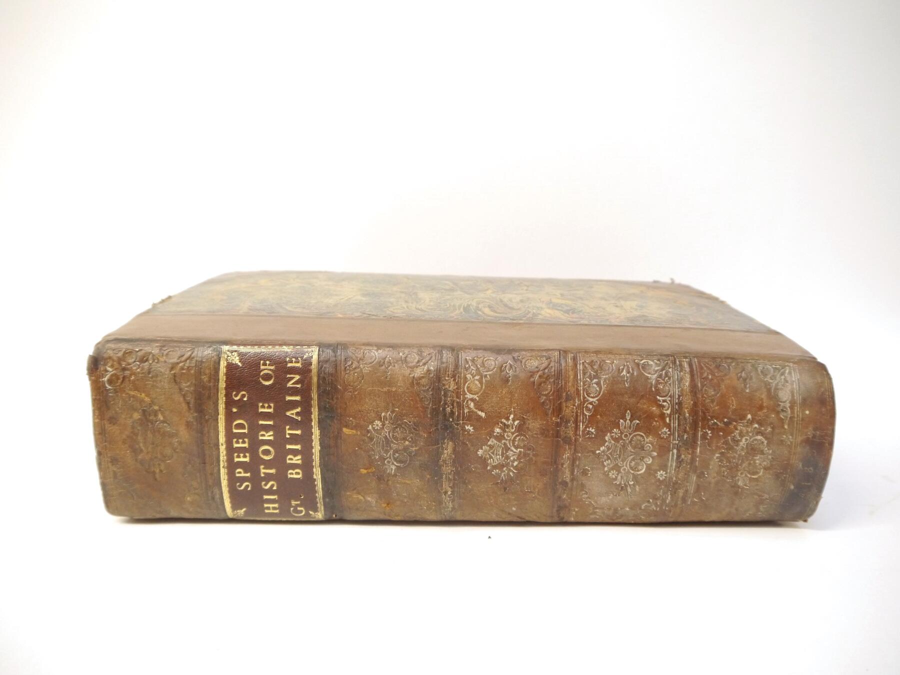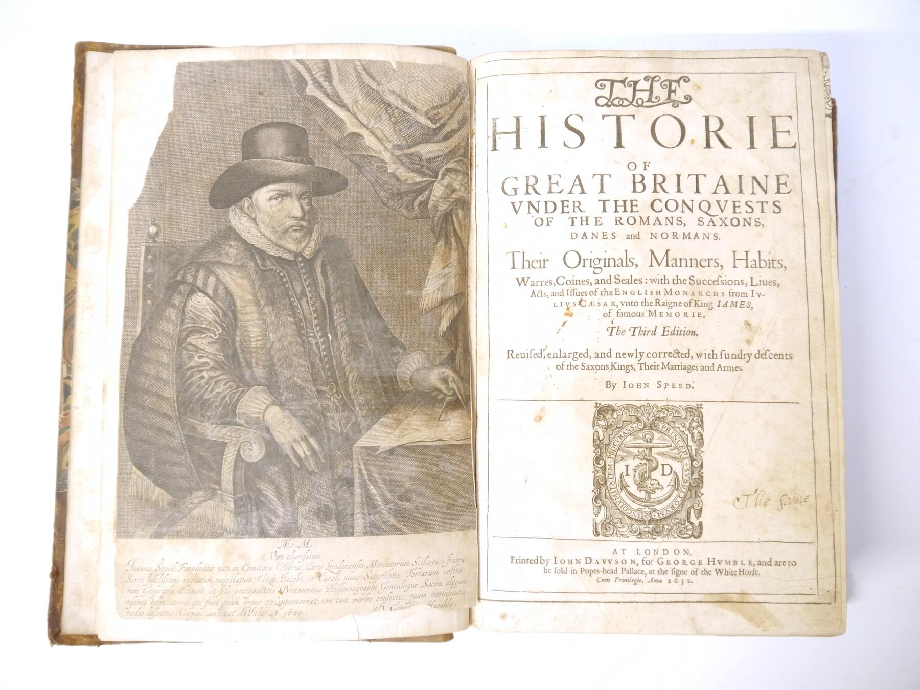John Speed: 'The Historie of Great Britaine under the Conquests of the Romans, Saxons, Danes, and Normans, their originals, manners, habits, warres, coins and seales', London, John Dawson for George Humble, 1632, engraved portrait frontis (trimmed, part loss top left corner, laid down), woodcut illustrations, head and tail pieces and decorative initials, last three leaves of index repaired with small part losses, 3rd edition revised, enlarged and newly corrected, folio, old half calf gilt over marbled paper covered boards, rebacked retaining backstrip, later morocco gilt title label