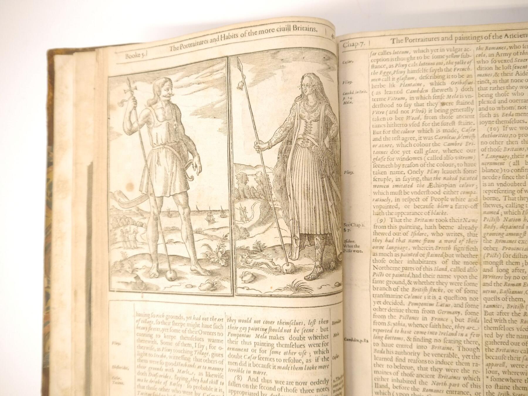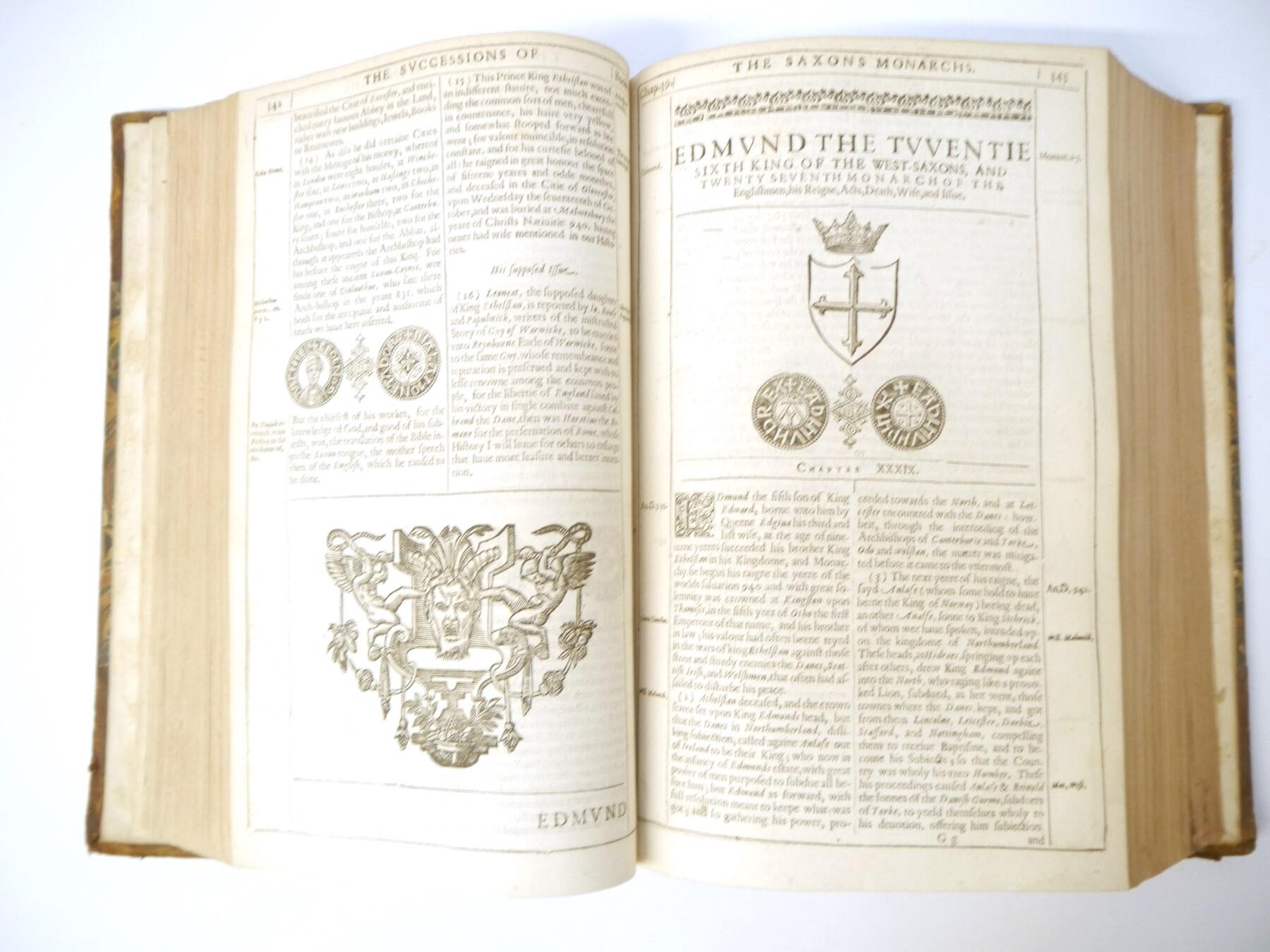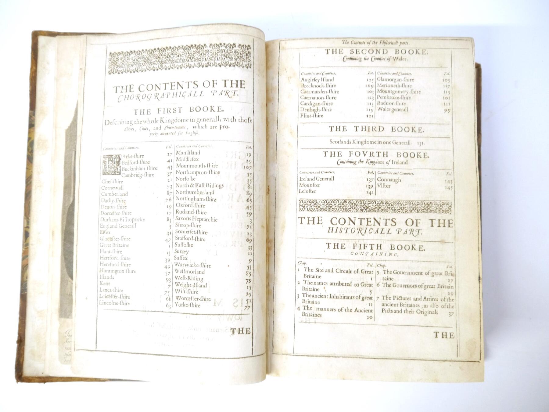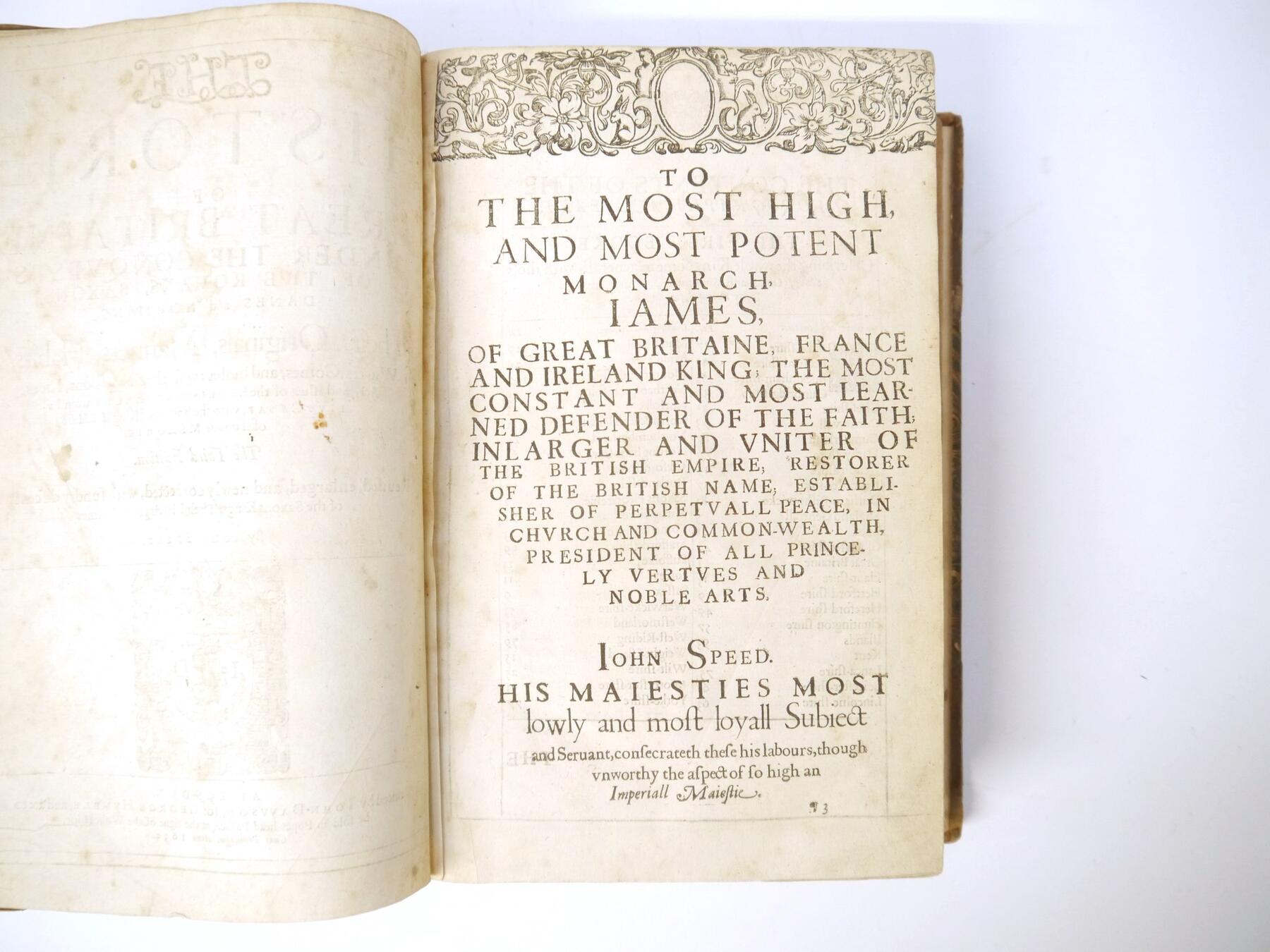 John Speed: 'The Historie of Great Britaine under the Conquests of the Romans, Saxons, Danes, and Normans, their originals, manners, habits, warres, coins and seales', London, John Dawson for George Humble, 1632, engraved portrait frontis (trimmed, part loss top left corner, laid down), woodcut illustrations, head and tail pieces and decorative initials, last three leaves of index repaired with small part losses, 3rd edition revised, enlarged and newly corrected, folio, old half calf gilt over marbled paper covered boards, rebacked retaining backstrip, later morocco gilt title label