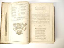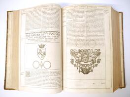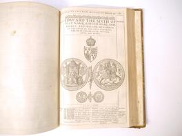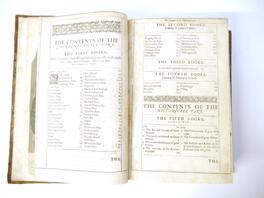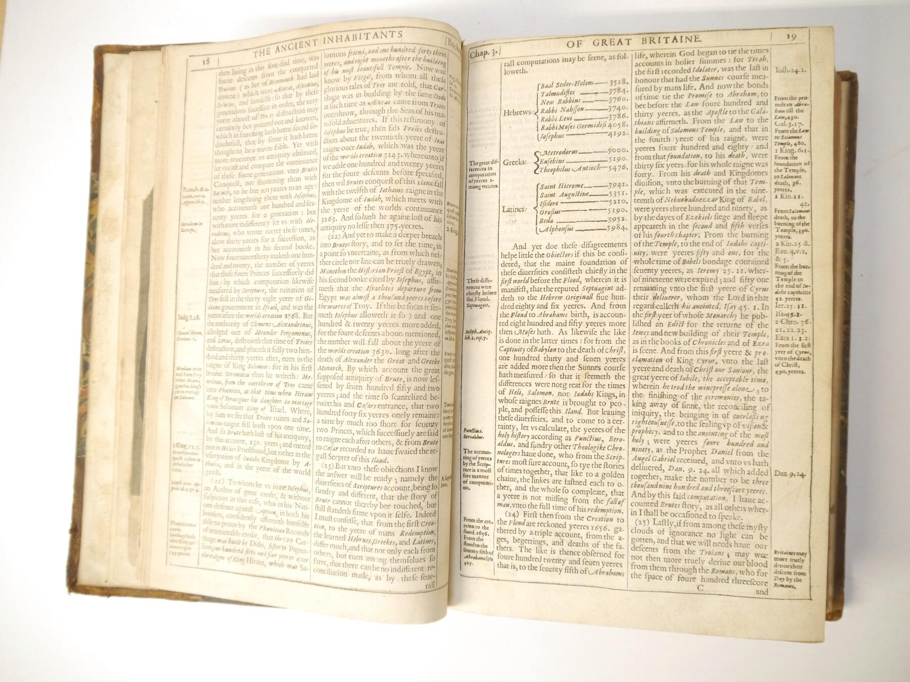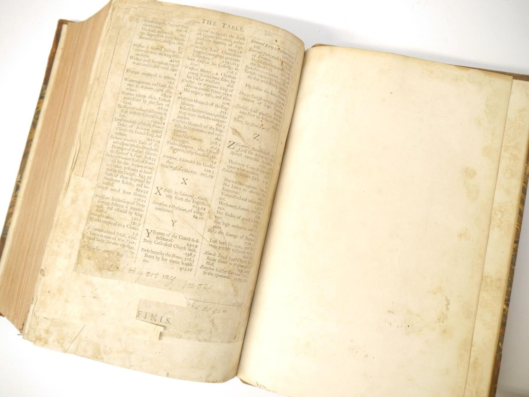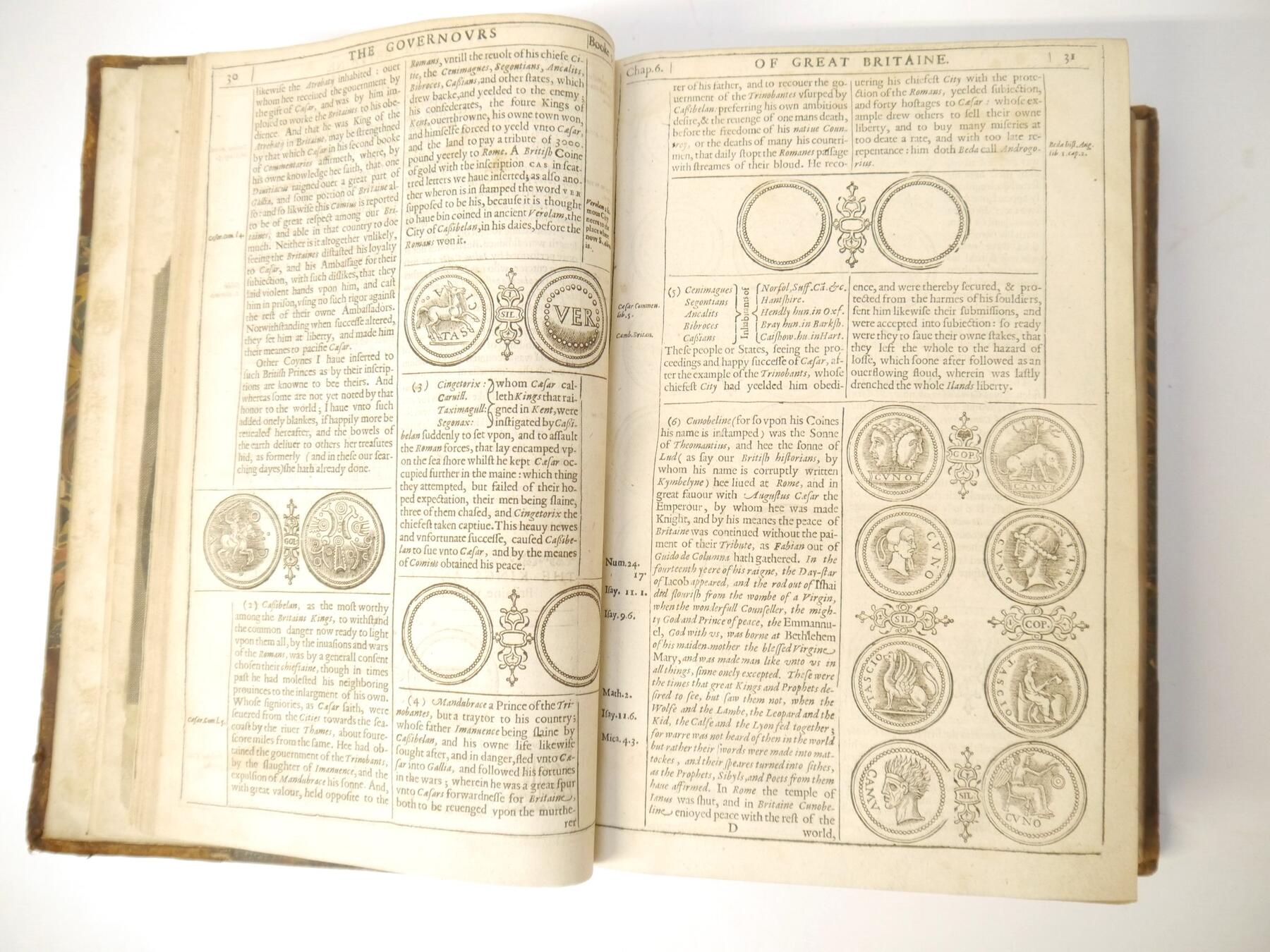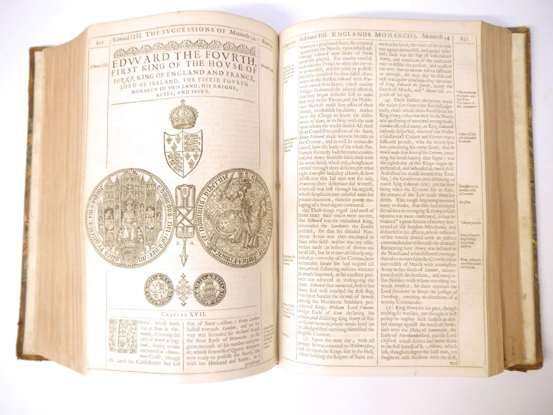 John Speed: 'The Historie of Great Britaine under the Conquests of the Romans, Saxons, Danes, and Normans, their originals, manners, habits, warres, coins and seales', London, John Dawson for George Humble, 1632, engraved portrait frontis (trimmed, part loss top left corner, laid down), woodcut illustrations, head and tail pieces and decorative initials, last three leaves of index repaired with small part losses, 3rd edition revised, enlarged and newly corrected, folio, old half calf gilt over marbled paper covered boards, rebacked retaining backstrip, later morocco gilt title label