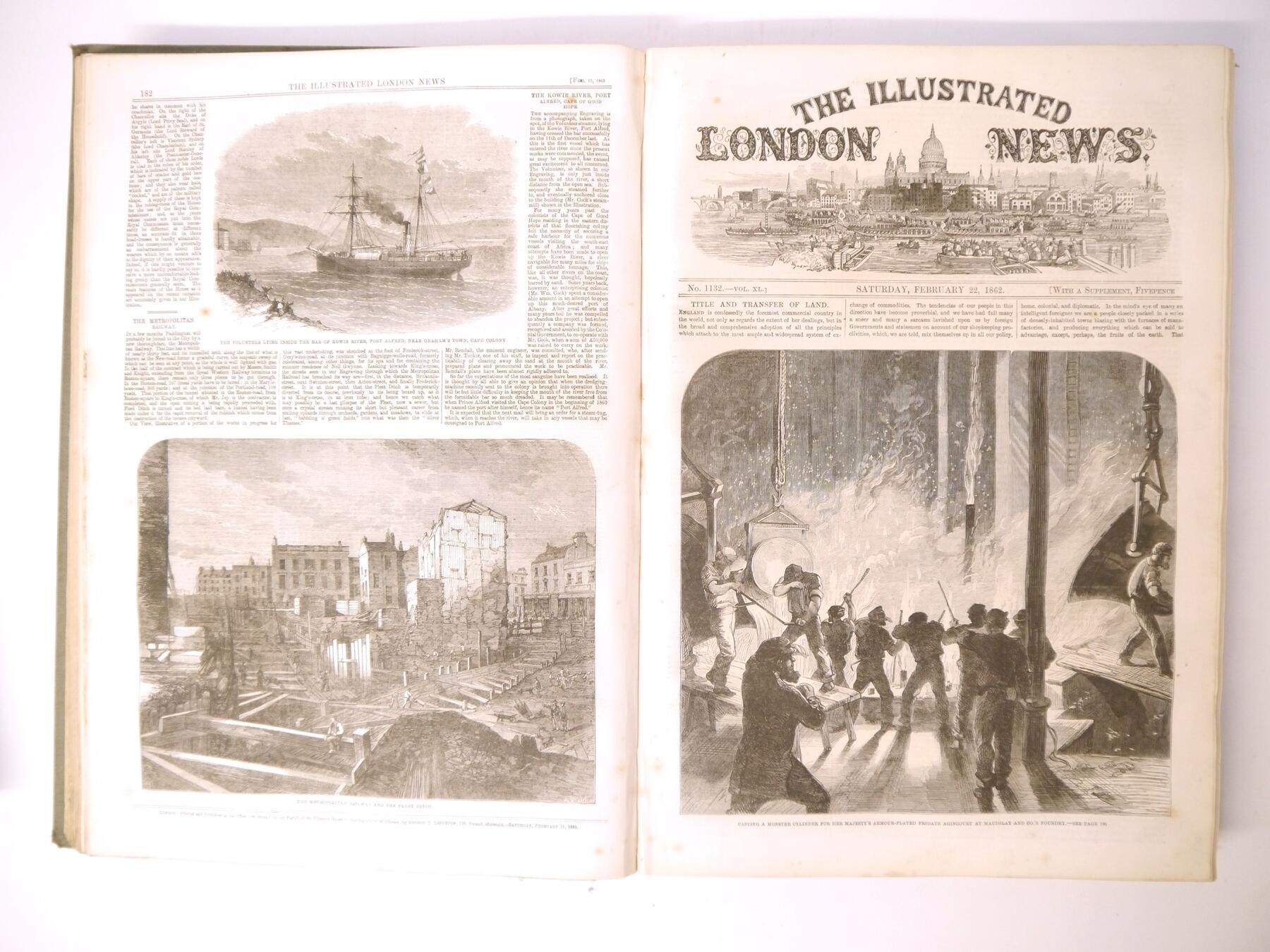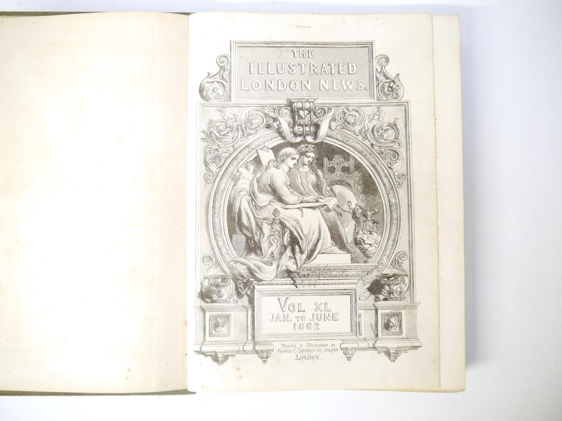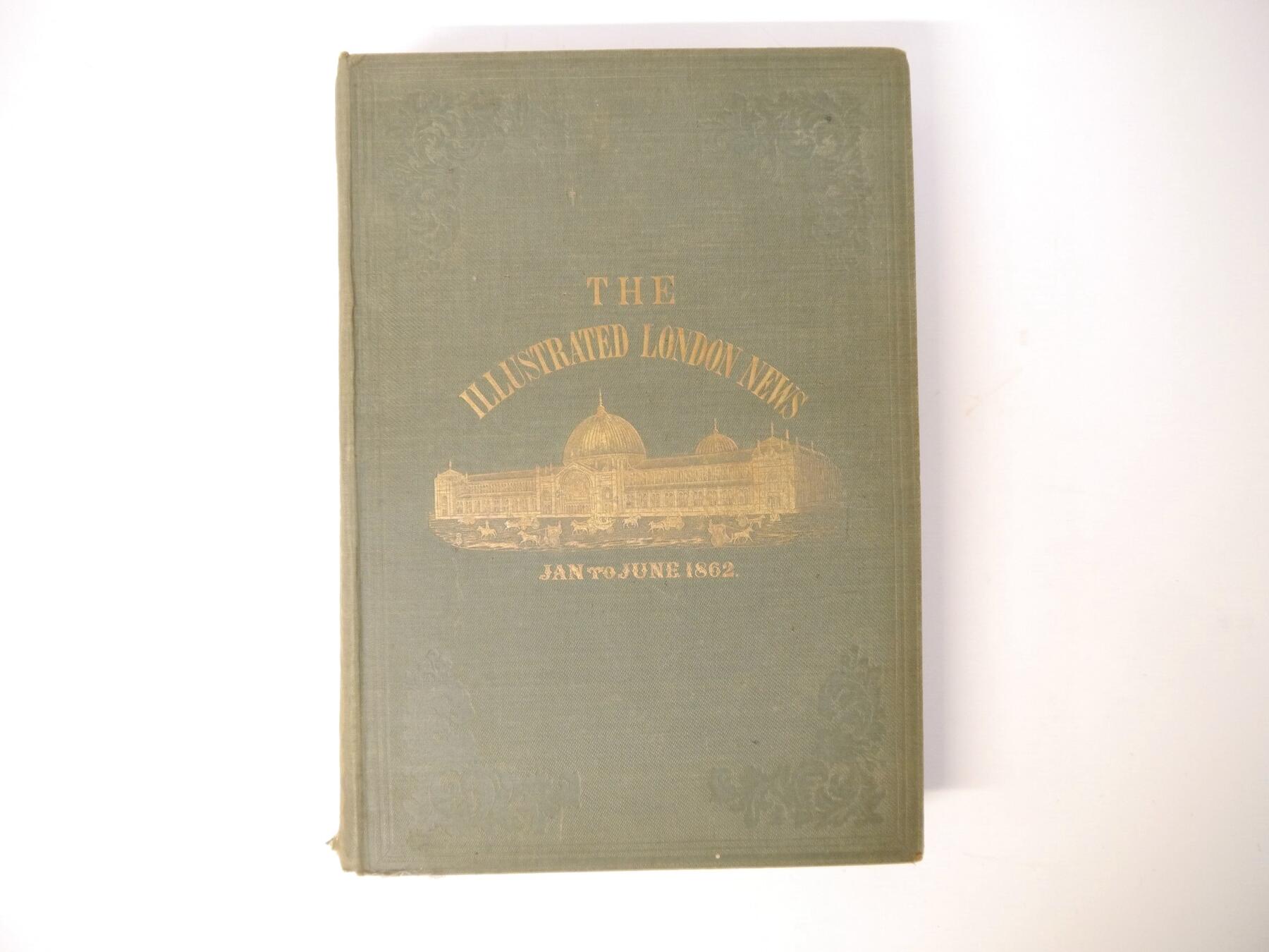 'The Illustrated London News', volume XL, January-June 1862, numerous articles and illustrations including the Great International Exhibition, American Civil War, Australia, Japan, Vancouver Island expedition etc, lacks coloured plates and a map of London (as usual) but with many full page and some double page engravings, folio, original pictorial blind stamped cloth gilt, small loss of back strip at foot, else generally very good condition