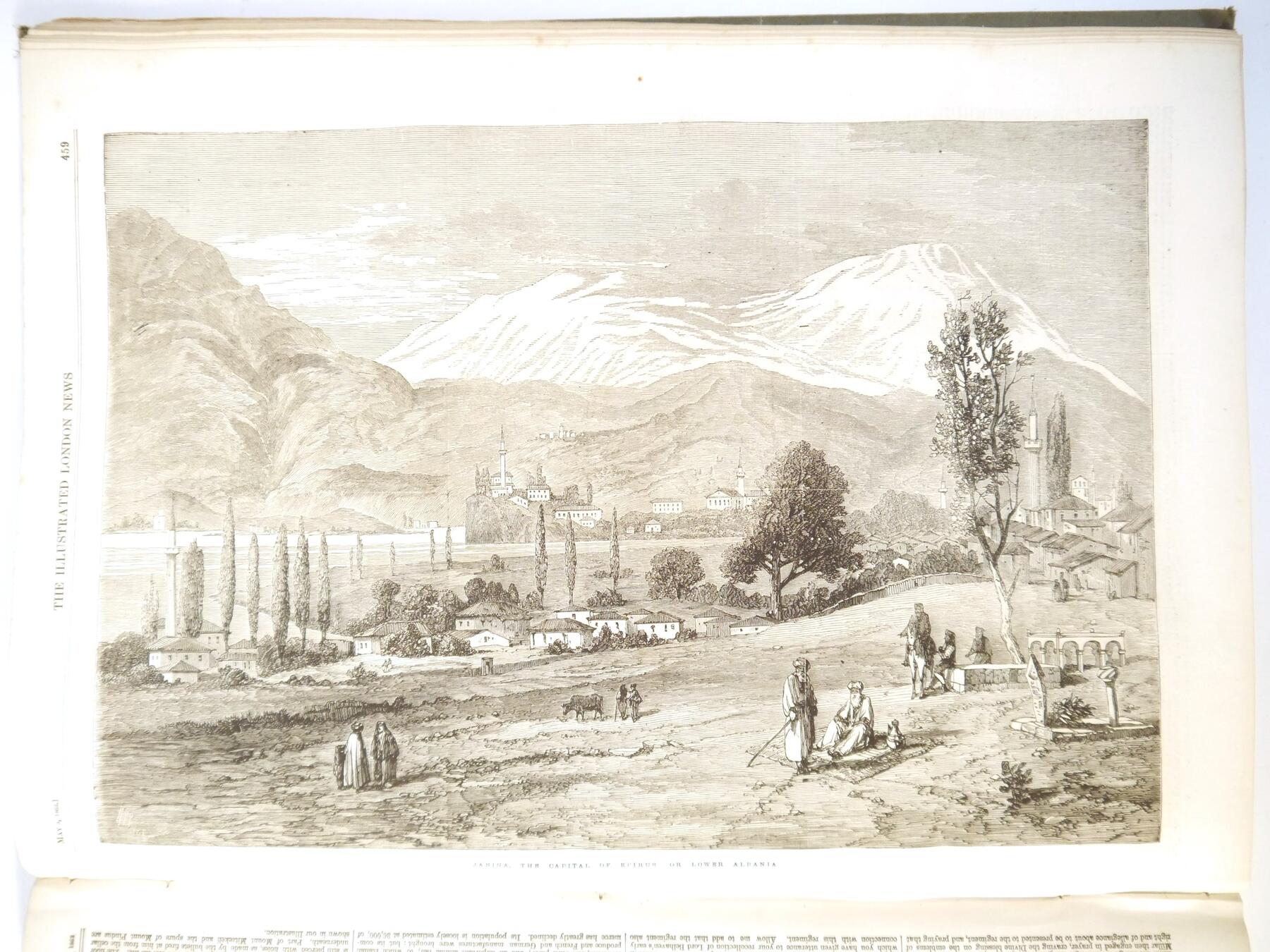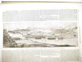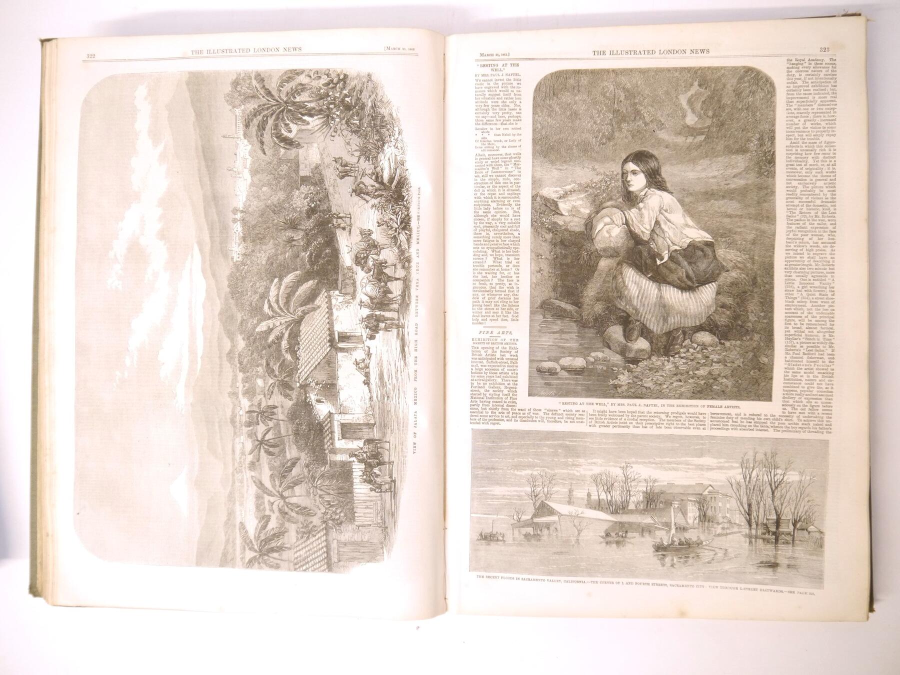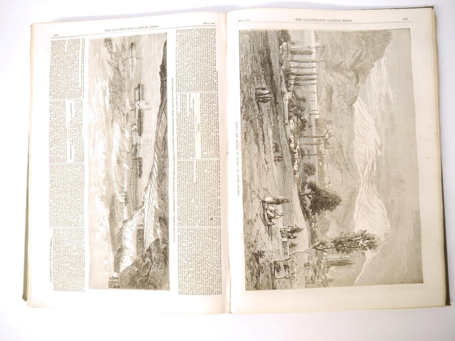 'The Illustrated London News', volume XL, January-June 1862, numerous articles and illustrations including the Great International Exhibition, American Civil War, Australia, Japan, Vancouver Island expedition etc, lacks coloured plates and a map of London (as usual) but with many full page and some double page engravings, folio, original pictorial blind stamped cloth gilt, small loss of back strip at foot, else generally very good condition