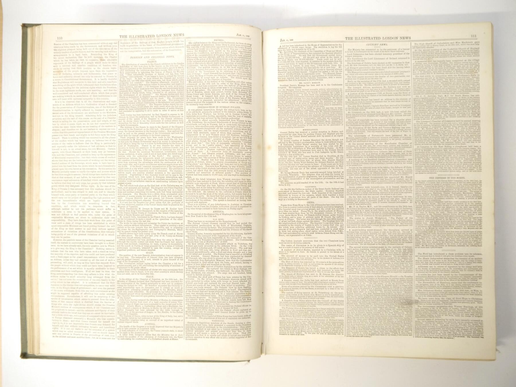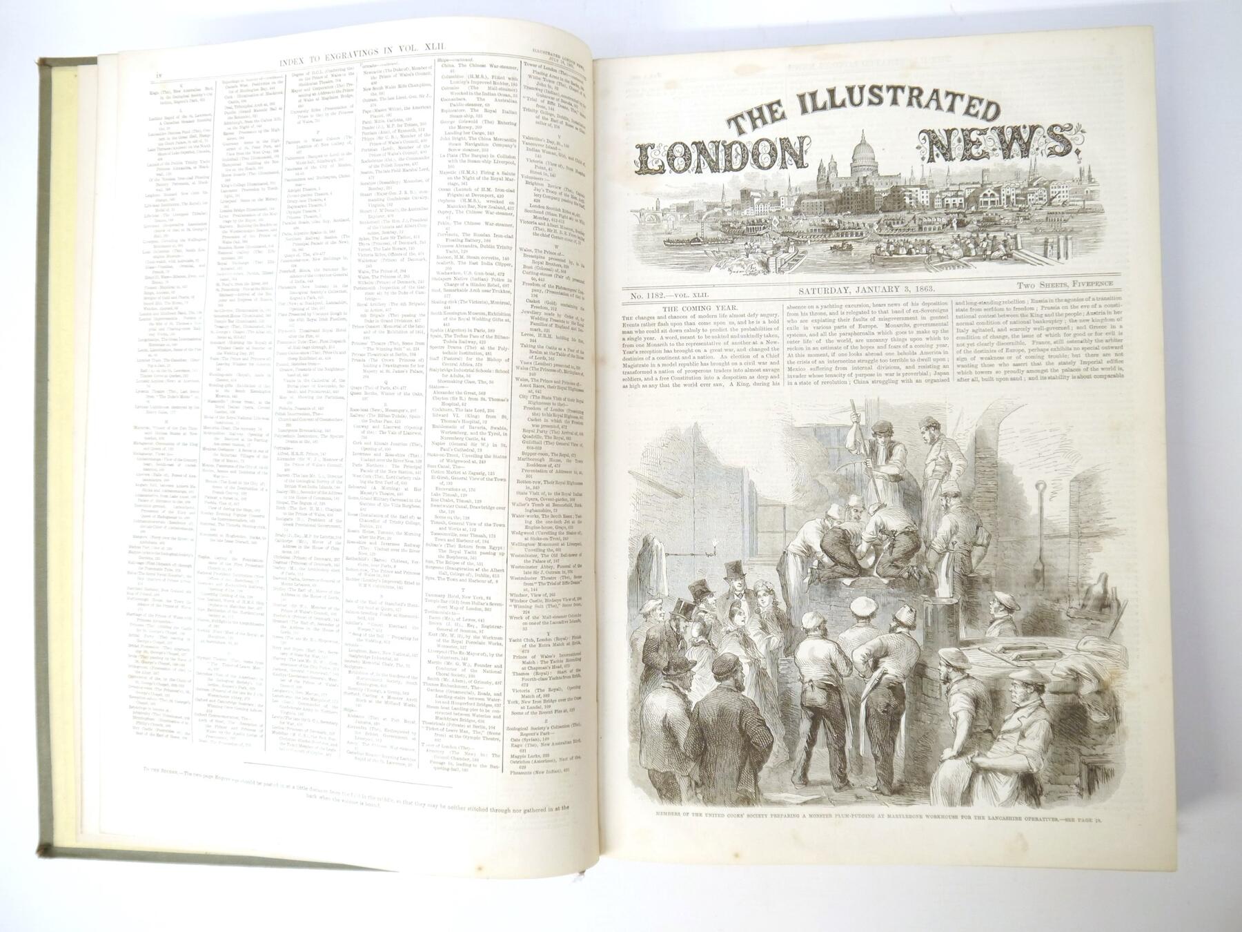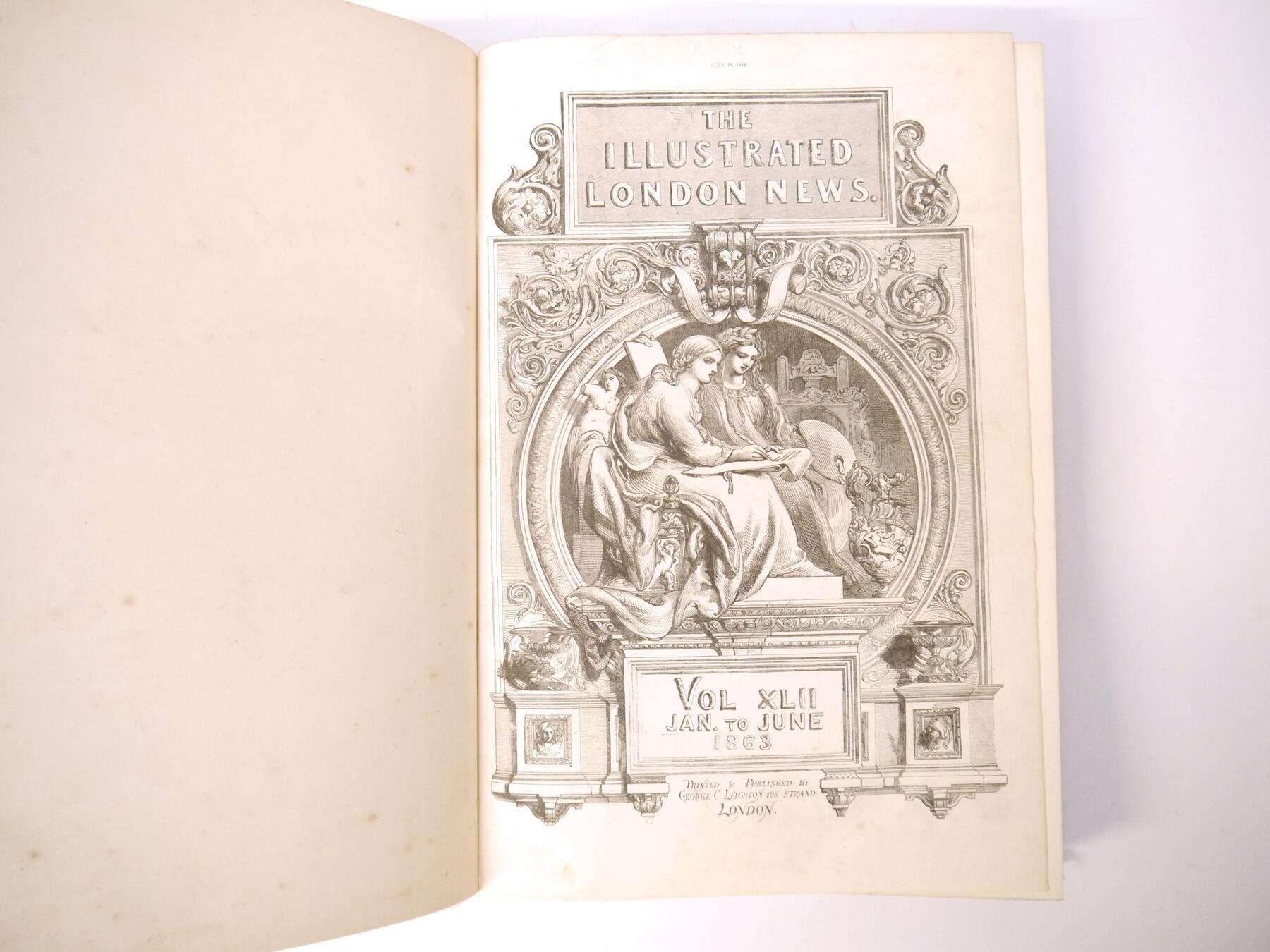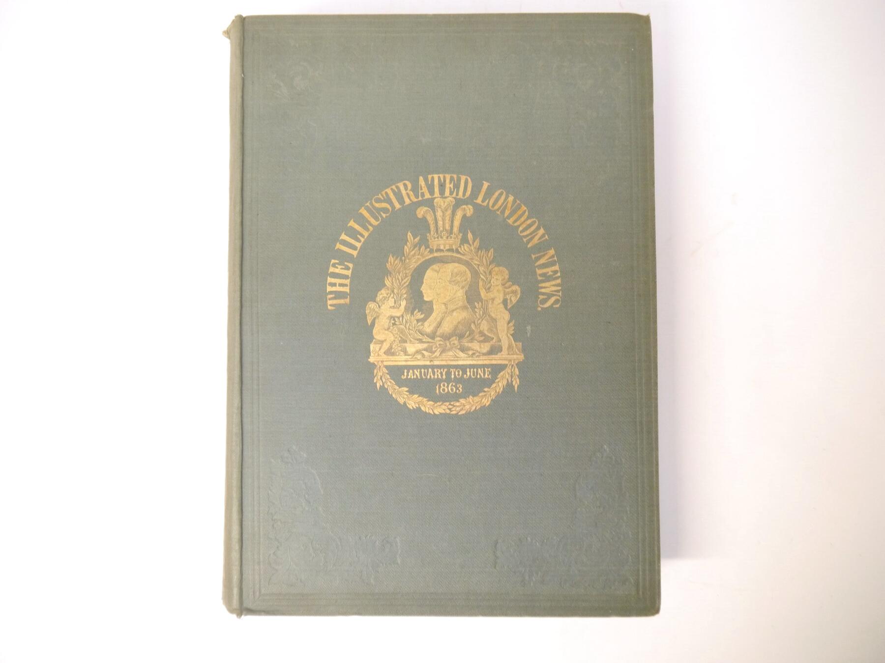 'The Illustrated London News', volume XLII, January-June 1863, numerous articles and illustrations including American Civil War, Anti Slavery demonstration at Exeter, Ascot Races, Chicha Guano Islands, Panorama of the City of Mexico etc, lacks coloured plates, many full page and some double page engravings, folio, original pictorial blind stamped cloth gilt (very good condition)