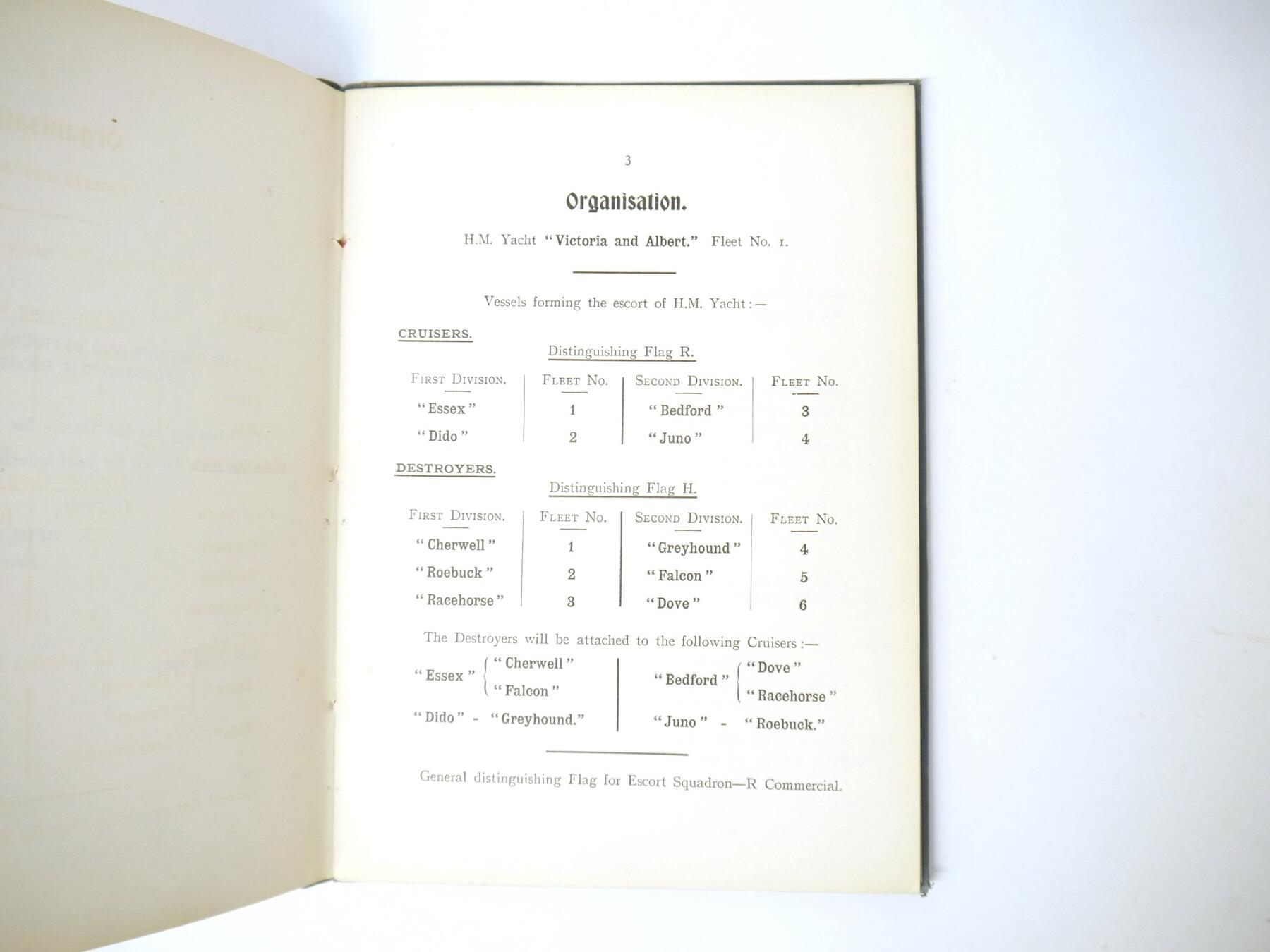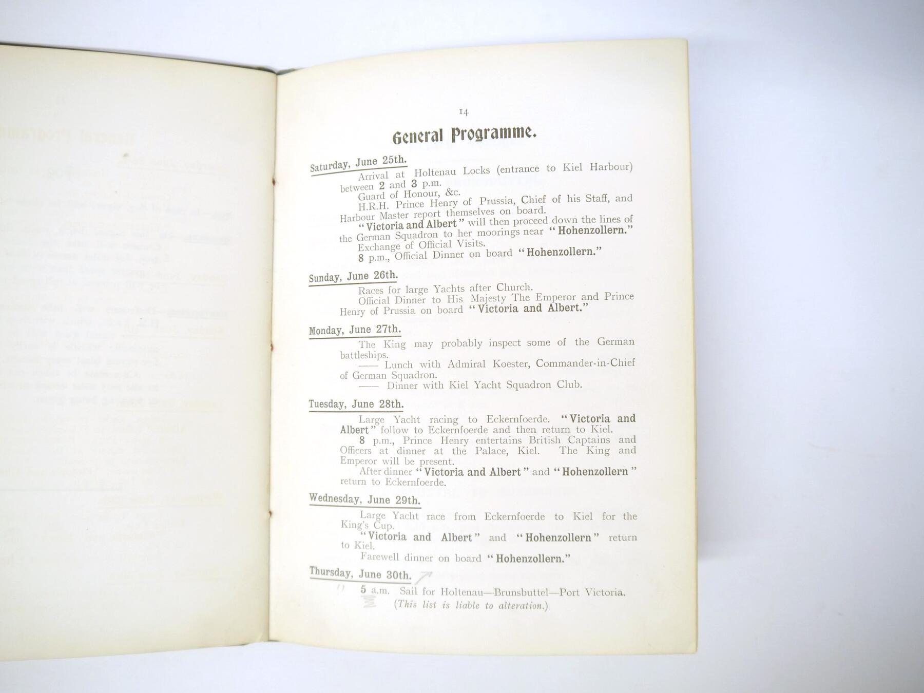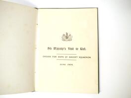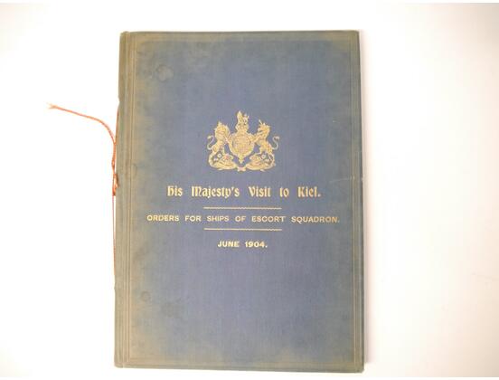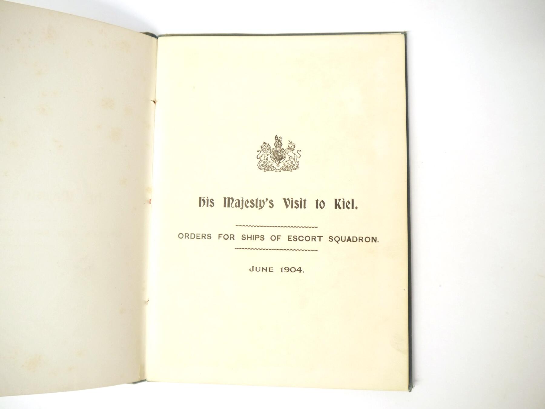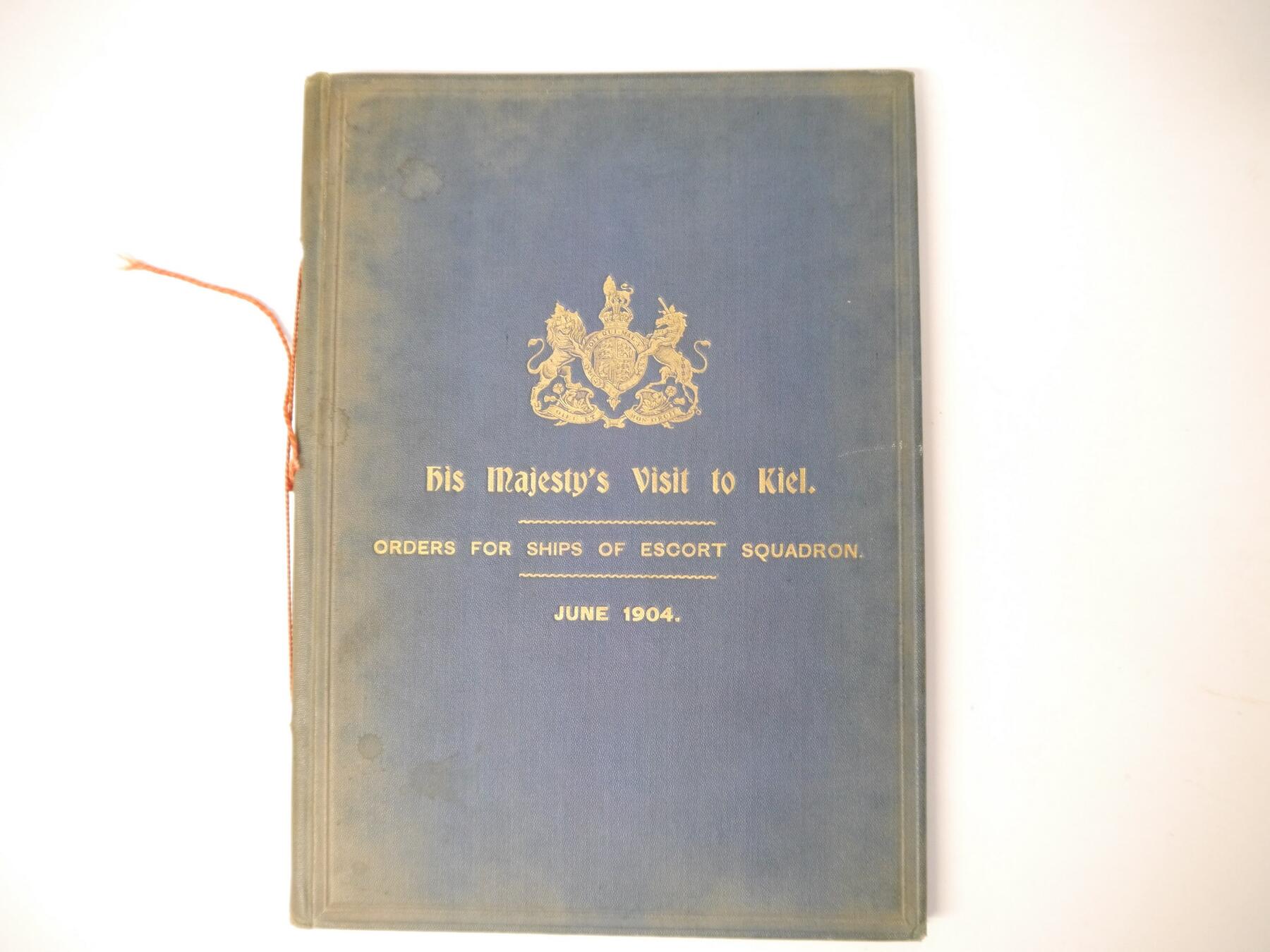 'His Majesty's Visit to Kiel. Order For Ships of Escort Squadron. June 1904', 17pp book with detailed instructions for Thursday June 23rd-Thursday June 30th, covering both outward and return voyage plus programme whilst in Kiel for Regatta Week, an intriguing event during the Anglo-German arms race and escalating tensions that led up to World War 1. Original blue cloth gilt, ribbon tie