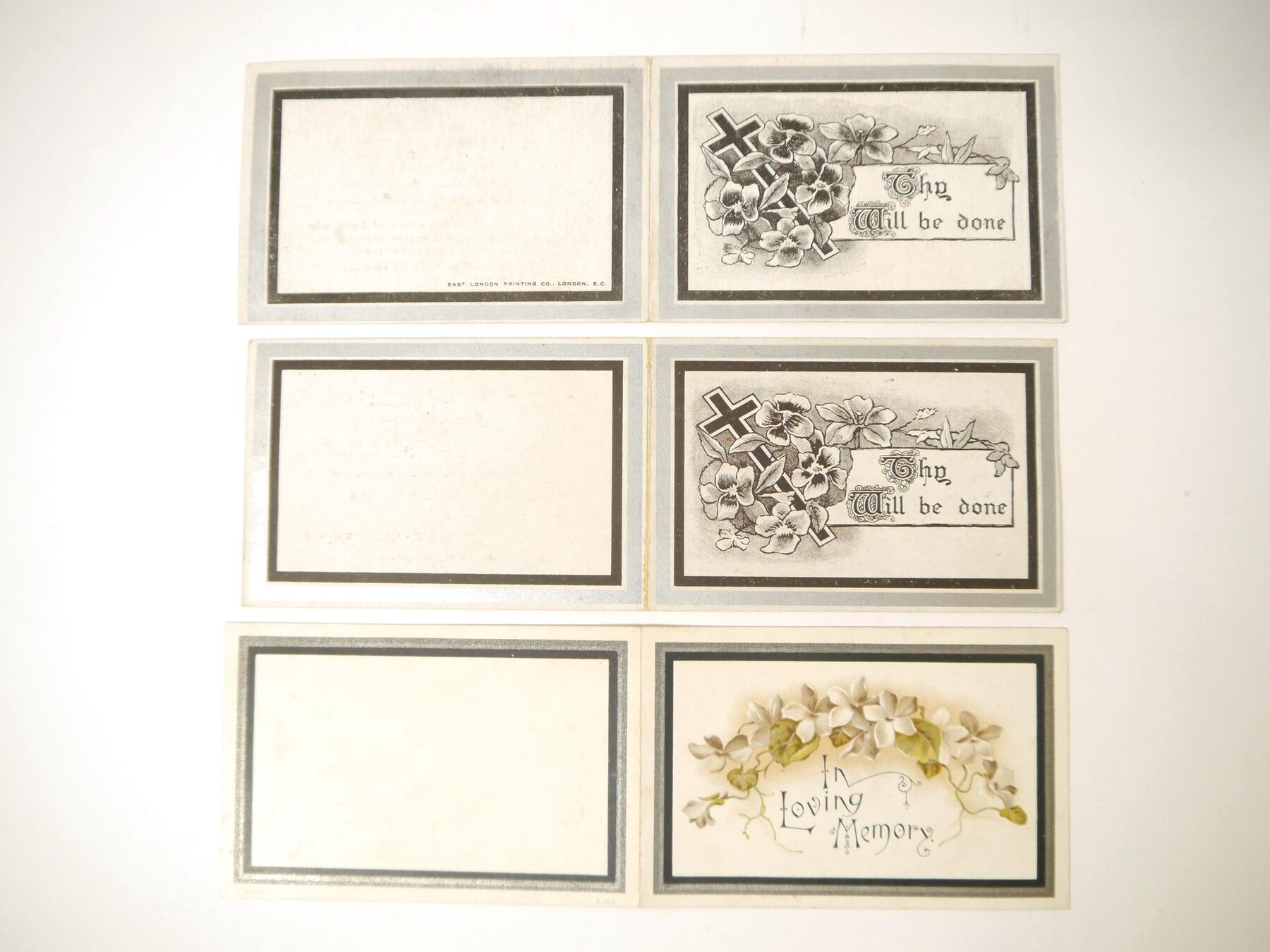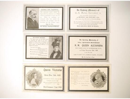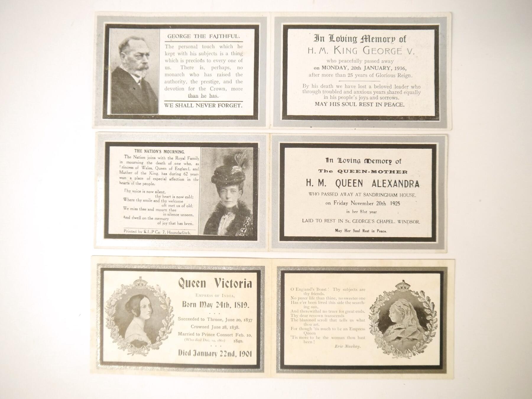 Three in Memoriam folding cards: Queen Victoria, Queen Alexandra and George V, each approx 7.5 x 23cm (opened)