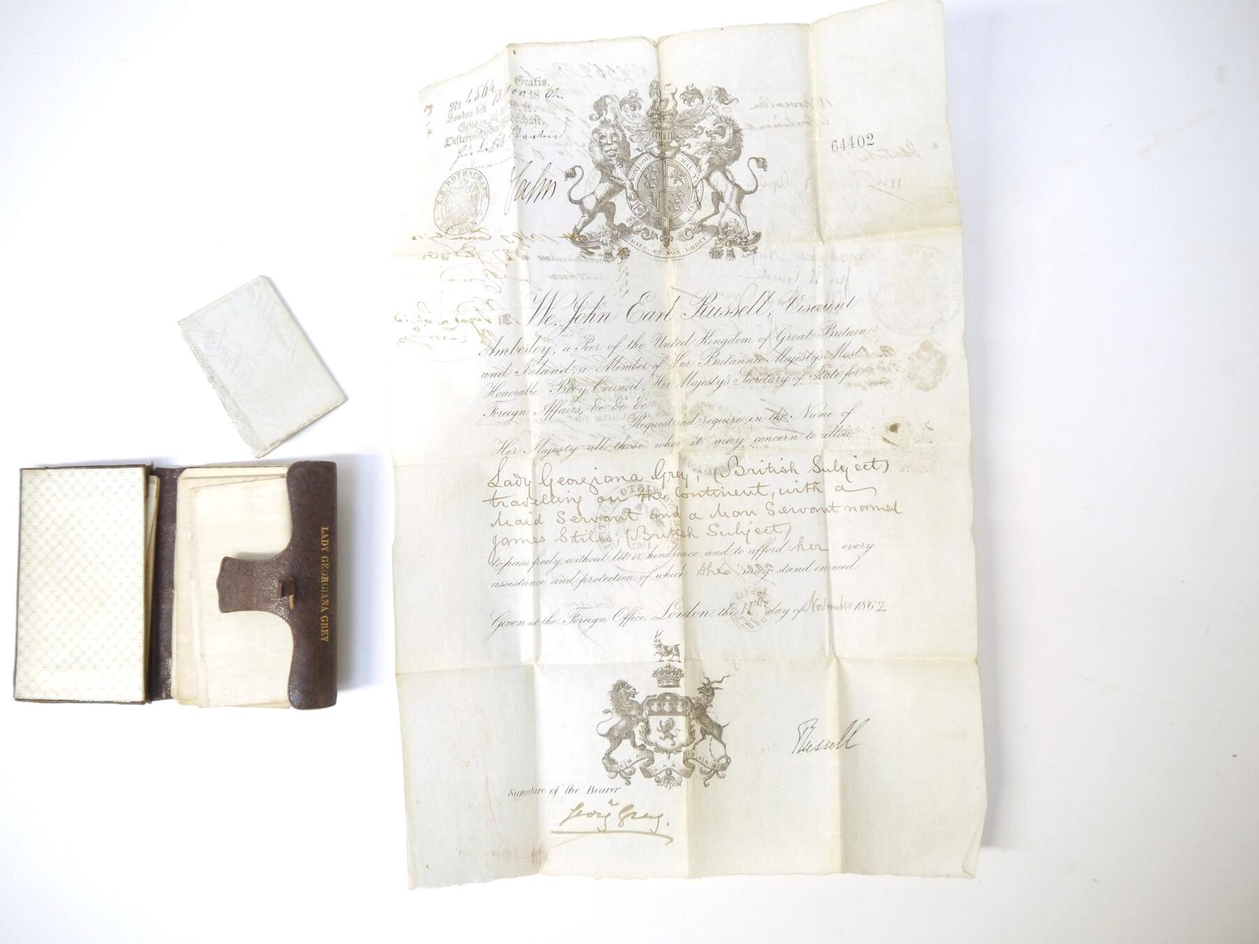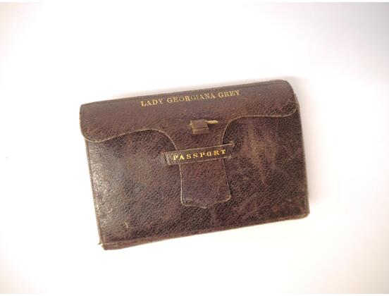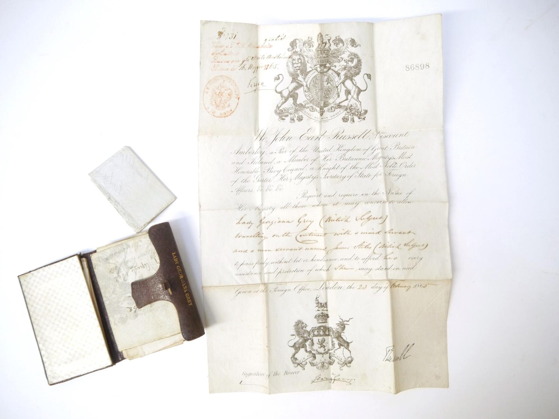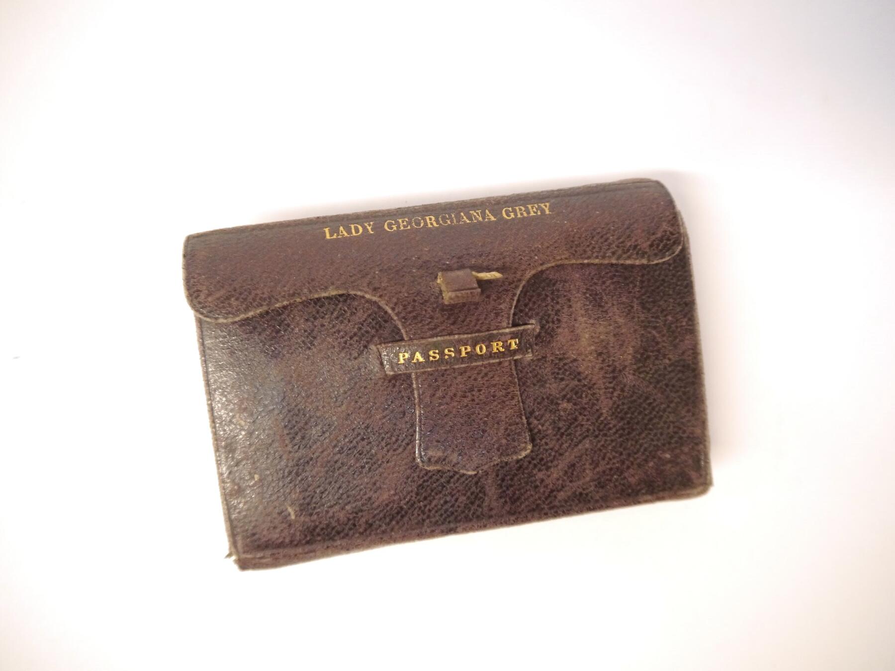 Lady Georgiana Grey (1801-1900), a 19th Century leather wallet containing five passports for Lady Georgiana Grey to travel on the continent, circa 1862-1865, together with a maid servant and a man servant, James Stiles, 3 of the documents signed by Lady Georgiana Grey, together with a few European CDV's and other relevent cuttings housed in pocket of wallet, the wallet bearing the word ''passport'' and her name in gilt. Lady Georgiana Grey was the daughter of Charles, 2nd Earl Grey, reform statesmen whose tenure saw the passing of the obolition of slavery in the British Empire in 1833. In her young days Lady Georgiana Grey was one of the beauties of the period, and shone in art, music and politics. The Queen regularly sent her a letter of congratulation on her birthday and on the occasion of the Diamond Jubilee her majesty awarded her a silver medal