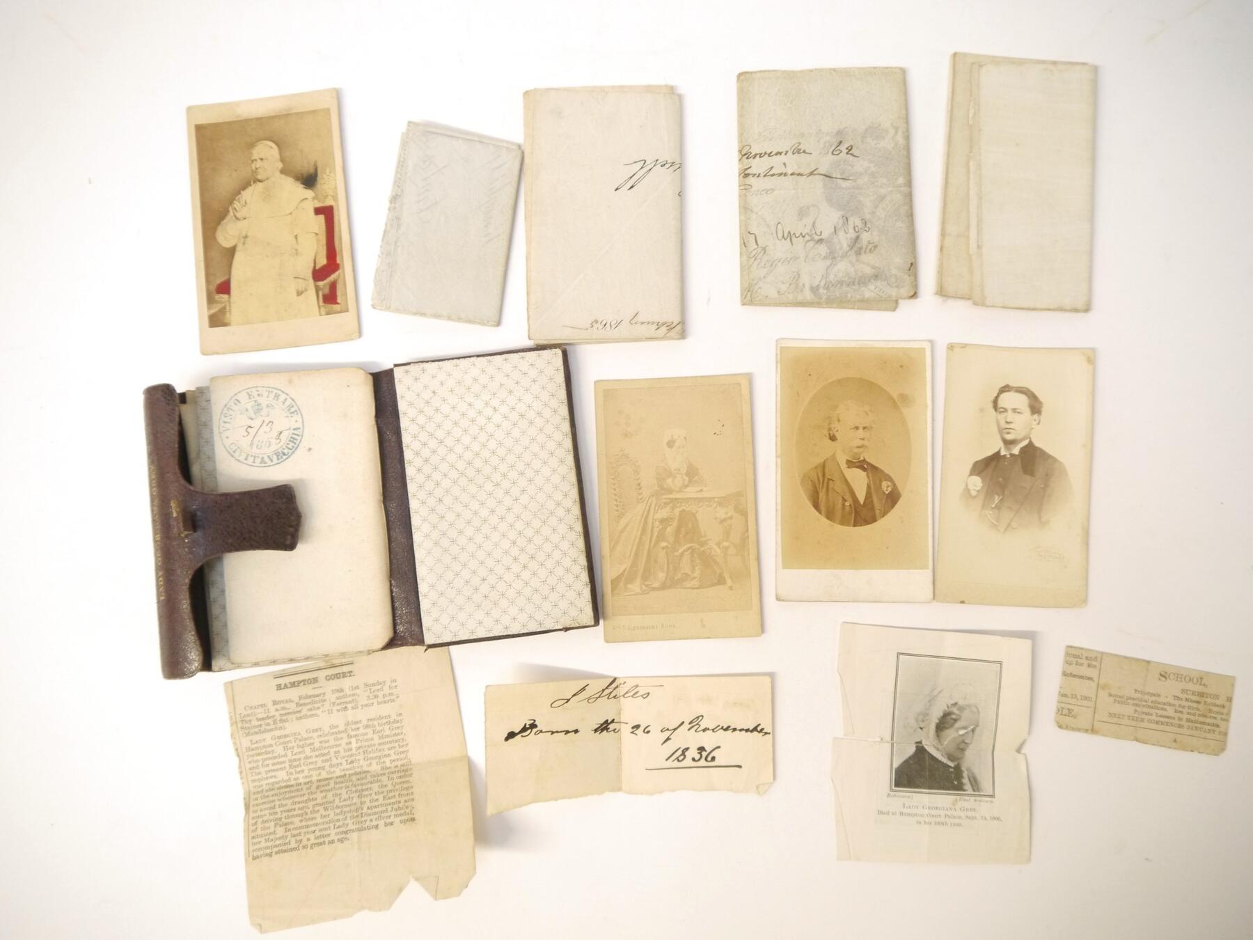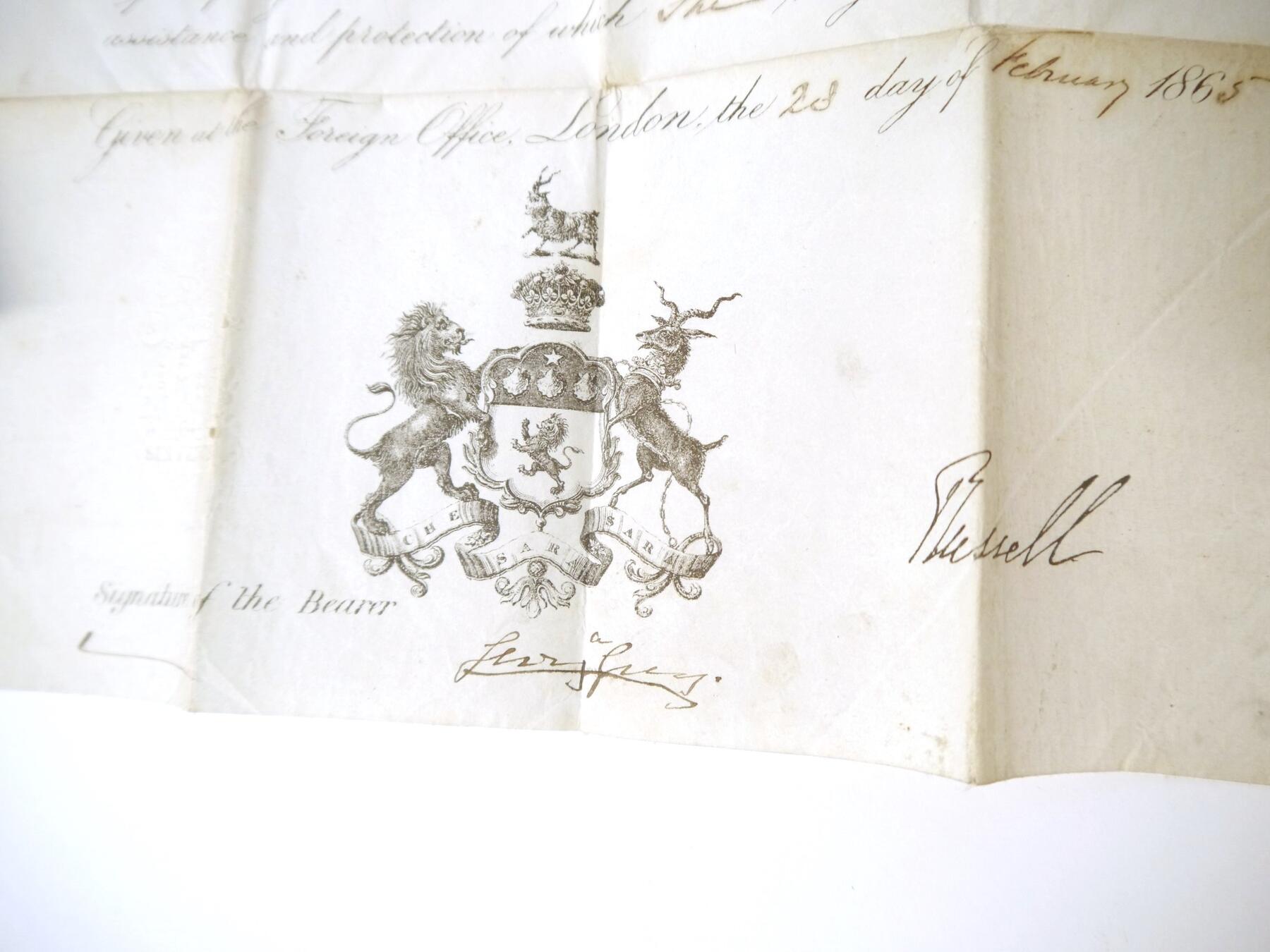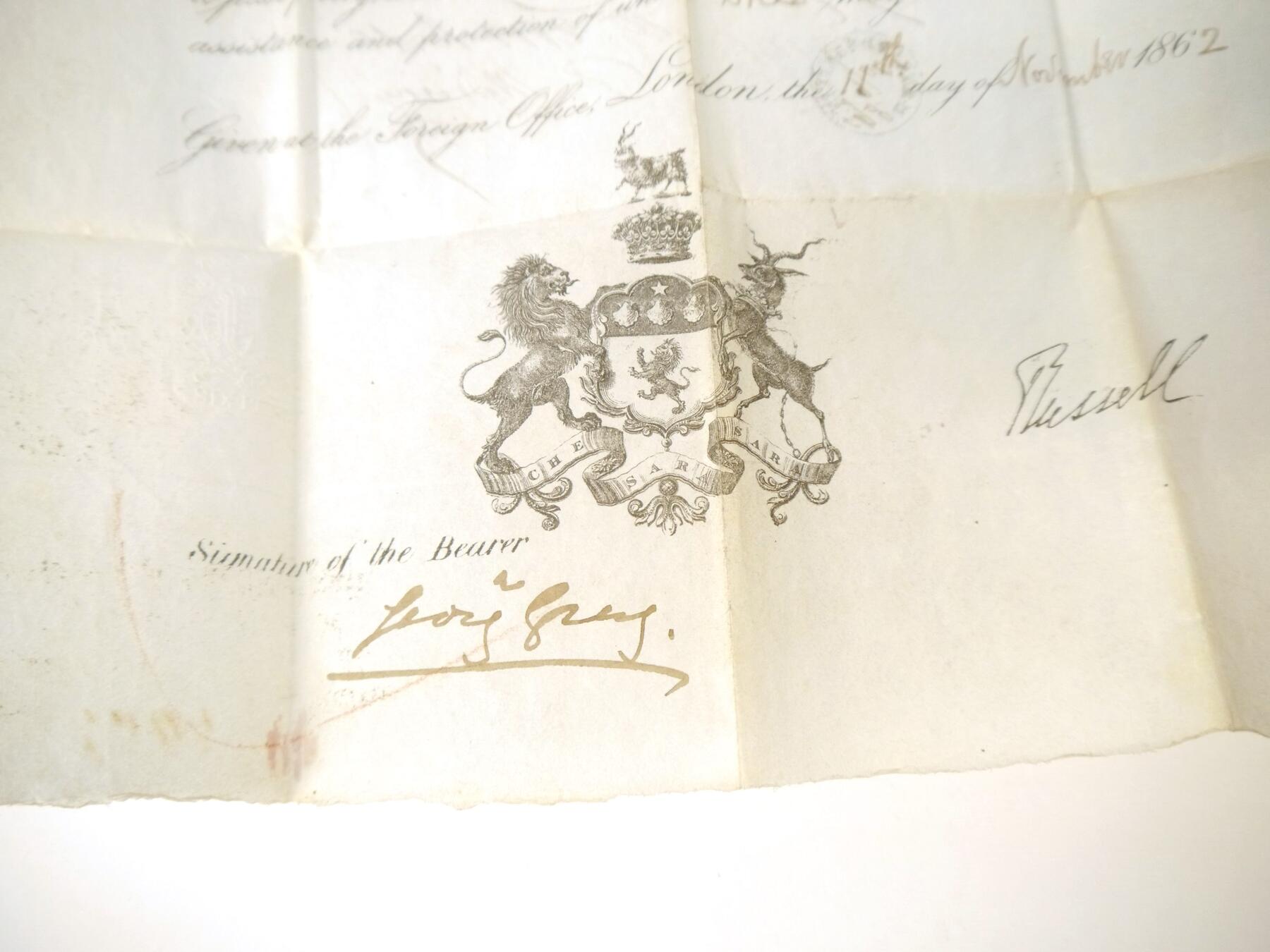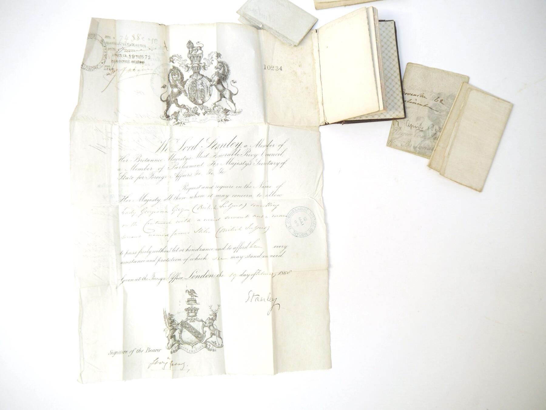 Lady Georgiana Grey (1801-1900), a 19th Century leather wallet containing five passports for Lady Georgiana Grey to travel on the continent, circa 1862-1865, together with a maid servant and a man servant, James Stiles, 3 of the documents signed by Lady Georgiana Grey, together with a few European CDV's and other relevent cuttings housed in pocket of wallet, the wallet bearing the word ''passport'' and her name in gilt. Lady Georgiana Grey was the daughter of Charles, 2nd Earl Grey, reform statesmen whose tenure saw the passing of the obolition of slavery in the British Empire in 1833. In her young days Lady Georgiana Grey was one of the beauties of the period, and shone in art, music and politics. The Queen regularly sent her a letter of congratulation on her birthday and on the occasion of the Diamond Jubilee her majesty awarded her a silver medal