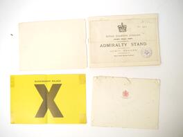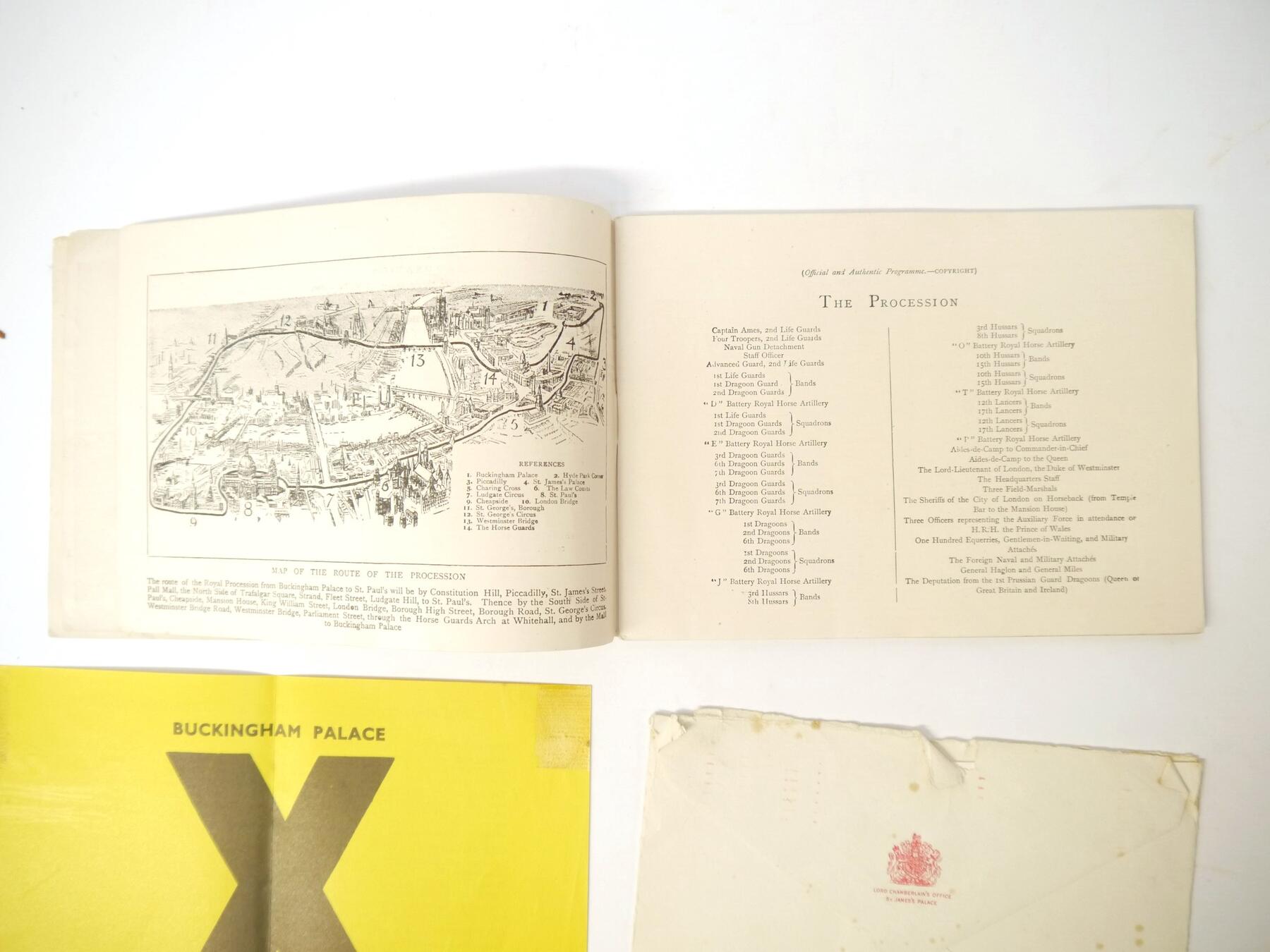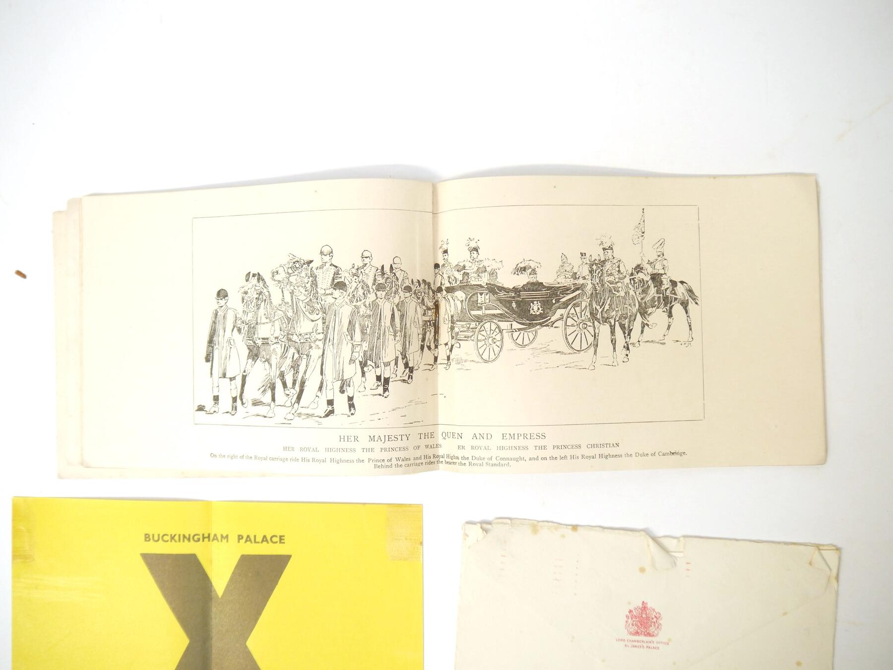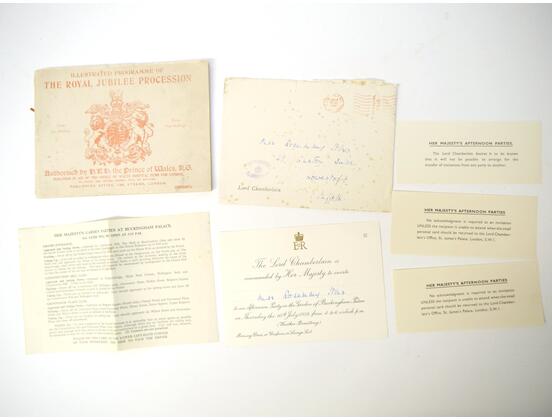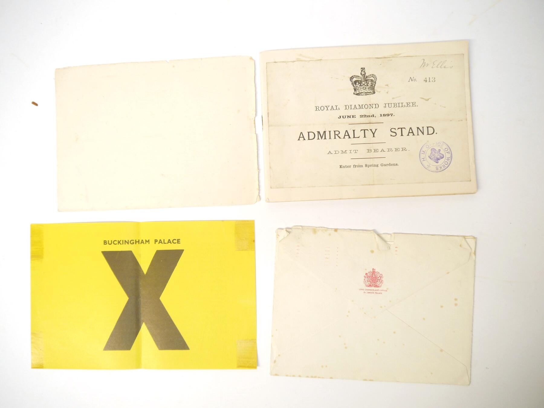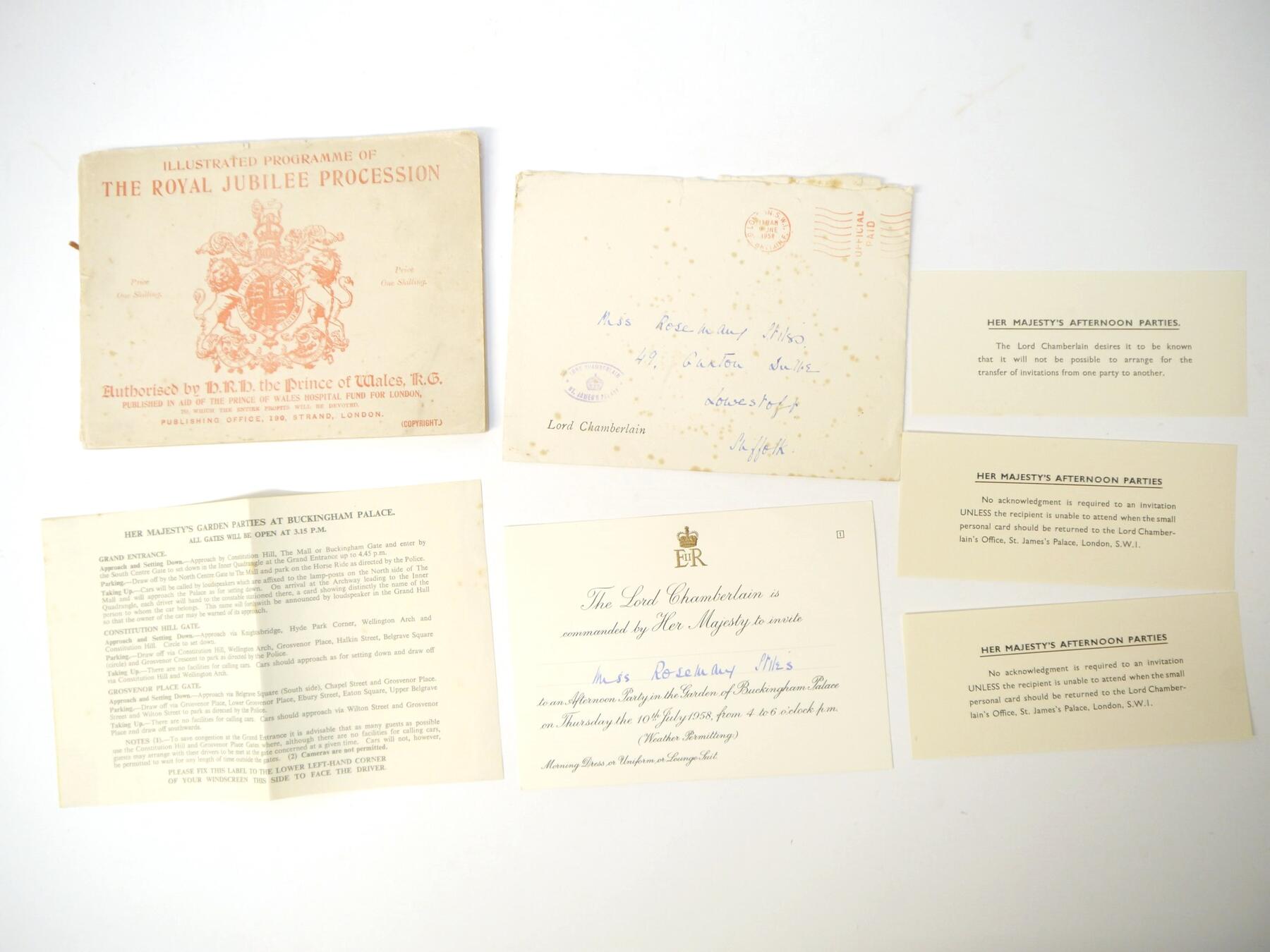 An 'Illustrated Programme of The Royal Jubilee Procession, June 22nd, 1897', with a corresponding Royal Diamond Jubilee 1897 admission ticket for Admiralty Stand mounted to first blank leaf, top wrap detached but present, lacks lower wrap, plus a Queen Elizabeth II invitation to an afternoon garden party, Buckingham Palace 1958, with some related printed slips and directions/windscreen label