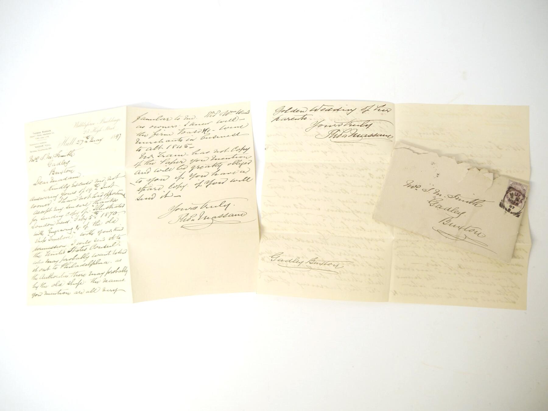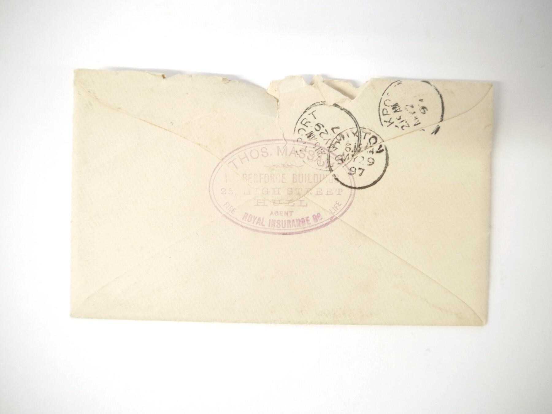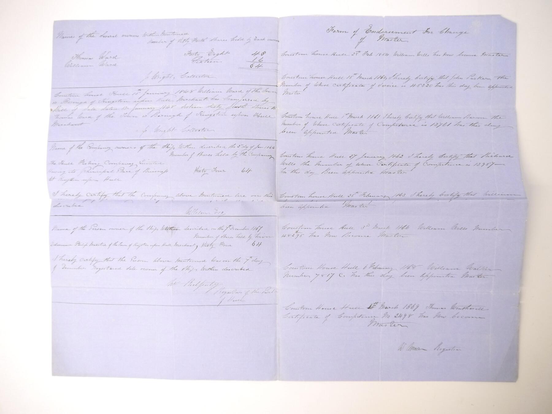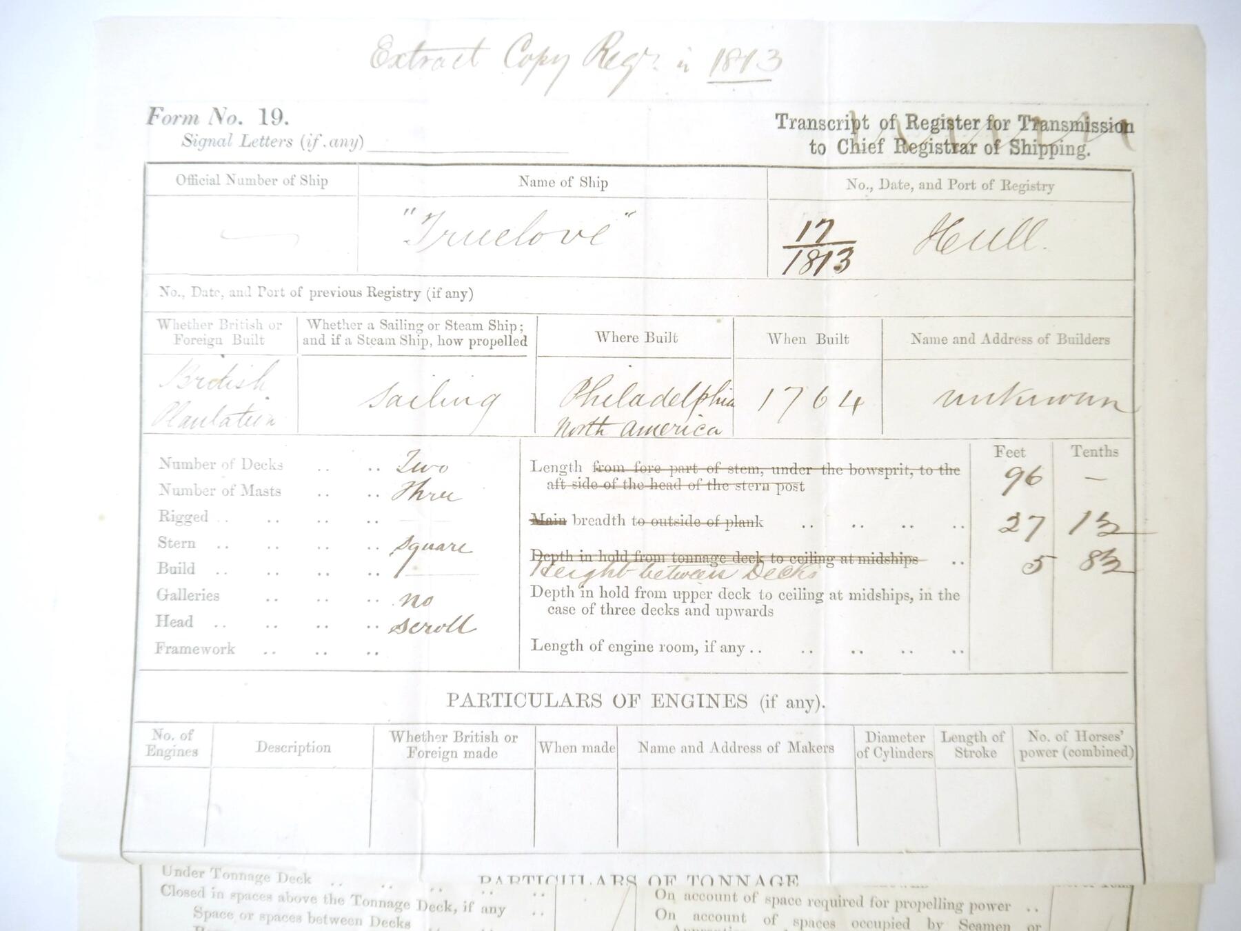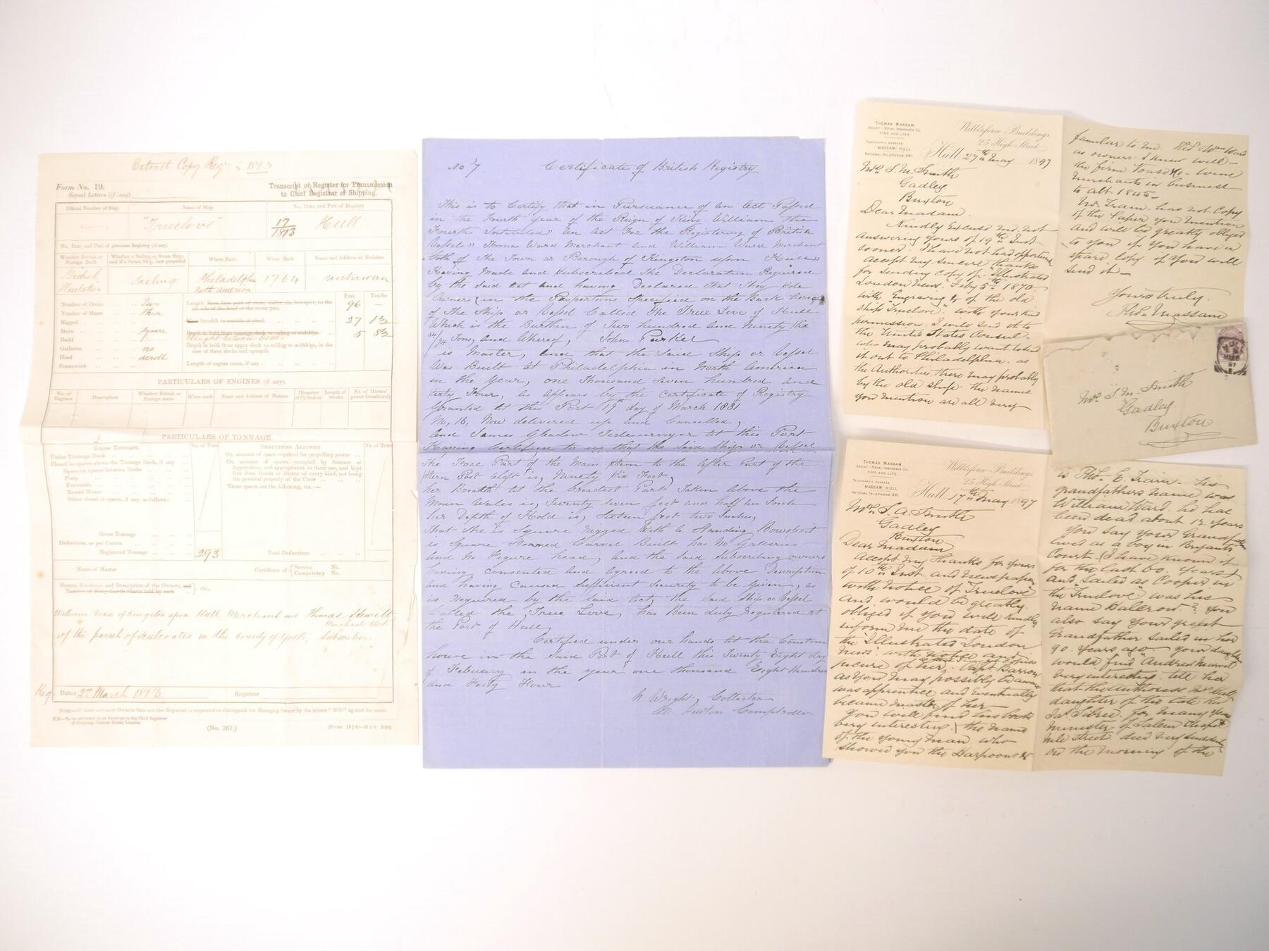 Certificate of Registration 1844 for the famous ex american whaler Truelove, together with an extract copy of an 1813 certificate and two relevant letters. The Truelove was constructed in Philadelphia in 1764, but was captured by the British in the American War of Independence and converted to a whaling ship in 1784 registered at Hull. It made over 80 voyages catching 500 whales and was the last pure sail ship in Baltic whaling fleets. It took relief supplies in the search for the Franklin expedition, during which time she was threatened with sinking due to pack ice several times but was the only unharmed ship of the twenty trapped by ice in Melville Bay. Captained for seventeen years by John Parker, who captained various whalers for 27 years, and who campaigned on behalf of the Inuit of Baffin Island, bringing a couple to Britain. Truelove changed to a general cargo ship in 1868 and in 1873 visited Philadelphia to celebrate her 109th ''birthday''. She was moored as a hulk in the Thames until broken up circa 1888 after 124 years of service. The Certificate of Registration, Hull, 1844, recites its origins in Philadelphia and that it had been previously registered at Hull in 1831, that John Parker was Master and gives a detailed description of its size, burthen and characteristics. The inside pages record changes in ownership and of Masters, including a reappearance of Parker in 1860/61 and William Barron (1861/62) who had started as an apprentice on the Truelove in 1849 and published a book 'Old Whaling Days' in 1895. Also William Wells (1854/60 & 1866/68), advisor to the Arctic explorer Benjamin Leigh Smith. Together with an extract copy of 1813 registration details mentioning the owner as William Voase of Hull, presumably a relative of John Voase, wine merchant, the first owner after the Truelove fell into British hands and who used it to ship wine from Portugal before converting it into a whaler; plus two letters and envelope (1897) from a Hull resident mentioning that he knew the Ward owners listed in the registration and also one of the crew.