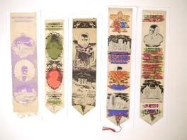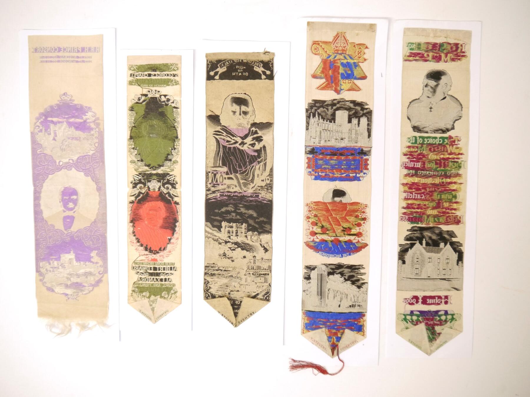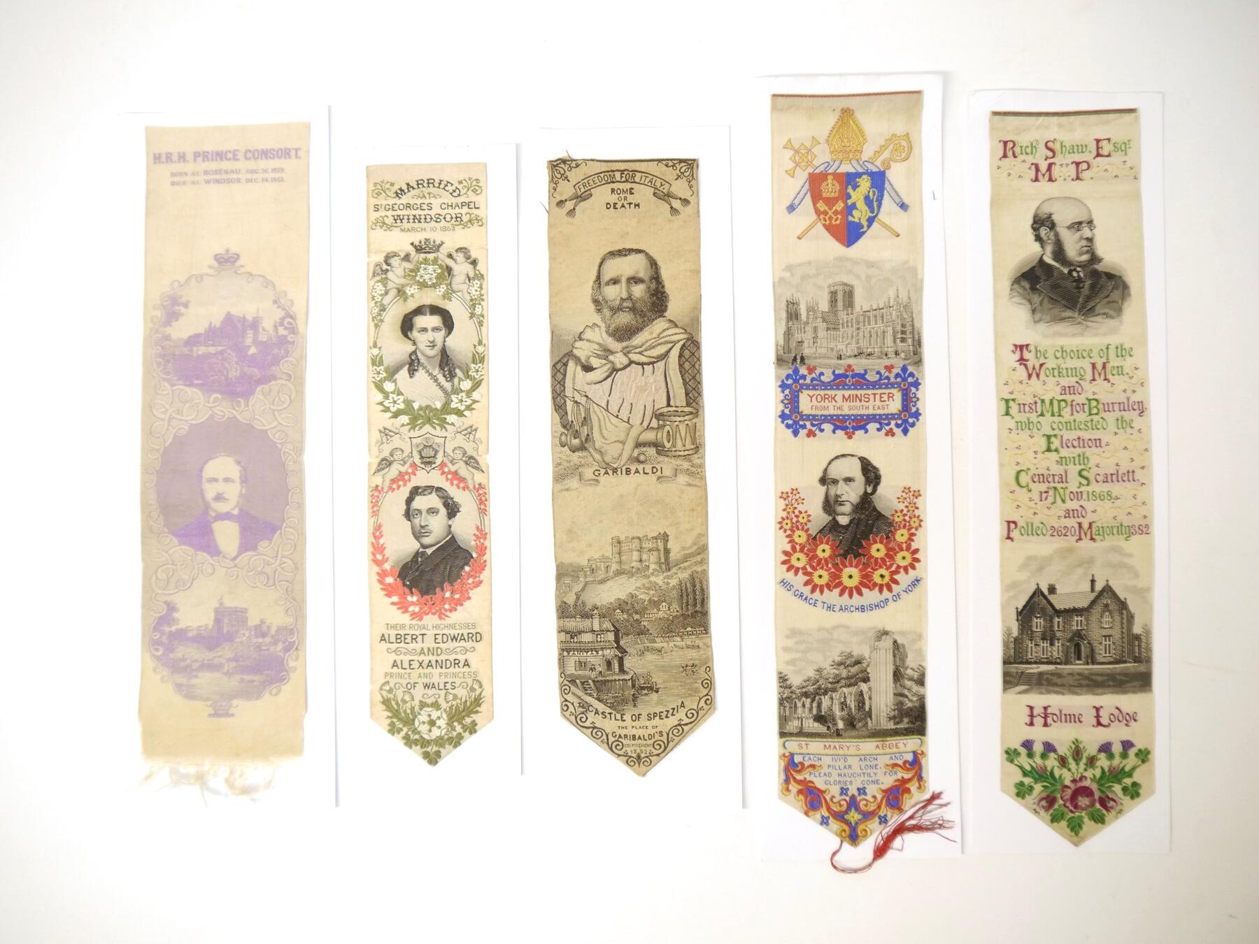Five Victorian silk bookmarks comprising Archbishop of York; Richard Shaw M.P.Garibaldi; Prince Albert; Marriage Albert Edward and Alexandra 1863 (later King Edward VII and Queen Consort) (5)