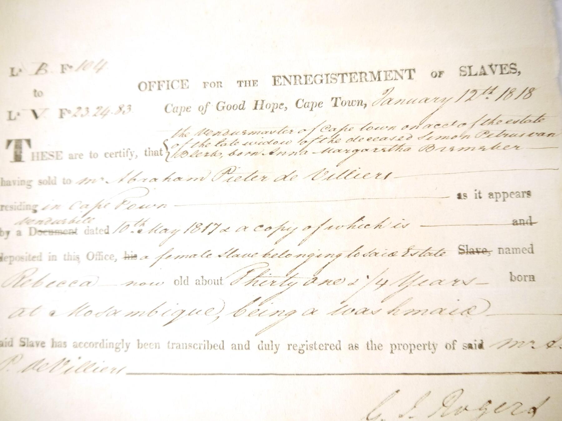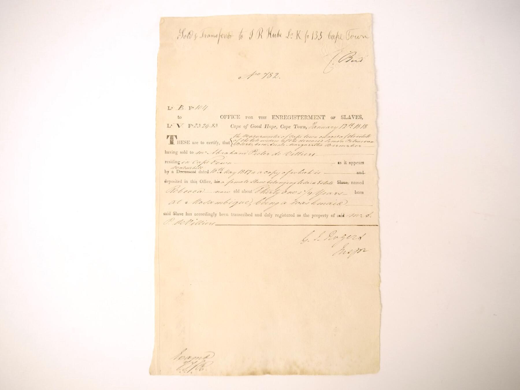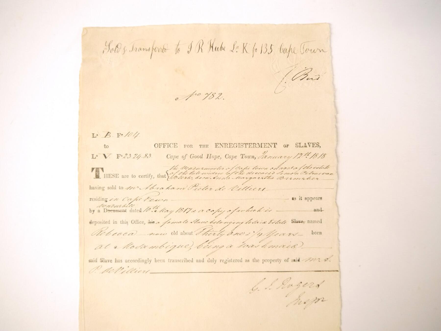 A Certificate registering the sale of a slave, Cape Town, 1818. Rebecca, a female slave, age 31, born in Mozambique, a washmaid, as the property of Abraham Pieter de Villiers. Office for the Enregisterment of Slaves, Cape of Good Hope, Cape Town, with attached copy of Afrikaans sale note, total 1,400 Rixdollars. A sobering historical document.