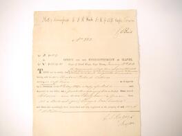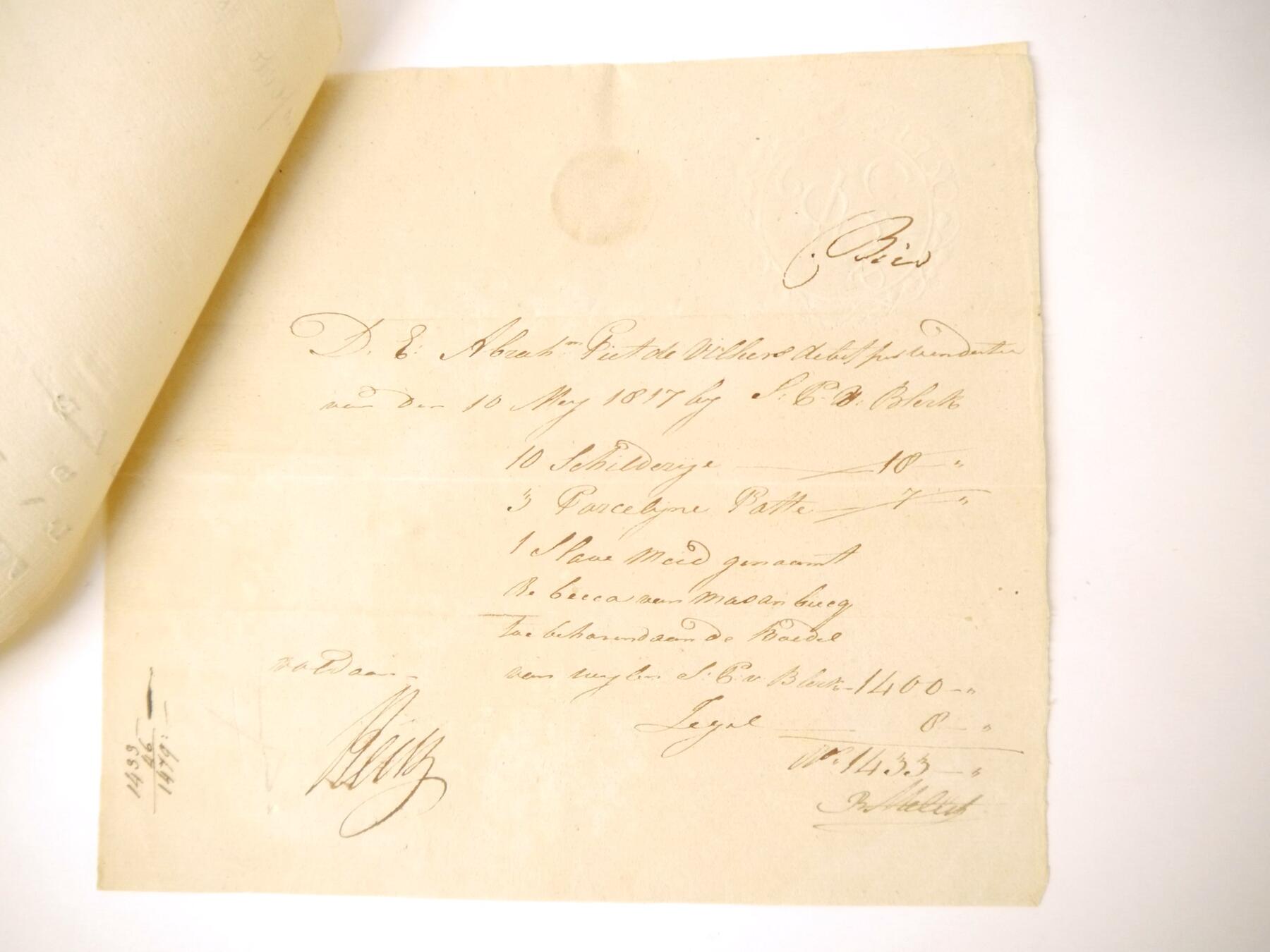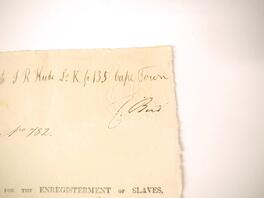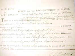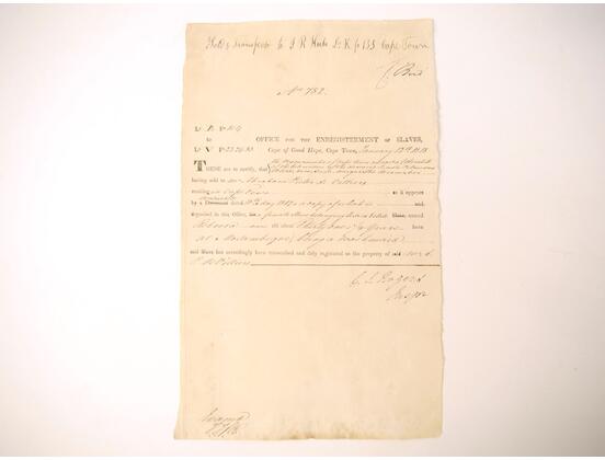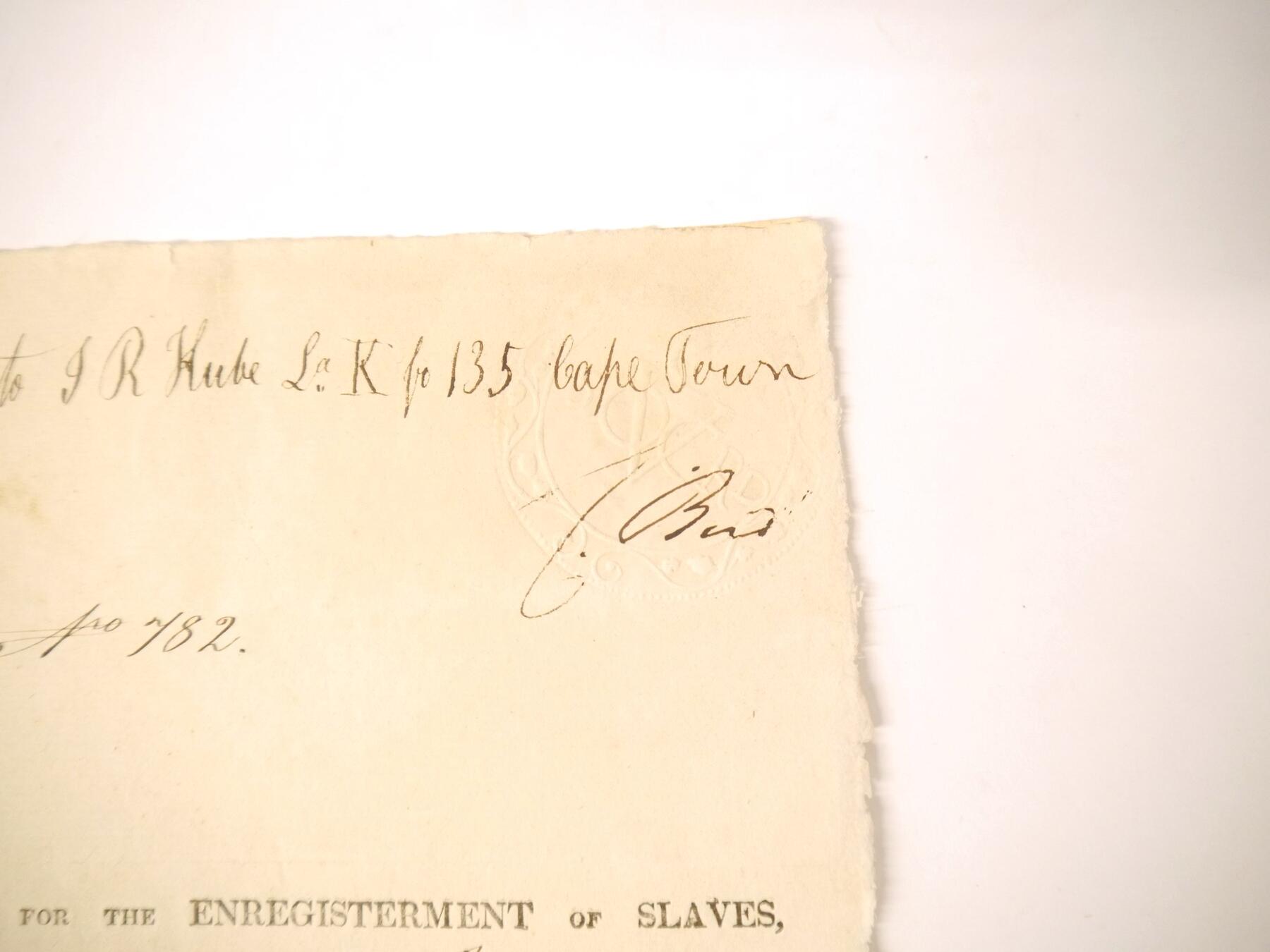 A Certificate registering the sale of a slave, Cape Town, 1818. Rebecca, a female slave, age 31, born in Mozambique, a washmaid, as the property of Abraham Pieter de Villiers. Office for the Enregisterment of Slaves, Cape of Good Hope, Cape Town, with attached copy of Afrikaans sale note, total 1,400 Rixdollars. A sobering historical document.