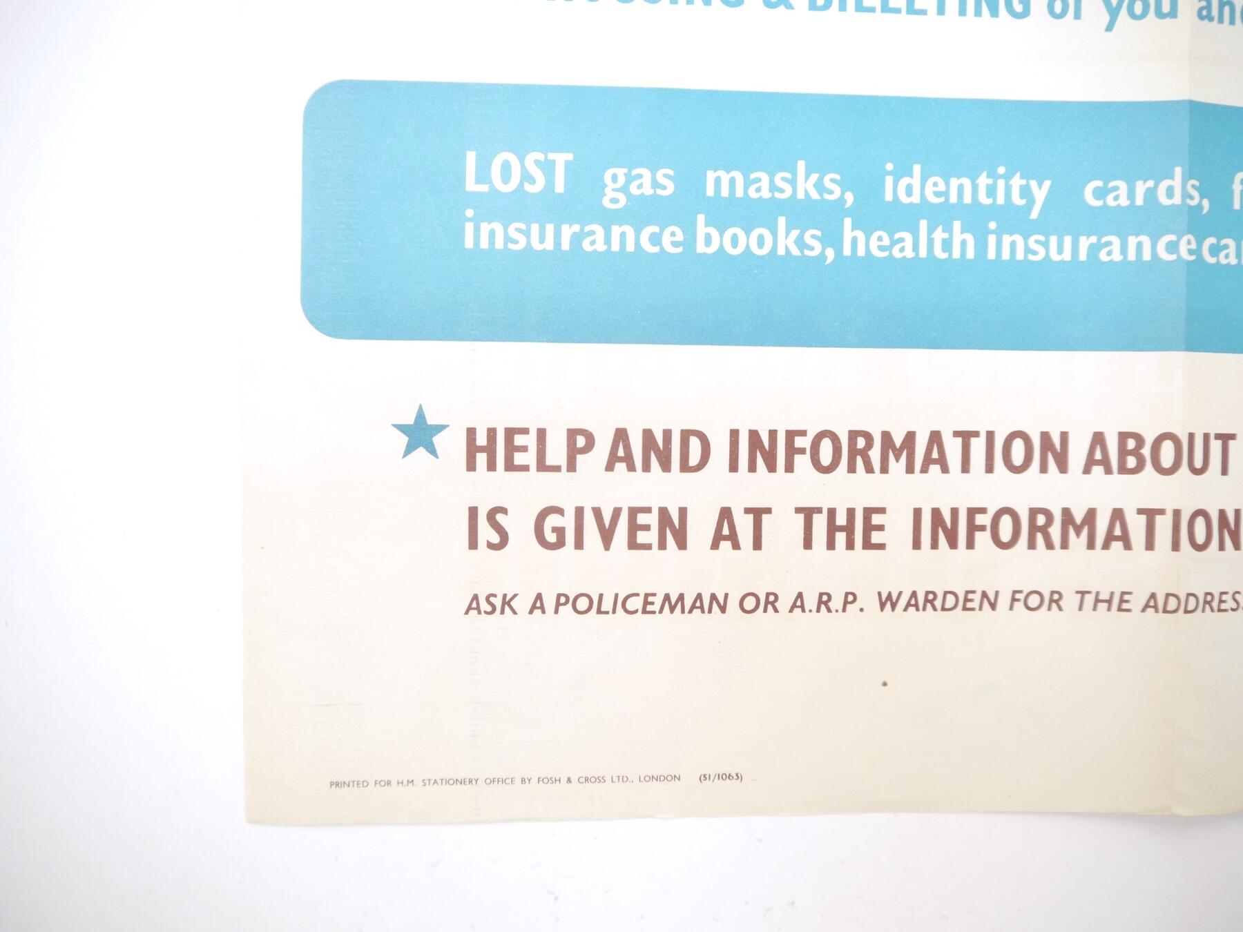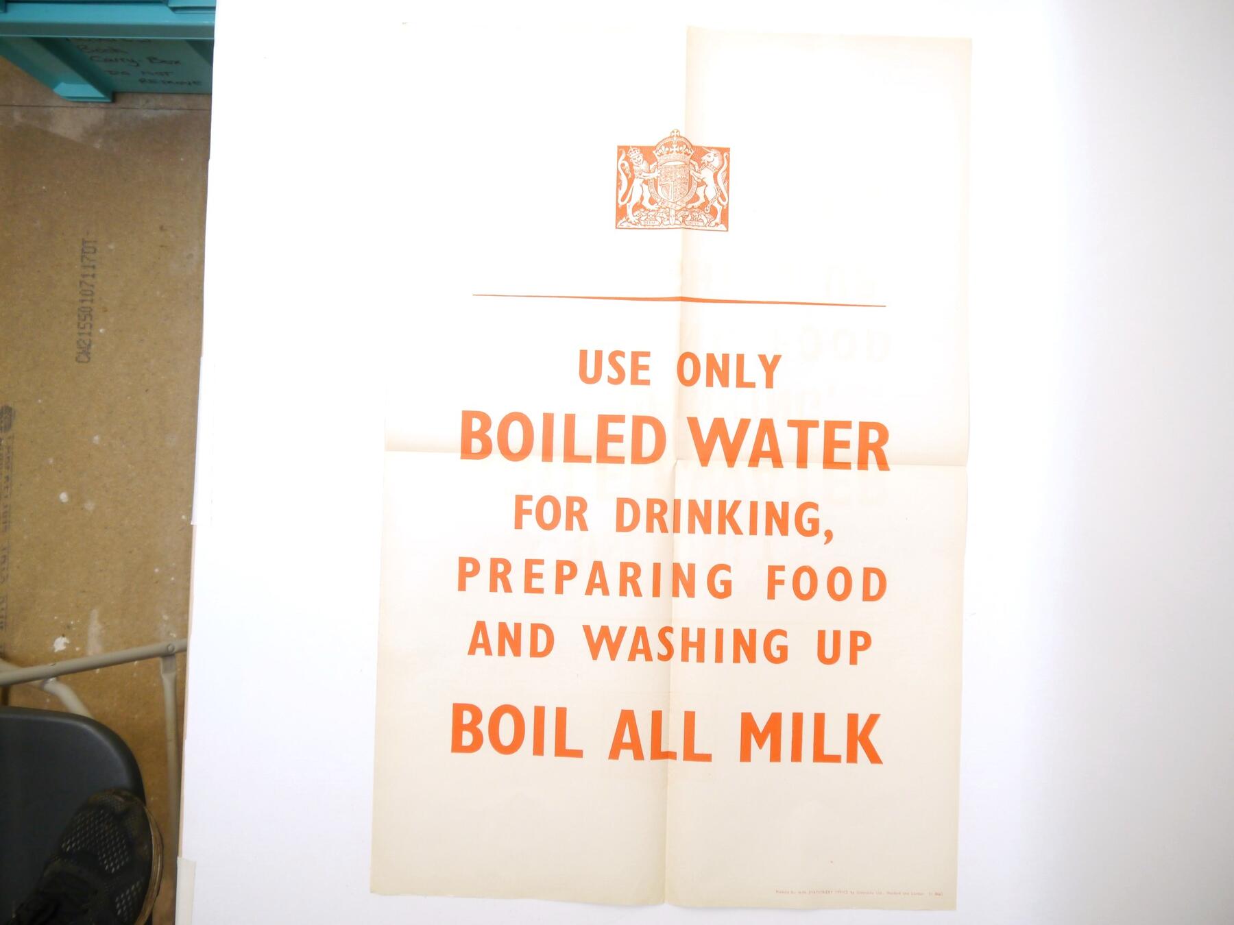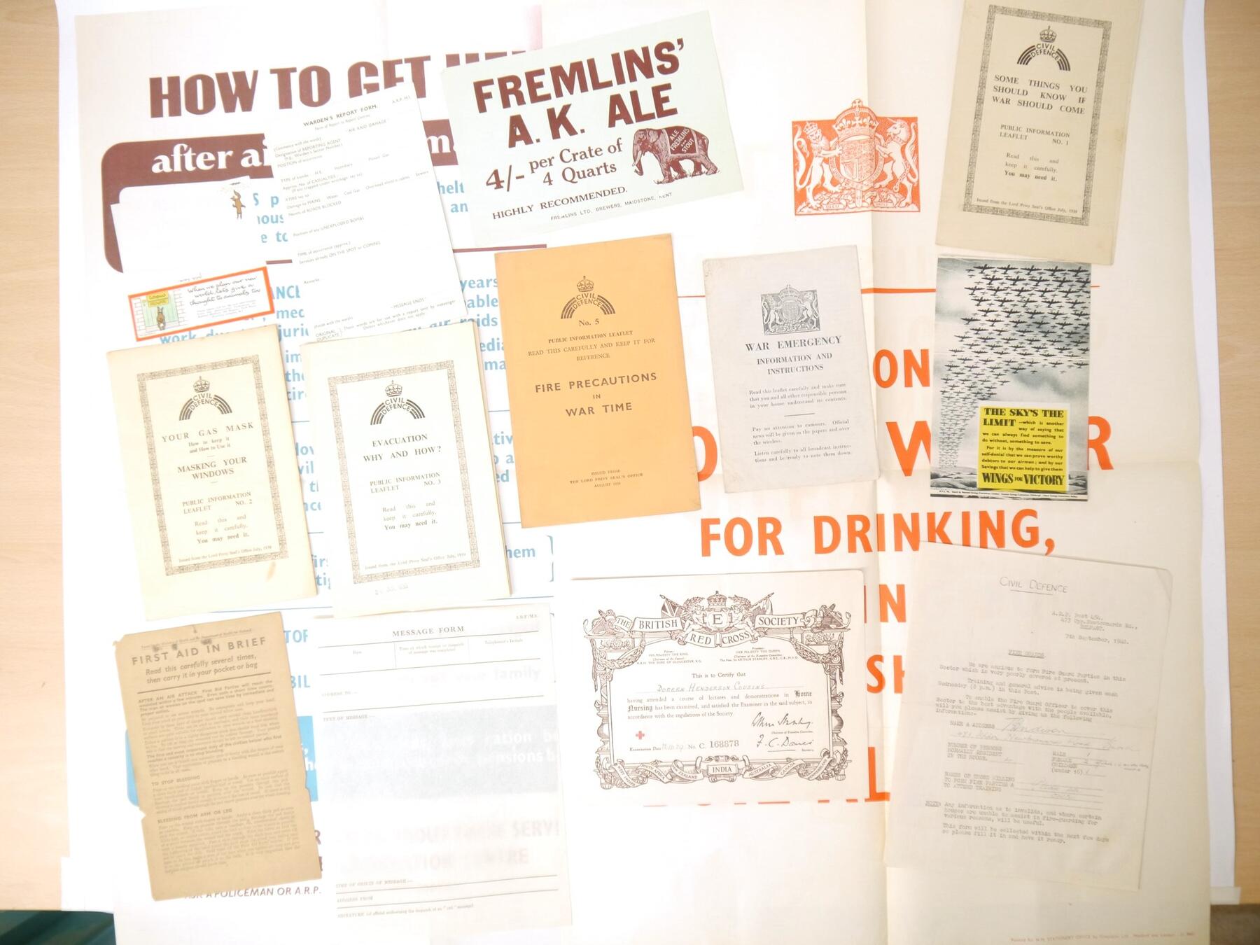 Two posters and 13 miscellaneous items of ephemera concerning World War II Home Front, the two original posters issued by the H.M.S.O. including ''Use Only Boiled Water For Drinking, Preparing Food and Washing Up. Boil All Milk.'', approx 76.5 x 51cm, folded as issued, VGC, and ''How To Get Help After Air Raid Damage...'', informing population of how to deal with aftermath of an air raid, from the initial reception at Rest Centres through to compensation for injury and repairs to damaged homes and removal and storage of belongings. Approx 76 x 50cm, folded as issued, VGC; plus a Fougasse economy envelope reuse label; Civil Defence Leaflets Numbers 1, 2, 3, & 5, 1939, including ''Your Gas Mask...- Masking Your Windows'', ''Evacuation Why and How?'', ''Fire Precautions in War Time'' etc, plus other items relating to Fire Guards, Red Cross etc