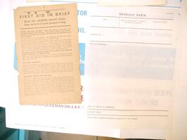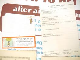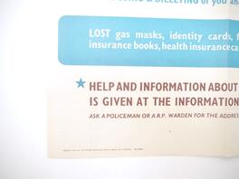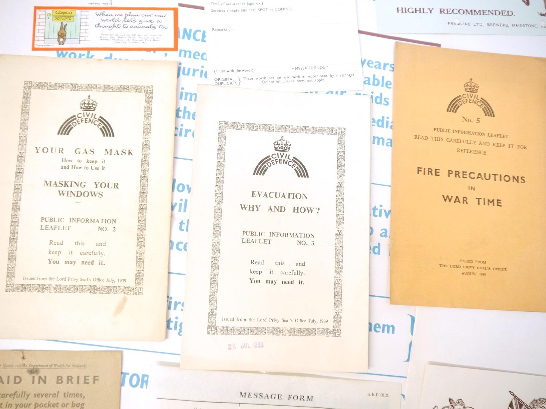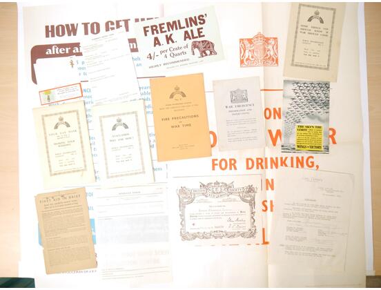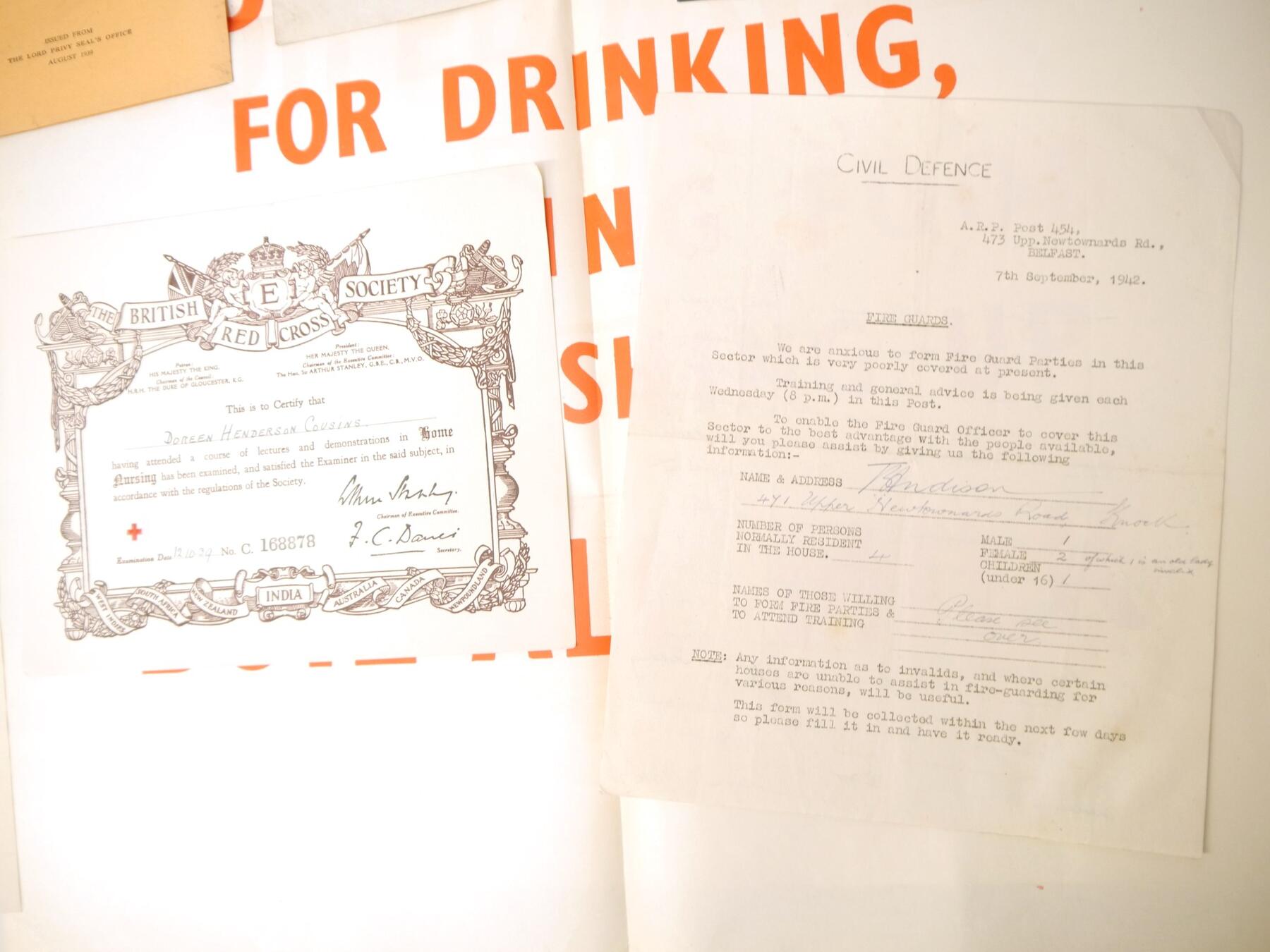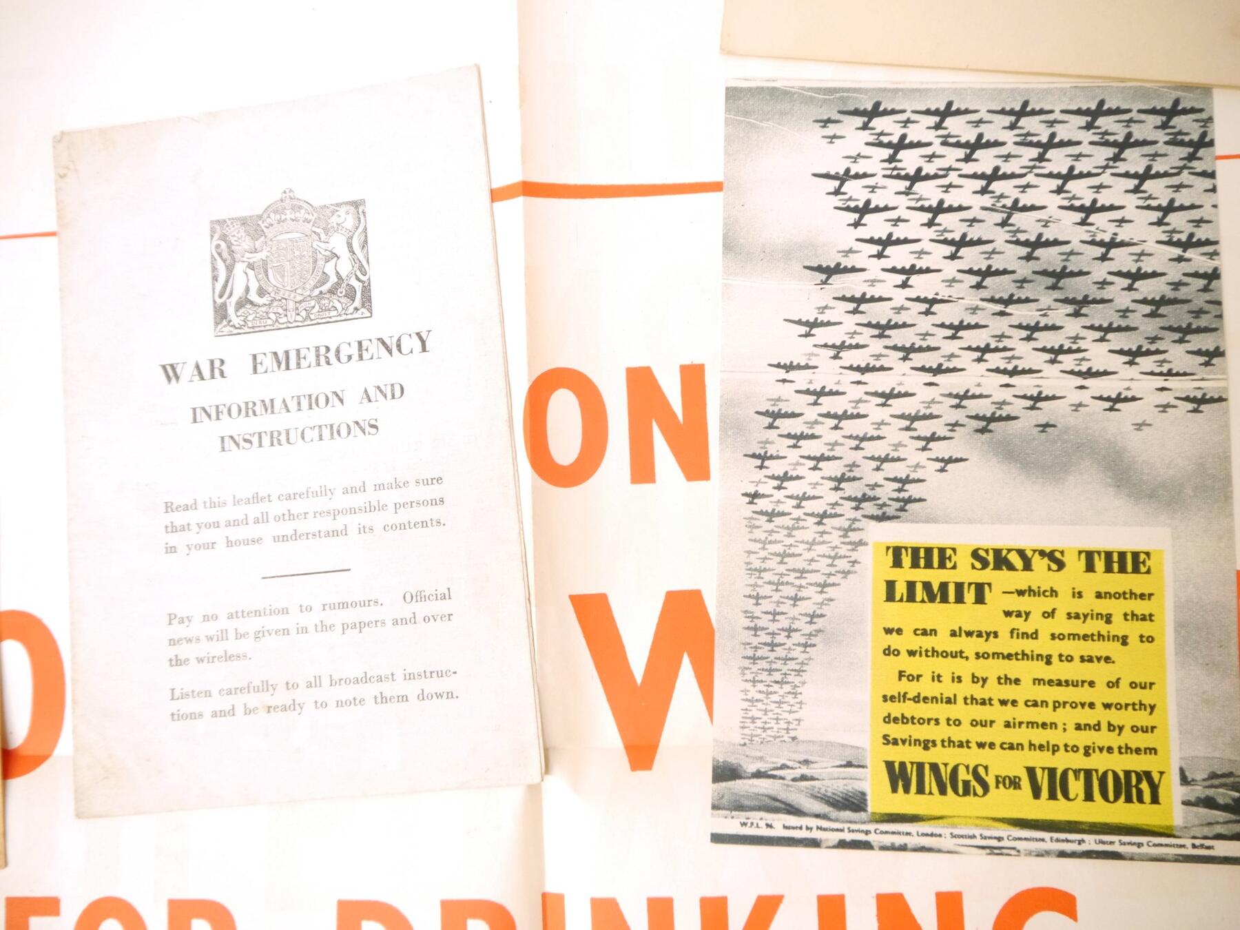 Two posters and 13 miscellaneous items of ephemera concerning World War II Home Front, the two original posters issued by the H.M.S.O. including ''Use Only Boiled Water For Drinking, Preparing Food and Washing Up. Boil All Milk.'', approx 76.5 x 51cm, folded as issued, VGC, and ''How To Get Help After Air Raid Damage...'', informing population of how to deal with aftermath of an air raid, from the initial reception at Rest Centres through to compensation for injury and repairs to damaged homes and removal and storage of belongings. Approx 76 x 50cm, folded as issued, VGC; plus a Fougasse economy envelope reuse label; Civil Defence Leaflets Numbers 1, 2, 3, & 5, 1939, including ''Your Gas Mask...- Masking Your Windows'', ''Evacuation Why and How?'', ''Fire Precautions in War Time'' etc, plus other items relating to Fire Guards, Red Cross etc