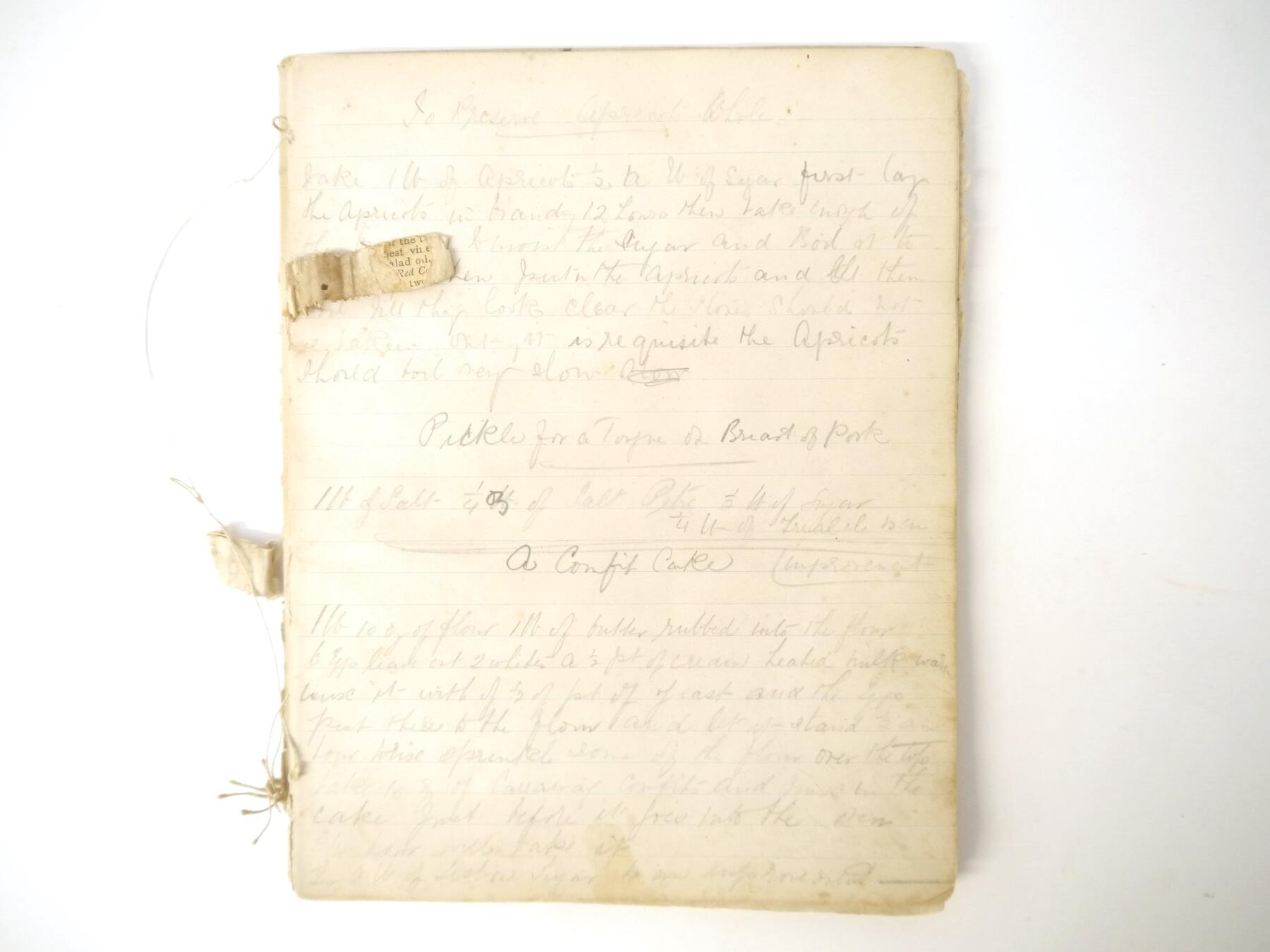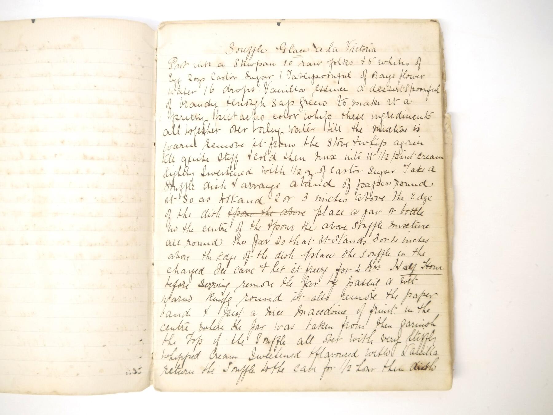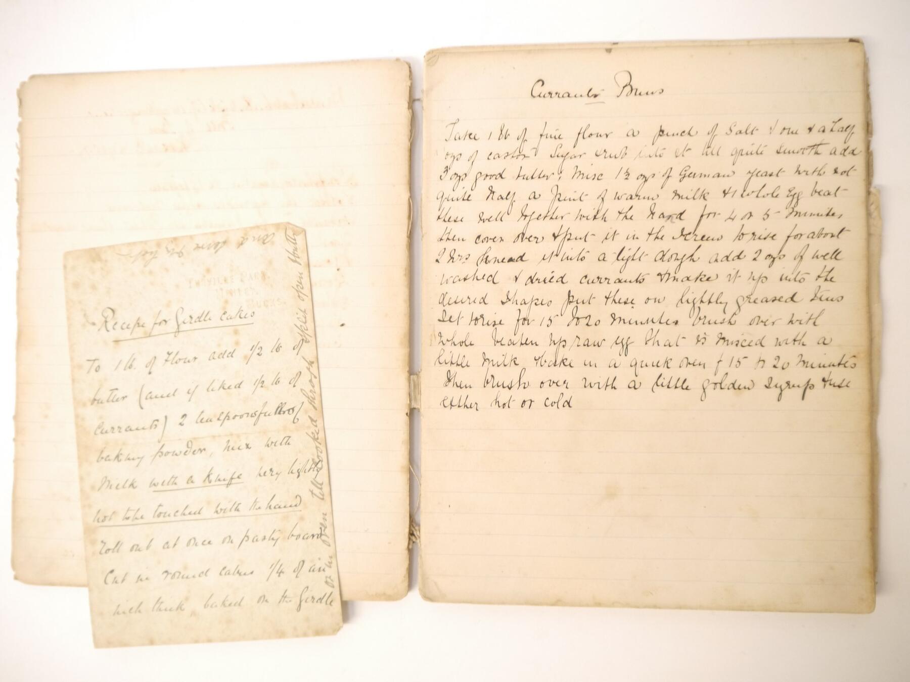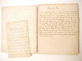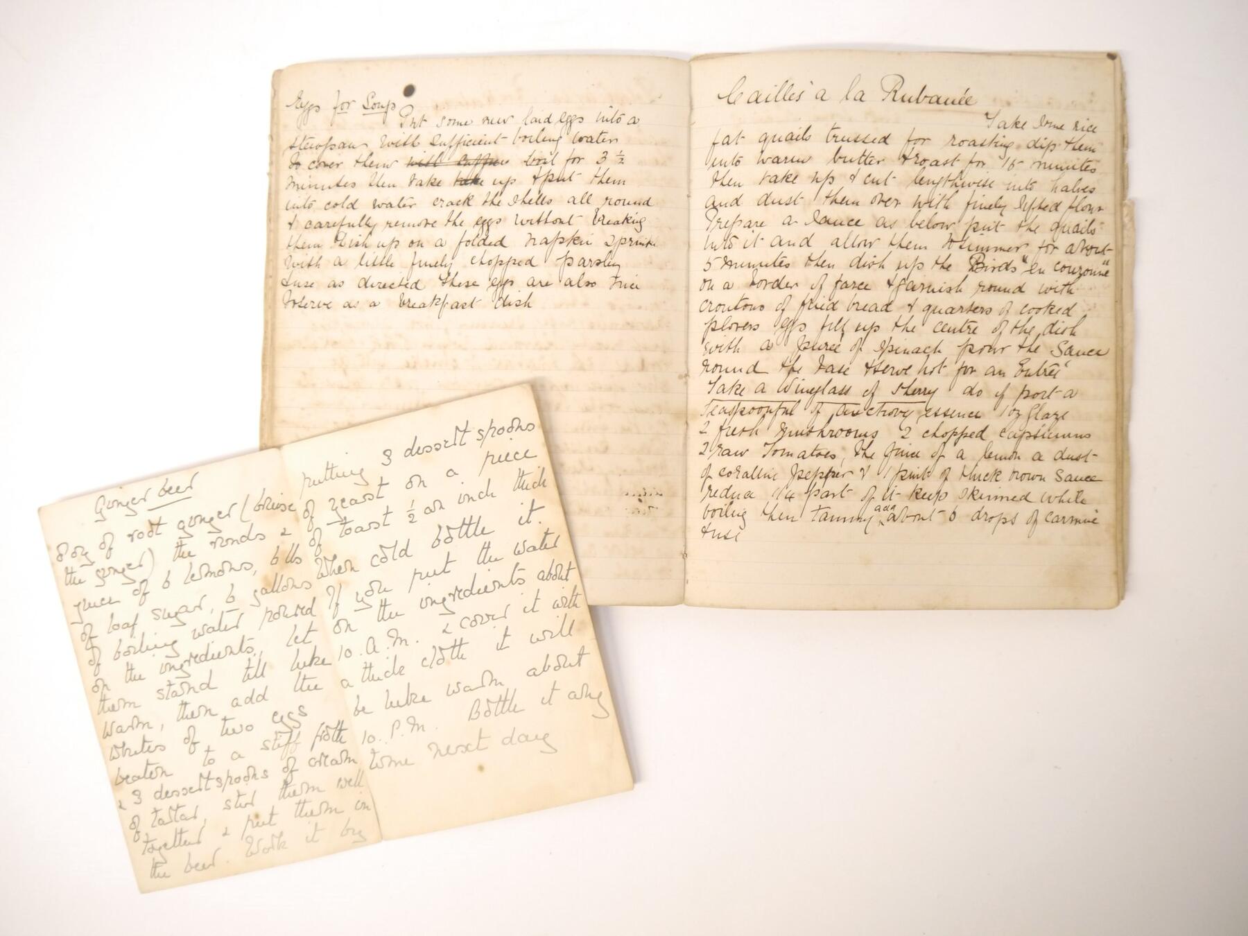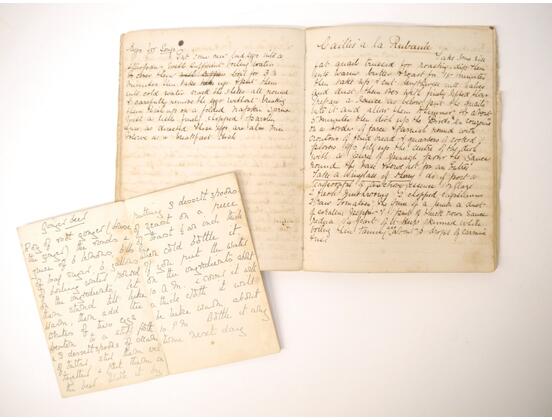 A disbound manuscript receipt book circa 1891, 118 pages of manuscript cookery recipe entries, majority pen & ink but some in pencil, recipes include ''Potage a la Rockaway'', ''Spanish Custard'', ''Chartreuse de Volaille a la Victoria'', Brandy Snaps, Sponge fingers, Simnel cake, ''Supreme of Pheasant a la Dijon'', Shortbread, Gingerbread, Madeleines, Stuffed beef etc., etc., plus a small quantity of loose manuscript receipts and a couple of leaves of mounted contemporary printed, receipts, disbound, housed in packet