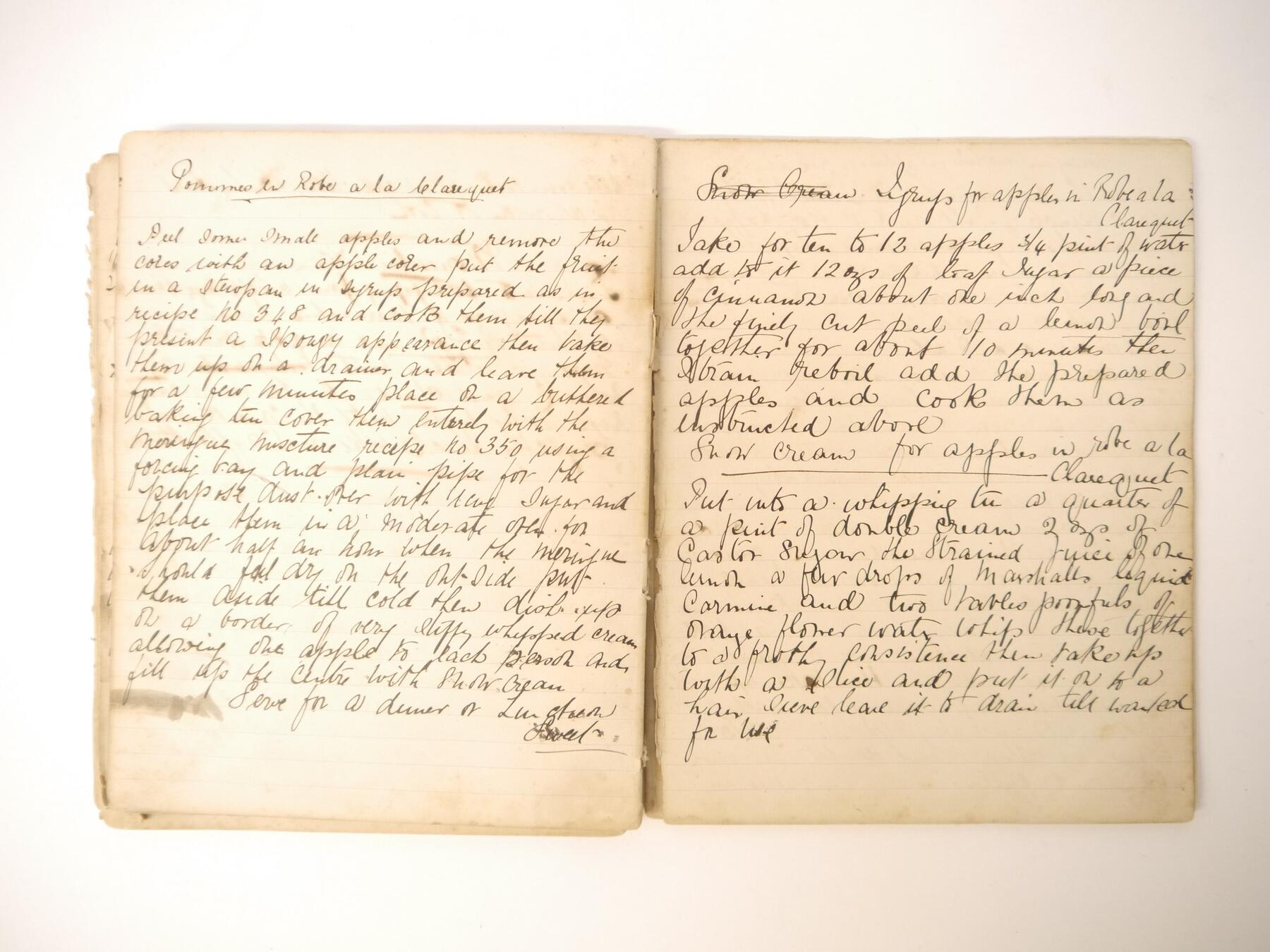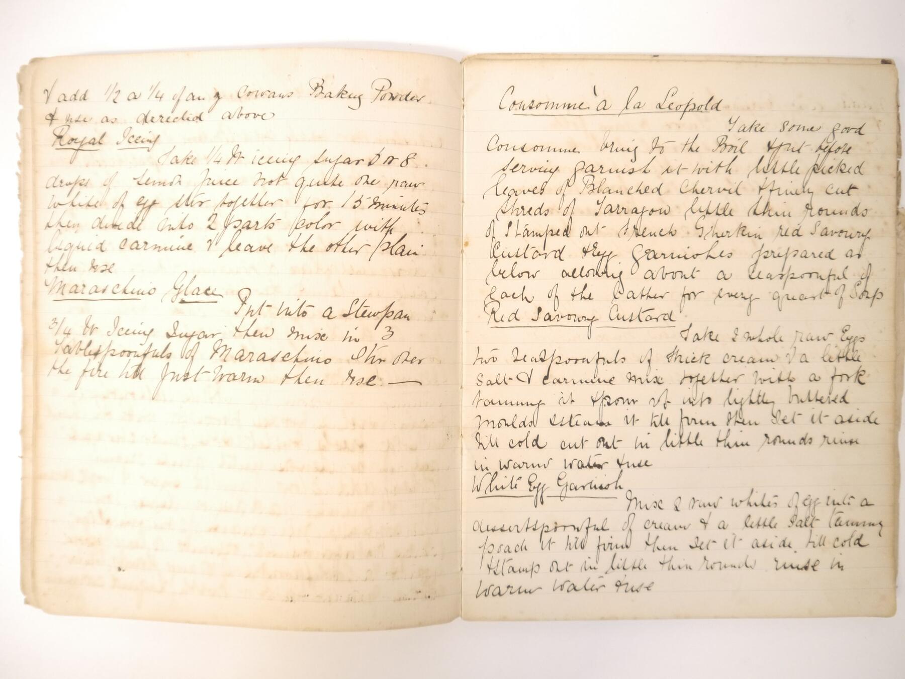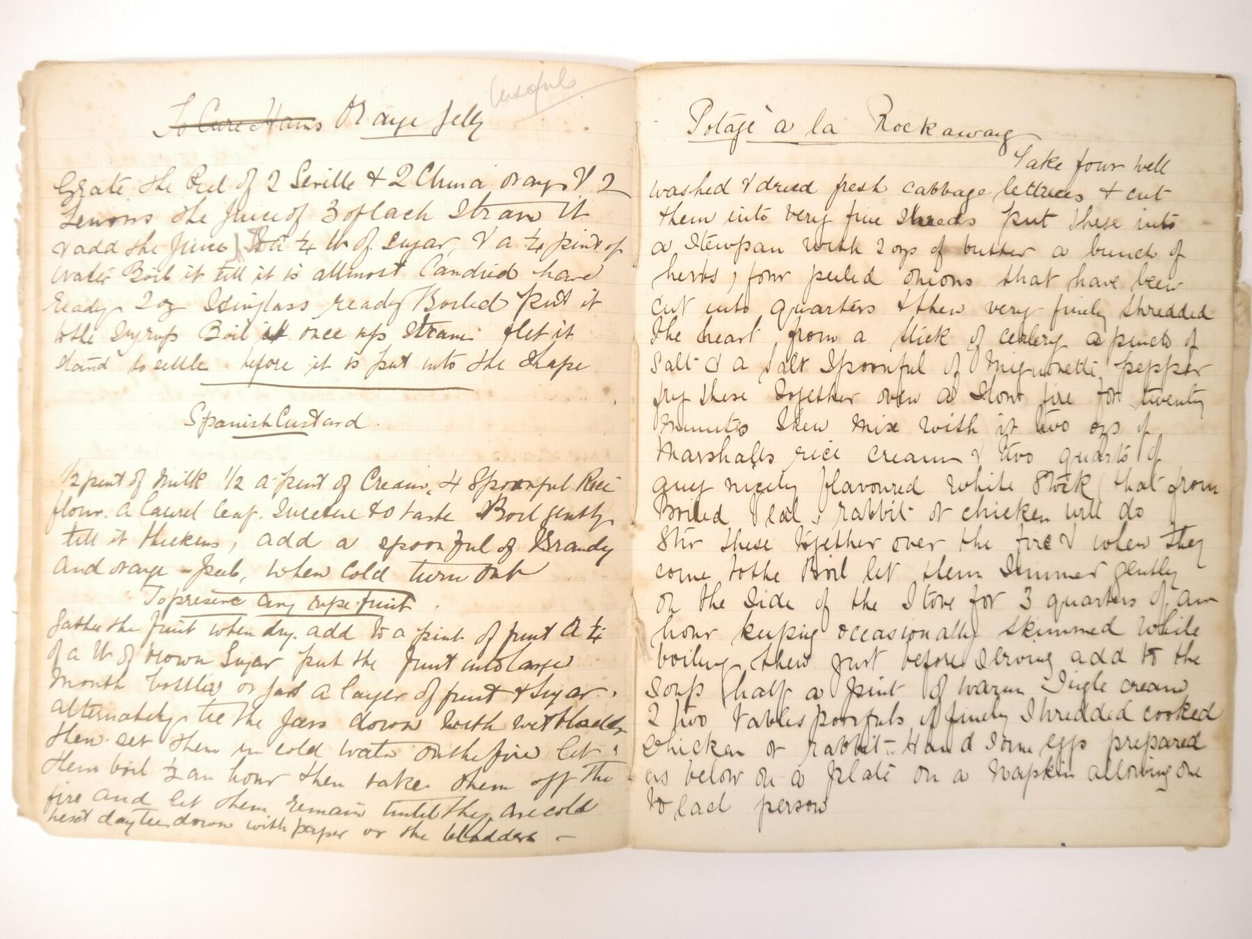 A disbound manuscript receipt book circa 1891, 118 pages of manuscript cookery recipe entries, majority pen & ink but some in pencil, recipes include ''Potage a la Rockaway'', ''Spanish Custard'', ''Chartreuse de Volaille a la Victoria'', Brandy Snaps, Sponge fingers, Simnel cake, ''Supreme of Pheasant a la Dijon'', Shortbread, Gingerbread, Madeleines, Stuffed beef etc., etc., plus a small quantity of loose manuscript receipts and a couple of leaves of mounted contemporary printed, receipts, disbound, housed in packet