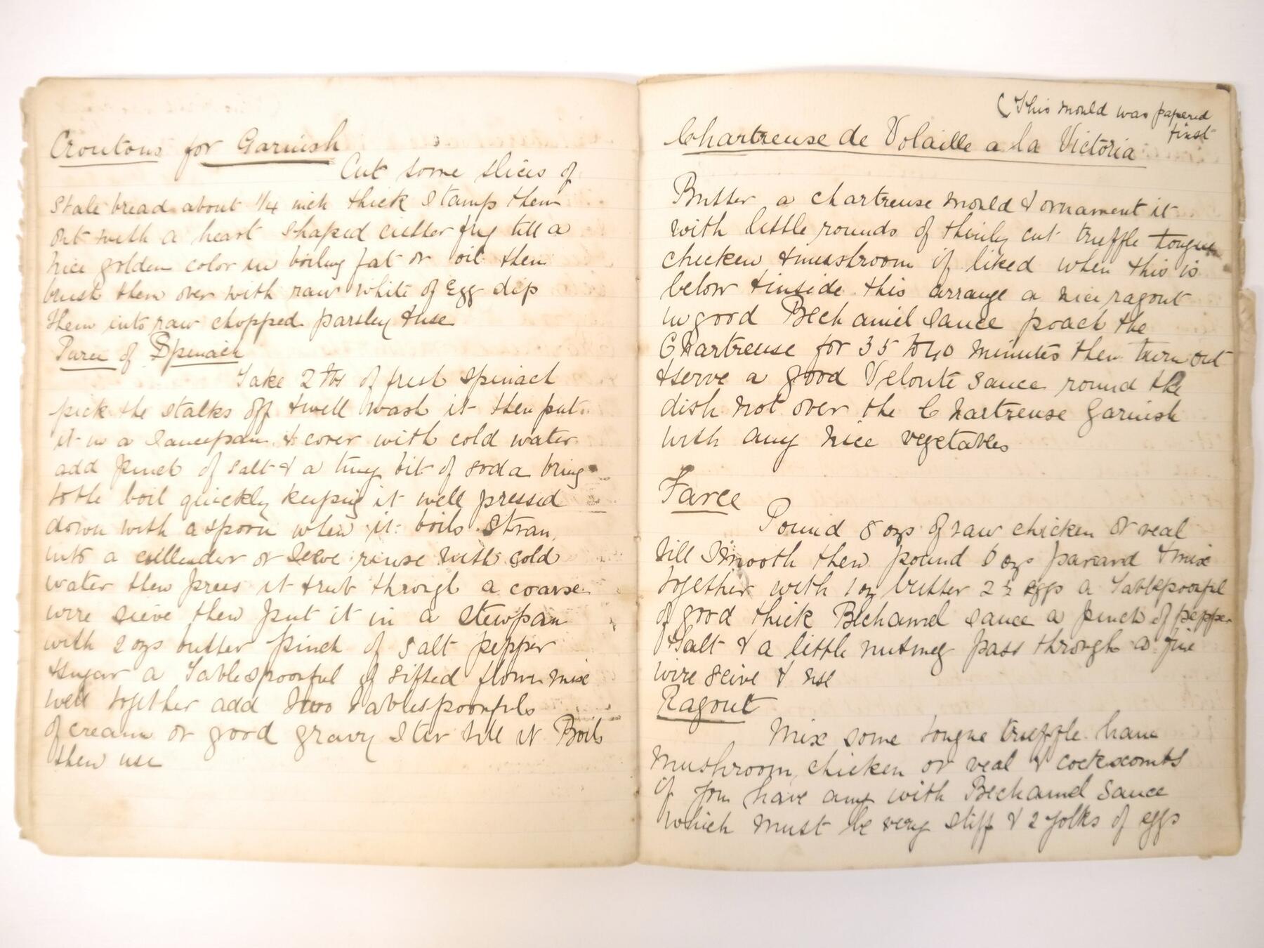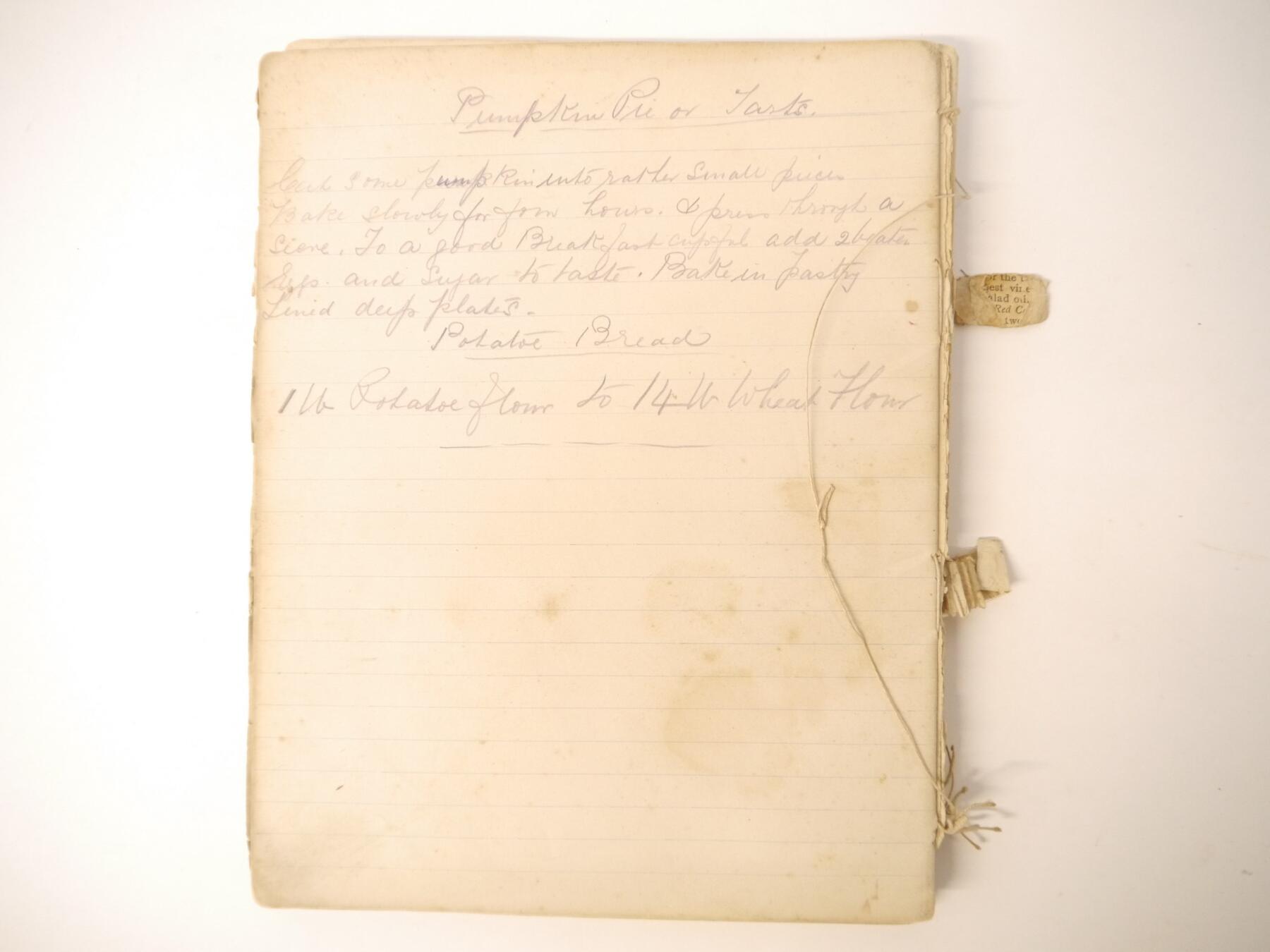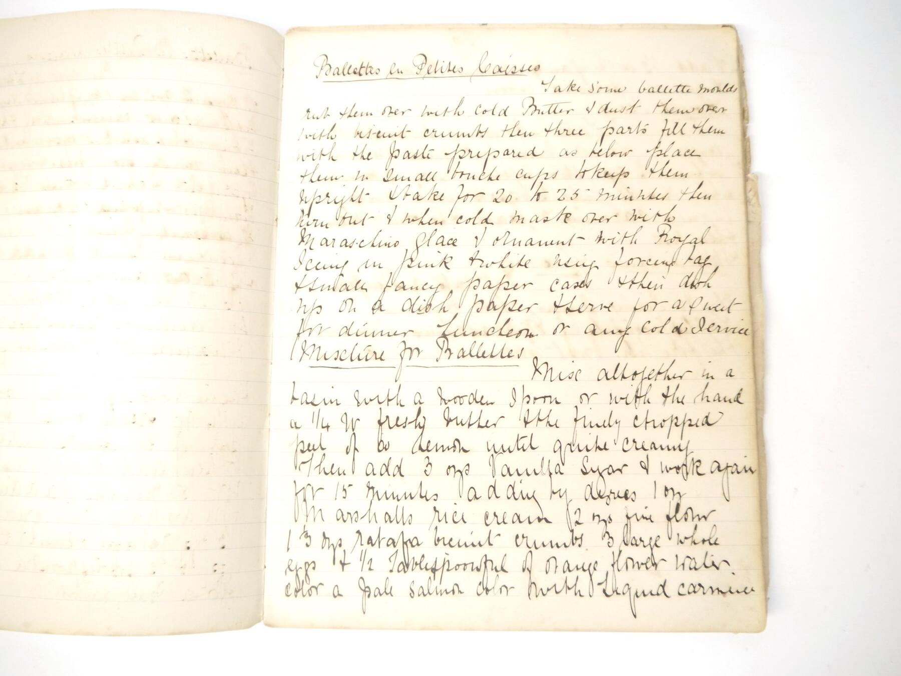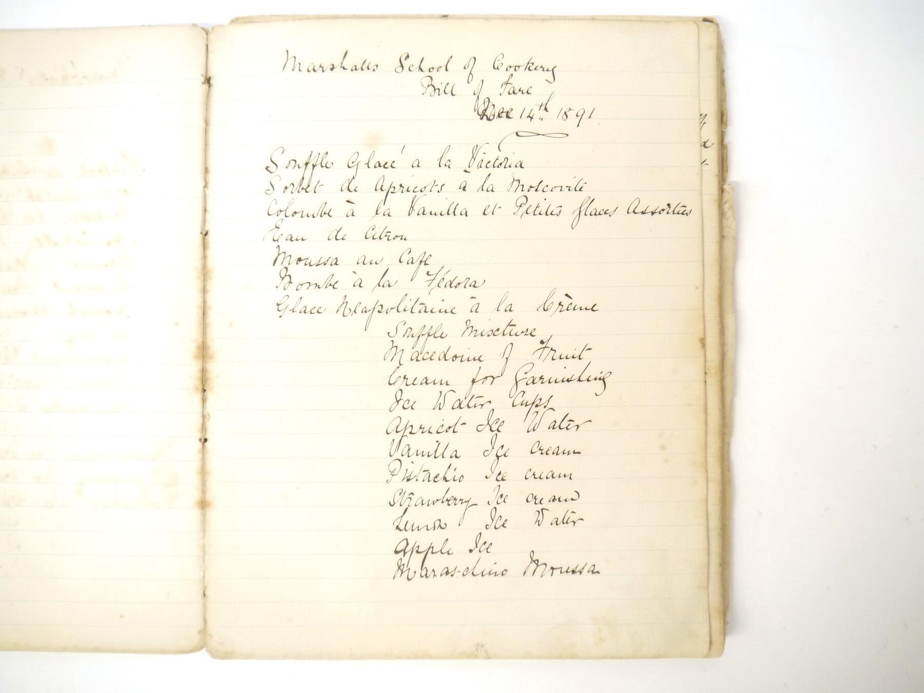 A disbound manuscript receipt book circa 1891, 118 pages of manuscript cookery recipe entries, majority pen & ink but some in pencil, recipes include ''Potage a la Rockaway'', ''Spanish Custard'', ''Chartreuse de Volaille a la Victoria'', Brandy Snaps, Sponge fingers, Simnel cake, ''Supreme of Pheasant a la Dijon'', Shortbread, Gingerbread, Madeleines, Stuffed beef etc., etc., plus a small quantity of loose manuscript receipts and a couple of leaves of mounted contemporary printed, receipts, disbound, housed in packet