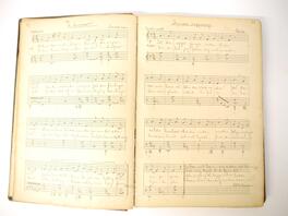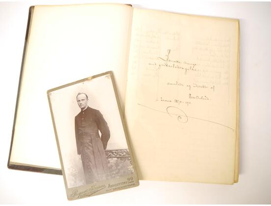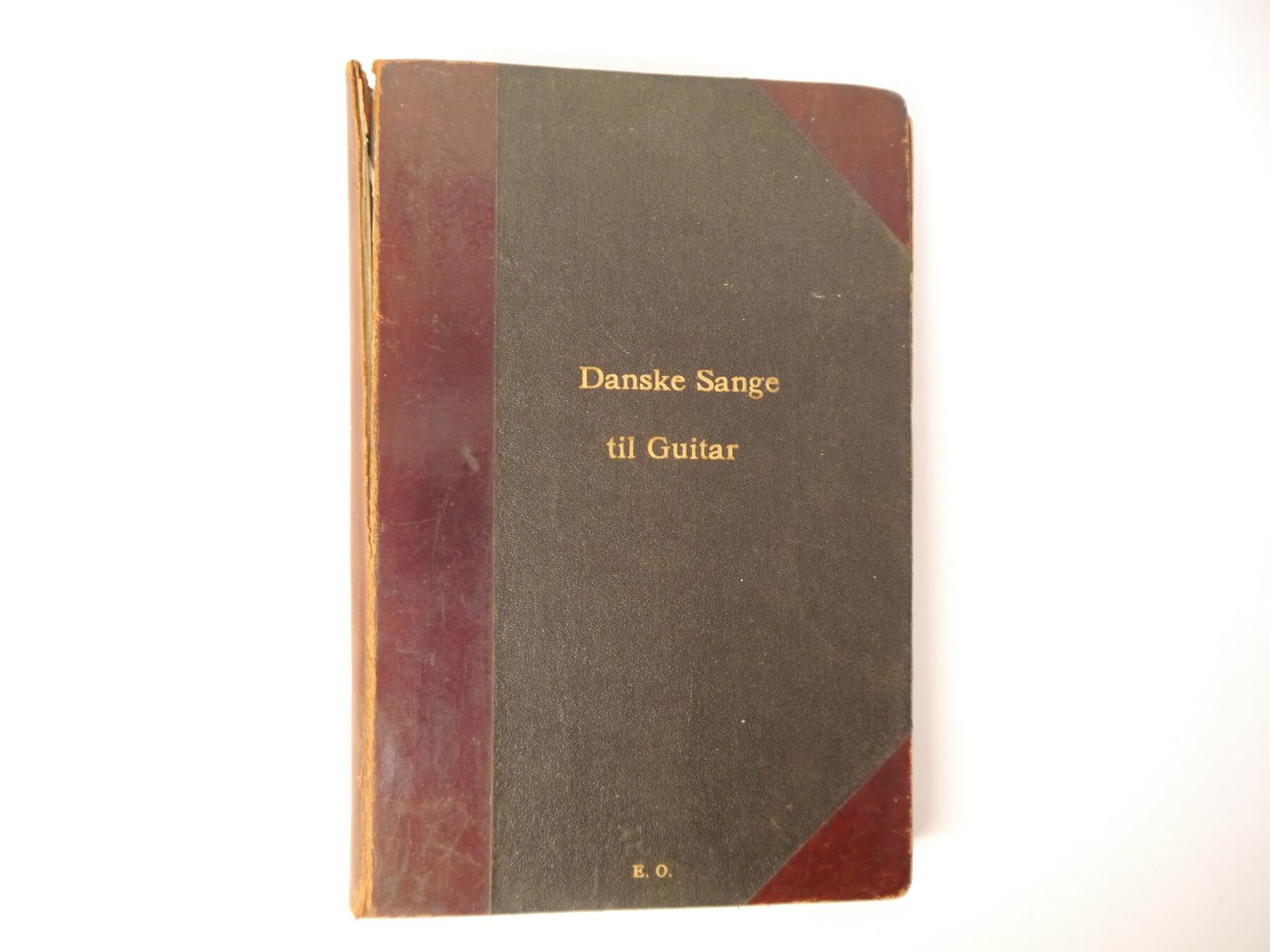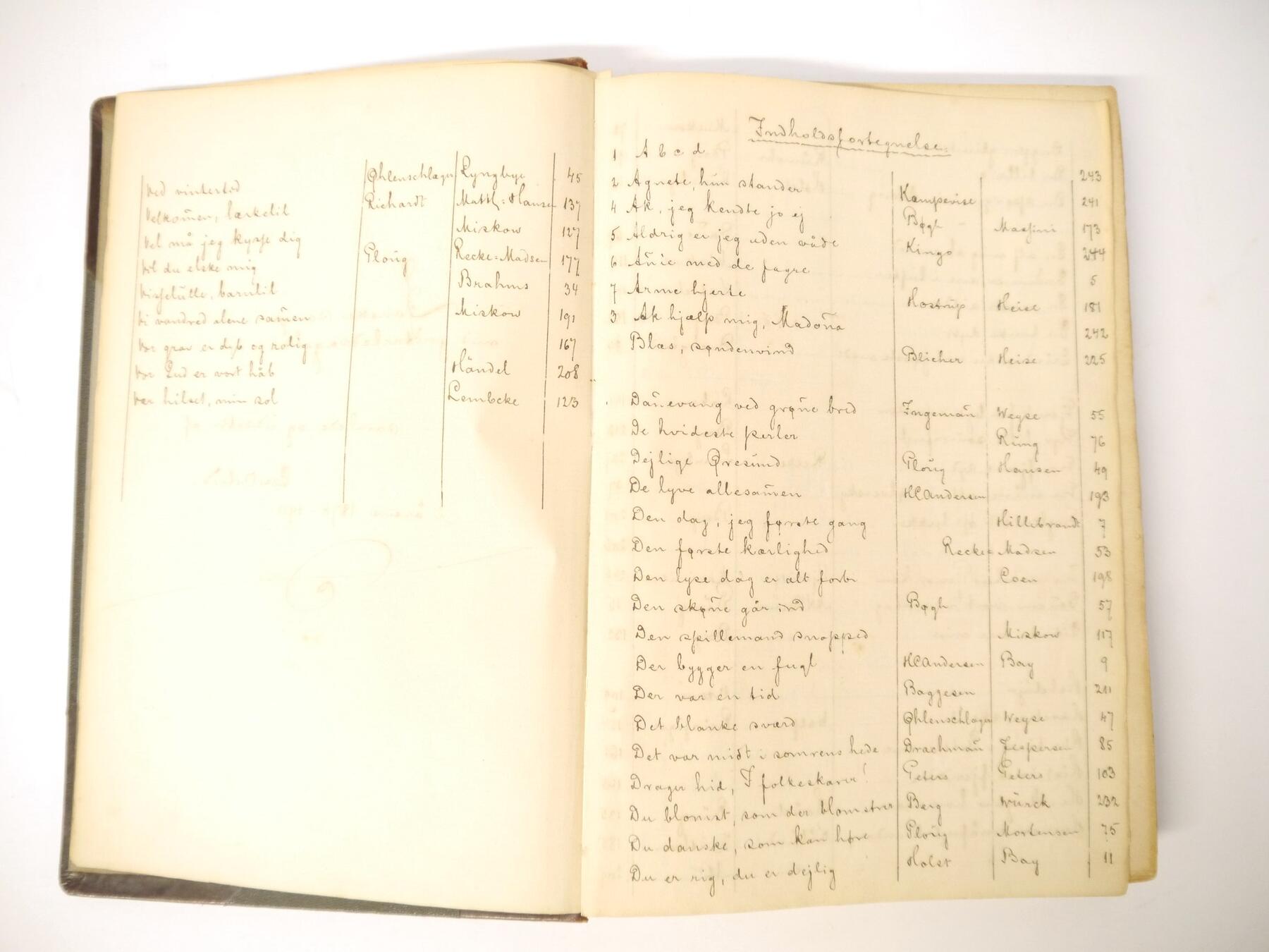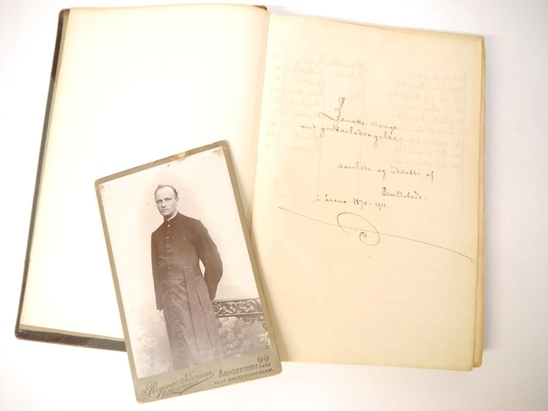 ''Danske sange med guitar ledsagelse'', an album of manuscript Danish songs 1870-1911, printed staffs throughout but 243 numbered pages of neat manuscript musical scores and accompanying lyrics, manuscript title page and 7 pages manuscript index, original half calf titled and monogrammed E.O. by the author in gilt, the authors name written on the title page but indecipherable (Edw. Orlved?) and a cabinet card portrait photo (presumably author) loosely inserted