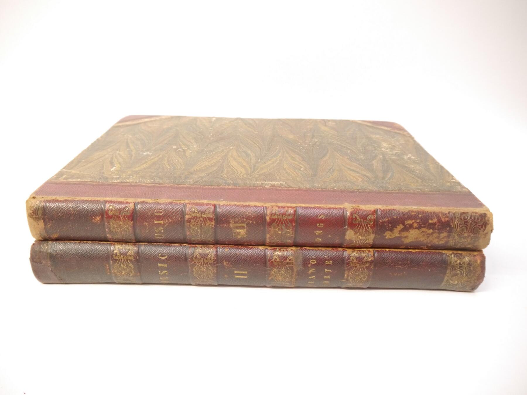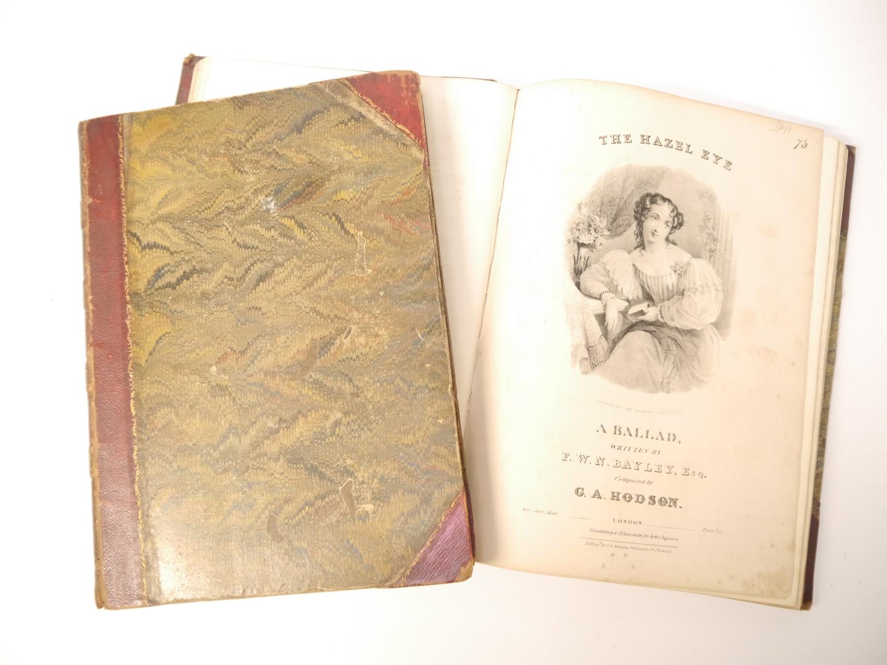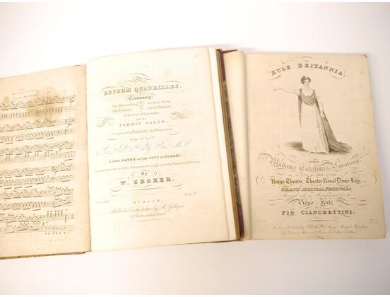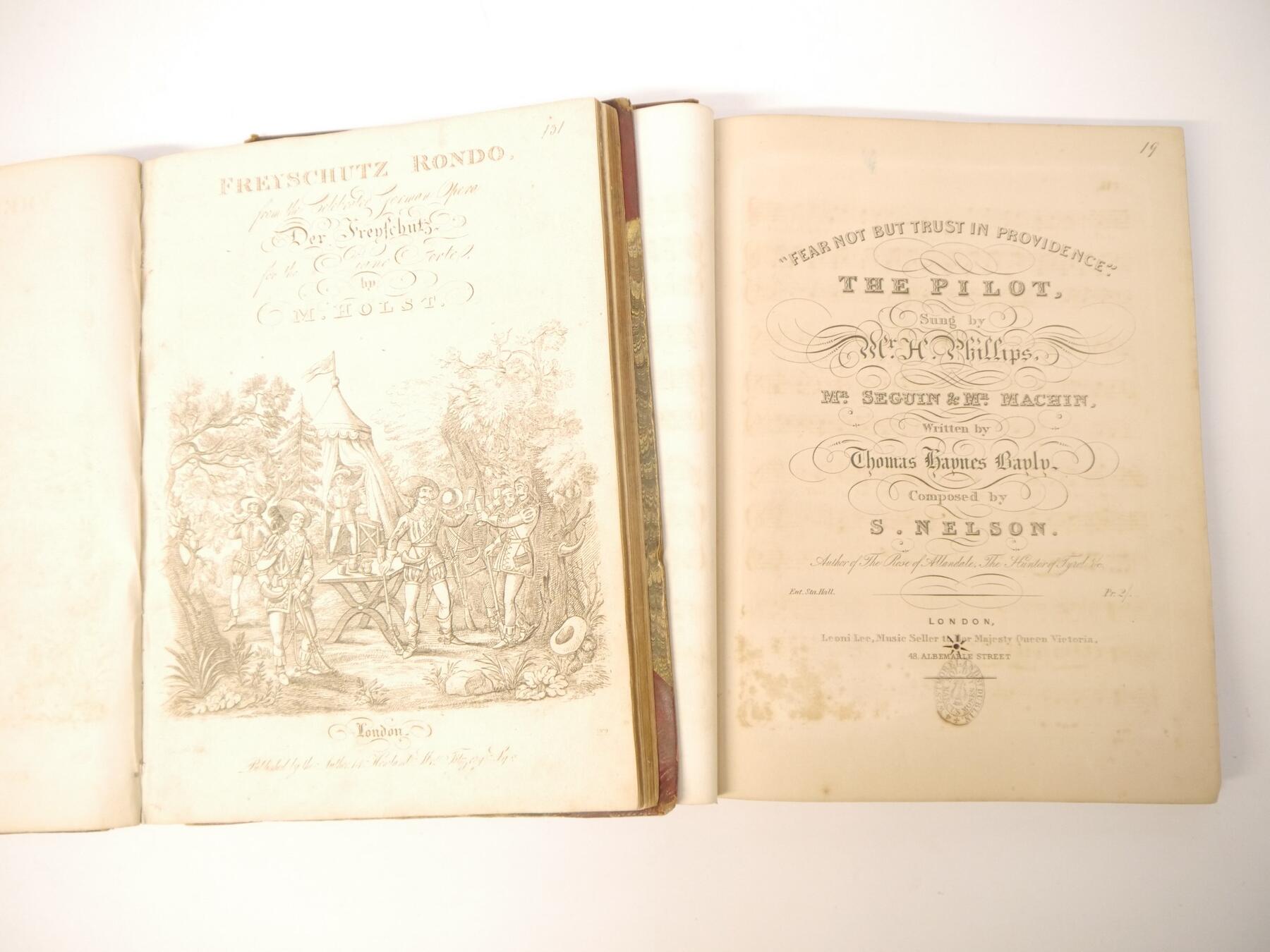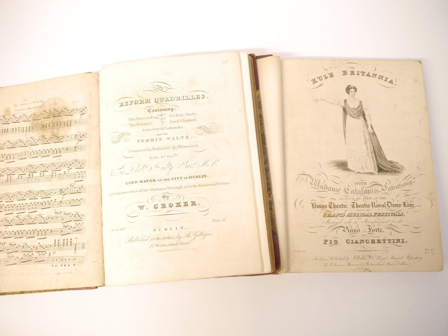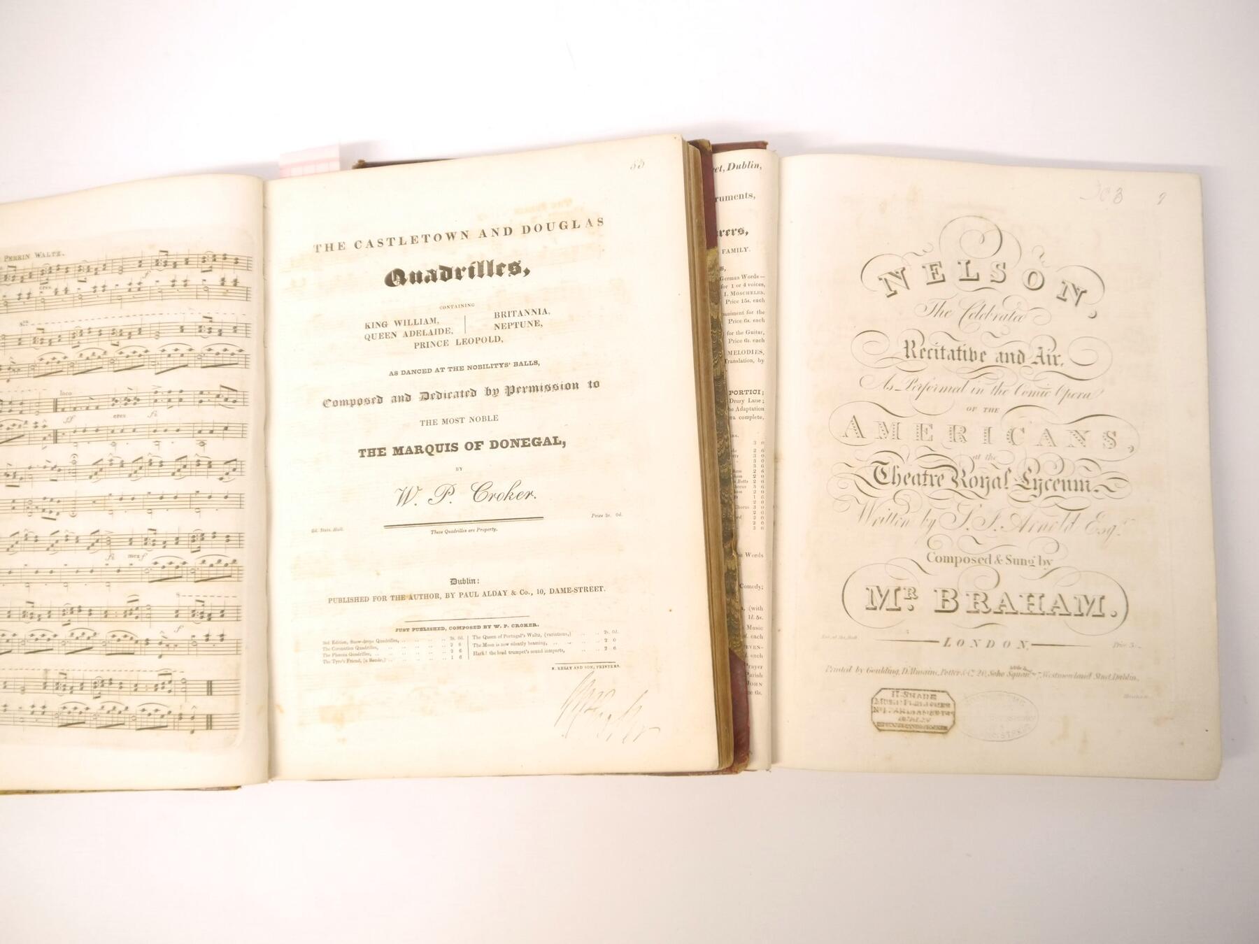 Two bound volumes of sheet music circa 1830, Piano Forte and Songs, numerous scores bound together in two volumes, each with separate copper engraved title pages including W. Croker : The Reform Quadrilles containing The Patriot King... Composed and dedicated to the Rt Hon Sir Robt. Harty Bart. MP Lord Mayor of the City of Dunlin. In Commemmoration of his Glorious Triumph over the Enemies of Reform; Dublin, R.Gillespie for the author [nd] circa earlier 19thC, 6pp sheet music; Carl Maria Von Weber: The Celebrated Overture to Alson Hassan, for the piano forte; Dublin. Bunting, Walsh Pigott & Sherwin, circa 1830, 7pp; Mathias Holst; Freyschutz Rondo; London, the author, circa 1825, Illustrated engraved title page depicting marksmen imbibing, etc etc. 50+ works bound in two volumes, folio, uniform contemporary half Mororcco gilt worn, each volume with pencil ownership signature E.C Guiness at front, Piano Forte volume with pencil inscription signature stating ''Elveden Hall Copy'', probably signatures of Edward Cecil Guiness, 1st Earl of Iveagh (1847-1927) Irish businessman and philanthropist. (2)