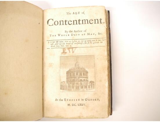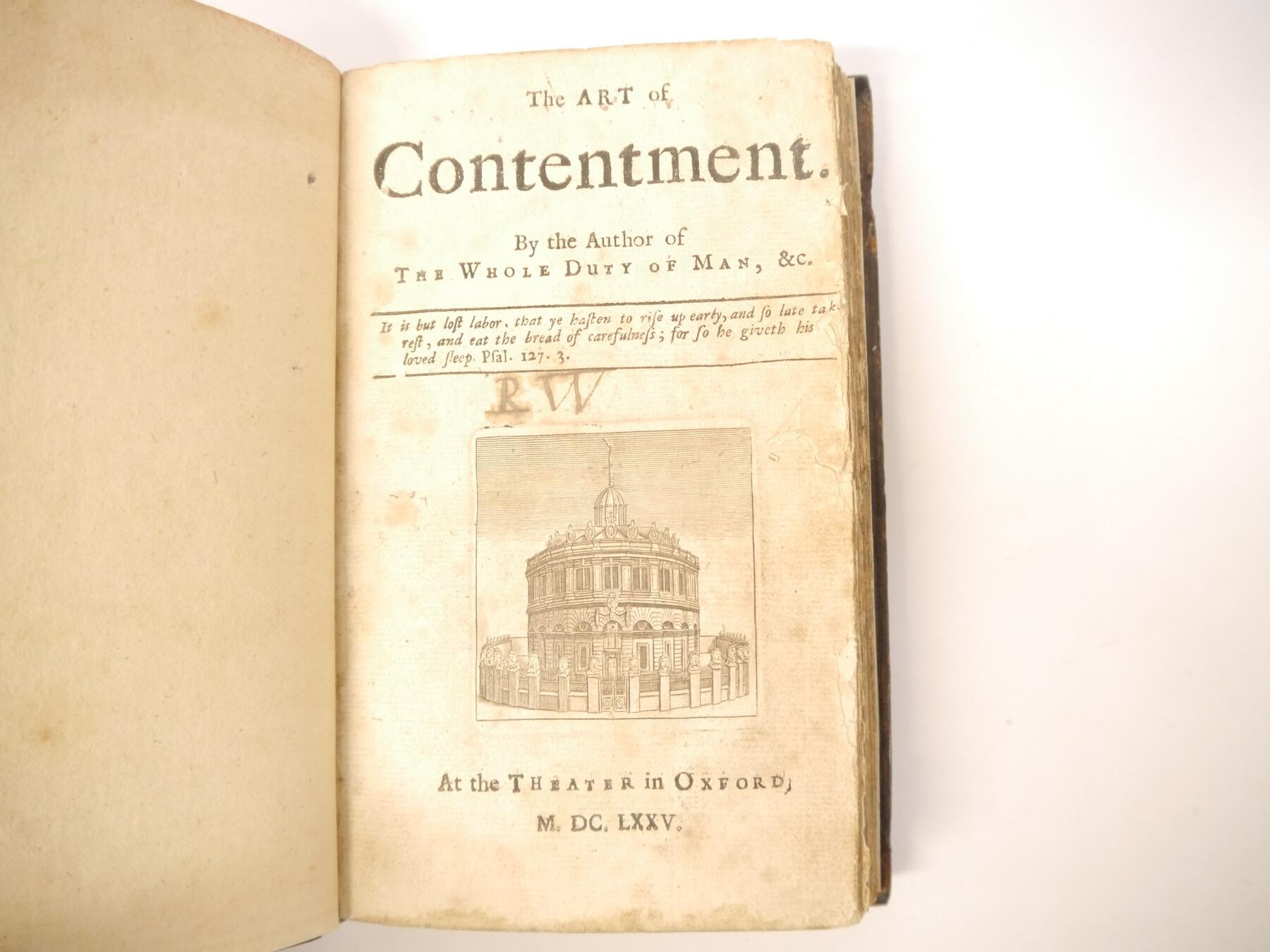 [Richard Allestree]: 'The Art of Contentment', Oxford, The Theater, 1675, engraved vignette title page, lacks frontis, [8],214,[1]pp, contemporary calf gilt, replenished EP's/front paste downs