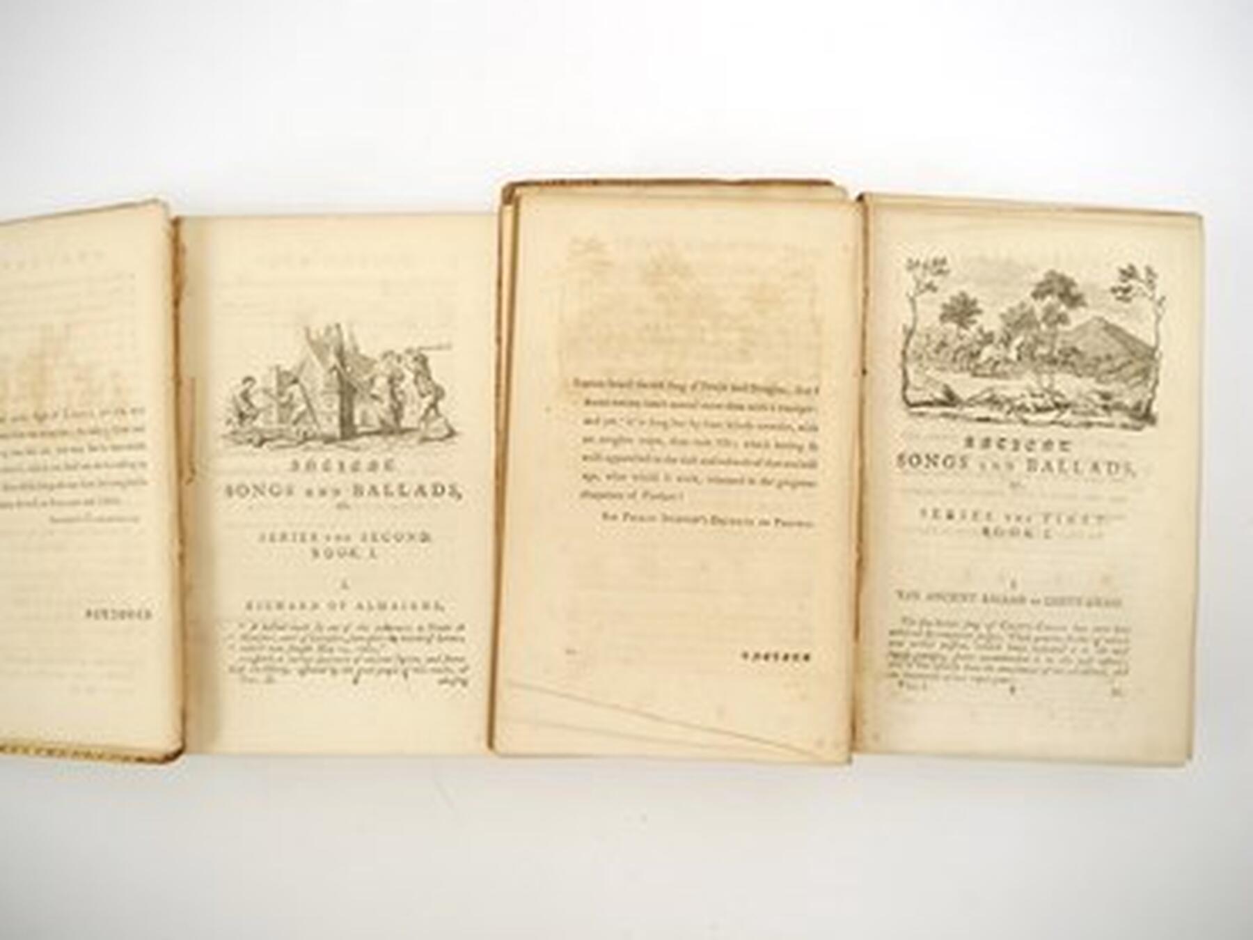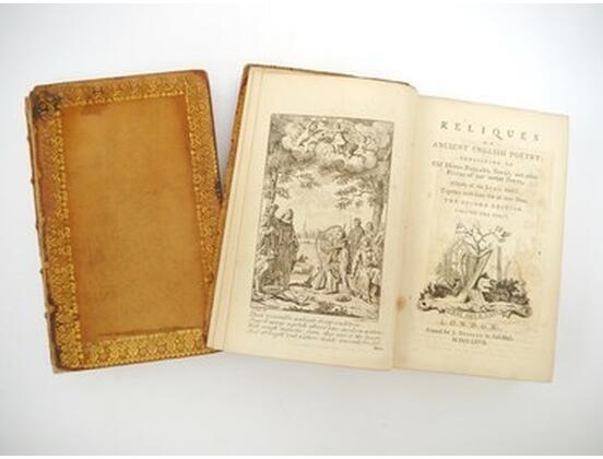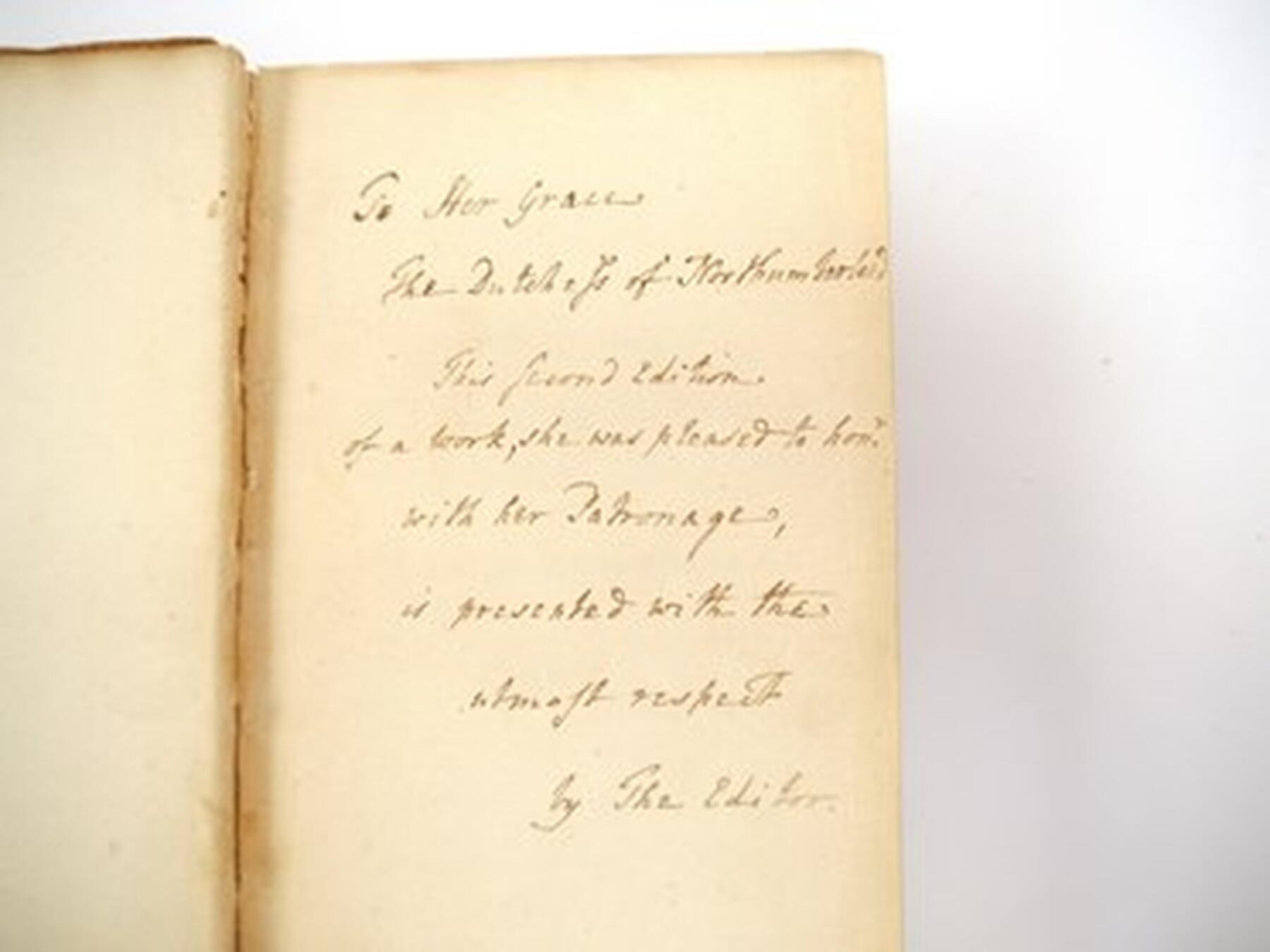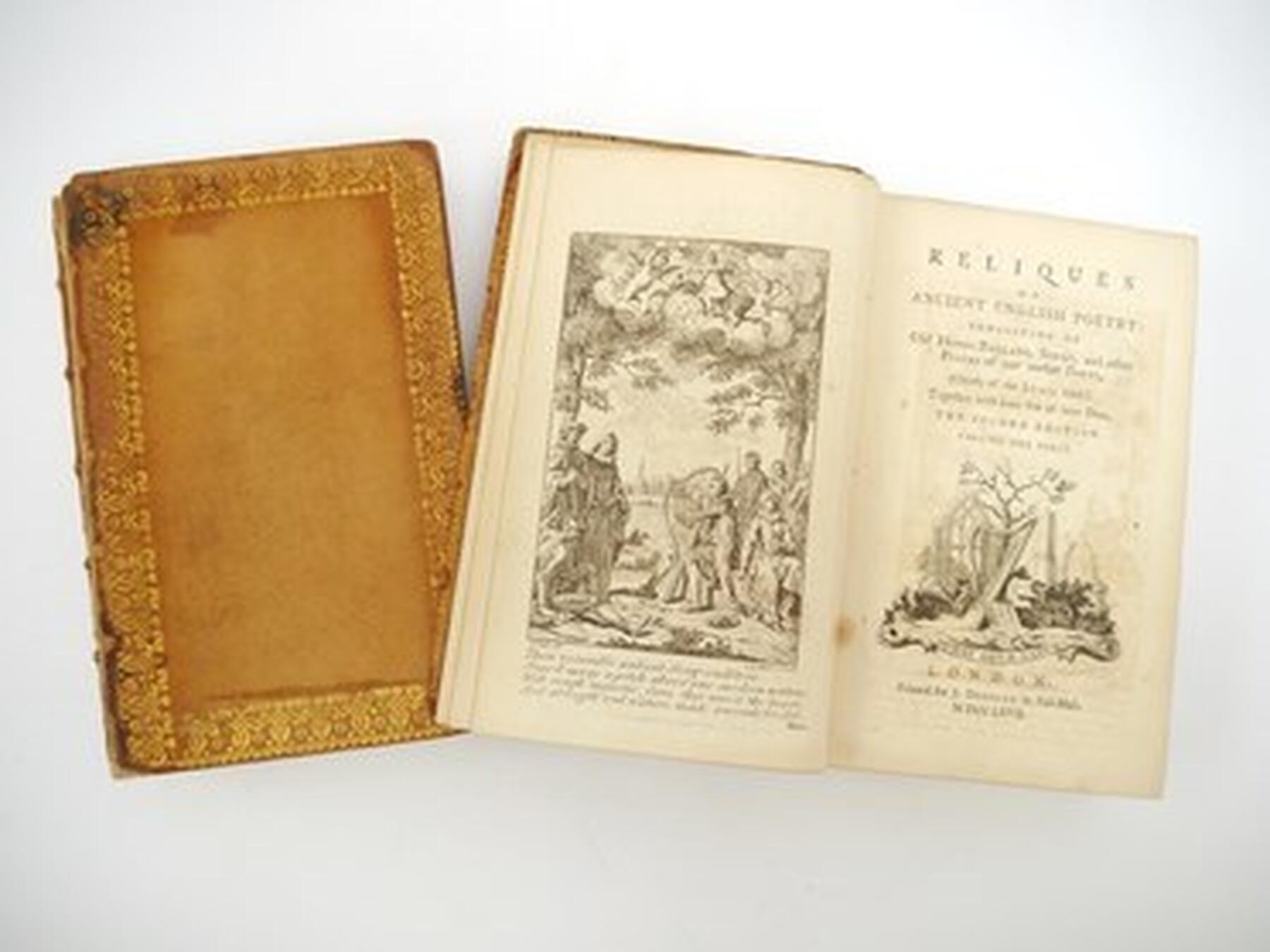 Bishop Thomas Percy (1729-1811): 'Reliques of Ancient English Poetry', London, J. Dodsley, 1767, 2nd edition, inscribed presentation by Percy to first blank of volume 1 ''To Her Grace The Dutchess of Northumberland This Second edition of a work, she was pleased to honr. with her Patronage, is presented with the utmost respect by The Editor'', volumes 1 & 2 (of 3 volumes), engraved frontis volume 1, engraved vignette title pages to each volume, contemporary calf gilt very worn, textblocks/bindings split, boards detached (but present), all edges gilt, armorial bookplates of The Dutchess of Northumberland, Syon House, to front pastedowns (2)