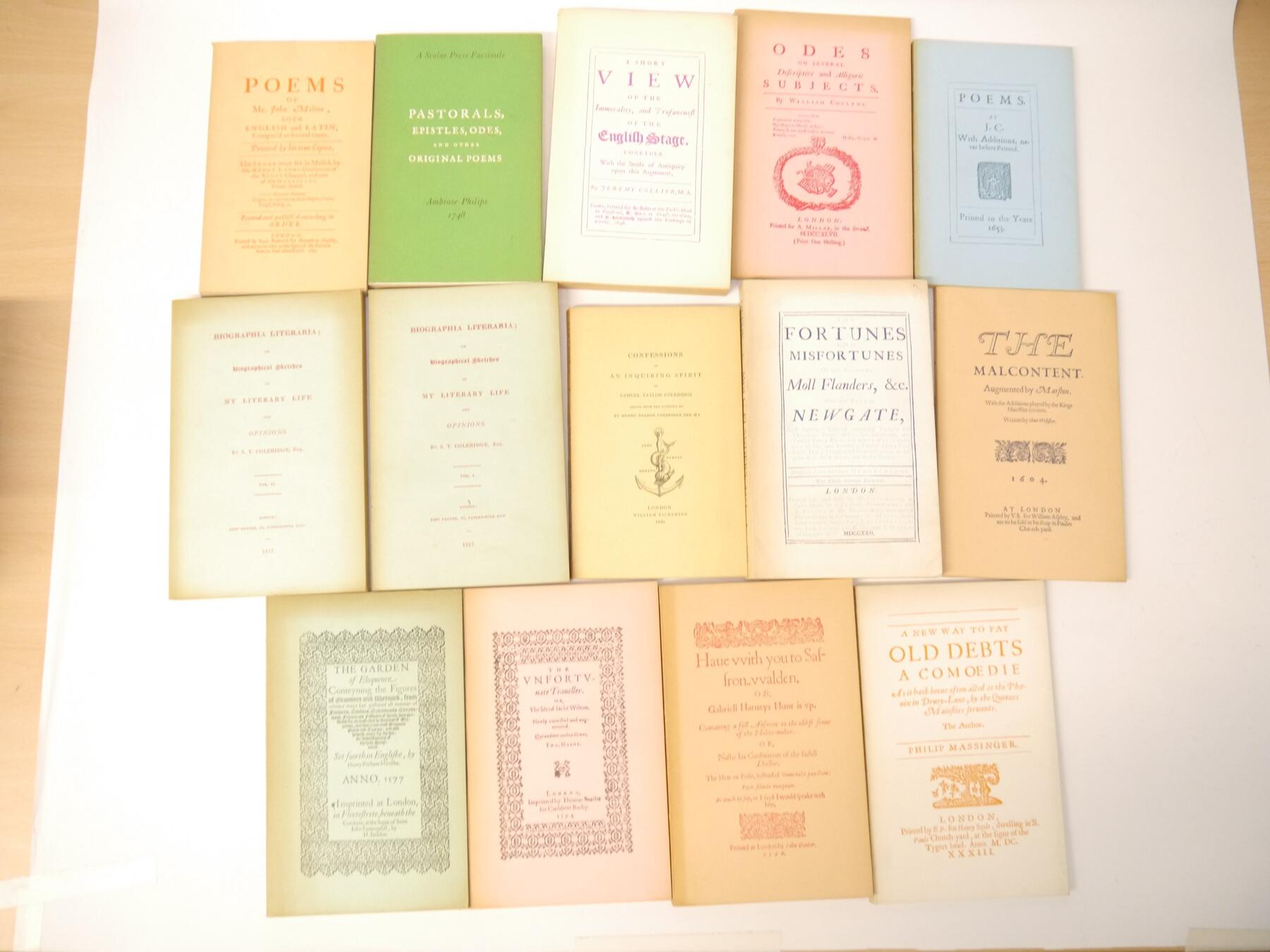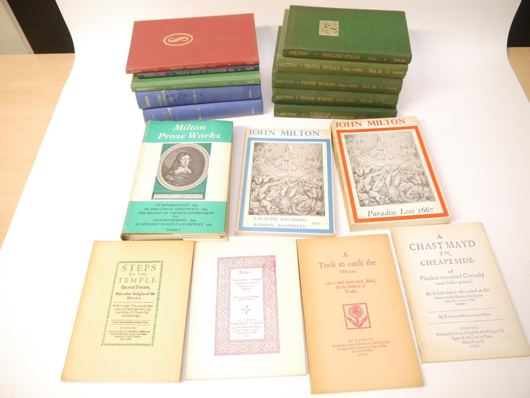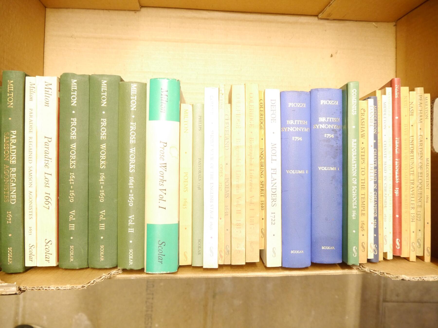 Scolar Press Facsimiles, a collection of 30+ volumes of facsimile repirnts of important antiquarian works and classics of literature including Milton 'Prose of Works 1641-1650' 3 vols, 'Paradise Lost 1667'; Paradise Regained 1671'; 'Defoe 'Moll Flanders 1772,; Coleridge 'Biographia Literaria 1817, 2 vols; plus others Thomas Nash, Thomas Middleton, Massinger, Marston etc mainly published late 1960's - early 1970's.
