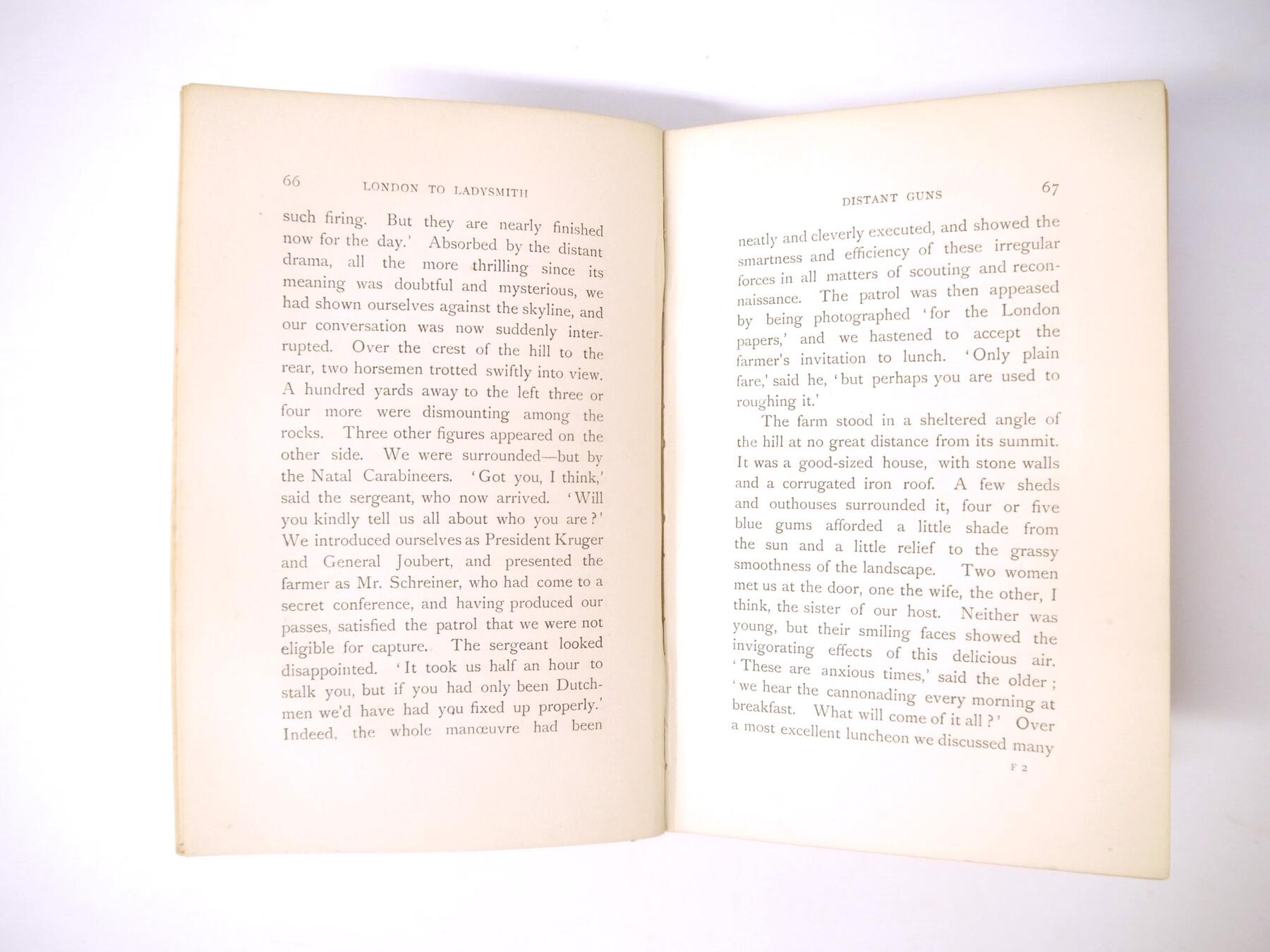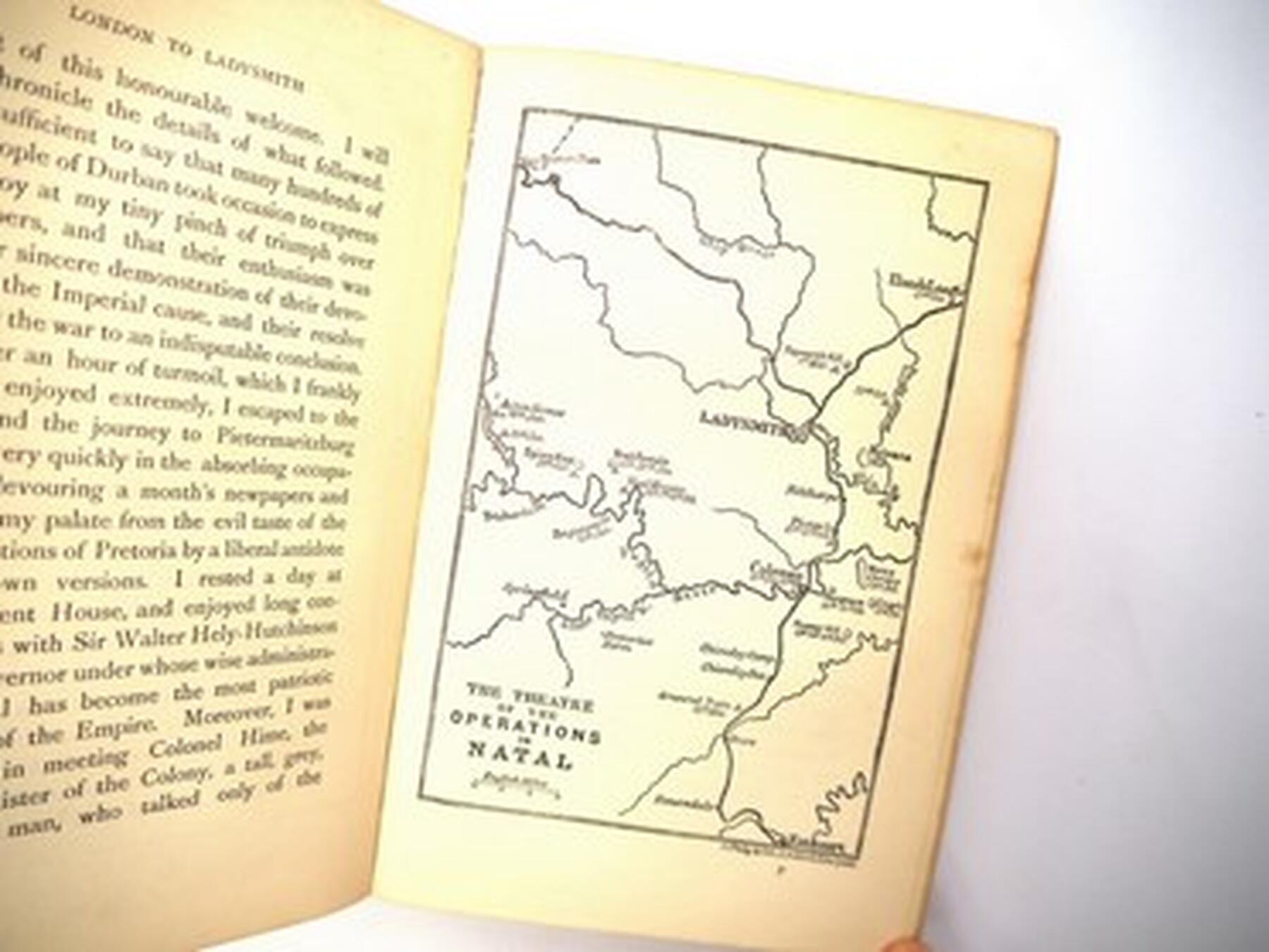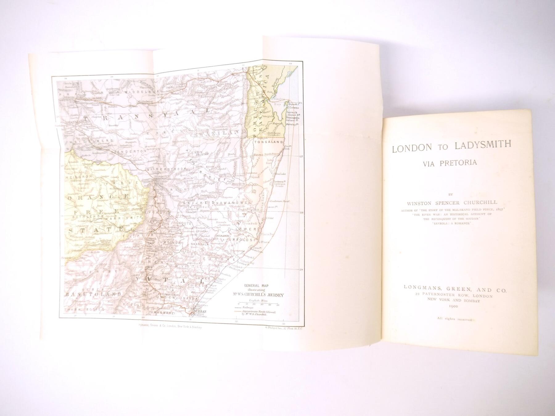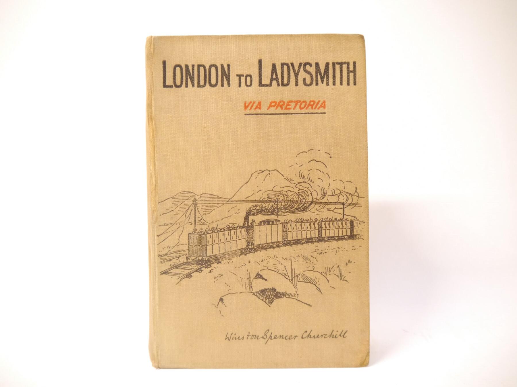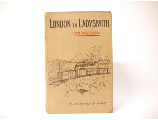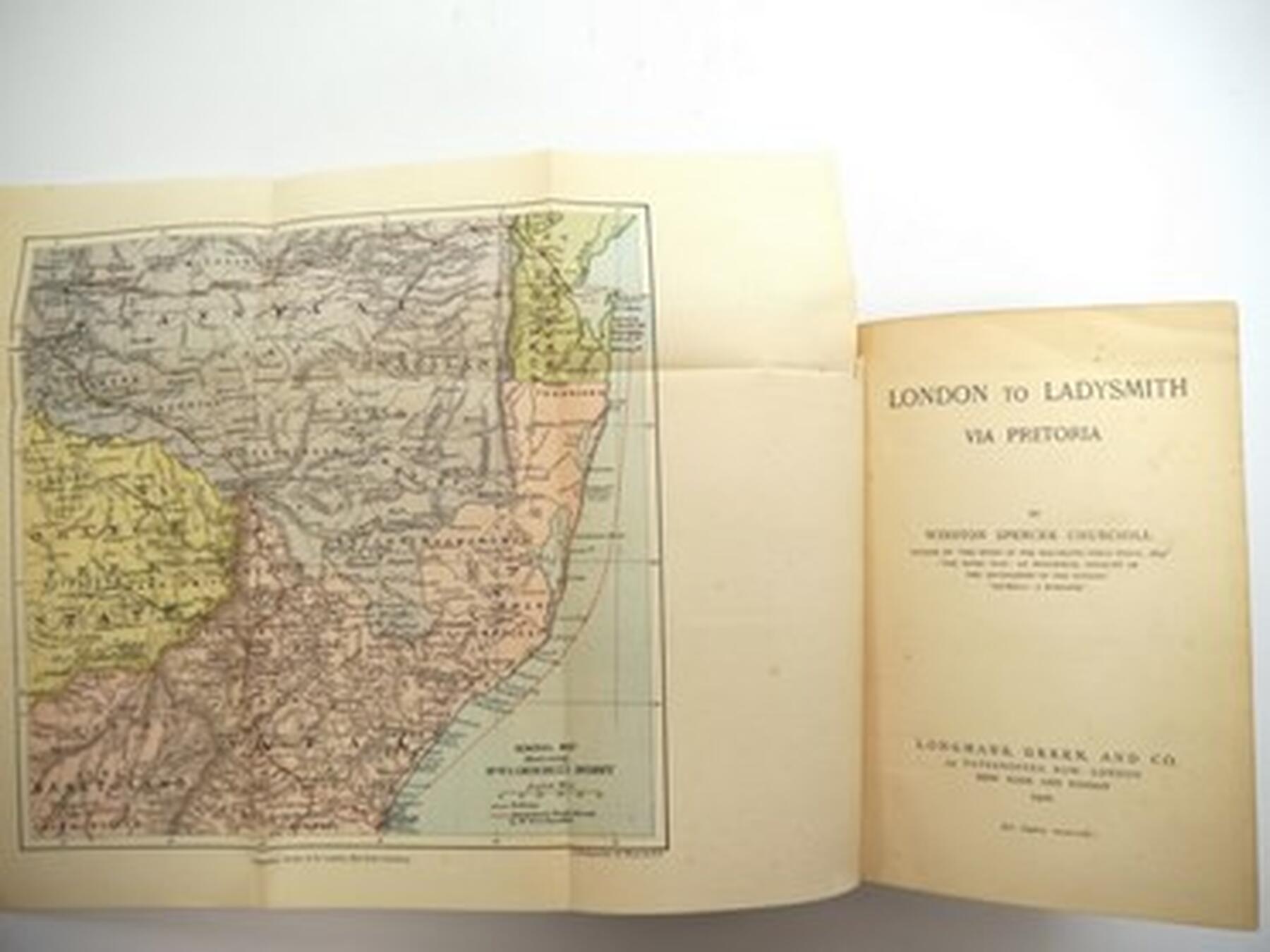 Winston Spencer Churchill: 'London to Ladysmith via Pretoria', London, Longmans, Green & Co, 1900, 1st edition, 3 folding maps as called for including colour frontispiece, 32pp publisher's catalogue of advertisements at end (dated 10/99), spine browned, recased retaining original pictorial cloth gilt