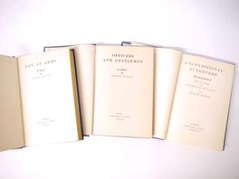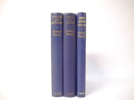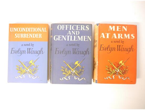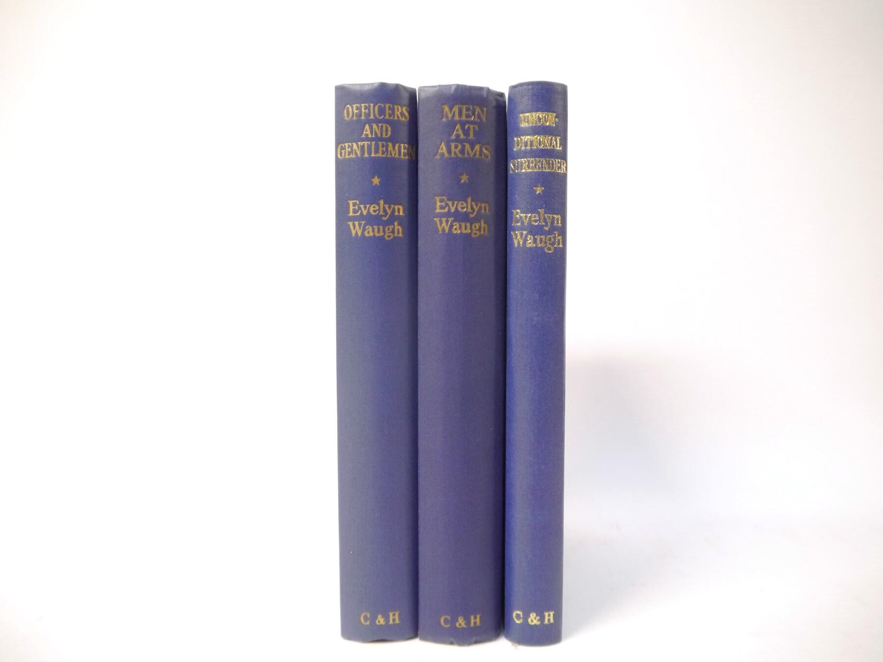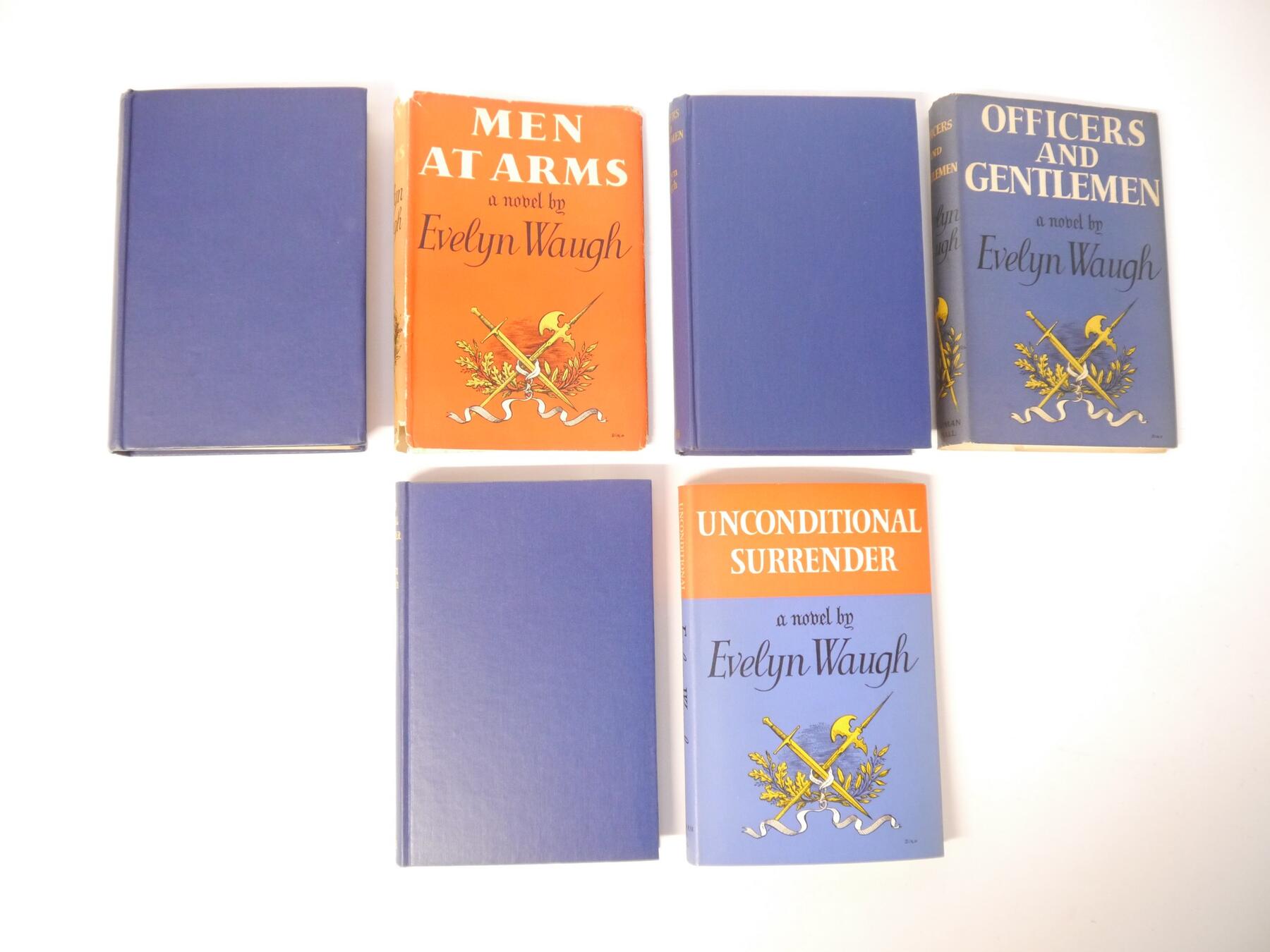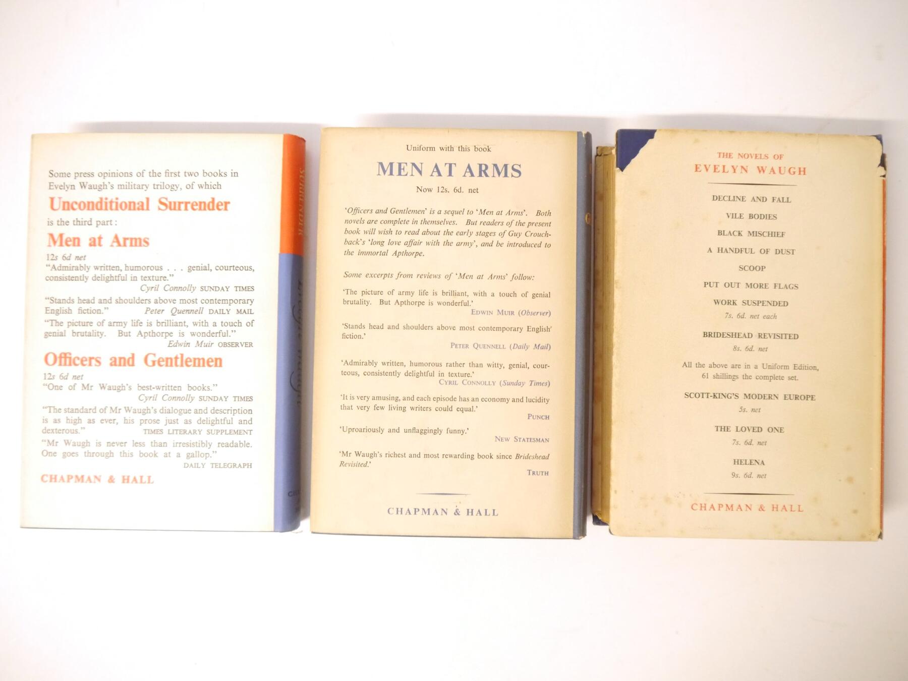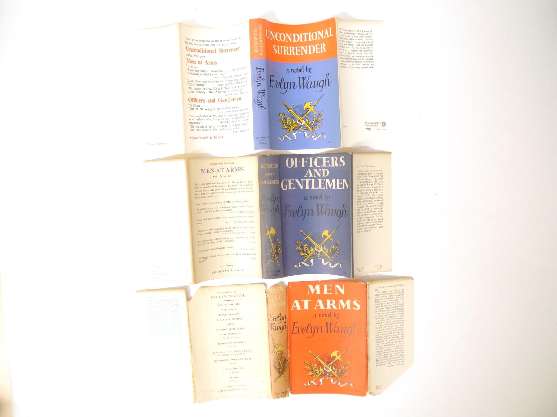 Evelyn Waugh, Sword of Honour trilogy: 'Men at Arms', 1952, 1st edition, 'Officers and Gentlemen', 1955, 1st edition, 'Unconditional Surrender', 1961 1st edition, all published London, Chapman & Hall, all original cloth gilt, dust wrappers (Men at Arms wrapper price clipped and slightly chipped/worn with some small part losses, cloth VGC, other 2 titles wrappers not price clipped, VGC/Fine and cloth VGC) (3)