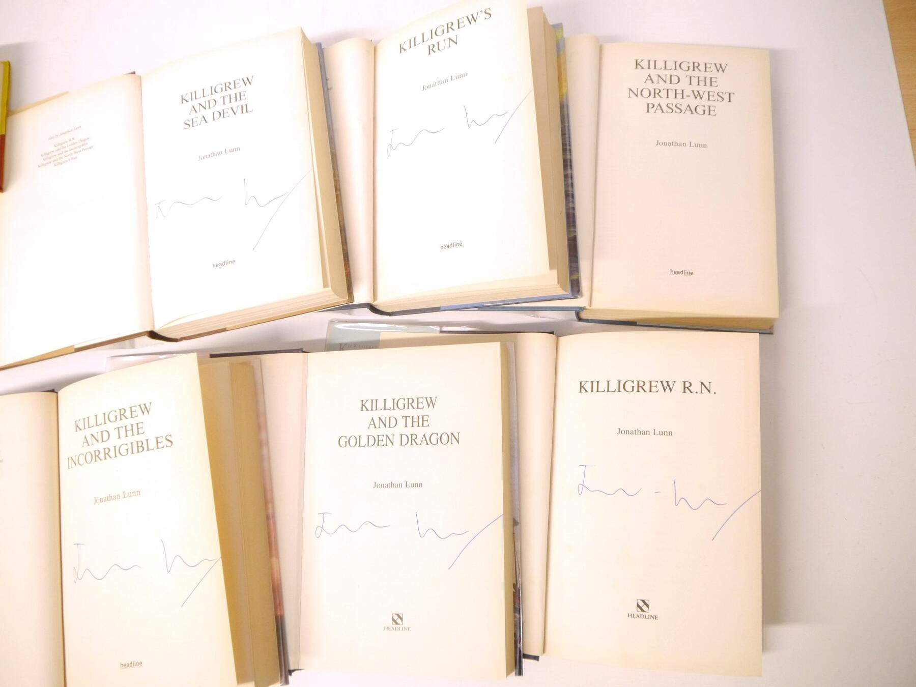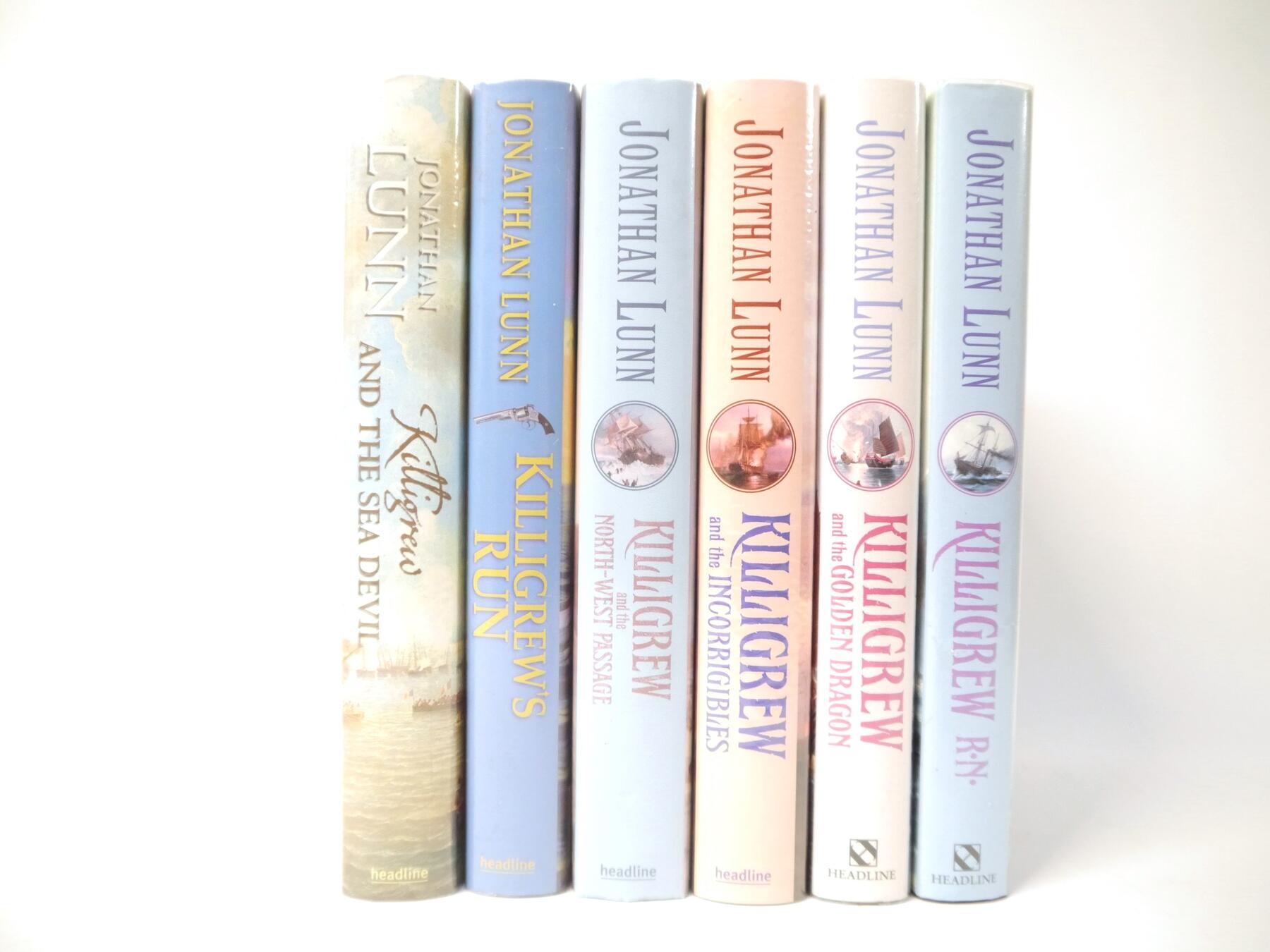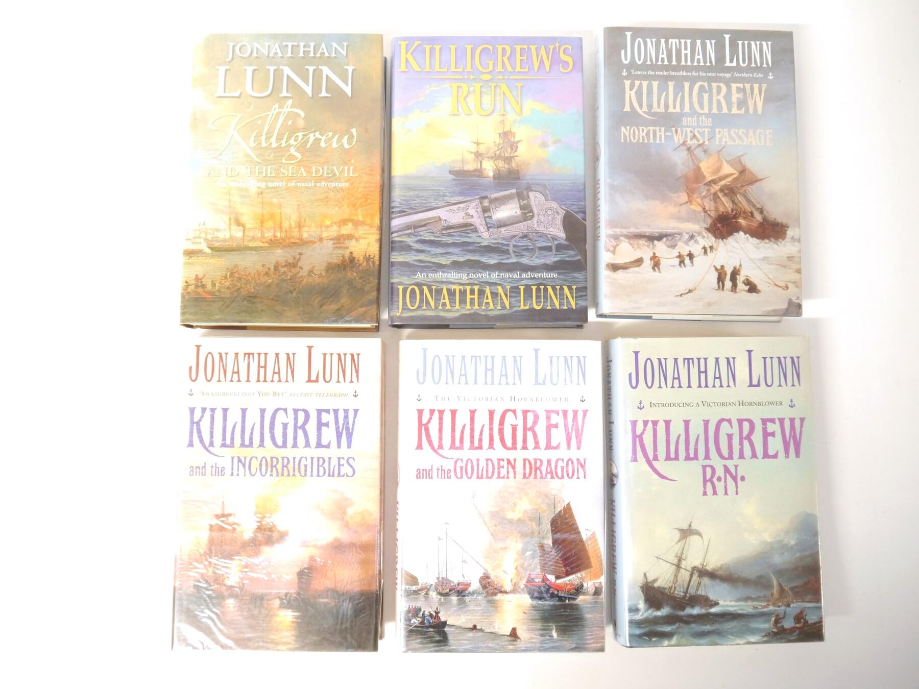 Jonathan Lunn, set of six Kit Killigrew naval adventure historical novels, all UK 1st editions published by Headline, five signed, comprising 'Killigrew R.N.', 2000, signed; 'Killigrew and the Golden Dragon', 2001, signed; 'Killigrew and the Incorrigibles', 2002, signed; 'Killigrew and the North-West Passage', 2003; 'Killigrew's Run', 2004, signed; 'Killigrew and the Sea Devil', 2005, signed, each original cloth, dust wrappers, provenance Ian Latter (6)