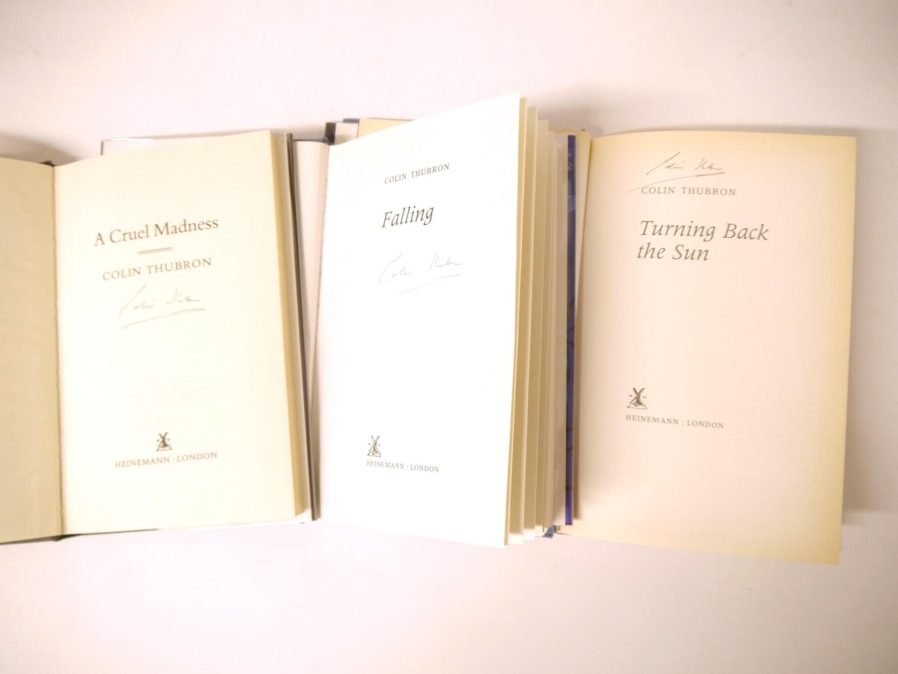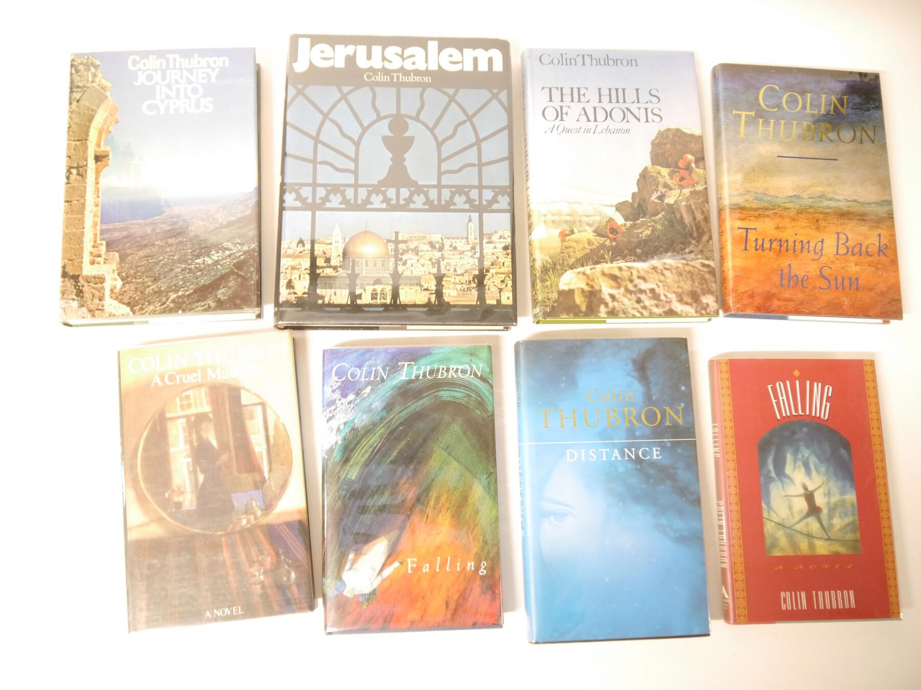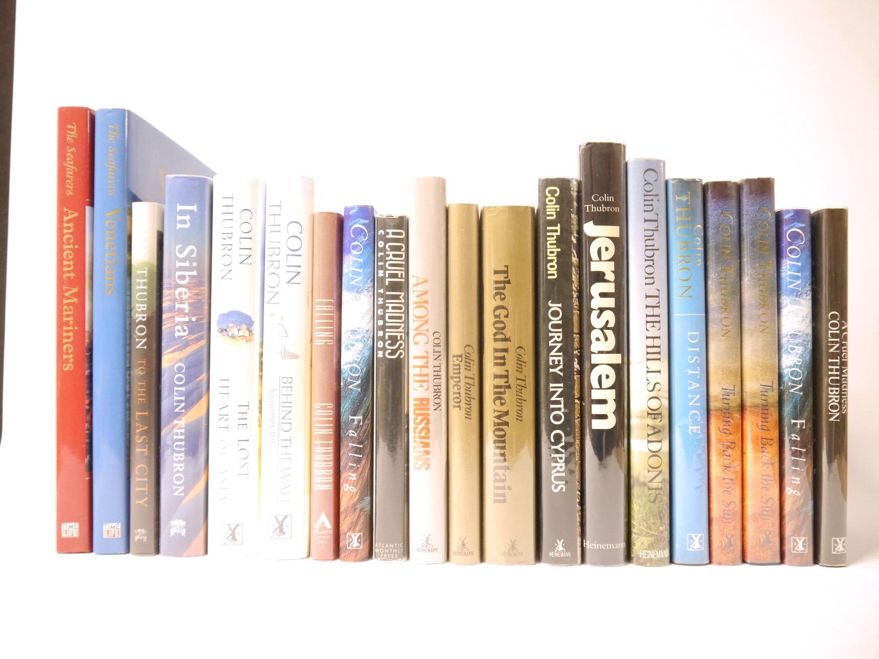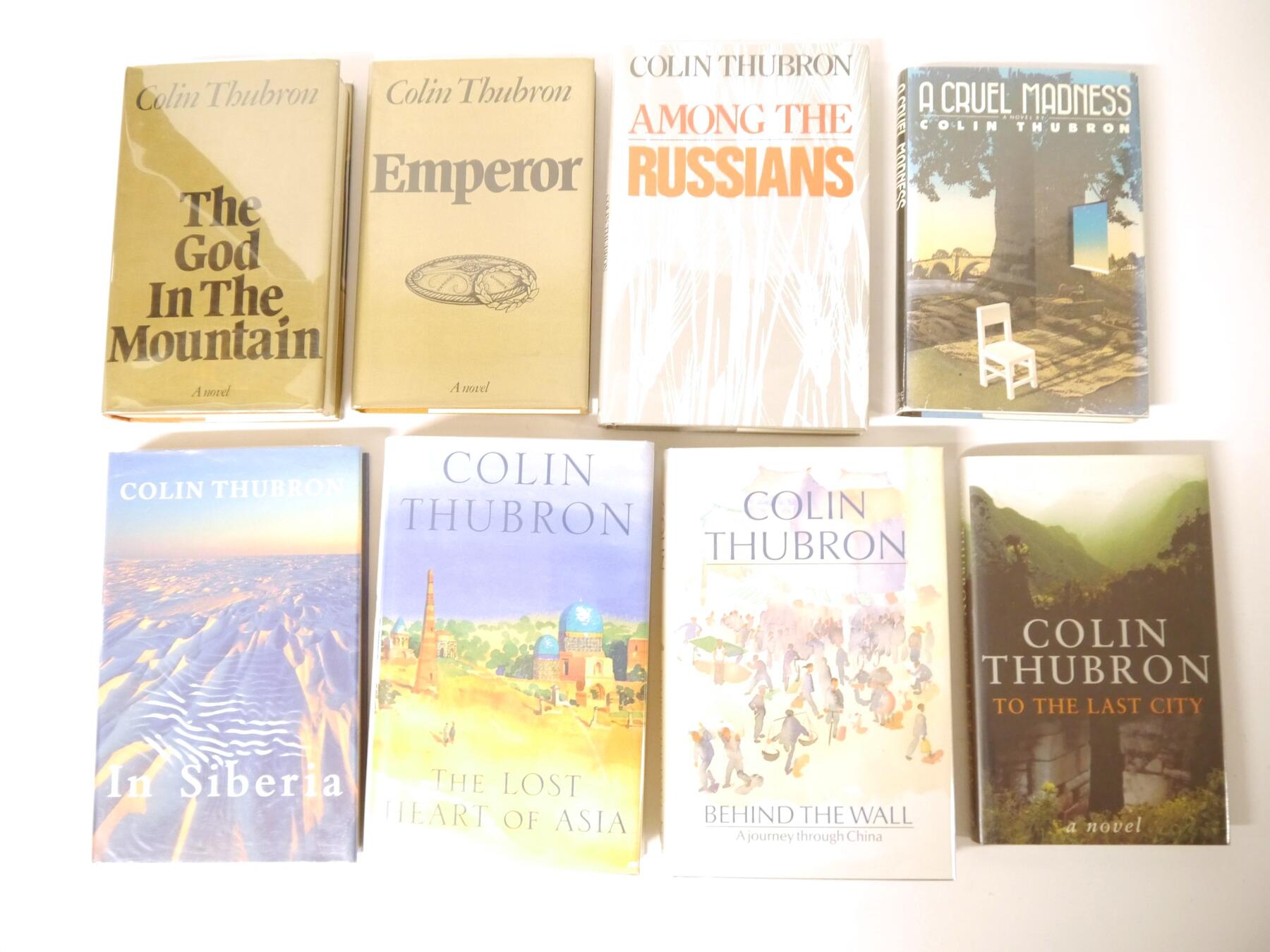 Colin Thubron, collection of eighteen 1st editions, all original cloth, dust wrappers, five signed, comprising 'A Cruel Madness', London, 1984, signed; 'Falling', London, 1989, signed; 'Turning Back the Sun', London, 1991, 2 copies, each signed; 'Distance', London, 1996, signed; 'The Hills of Adonis A Quest in Lebanon', London, 1968, author's second book; 'Jerusalem', London, 1969; 'Journey Into Cyprus', London, 1975; 'The God in The Mountain', London, 1977, author's first novel; 'Emperor', London, 1978; 'Among the Russians', London, 1983; 'A Cruel Madness', New York, 1984; 'Behind The Wall', London, 1987; 'Falling', London, 1989, and another copy, New York, 1991; 'The Lost Heart of Asia', London, 1994; 'In Siberia', London, 1999; 'To the Last City', London, 2002, all 1st Uk or US editions, all VGC in VGC wrappers, plus 2 others Thubron & Time Life, provenance Ian Latter (20)