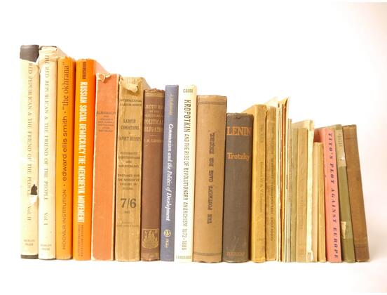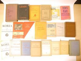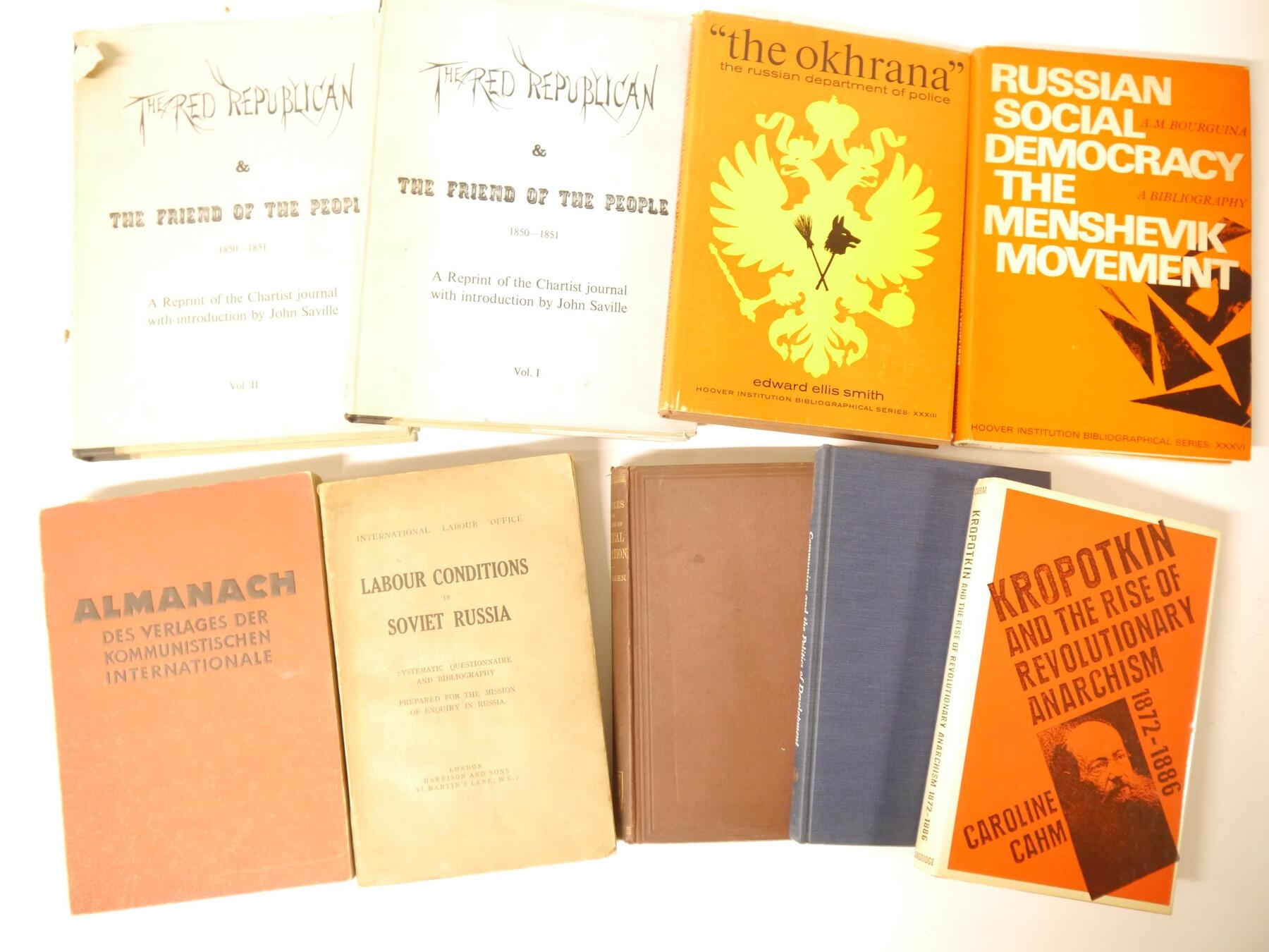 A collection of approximately 30 books and booklets on Communism, Marxism-Leninism, Trade Unions, Soviet Union and Eastern Bloc etc, including ''Almanach de Verlages der Kommunistischen Internationale 1921'', coloured and black and white illustrations, original card wraps; Leon Trotzky: ''Lenin'', 1925, 1st edition, original cloth; Bourguina: ''Russian Social Democracy The Menshevik Movement; Hoover Institution, 1968; E E Smith: ''The Okhrana'', 1967; plus others Marx Engels, Lenin, Mao Tse-Tung, ''The Red-Republican & Friend of the People'', 1966 reprint, two volumes etc
