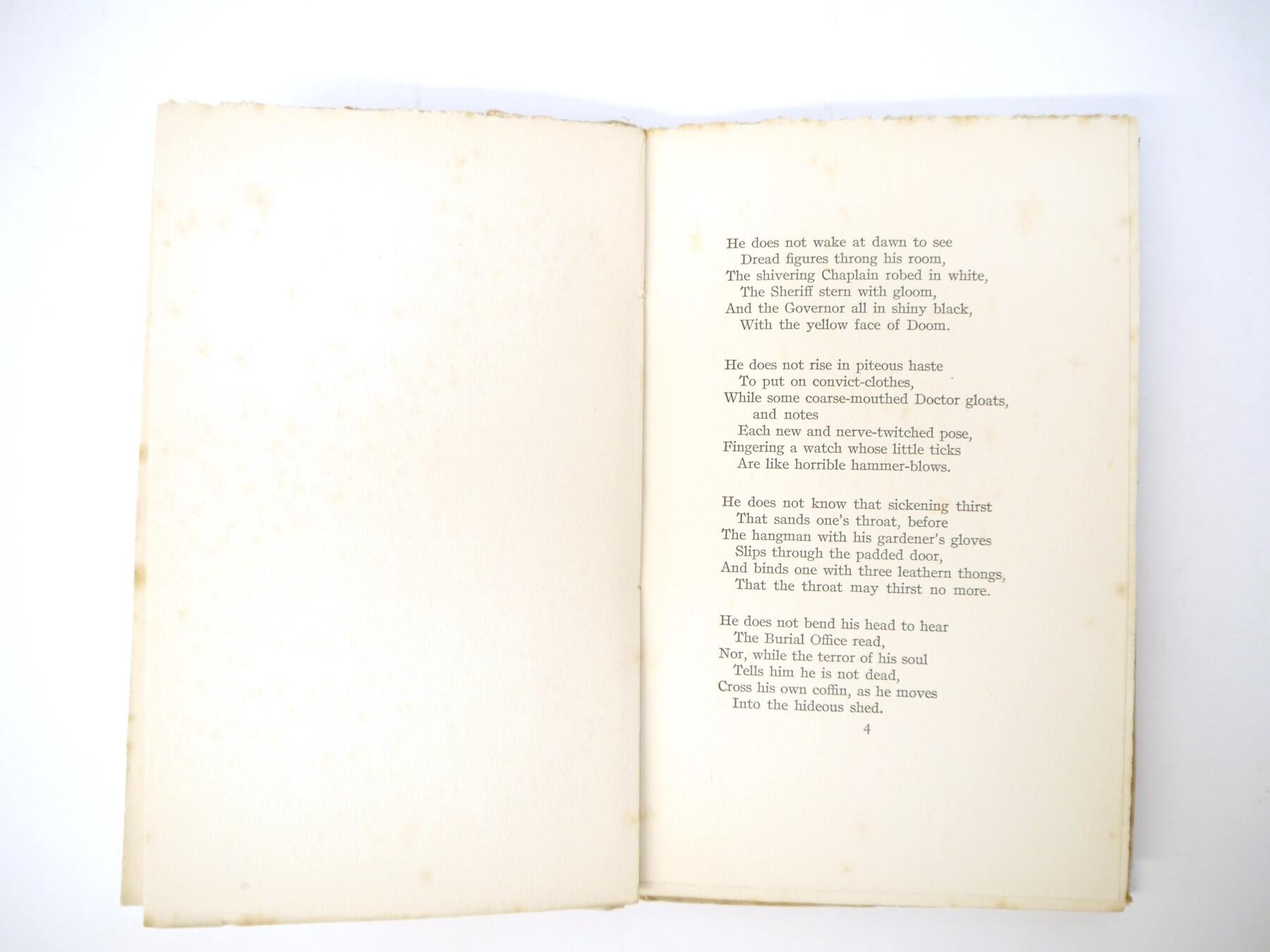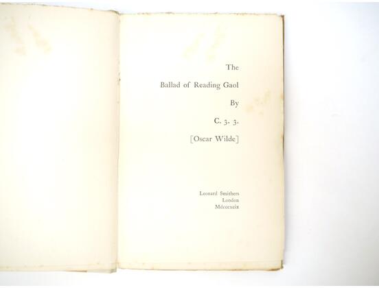 C.3.3. [Oscar Wilde] : 'The Ballad of Reading Gaol', stated London, Leonard Smithers, 1899, but a pirated edition circa 1899-1907, authors name printed on title page beneath his cell number, vi, 31pp, original cloth gilt (slightly grubby)