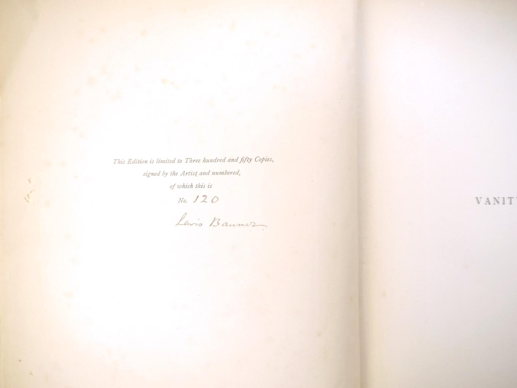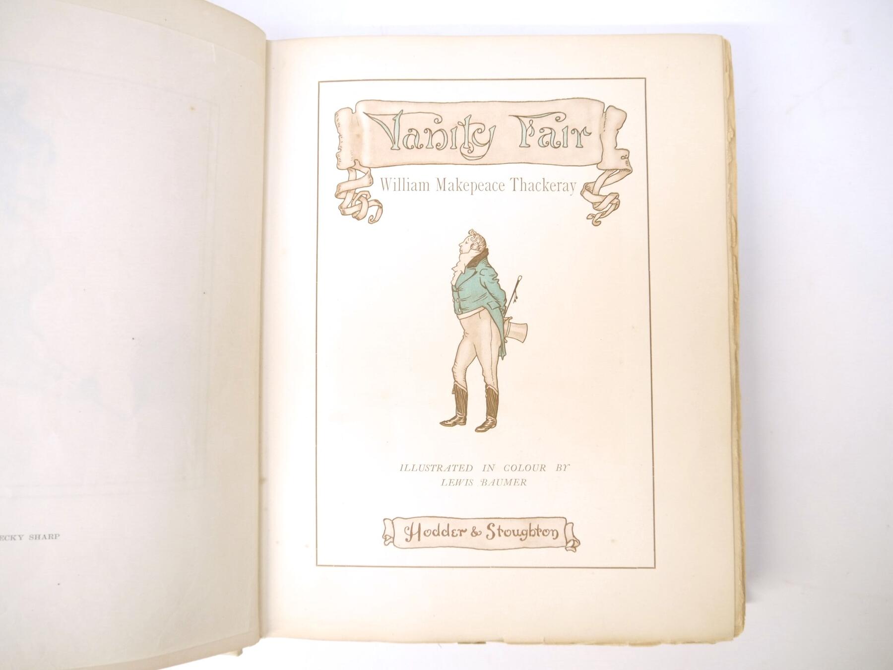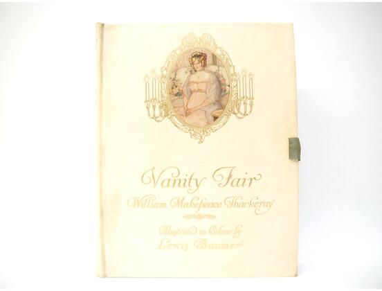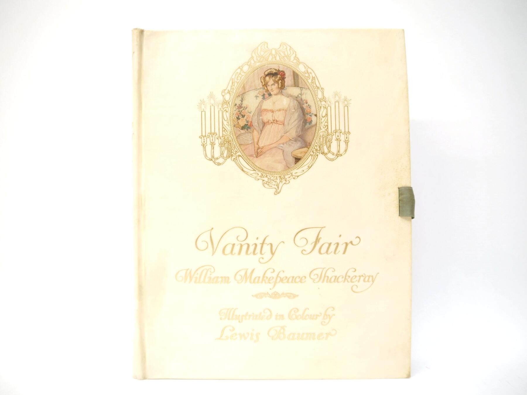 W.M. Thackeray: 'Vanity Fair', illustrated Lewis Baumer, London, Hodder & Stoughton, [1913], deluxe edition, signed by Baumer and numbered (120/350), 20 tipped in coloured plates as called for, 4to, original full decorative vellum gilt, mounted colour illustration to top board, silk ribbon ties, top edge gilt