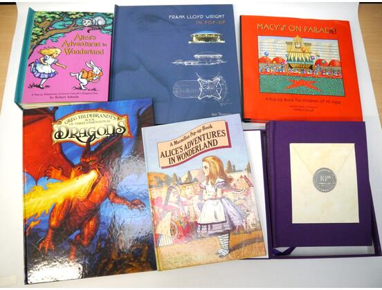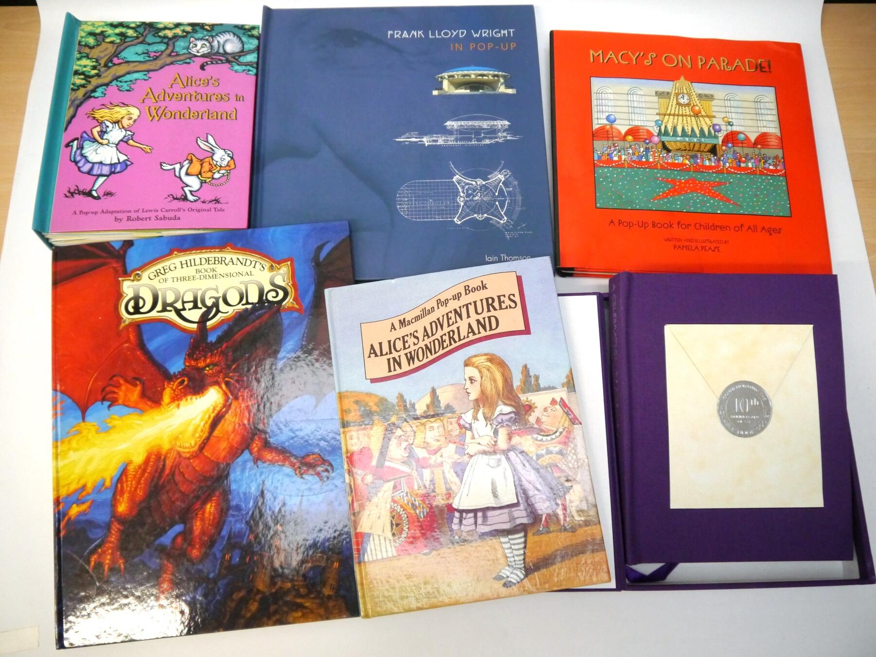 A small collection of pop-up books including Thomson: ''Frank Lloyd Wright In Pop-Up'', 2002, six pop-ups of famous buildings by Lloyd Wright as called for, original pictorial boards, ''Alice's Adventures in Wonderland'', pop-up adaption by Robert Sabuda, 2003, 1st edition, six pop-up illustrations as called for, original picture boards; J Dulong (edited): ''A Celebration of Pop-up Movable Books'', 2004, limited edition 10 pop-up/movable elements as called for, rotignal cloth, original solander box )2 copies); plus three others similar (7)