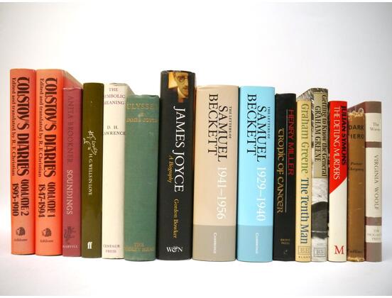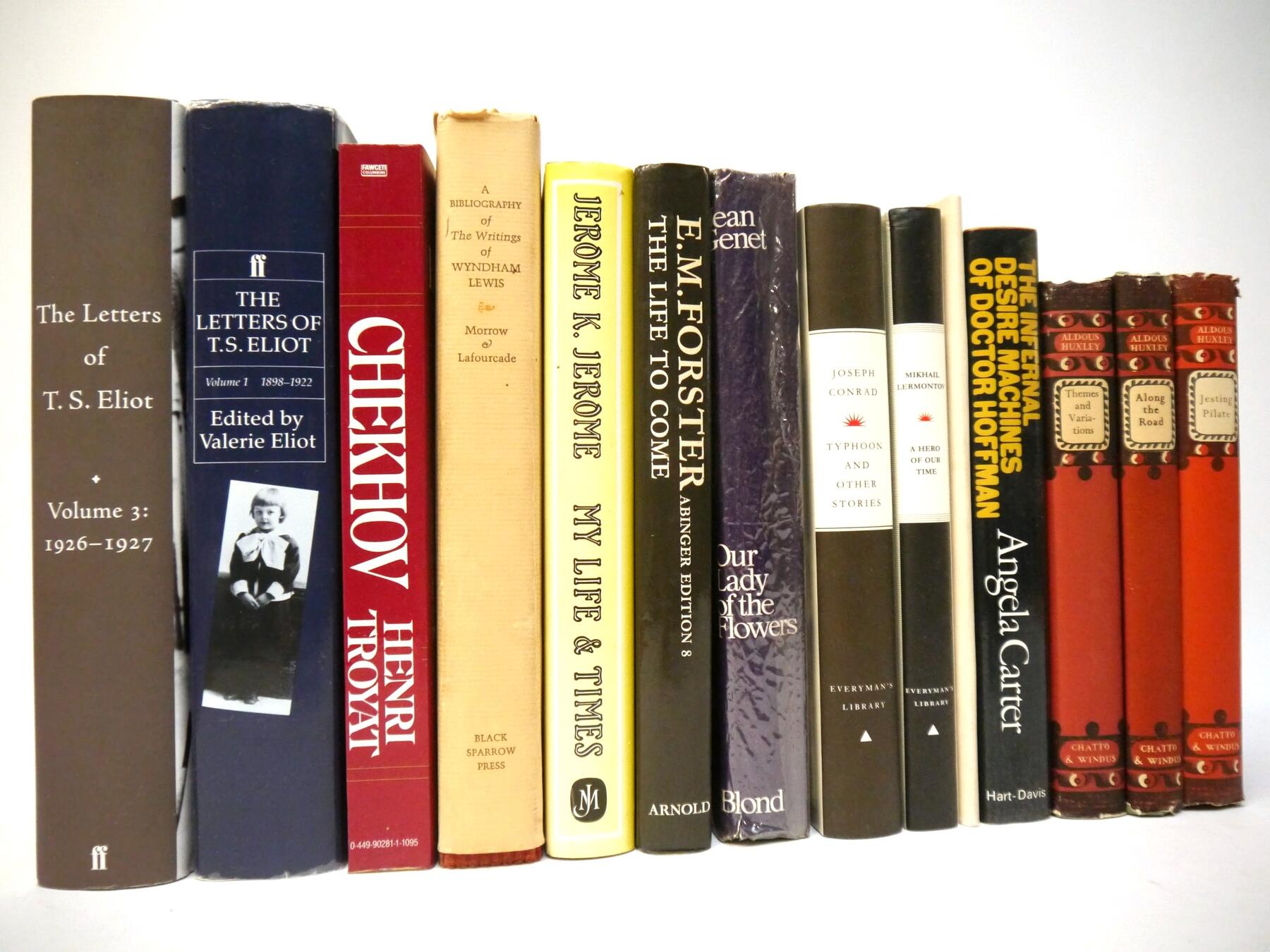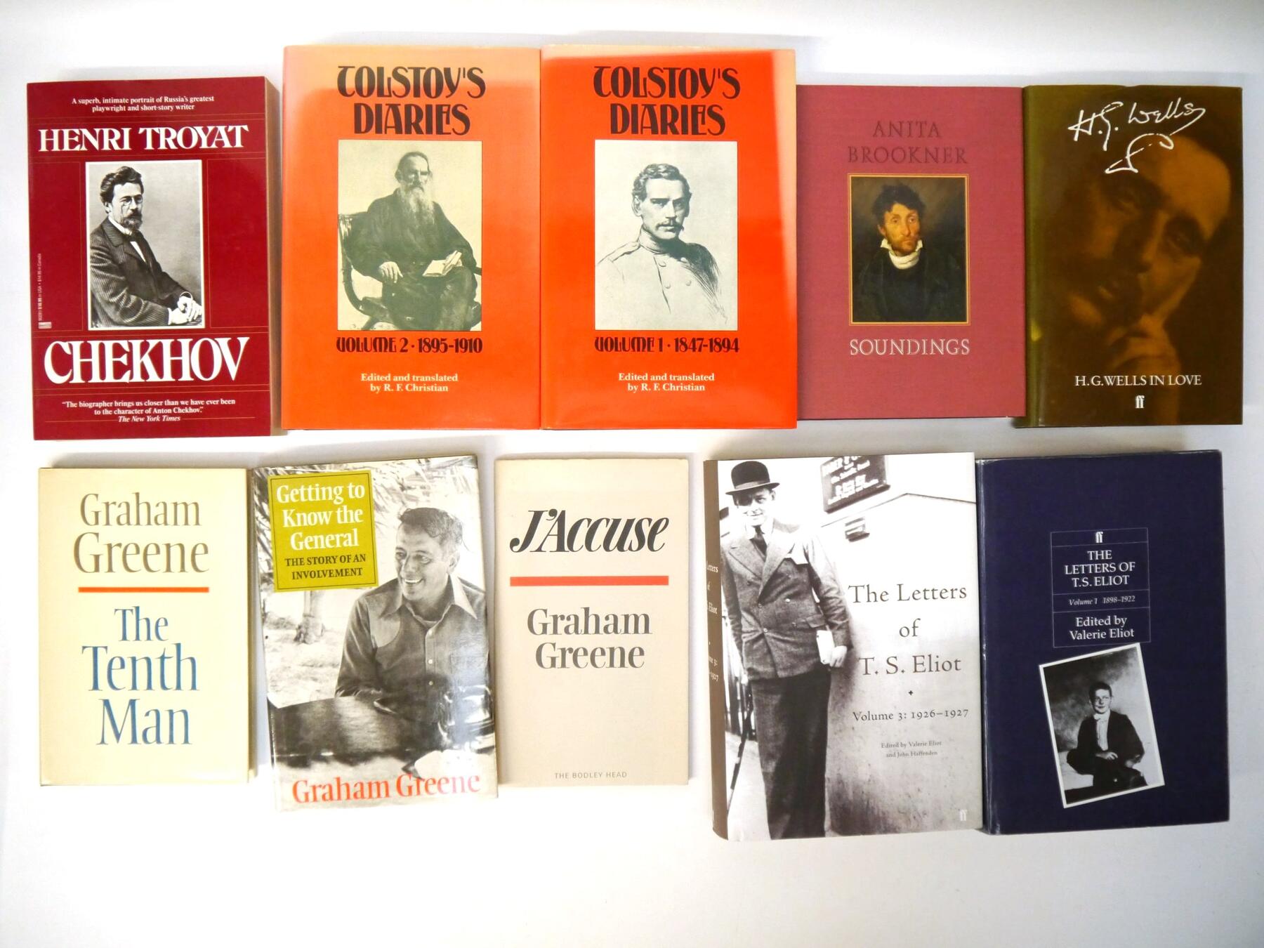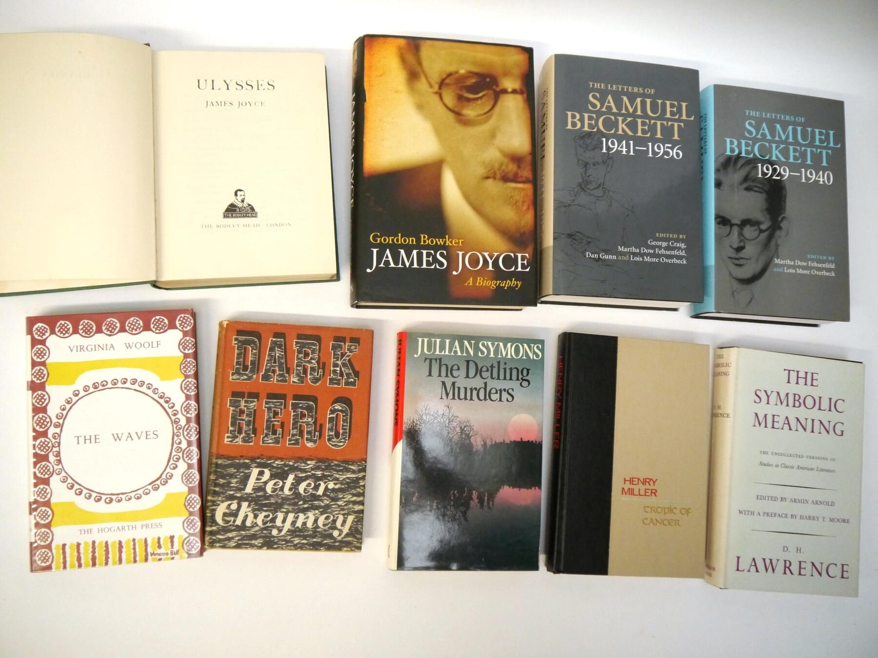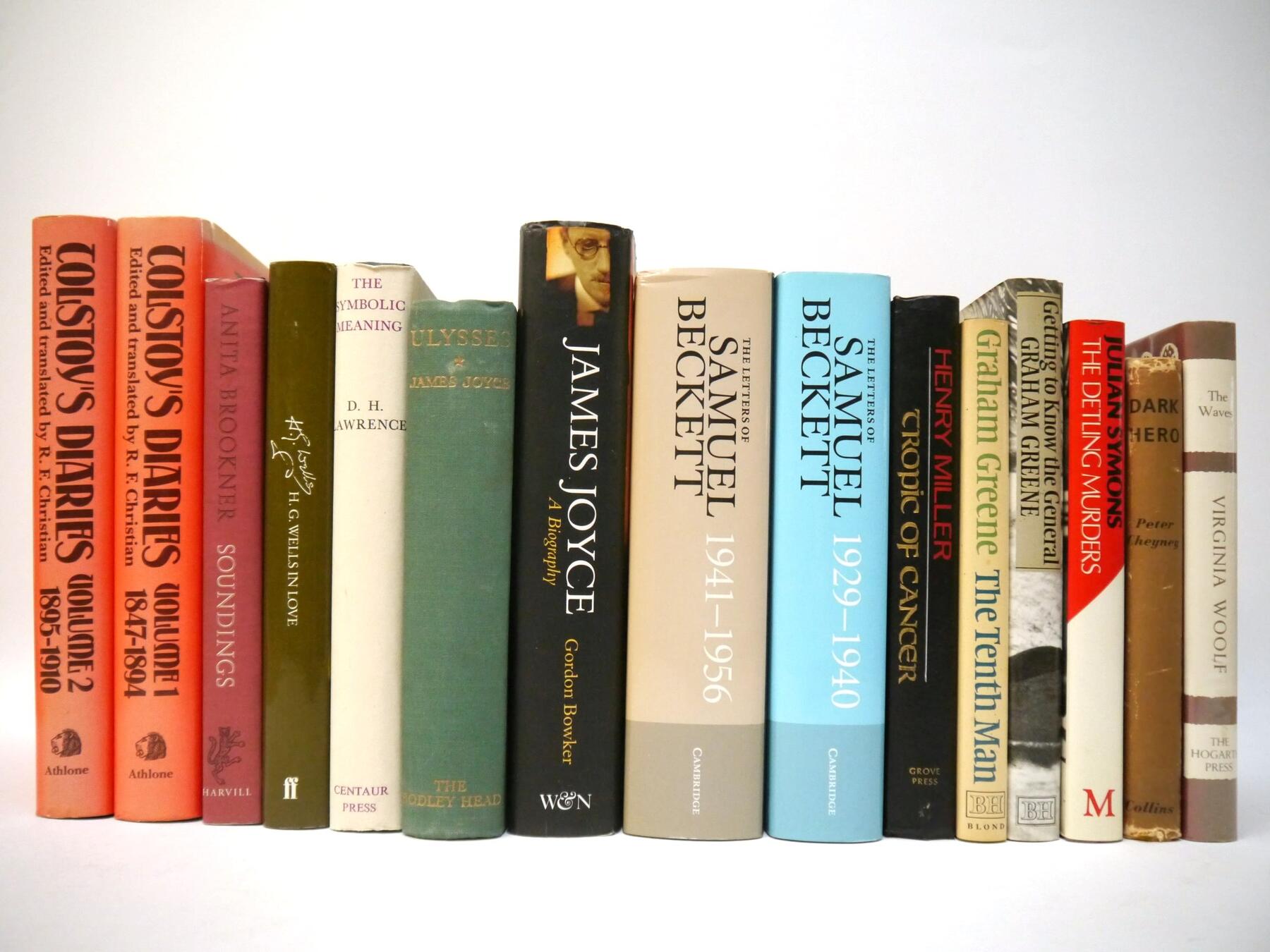 A collection of twenty nine modern firsts, literature, literary biographies etc, including James Joyce: 'Ulysses', Bodley Head, 1954 reprint, original green cloth gilt; Bowker: 'James Joyce A Biography', London, 2011, 1st edition, original cloth, dust wrapper; George Craig et al: 'The Letters of Samuel Beckett 1929-1940; 1941-1956', Cambridge University Press, 2009, 2011, 1st edition, 2 volumes, each original cloth, dust wrappers; D.H. Lawrence: 'The Symbolic Meaning', Centaur Press, 1962, 1st edition, original cloth, dust wrapper; Henry Miller: 'Tropic of Cancer', New York, Grove Press, circa 1961, original boards gilt; R.F. Christian: 'Tolstoy's Diaries Volume 1 1847-1894 Volume 2 1895-1910', London, 1985, 1st edition, 2 volumes, each original cloth gilt, dust wrappers; Virginia Woolf: 'The Waves', Hogarth Press, 1976 reprint, original cloth gilt, dust wrapper; Julian Symons: 'The Detling Murders', London, Macmillan, 1982, 1st edition, original cloth, dust wrapper; plus others by and related to Graham Greene, Aldous Huxley, T.S. Eliot, Jerome K. Jerome, Wyndham Lewis etc (29)