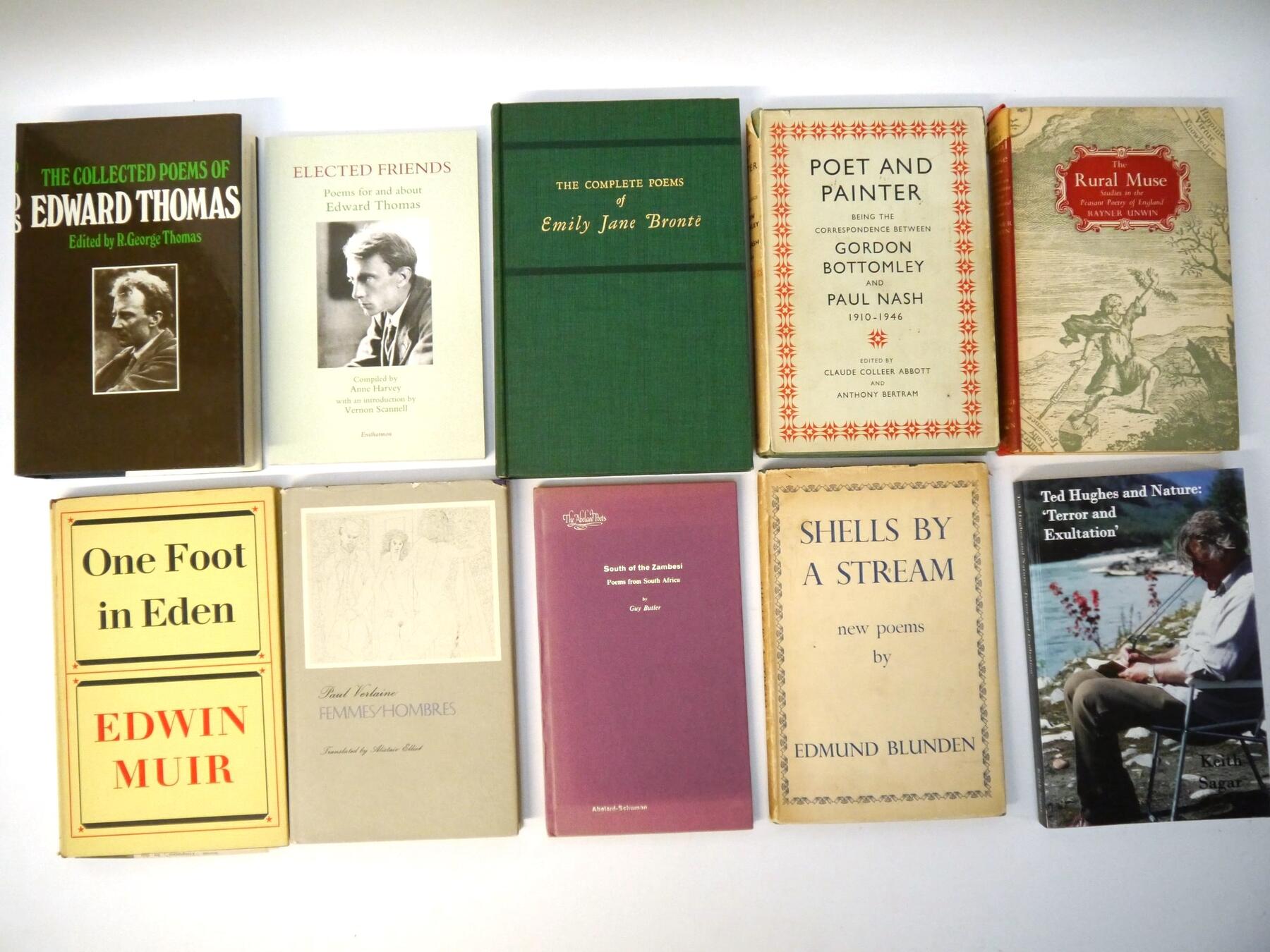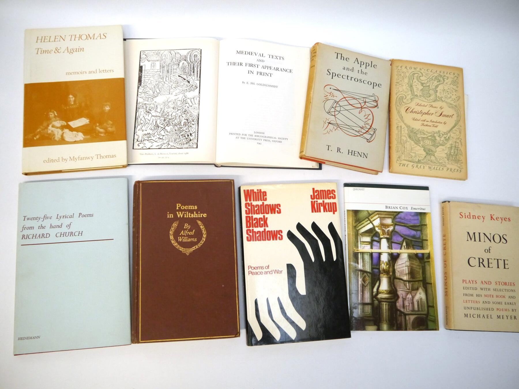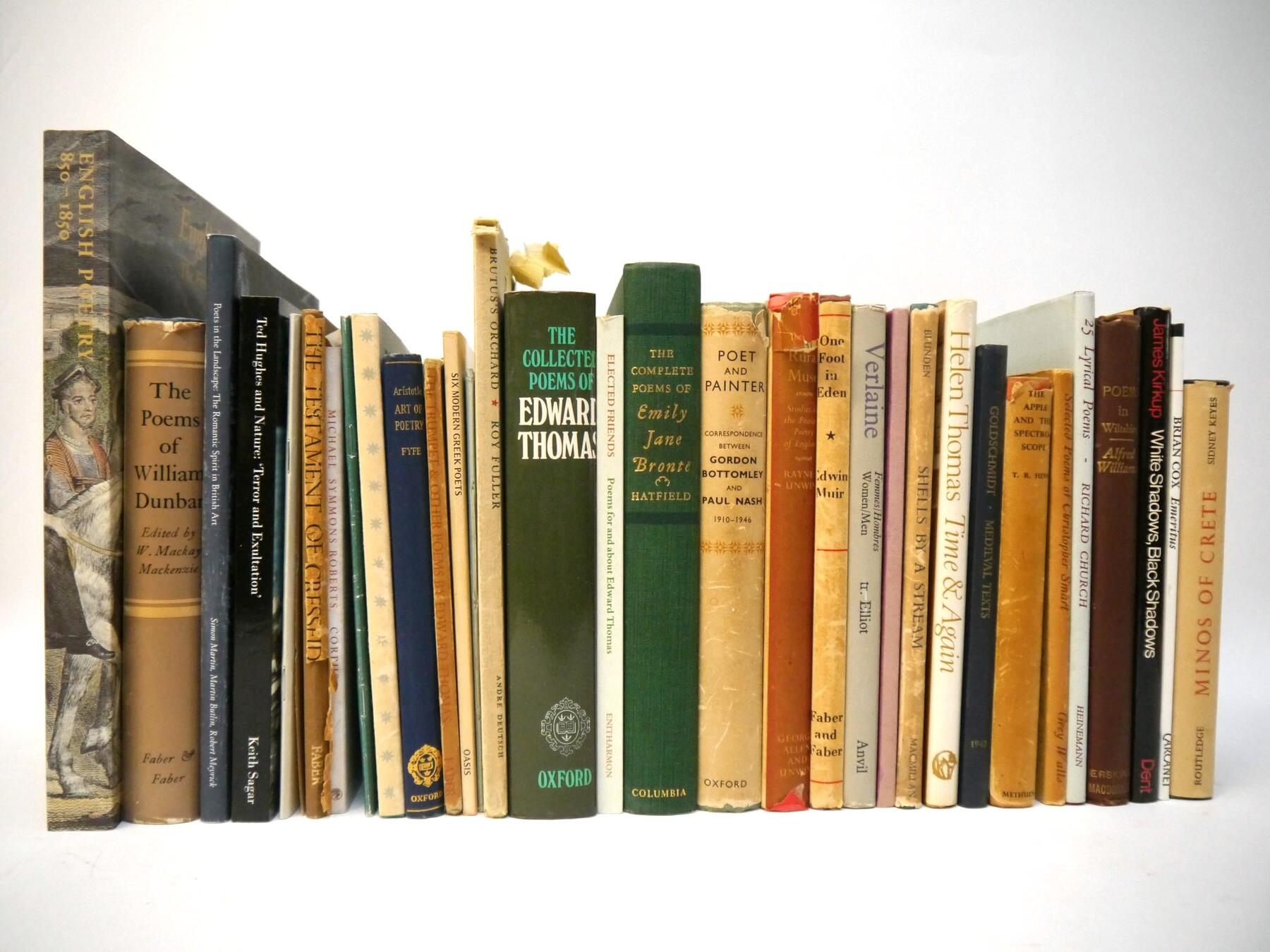 A collection of 30+ poetry titles etc, some from the collection of Allen Freer, collector and artist, including Brian Cox 'Emeritus', 2001, 1st edition, signed and inscribed to Allen Freer and with T.L.S. to him loosely inserted, original wraps; Richard Church: 'Twenty-five Lyrical Poems', 1967, limited edition, (197/500) , signed and numbered, original cloth gilt, 2 dust wrappers; Alfred Williams: 'Poems in Wiltshire', 1911, 1st edition, original cloth gilt; James Kirkup: 'White Shadows Black Shadows', 1970, 1st edition, signed, original cloth, dust wrapper; Helen Thomas: 'Time & Again', 1978, 1st, ownership signature of Allen Freer, original cloth, dust wrapper; 'Complete Poems of Emily Jane Bronte', New York, 1941, original cloth gilt; 'Poet & Painter Being the Corresondance between Gordon Bottomley and Paul Nash 1910-1946', 1955, 1st edition, original cloth, dust wrapper etc etc