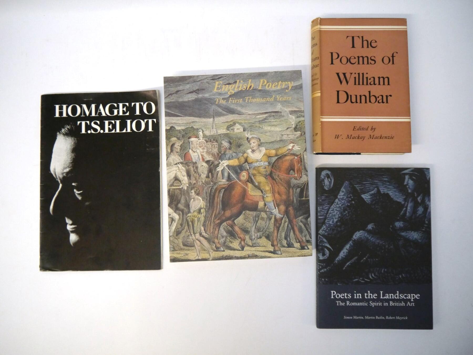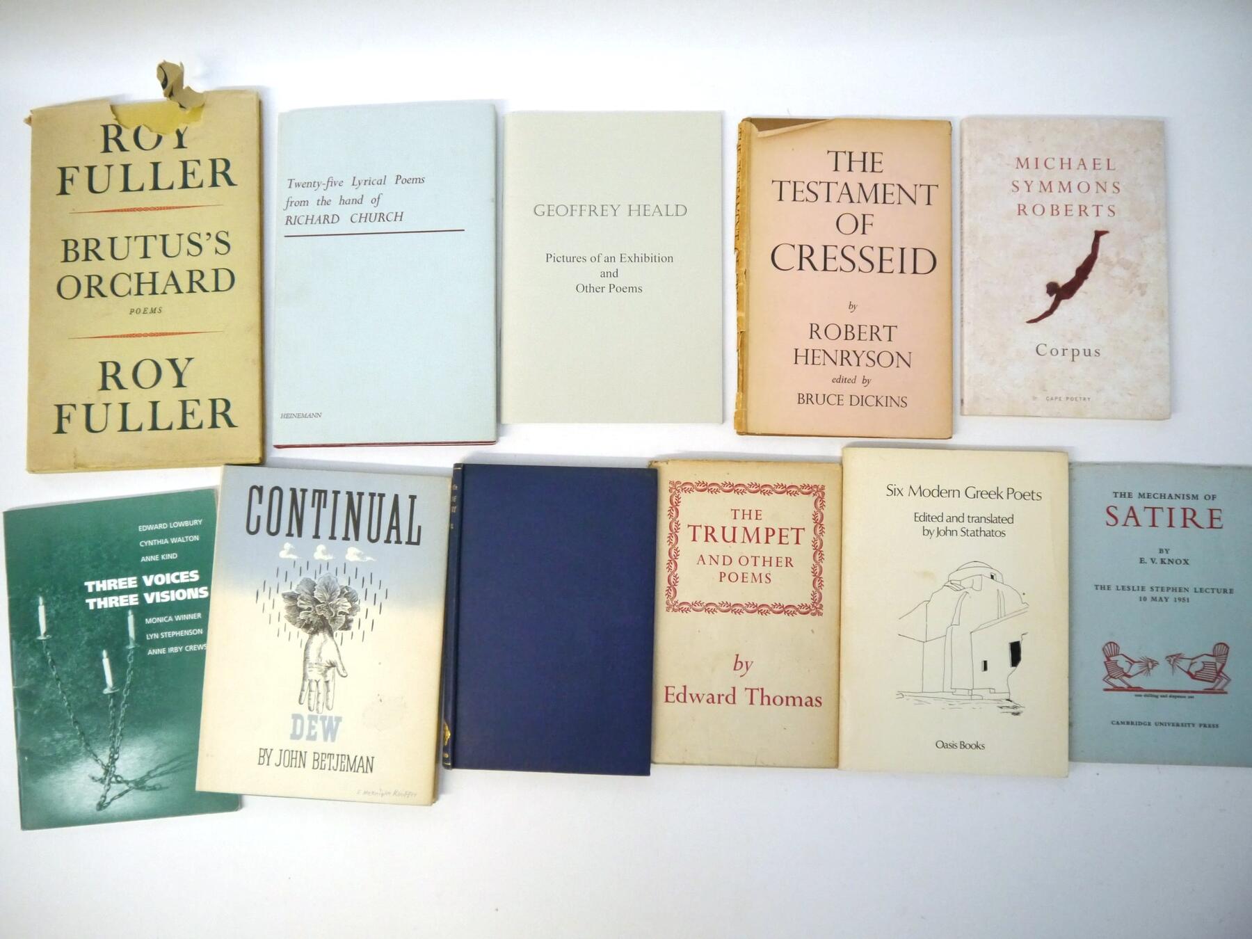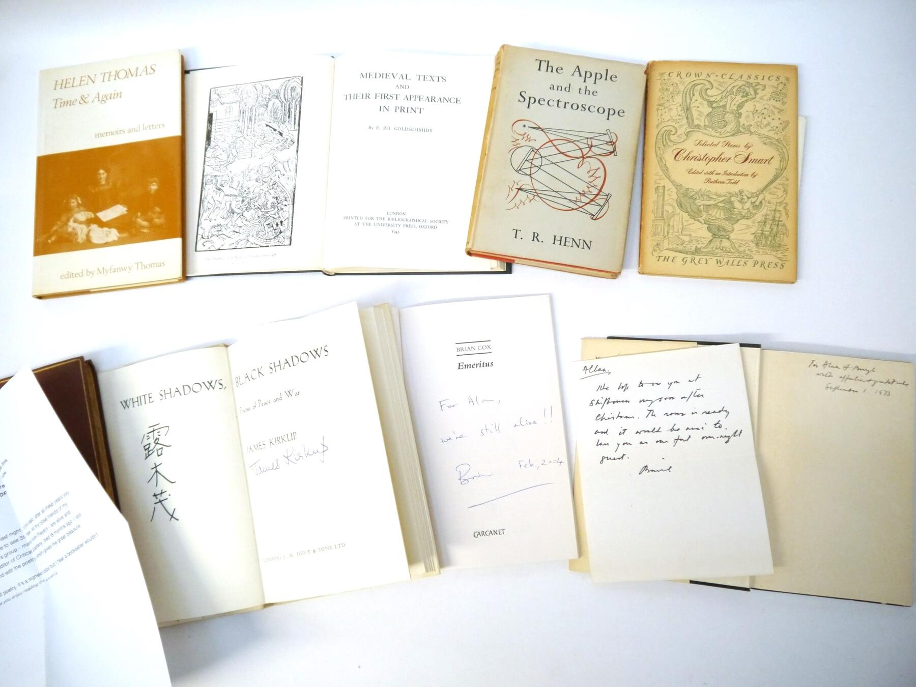 A collection of 30+ poetry titles etc, some from the collection of Allen Freer, collector and artist, including Brian Cox 'Emeritus', 2001, 1st edition, signed and inscribed to Allen Freer and with T.L.S. to him loosely inserted, original wraps; Richard Church: 'Twenty-five Lyrical Poems', 1967, limited edition, (197/500) , signed and numbered, original cloth gilt, 2 dust wrappers; Alfred Williams: 'Poems in Wiltshire', 1911, 1st edition, original cloth gilt; James Kirkup: 'White Shadows Black Shadows', 1970, 1st edition, signed, original cloth, dust wrapper; Helen Thomas: 'Time & Again', 1978, 1st, ownership signature of Allen Freer, original cloth, dust wrapper; 'Complete Poems of Emily Jane Bronte', New York, 1941, original cloth gilt; 'Poet & Painter Being the Corresondance between Gordon Bottomley and Paul Nash 1910-1946', 1955, 1st edition, original cloth, dust wrapper etc etc