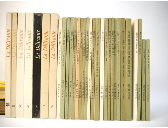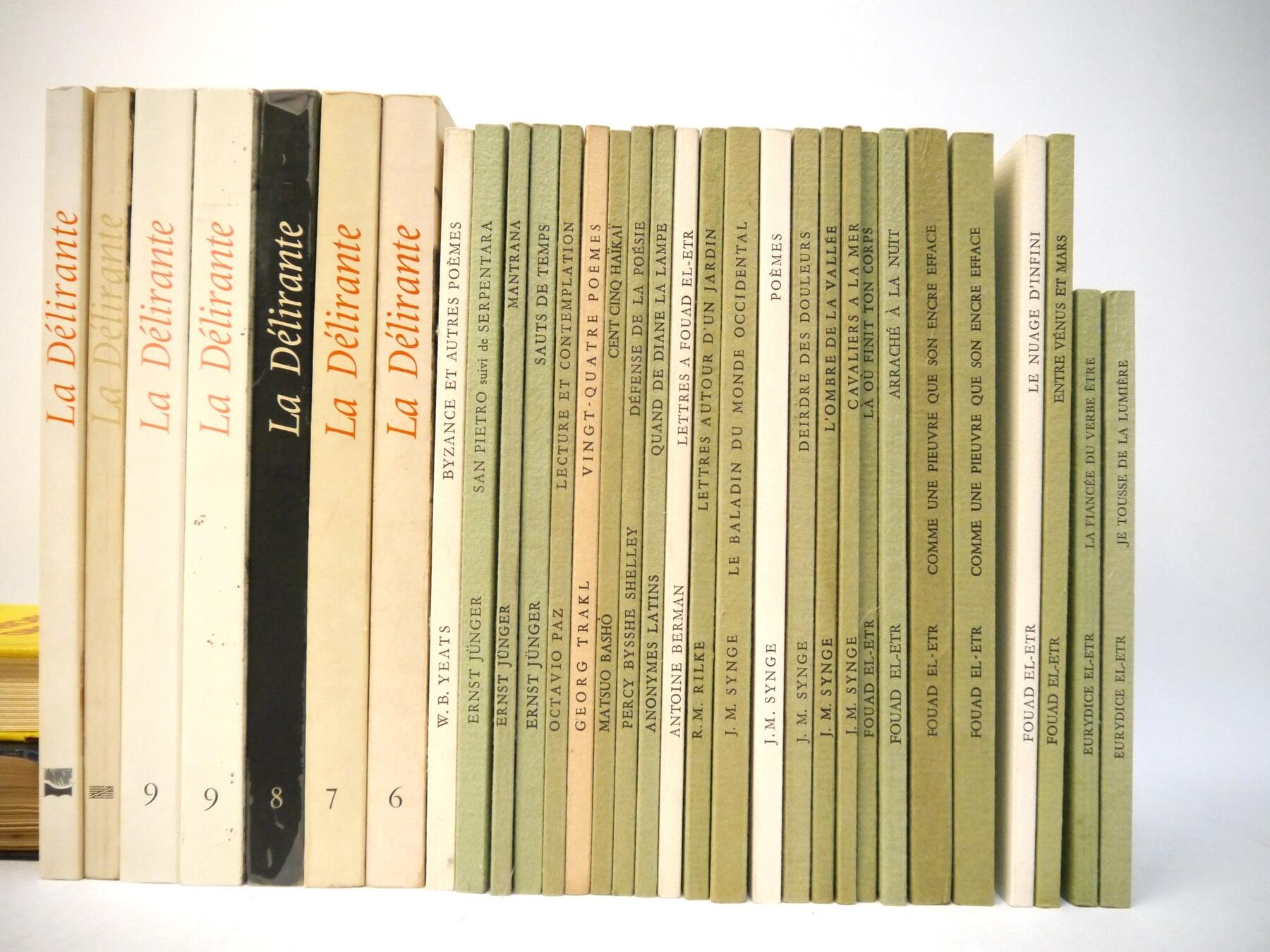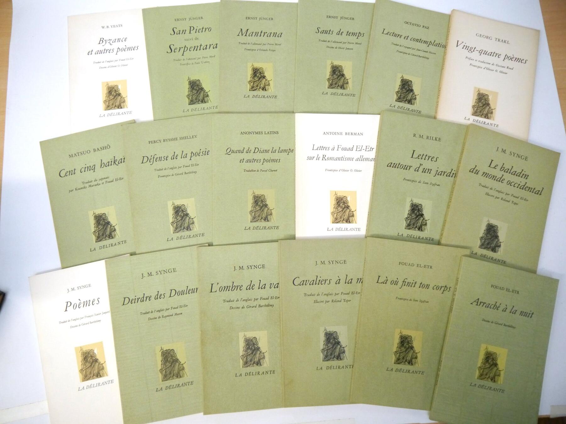 Twenty four limited edition works of poetry/literature published by La Delirante, Paris, inclusing J.M.Synge: 'Poems', 1991, (100) (65), 'Cavaliers a La Mer', 1975, (99) + 3 others; Fouad El-Etr: 'Entre Venus et Mars', 1993 + five others; others Ernst Junger, Percy Bysshe, Shelley, W.B. Yeats, Octavio Paz etc plus La Delirante Revue de Poesie' 1976, 1979, 1982, 1983, 1999, 2000 (2) 7 volumes plus one other