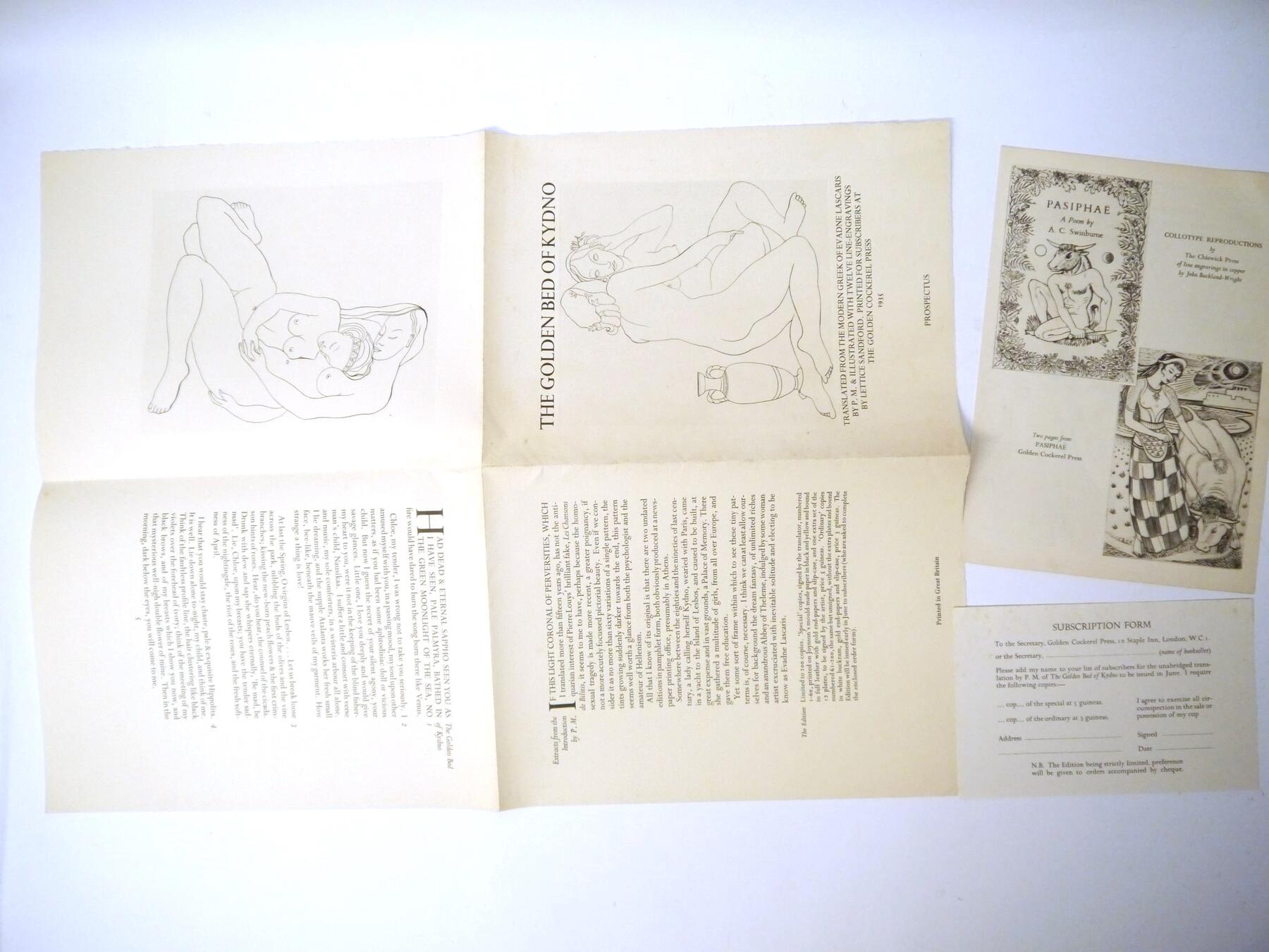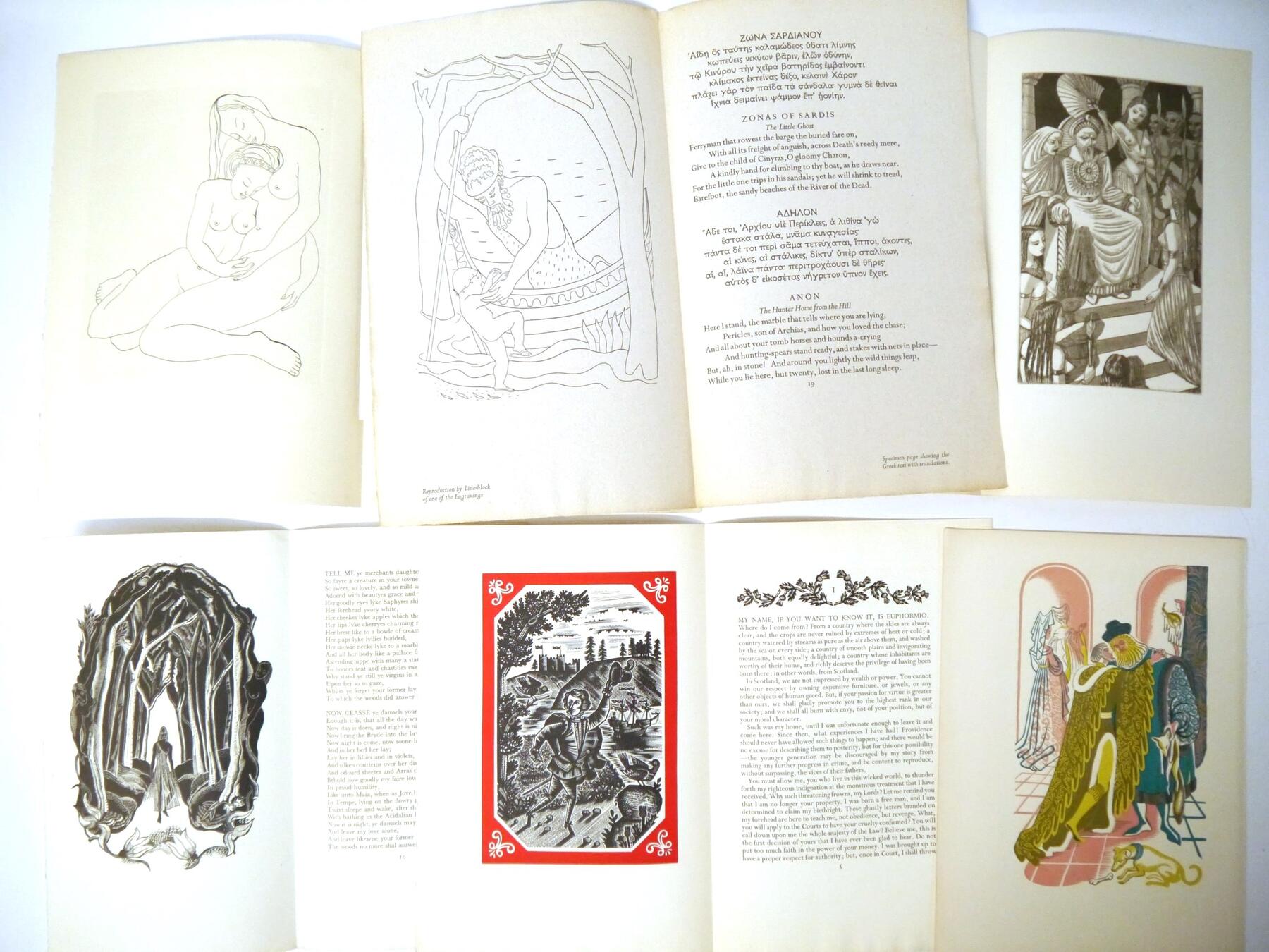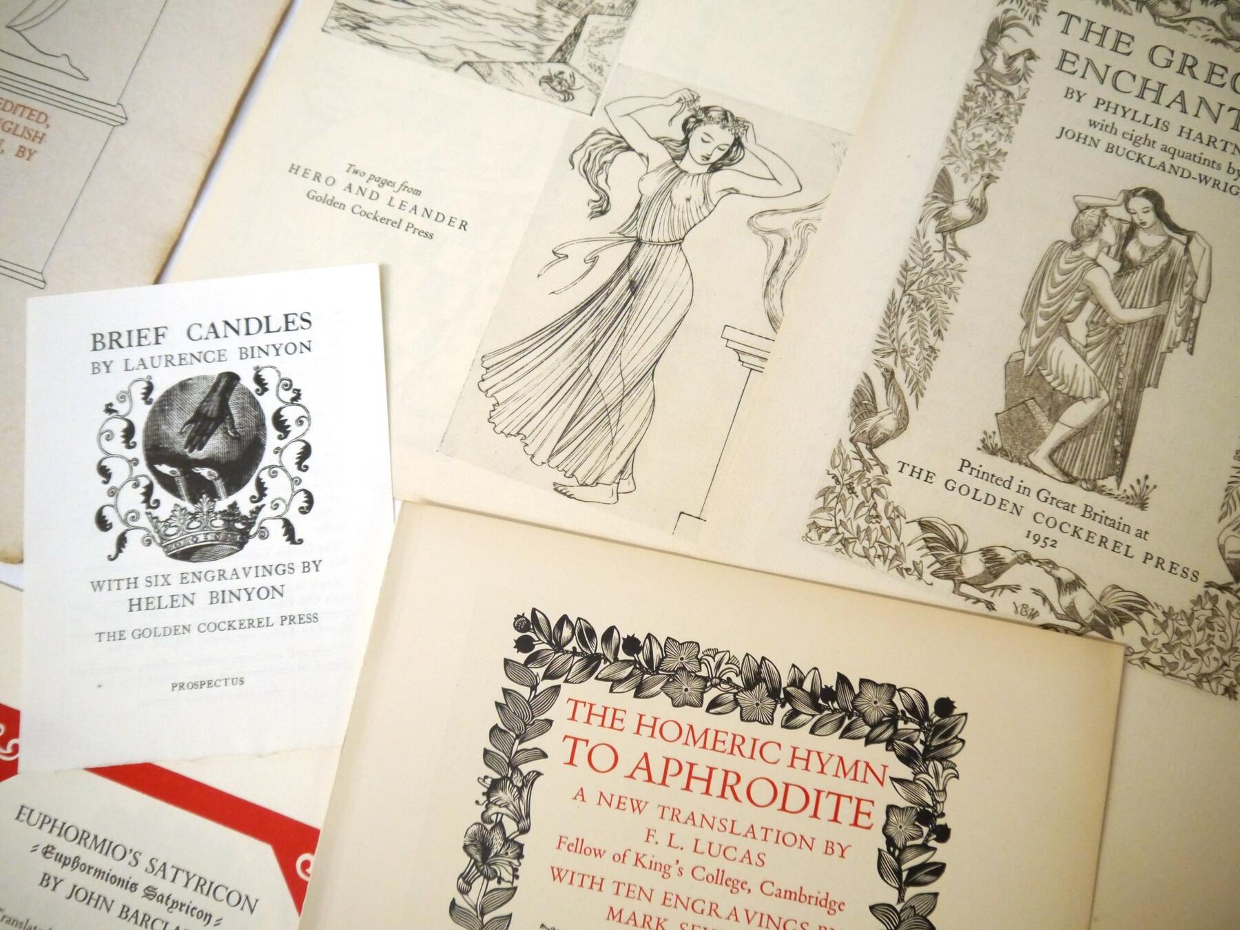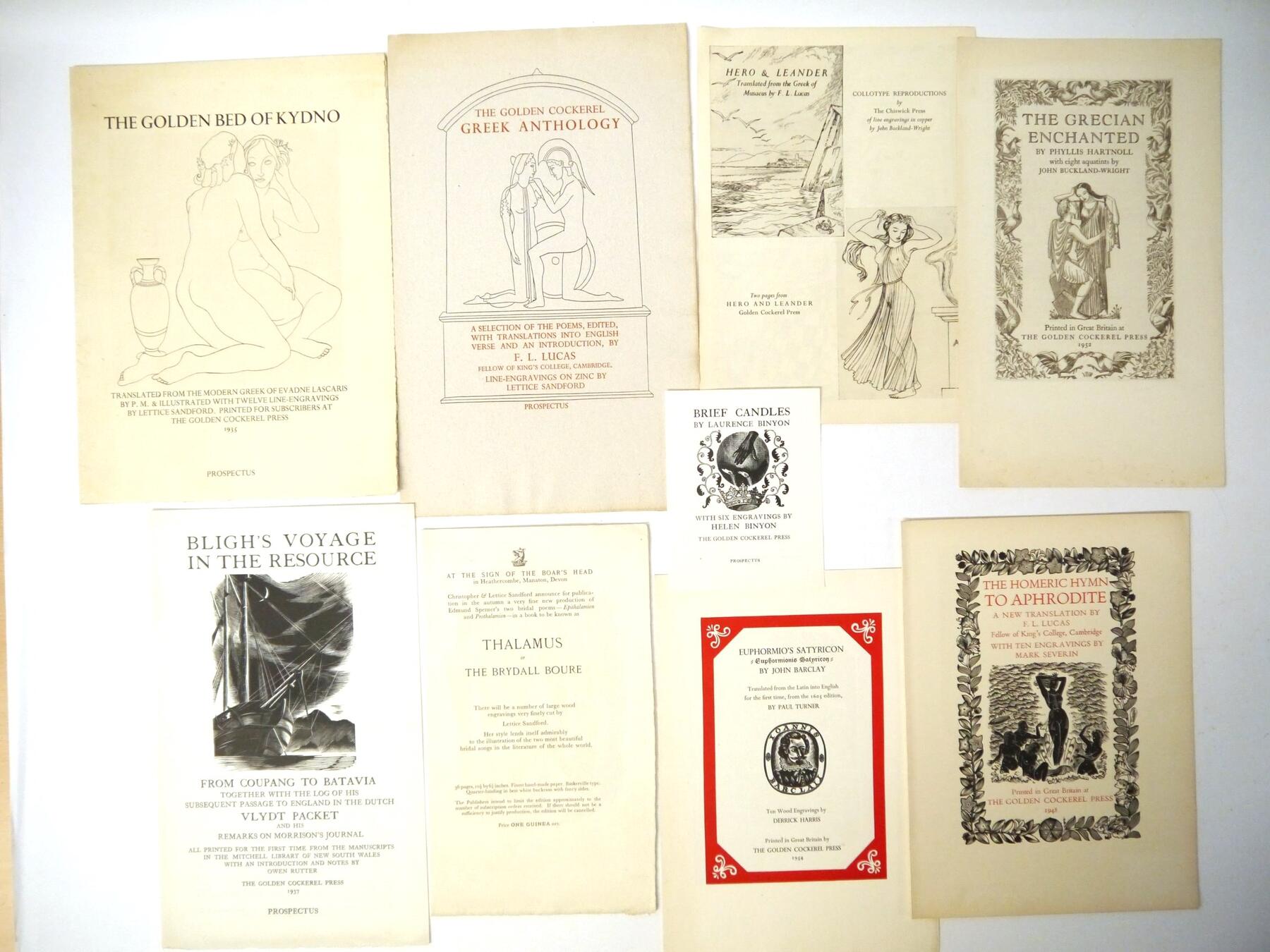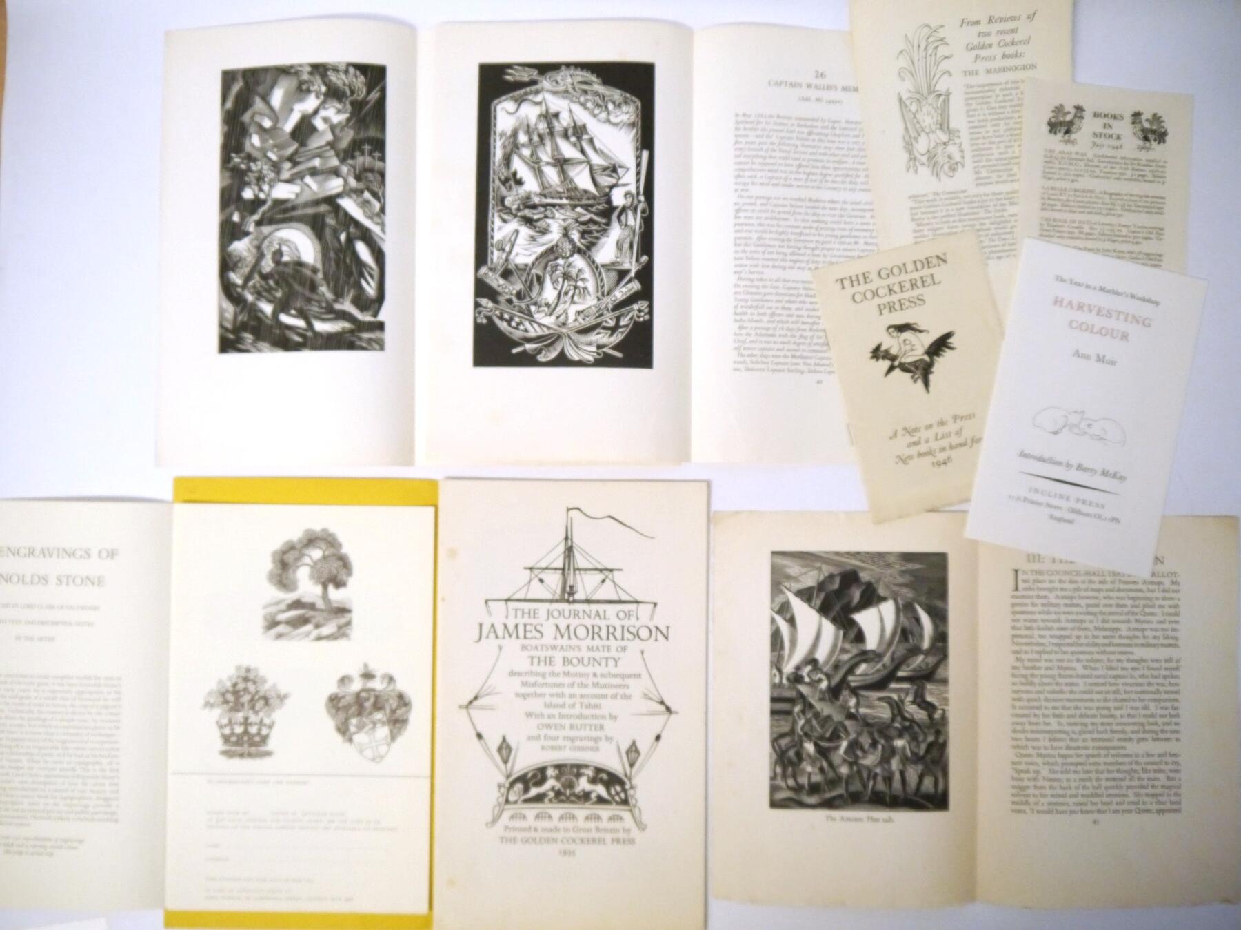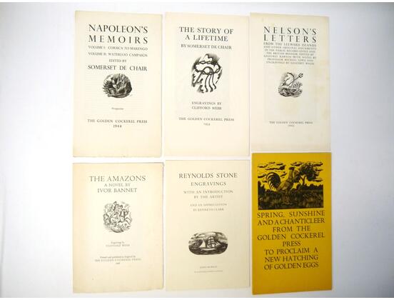 Golden Cockerel Press prospectuses, specimens etc, including 'The Golden Bed of Kydno', 1935 prospectus, [8]pp, line engravings by Lettice Sandford; 'Spring, Sunshine and a Chanticleer from the Golden Cockerel Press to Procloaim a New Hatching of Golden Eggs', 1935 prospectus/catalogue, wood engravings by Robert Gibbings and John Nash, [12]pp, original wraps; The Golden Cockerel Greek Anthology prospectus, line engravings by Lettice Sandford, [4]pp; 'Napoleon's Memoirs' Golden Cockerel prospectus 1944, Reynolds Stone wood engraving to cover, [4]pp; 'Reynolds Stone Engravings', John Murray prospectus, 15 vignette wood engravings by Reynolds Stone, [6]pp folding prospectus; 'The Amazons' Golden Cockerel Press prospectus 1948, [4]pp, wood engravings by Clifford Webb; 'Nelson's Letter' golden Cockerel Prospectus 1953, [4]pp, wood engravings by Geoffrey Wales; 'The Story of a Lifetime', Golden Cockerel Prospectus 1954, [4]pp, wood engravings by Clifford Webb; 'Golden Cockerel Press A Note on the Press and a List of New books in hand for 1946', [8]pp, wood engraving to cover; plus 10 other prospectuses/items