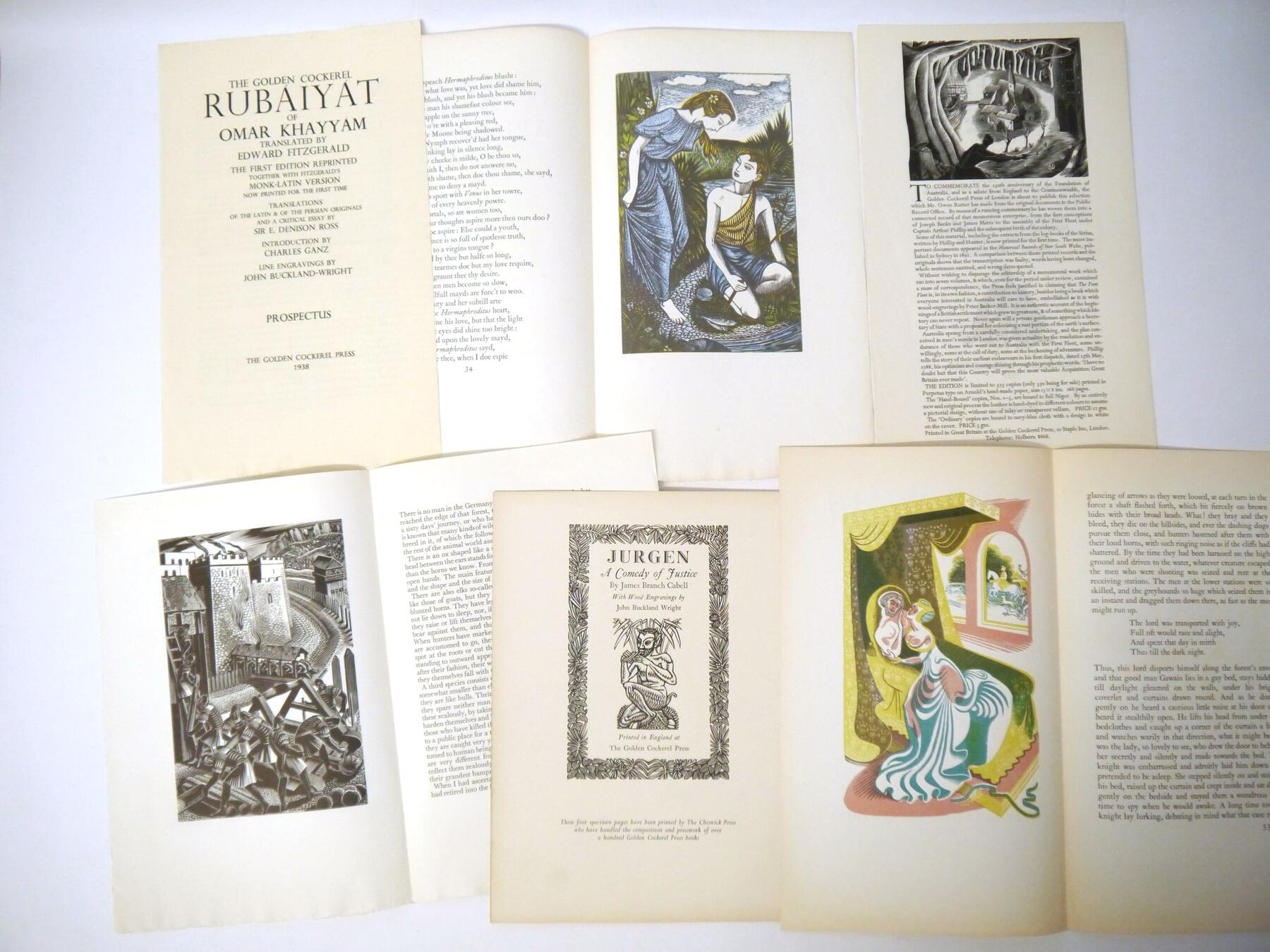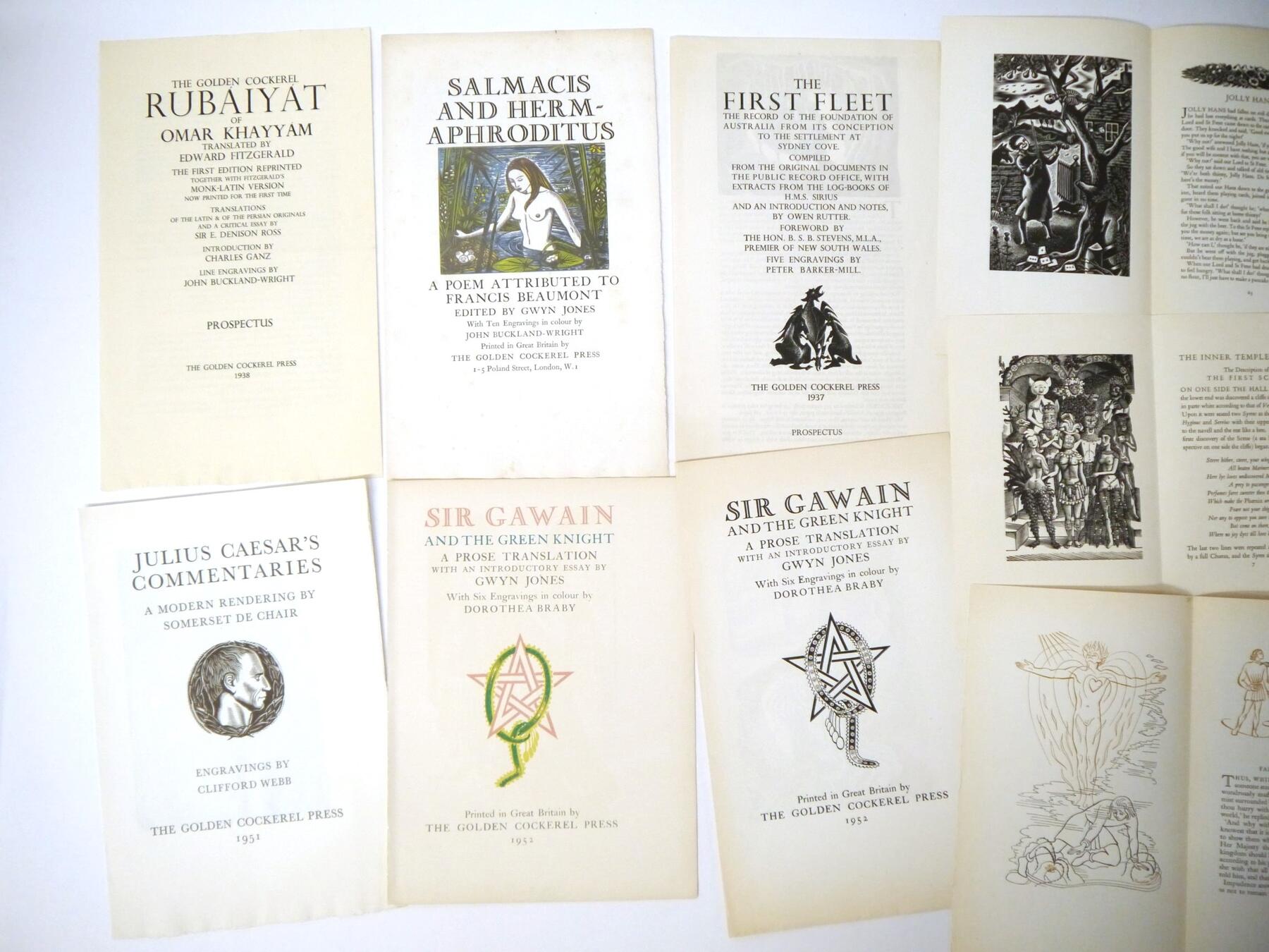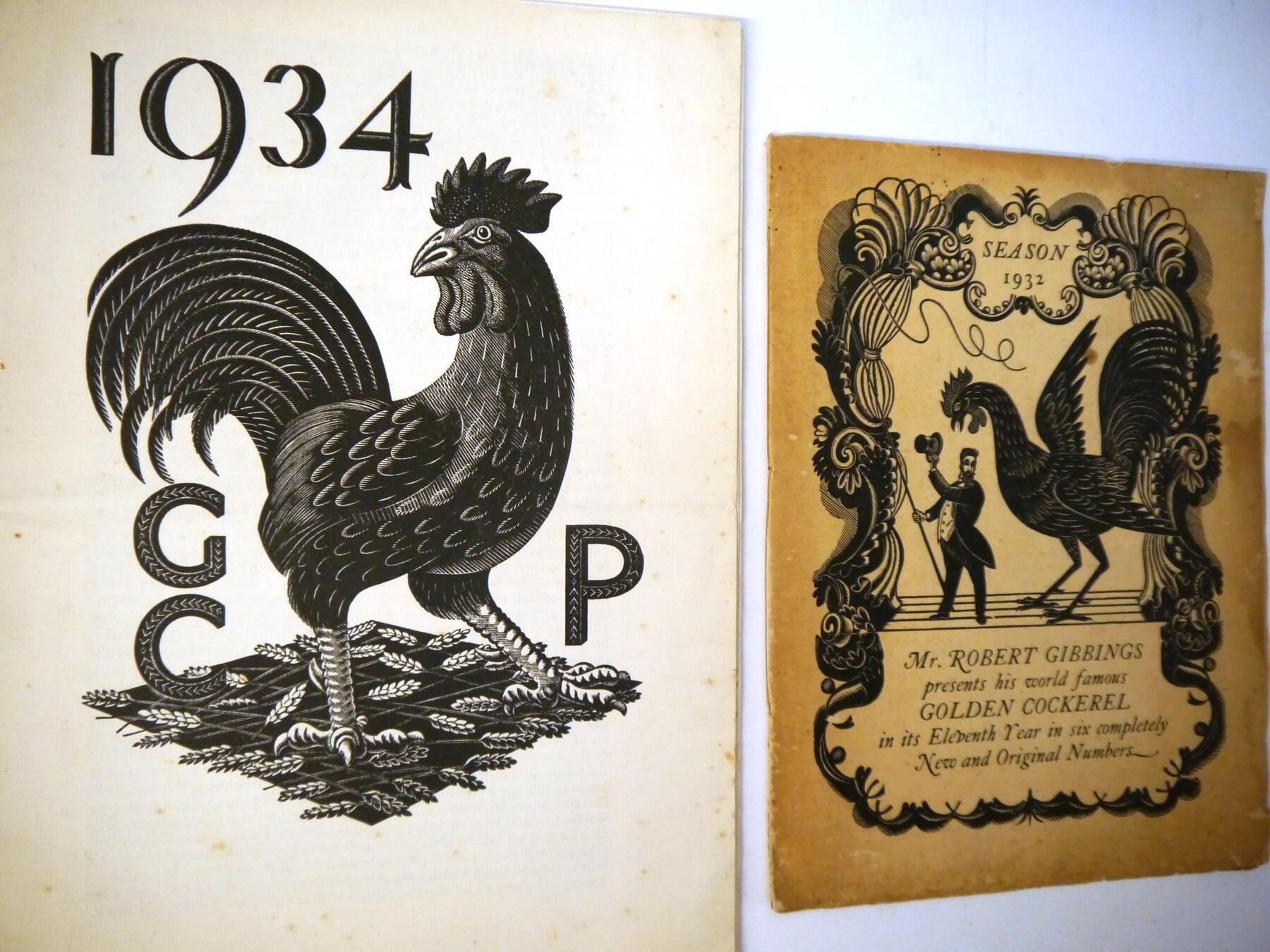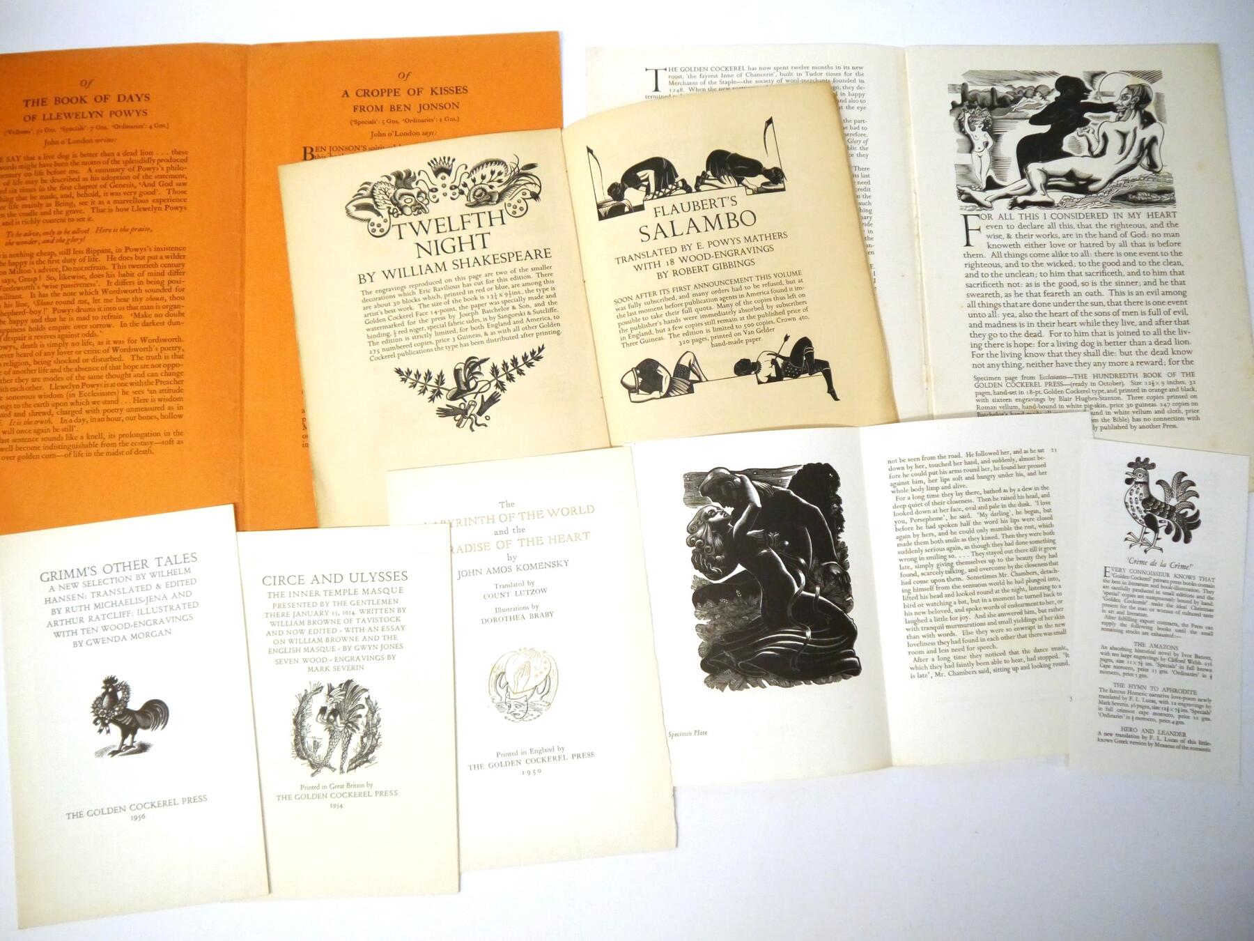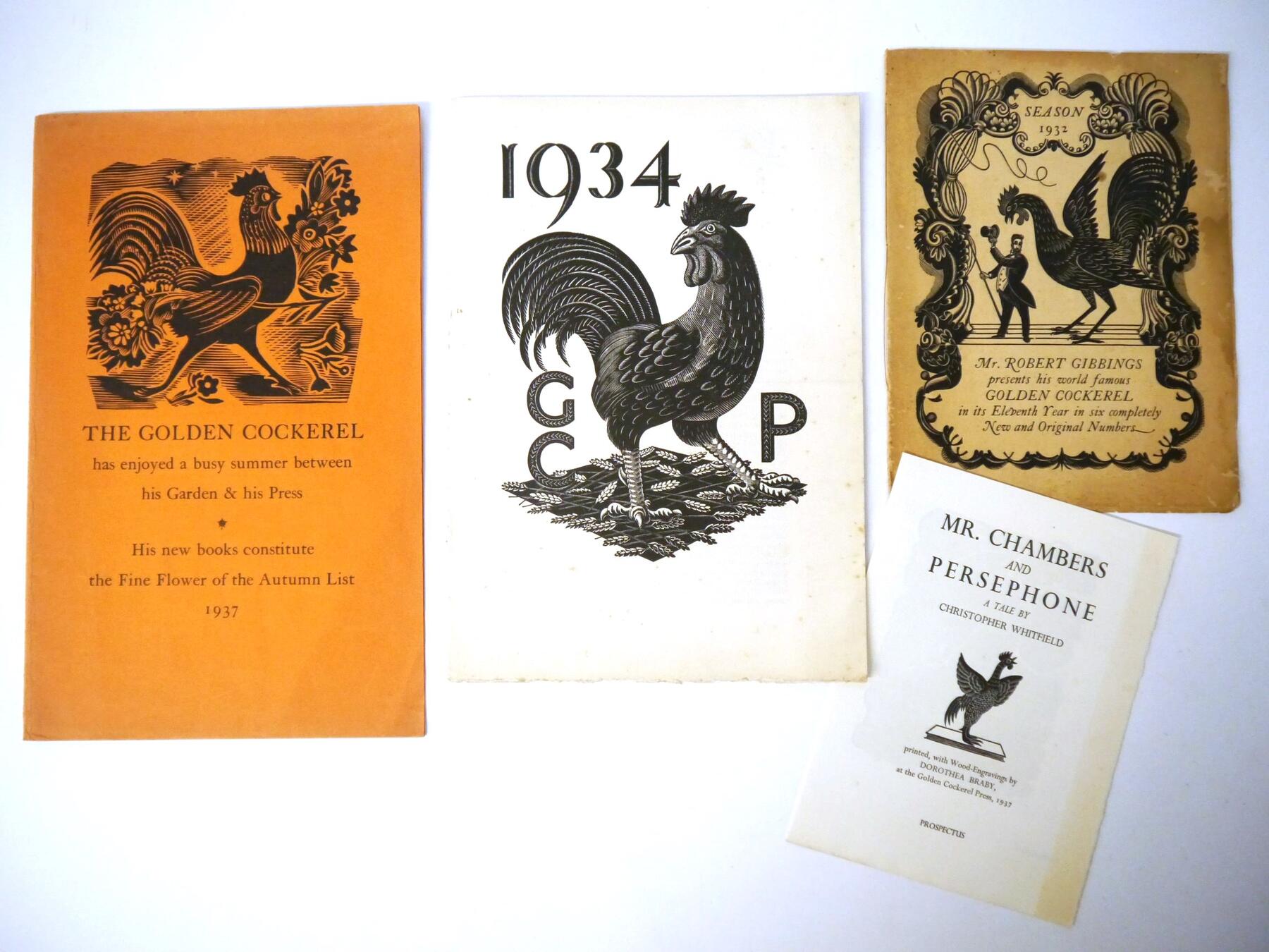 Golden Cockerel Press prospectuses, specimens etc, including 1934 prospectus, full page cockerel wood engraving by Eric Ravilious plus other wood engravings by Robert Gibbings, Blair Hughes-stanton, Eric Gill etc, [16]pp, 4to, Glastonbury cream laid paper; catalogue LXII 1937, [4]pp, salmon coloured wove papaer, no inserts; prospectus/catalogue Season 1932, top wrap with wood engraving by Eric Ravilious depicting cockerel and ring master with decorative border, [16]pp, original stitched wraps; Salmacis and Hermaphroditus prospectus, [4]pp, 2 coloured wood engravings by John Buckland-Wright including 1 full page; plus 10 other Golden Cockerel prospectuses/items circa 1930's-1950's