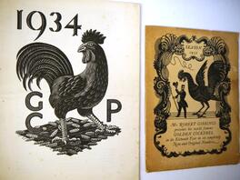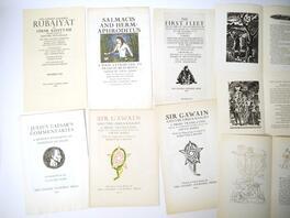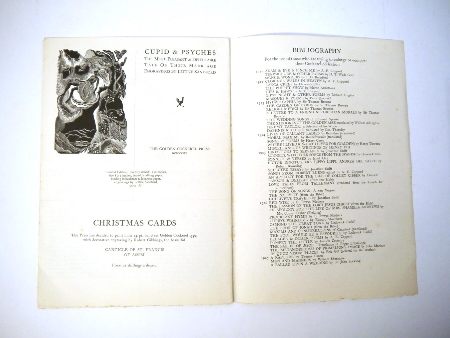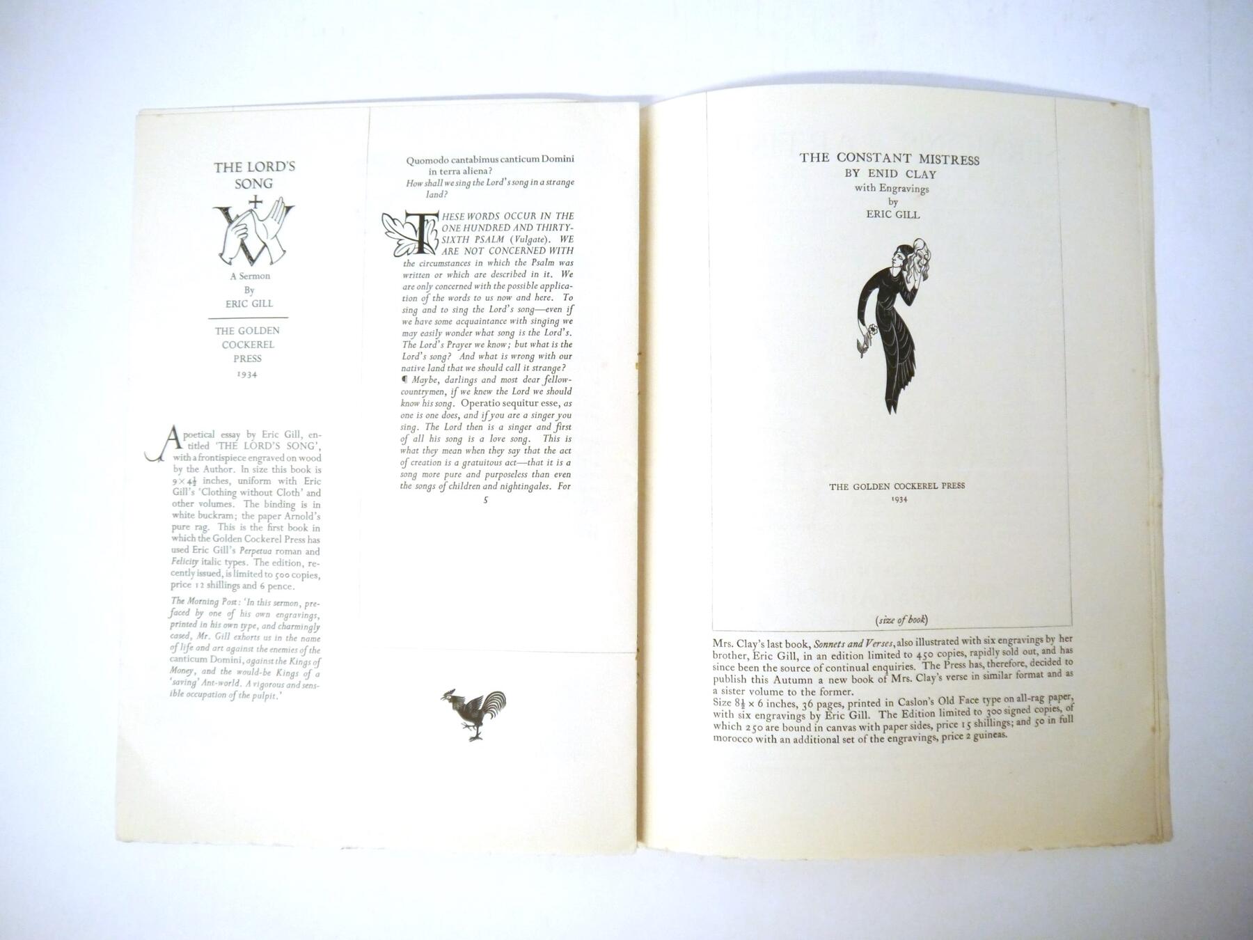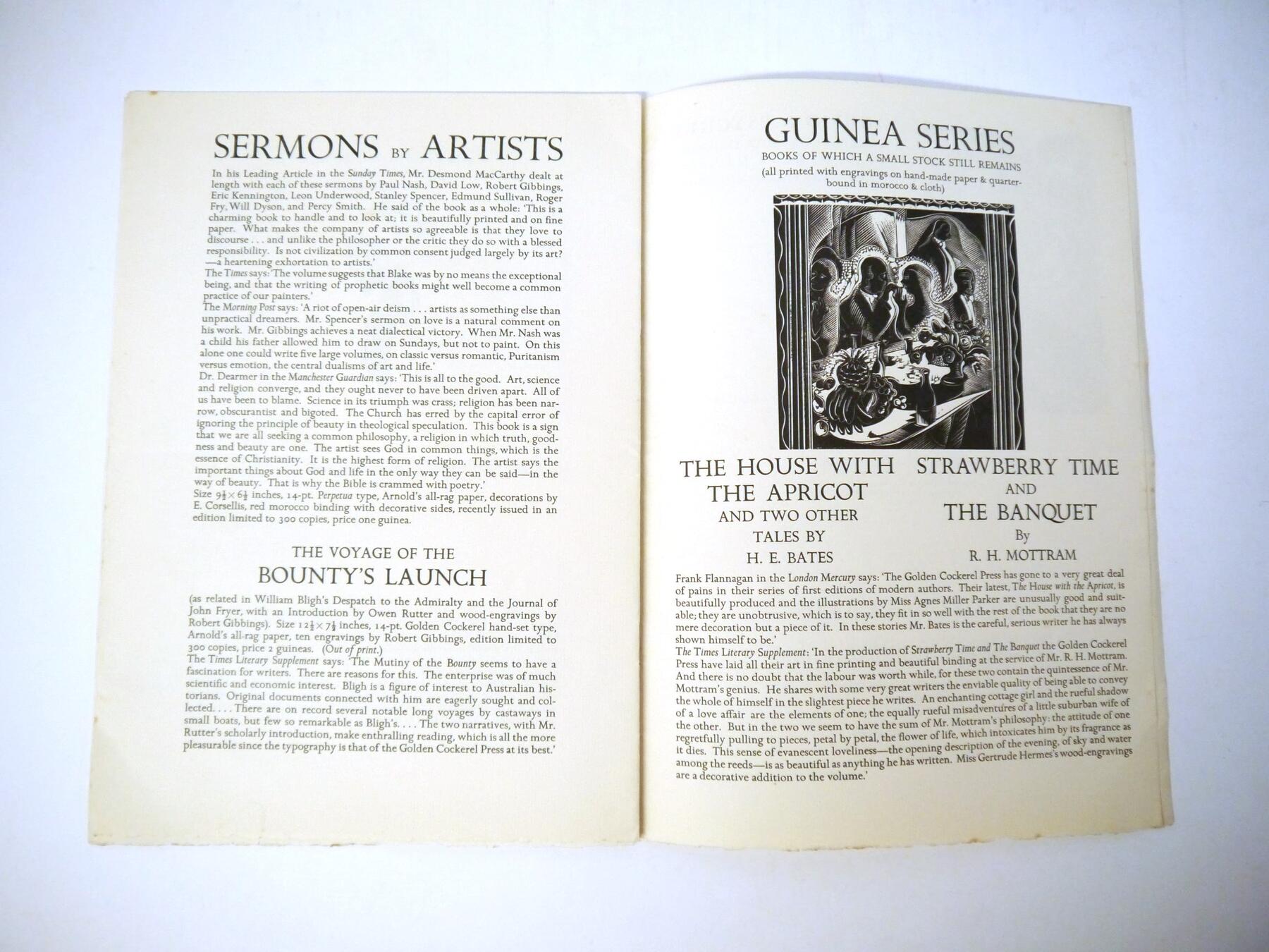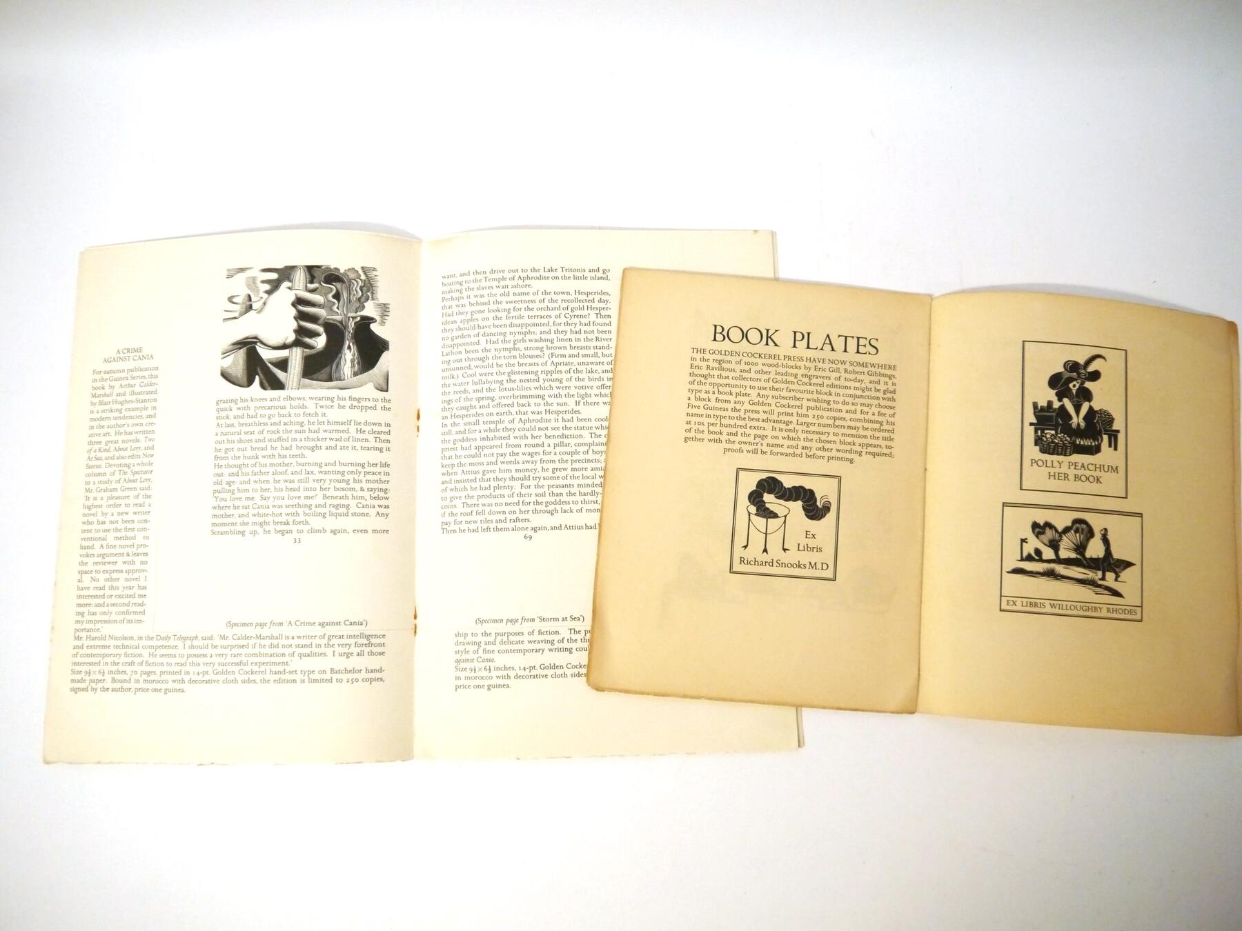 Golden Cockerel Press prospectuses, specimens etc, including 1934 prospectus, full page cockerel wood engraving by Eric Ravilious plus other wood engravings by Robert Gibbings, Blair Hughes-stanton, Eric Gill etc, [16]pp, 4to, Glastonbury cream laid paper; catalogue LXII 1937, [4]pp, salmon coloured wove papaer, no inserts; prospectus/catalogue Season 1932, top wrap with wood engraving by Eric Ravilious depicting cockerel and ring master with decorative border, [16]pp, original stitched wraps; Salmacis and Hermaphroditus prospectus, [4]pp, 2 coloured wood engravings by John Buckland-Wright including 1 full page; plus 10 other Golden Cockerel prospectuses/items circa 1930's-1950's